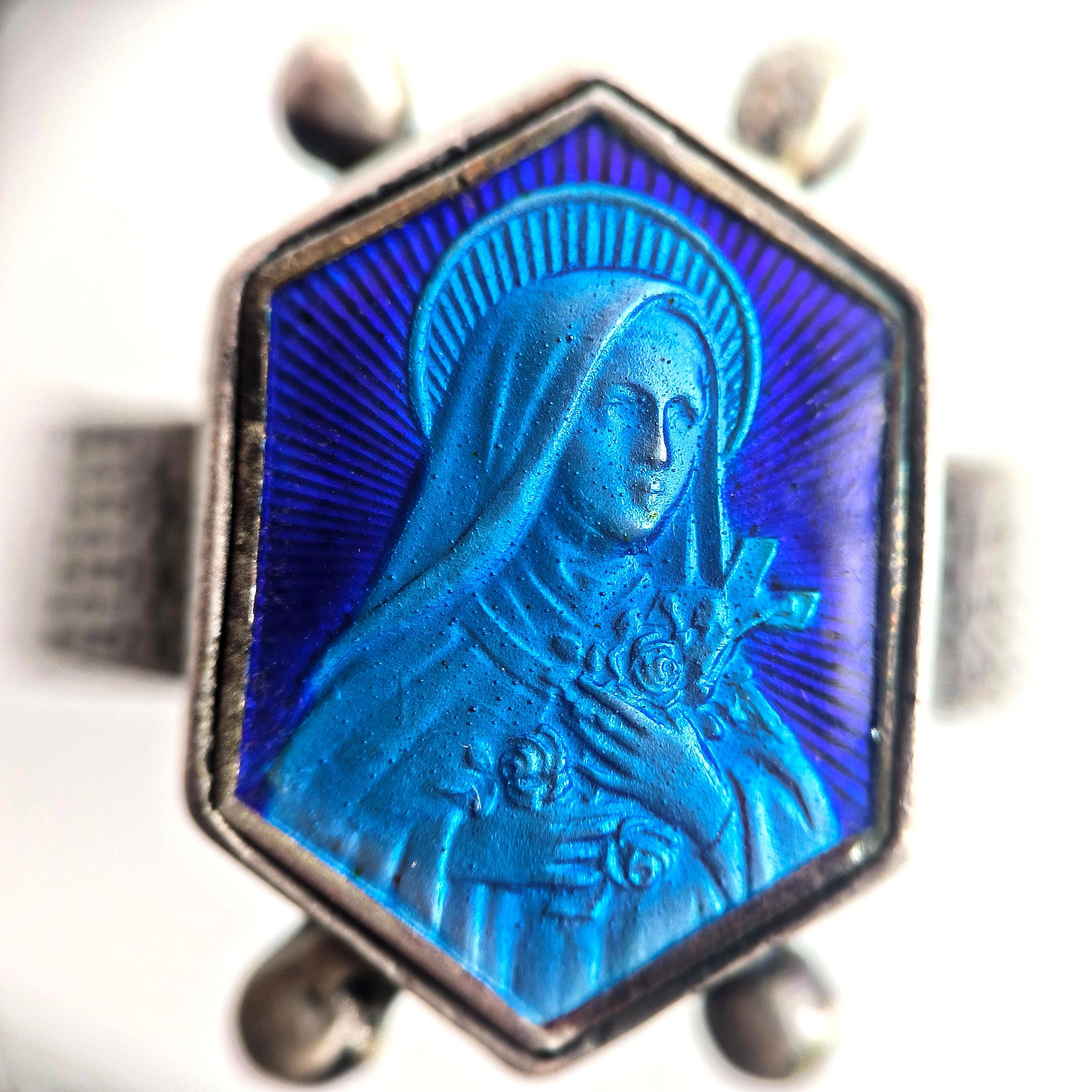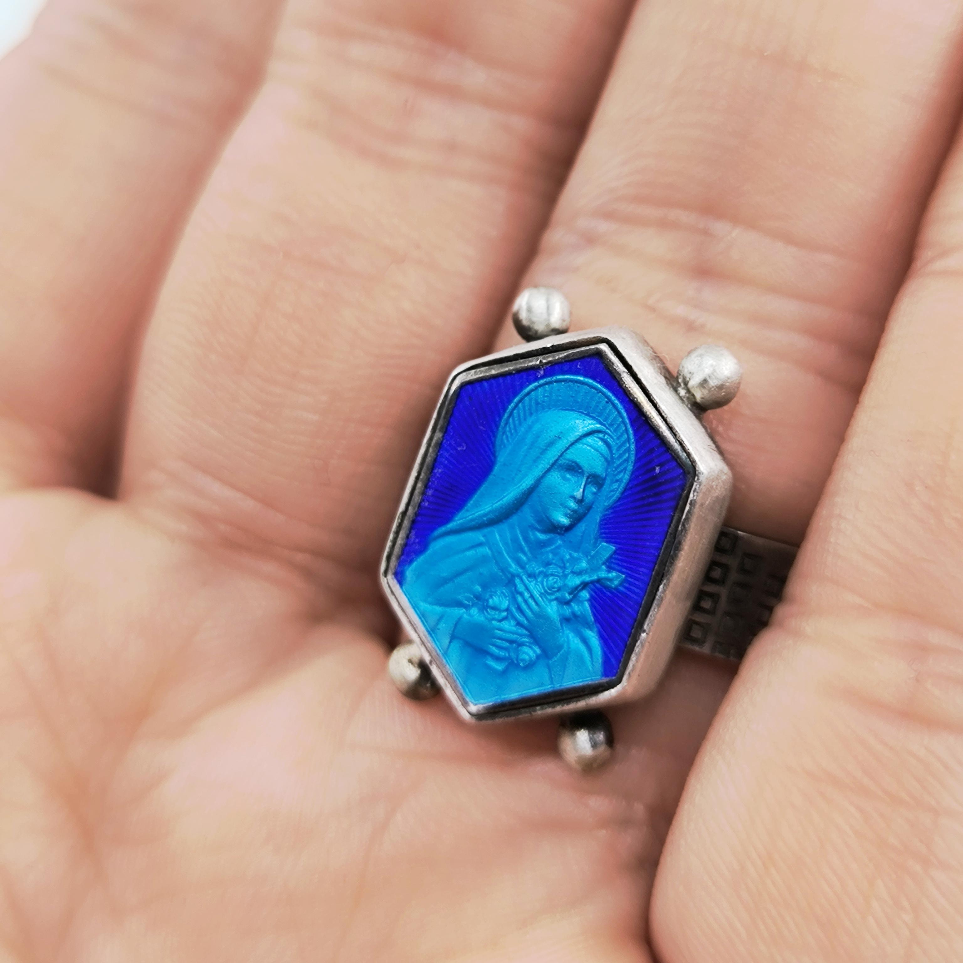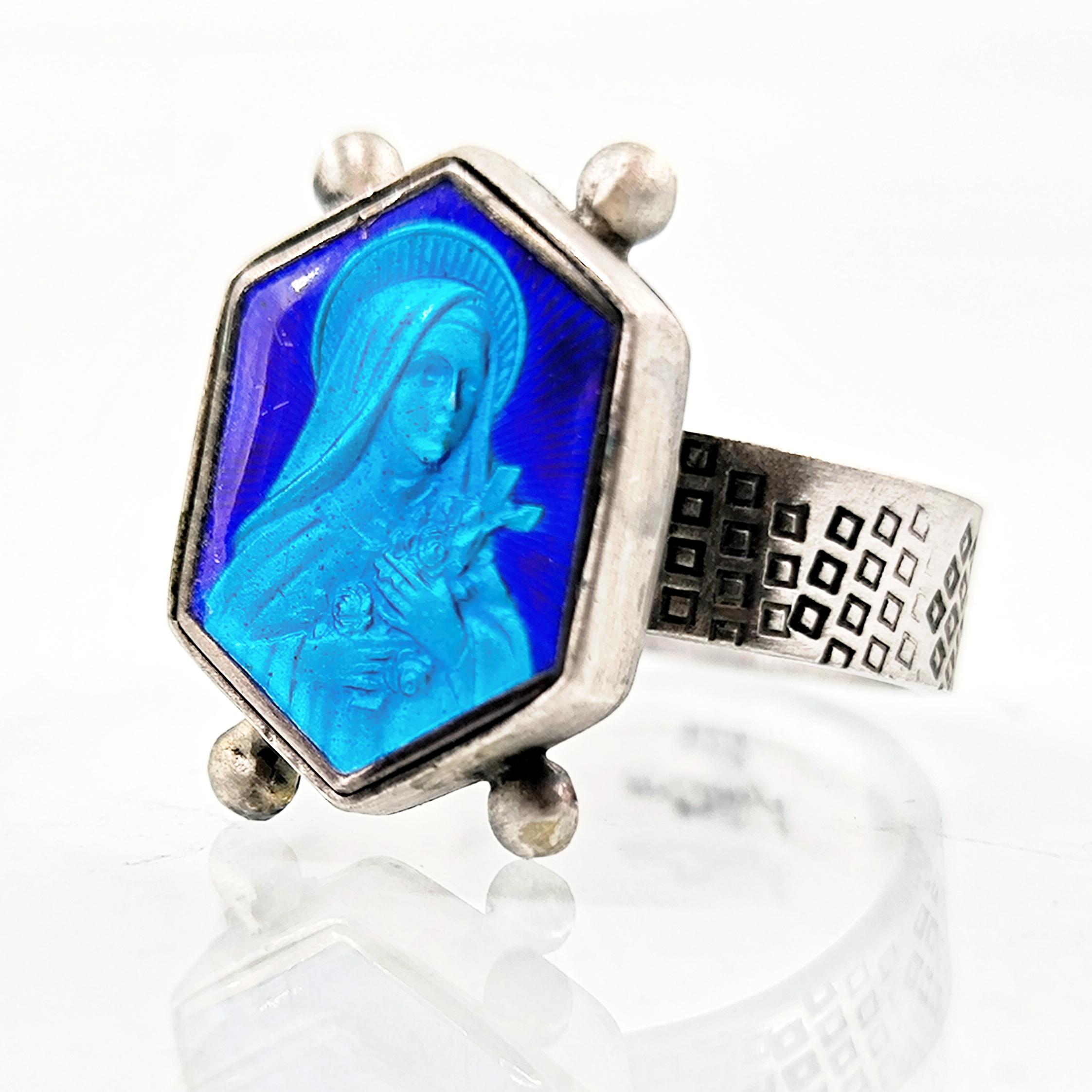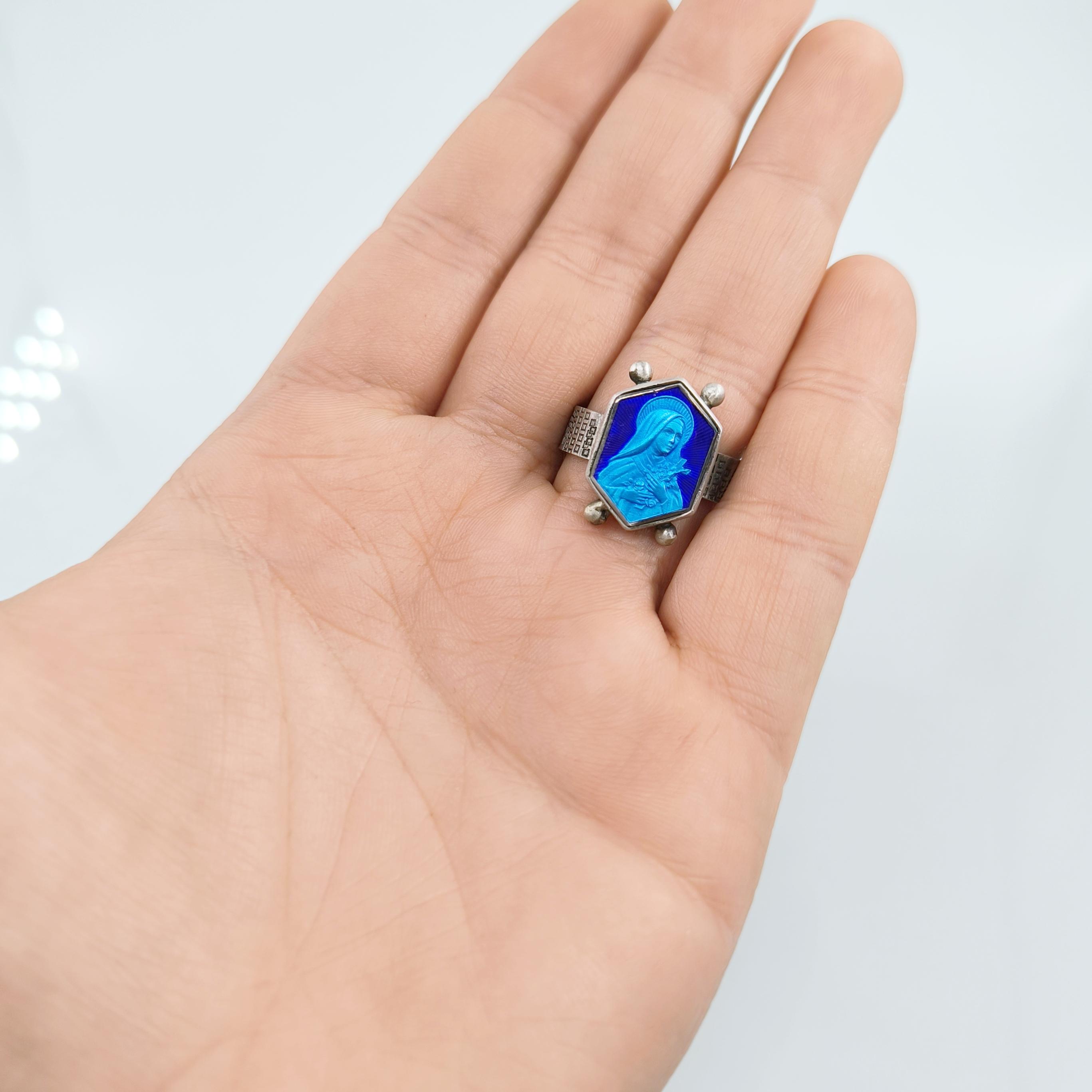 Vintage dönemin mineli bir kolyesiyken ustamızın elinde 925 ayar gümüş çerçeveli zarif bir yüzüğe dönüştü! Derin mavi fon üzerinde, mine işçiliğiyle işlenmiş Meryem Ana tasviri elinde çiçeklerle saflığı ve ilahi sevgiyi, başındaki hale ise koruyucu ışığını yansıtıyor. Bu yüzük, inanç ve zarafeti bir arada taşıyan eşsiz bir parça.