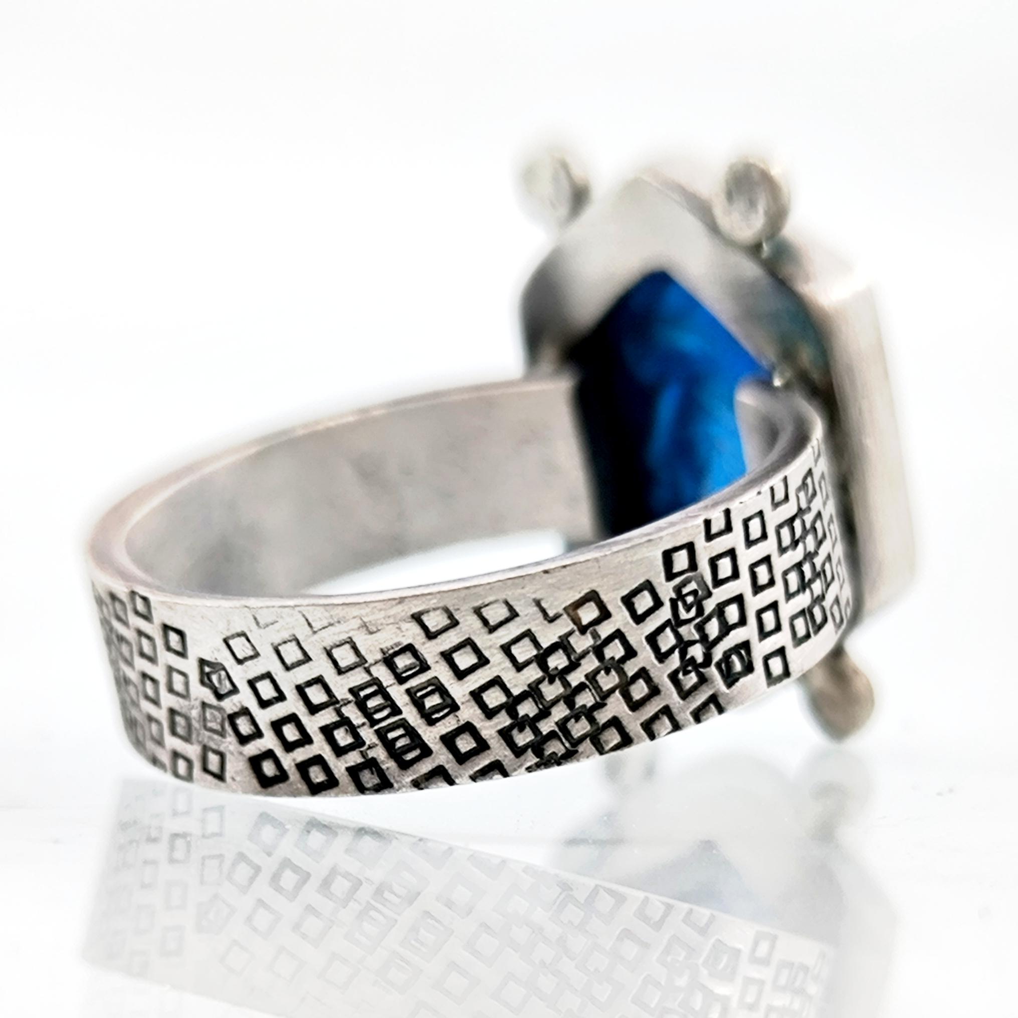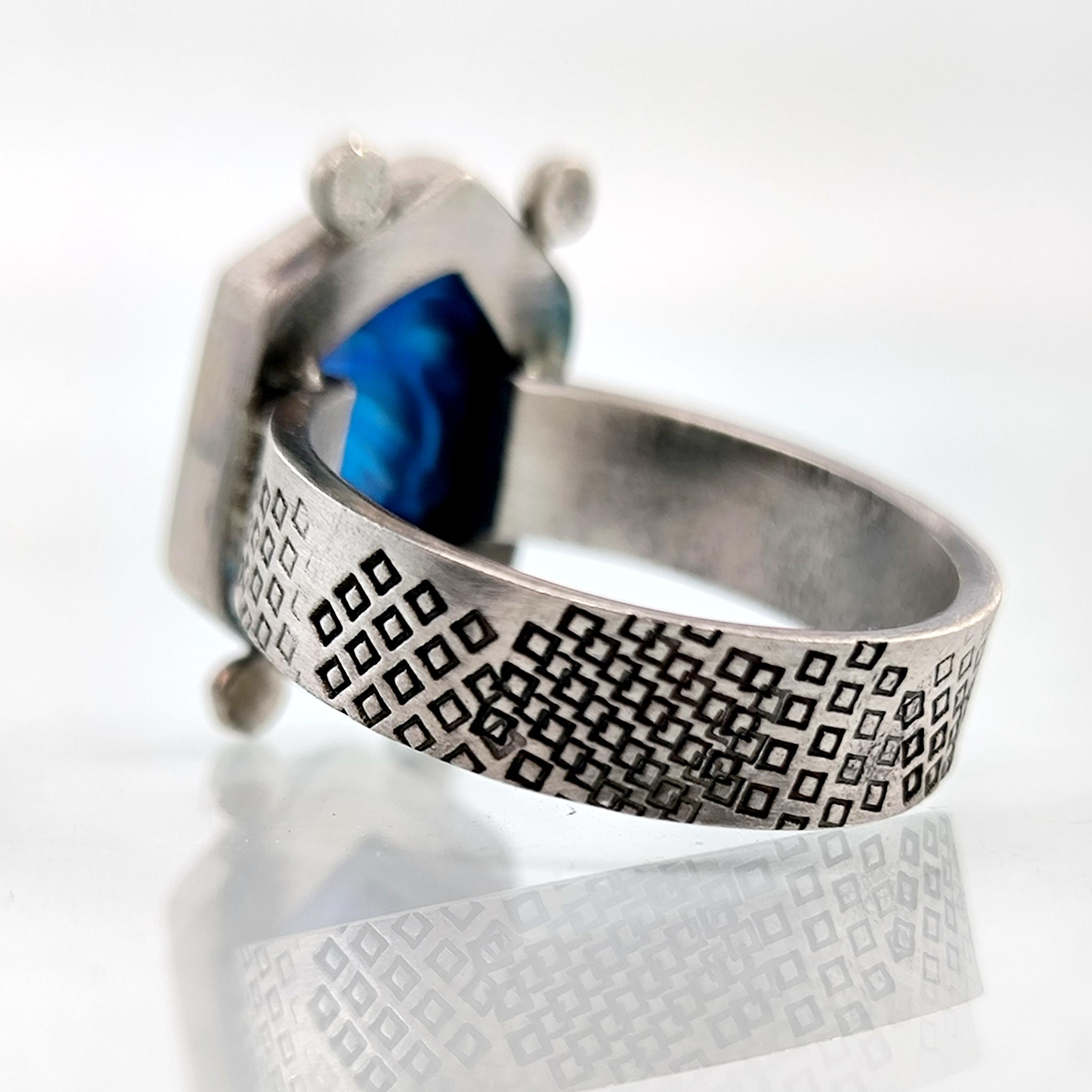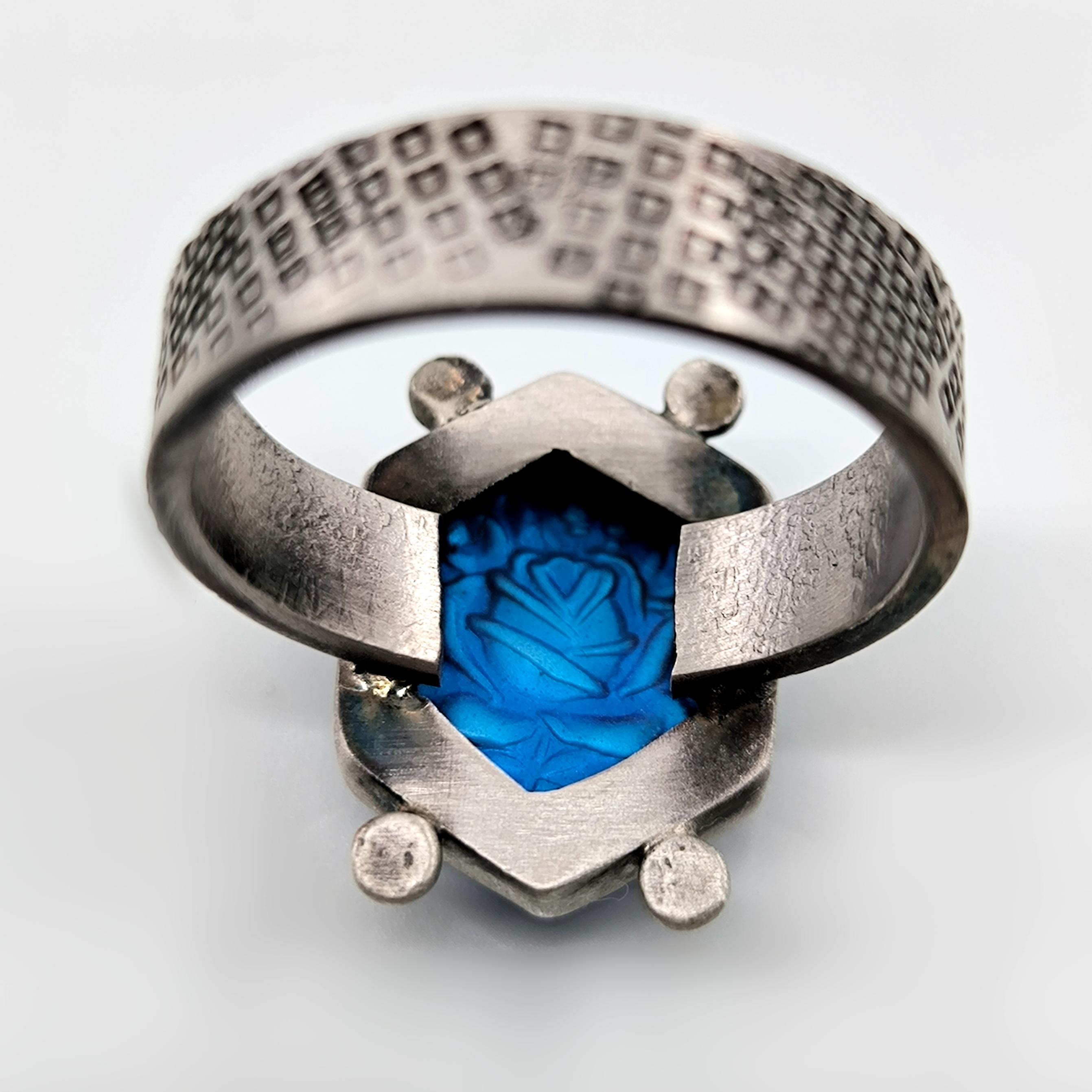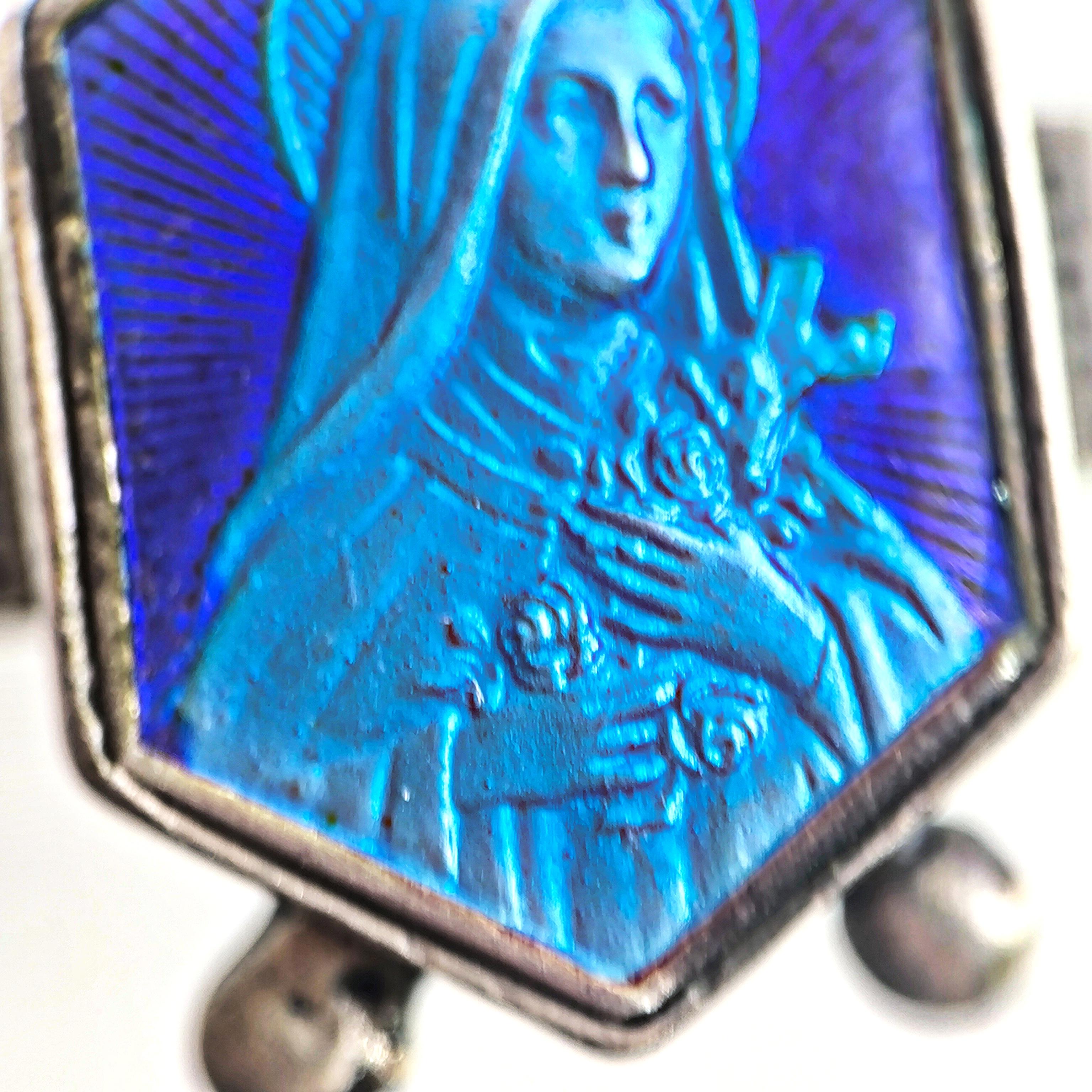 Vintage dönemin mineli bir kolyesiyken ustamızın elinde 925 ayar gümüş çerçeveli zarif bir yüzüğe dönüştü! Derin mavi fon üzerinde, mine işçiliğiyle işlenmiş Meryem Ana tasviri elinde çiçeklerle saflığı ve ilahi sevgiyi, başındaki hale ise koruyucu ışığını yansıtıyor. Bu yüzük, inanç ve zarafeti bir arada taşıyan eşsiz bir parça.