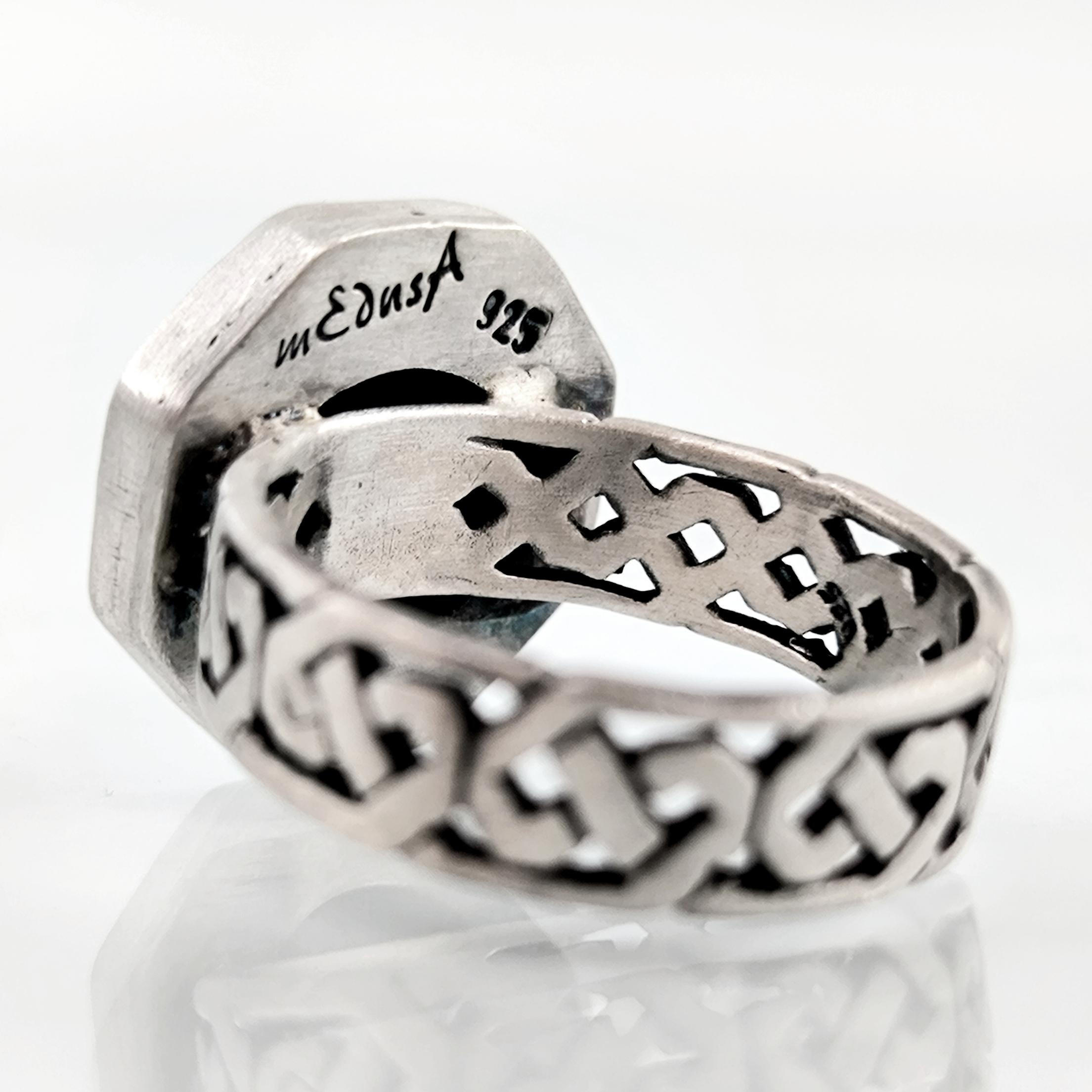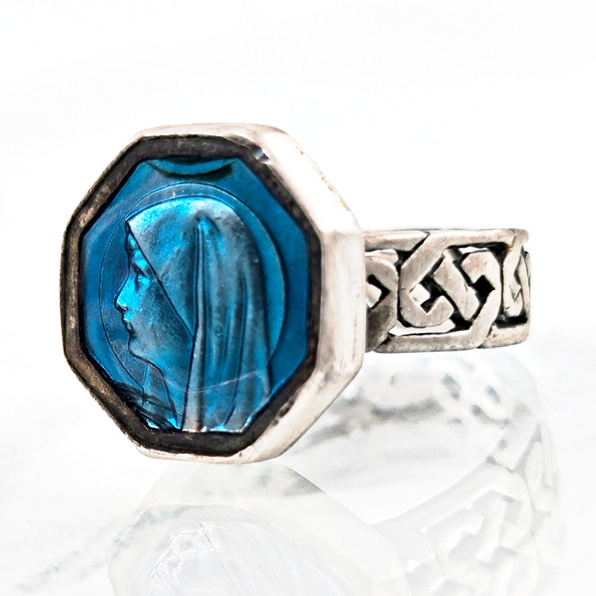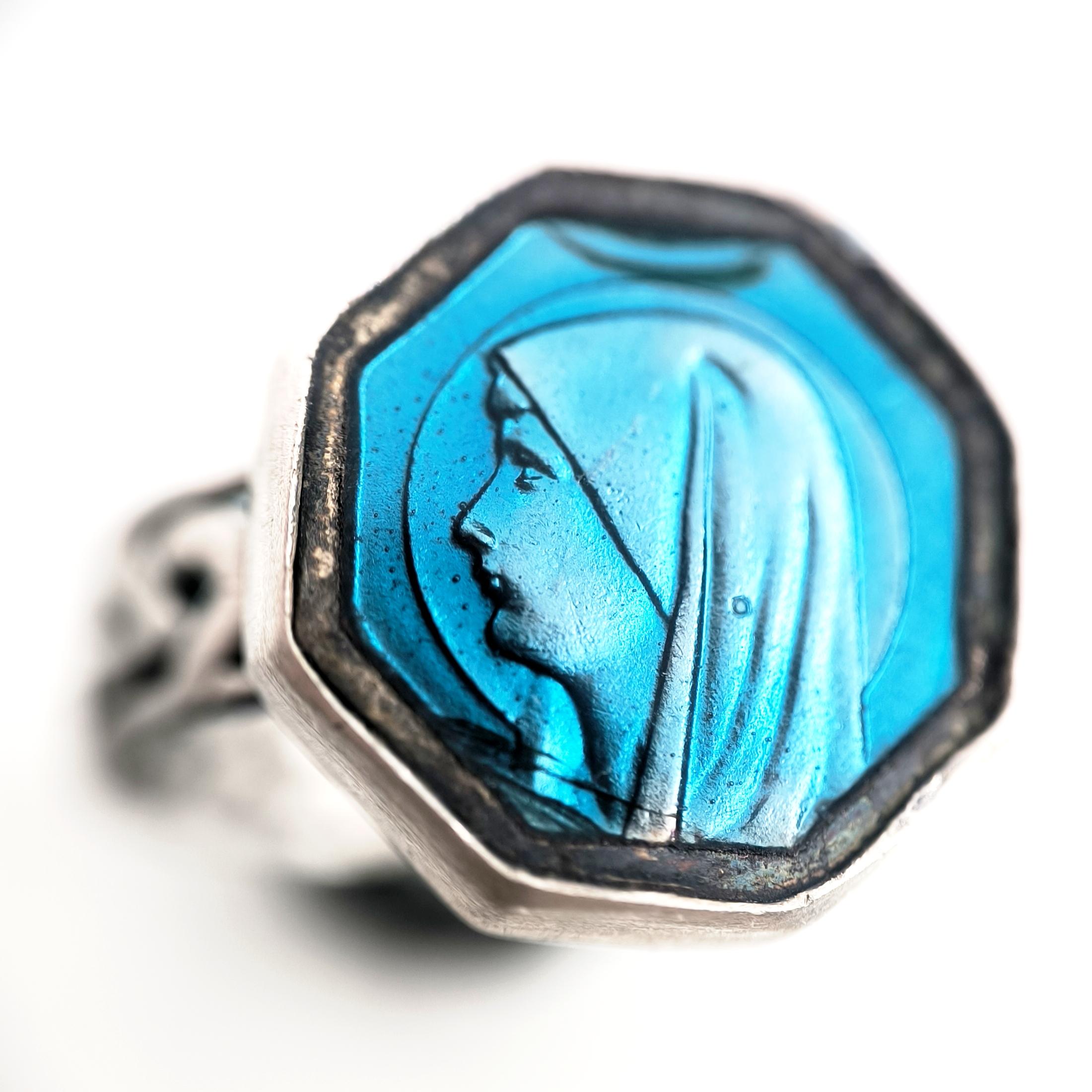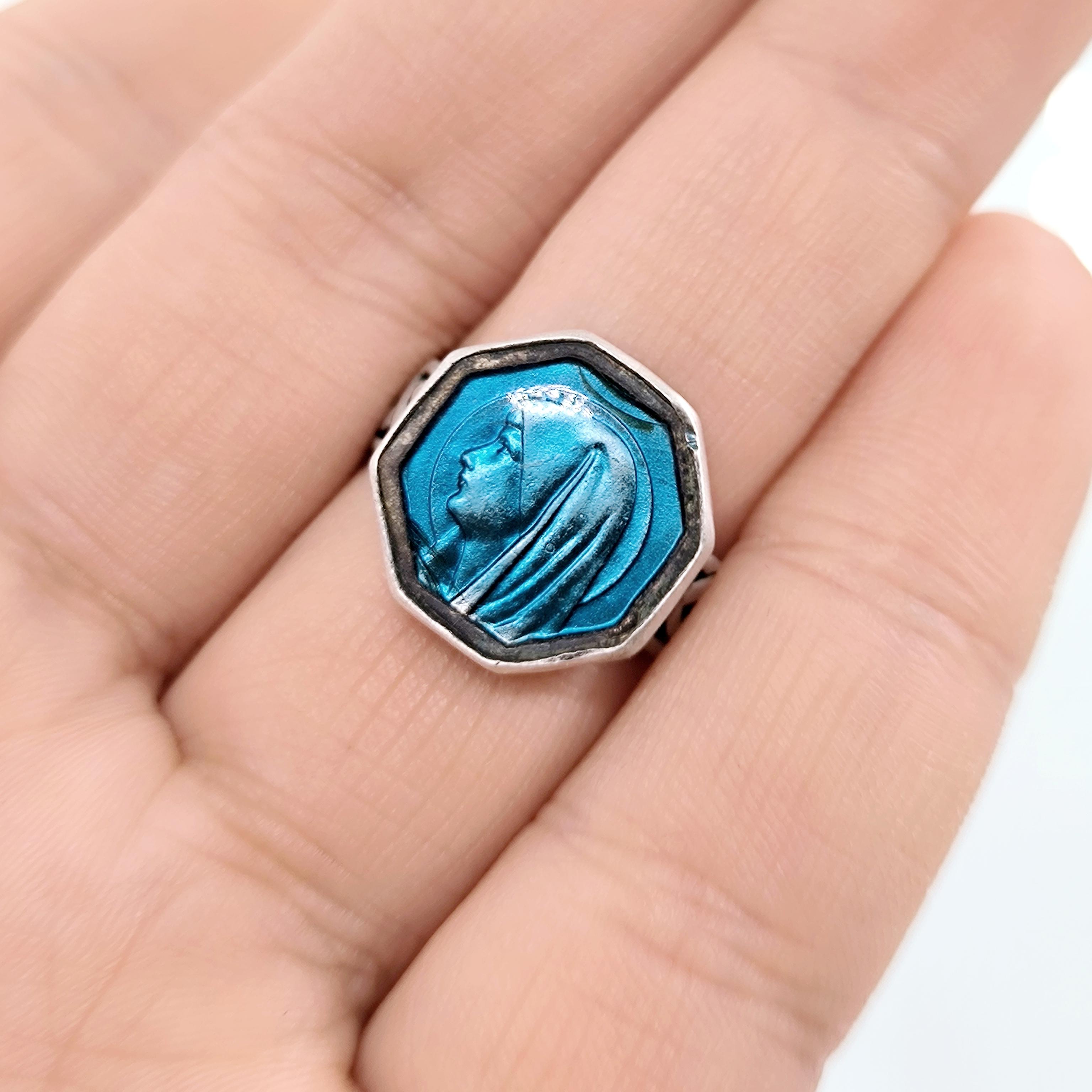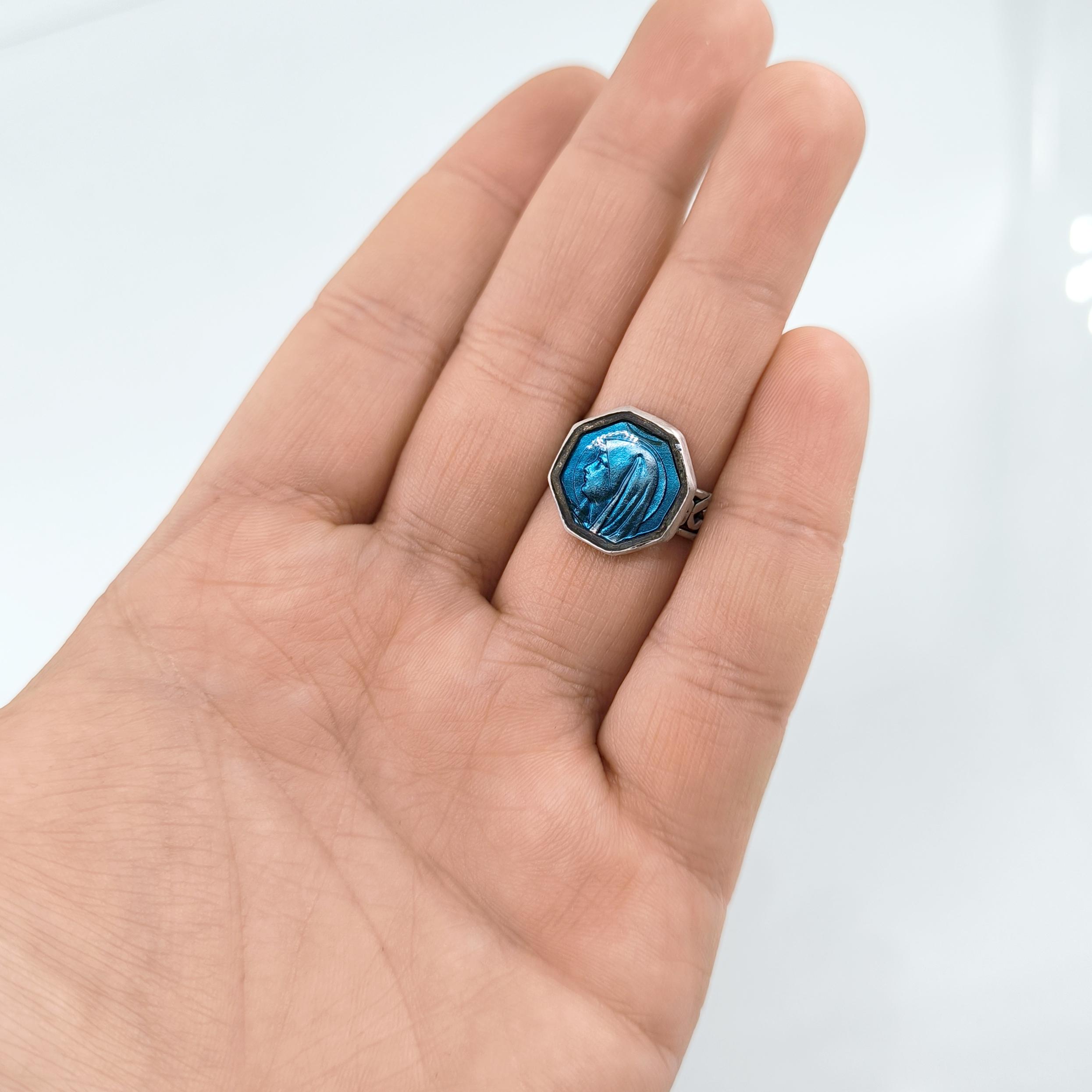 Bir zamanlar vintage bir mineli kolyeyken, şimdi 925 ayar gümüşten zarif bir yüzük formunda hayat buldu. Canlı mavi mine üzerine işlenmiş Meryem Ana portresi, huzuru, inancı ve koruyucu sevgiyi simgeliyor. Celtic motifli gümüş şerit, tasarıma hem mistik hem de tarihi bir dokunuş katıyor.