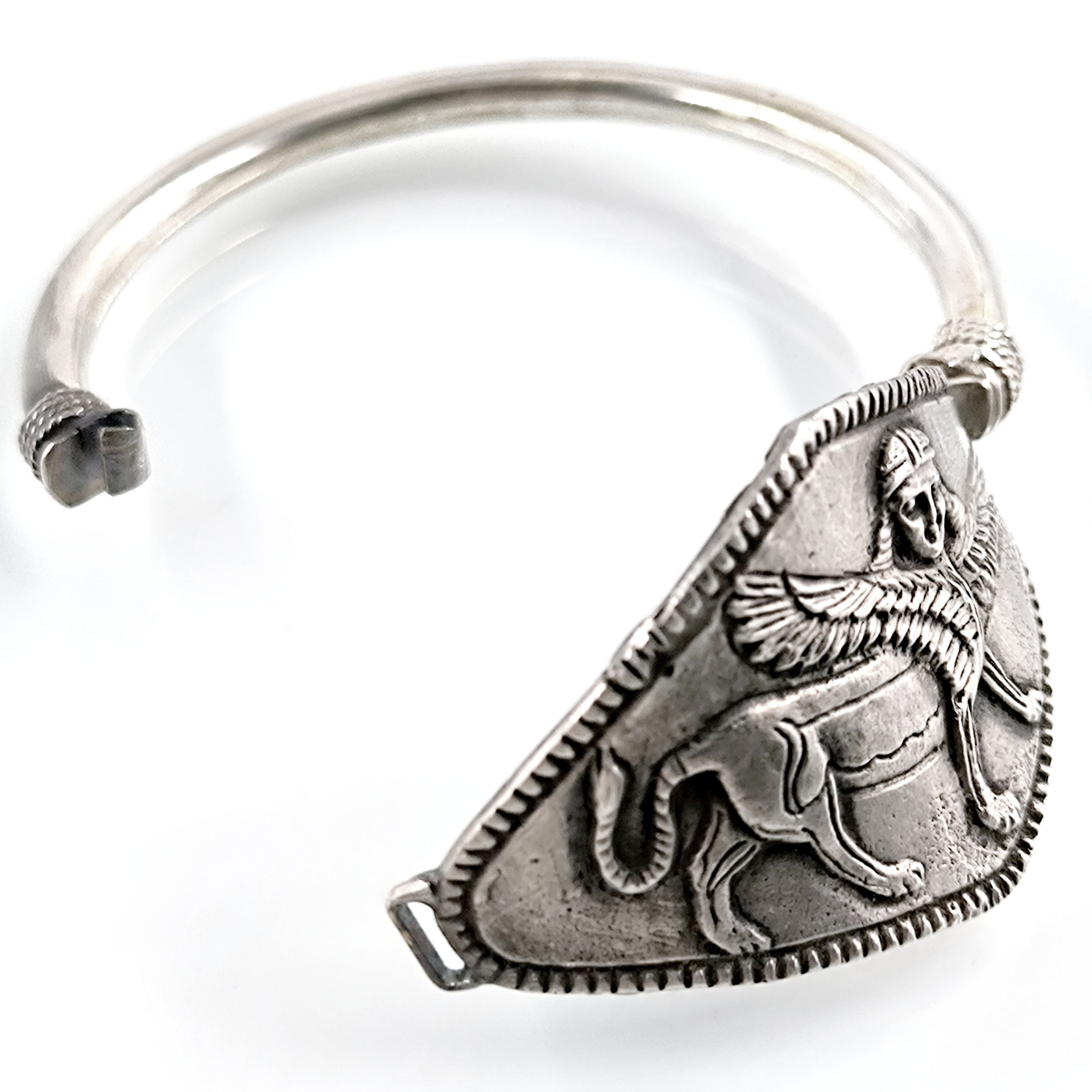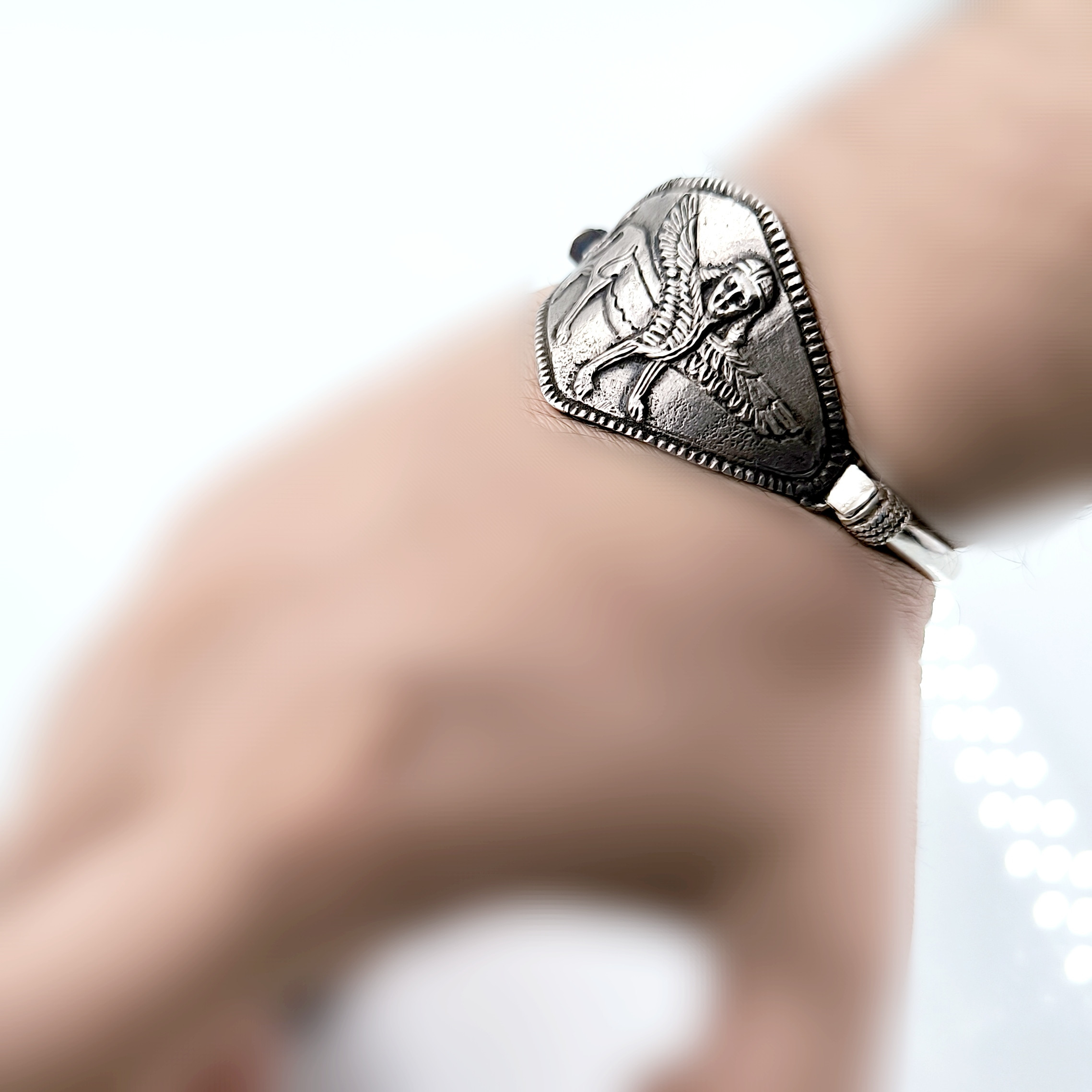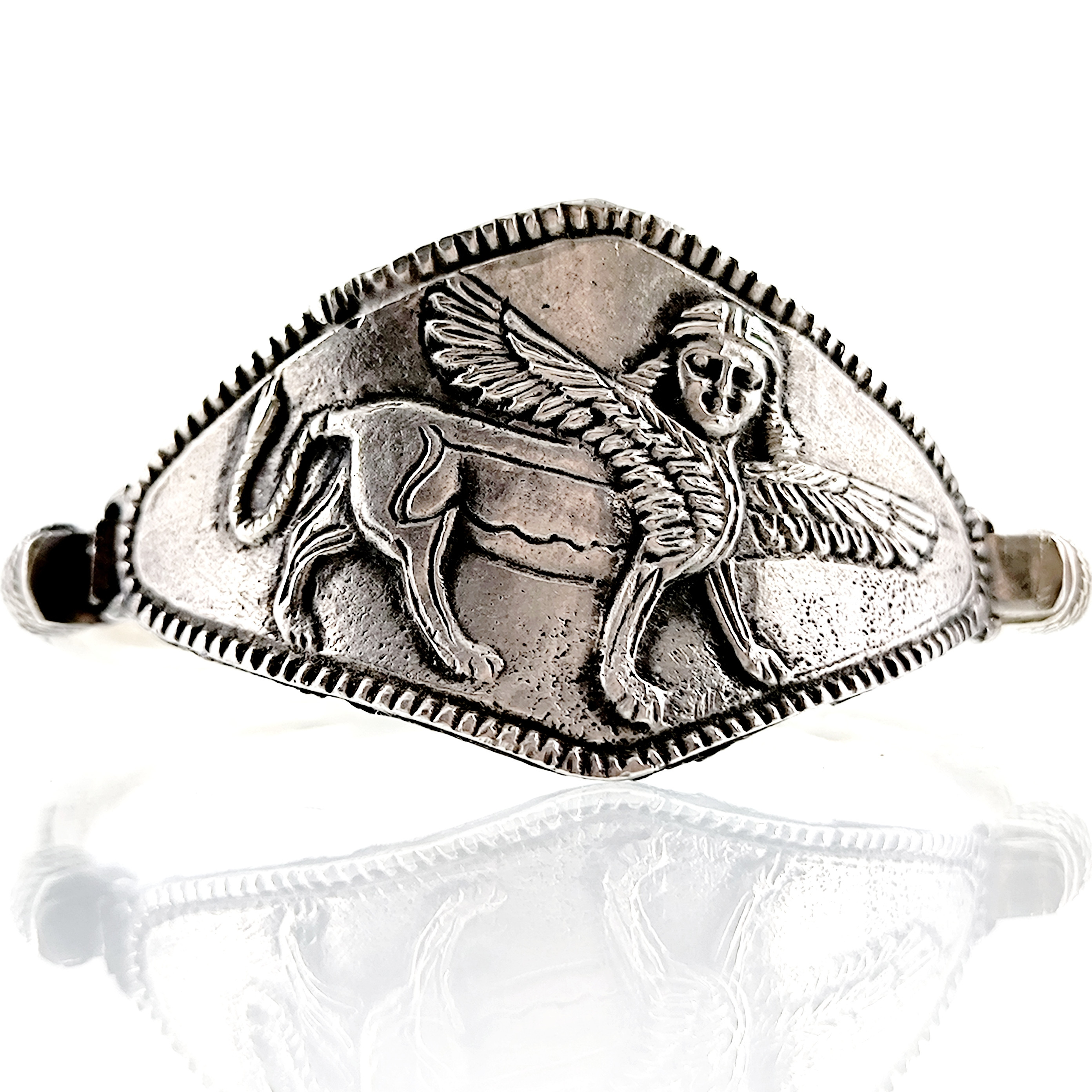 Sfenksler; kadın başlı, aslan gövdeli ve kartal kanatlı, tapınak ve mezar koruyucu mitolojik bir yaratıktır. Antik dönemde bir çok medeniyette kullanılan bu rölyef ve heykellerden esinlenerek çalıştığımız, mezopotamya stilinde gümüş Sfenks bileklik çalışmamız.! (İç çap 5.9cm & 32.6gr.)