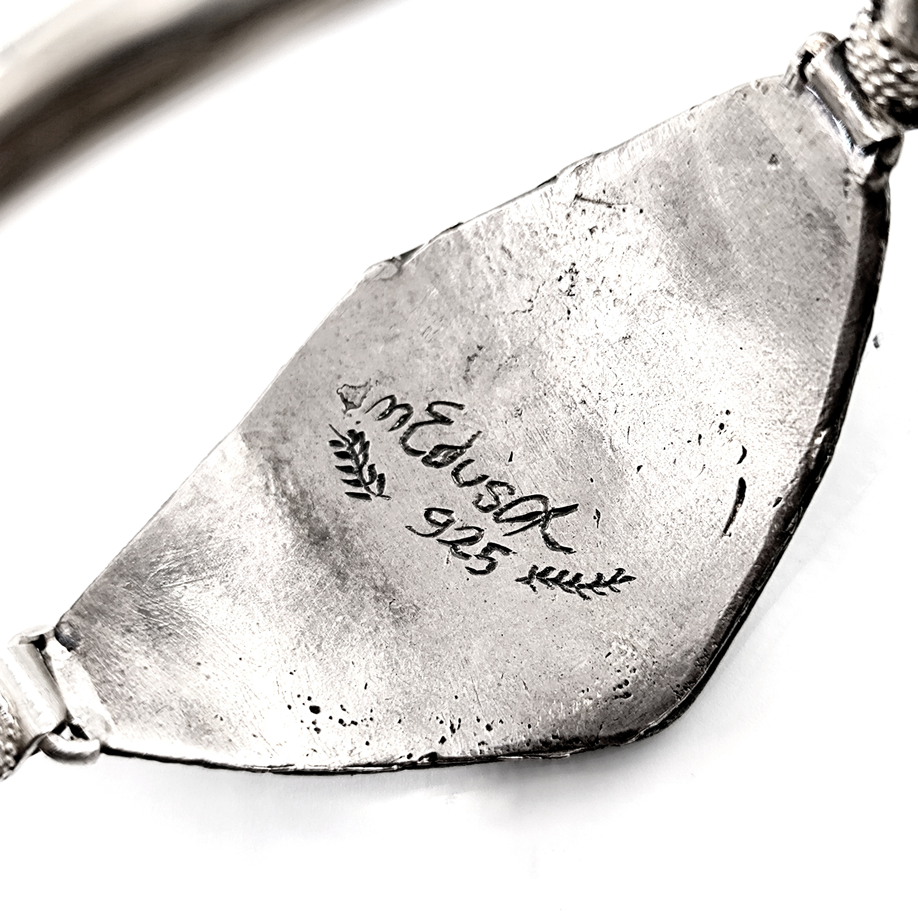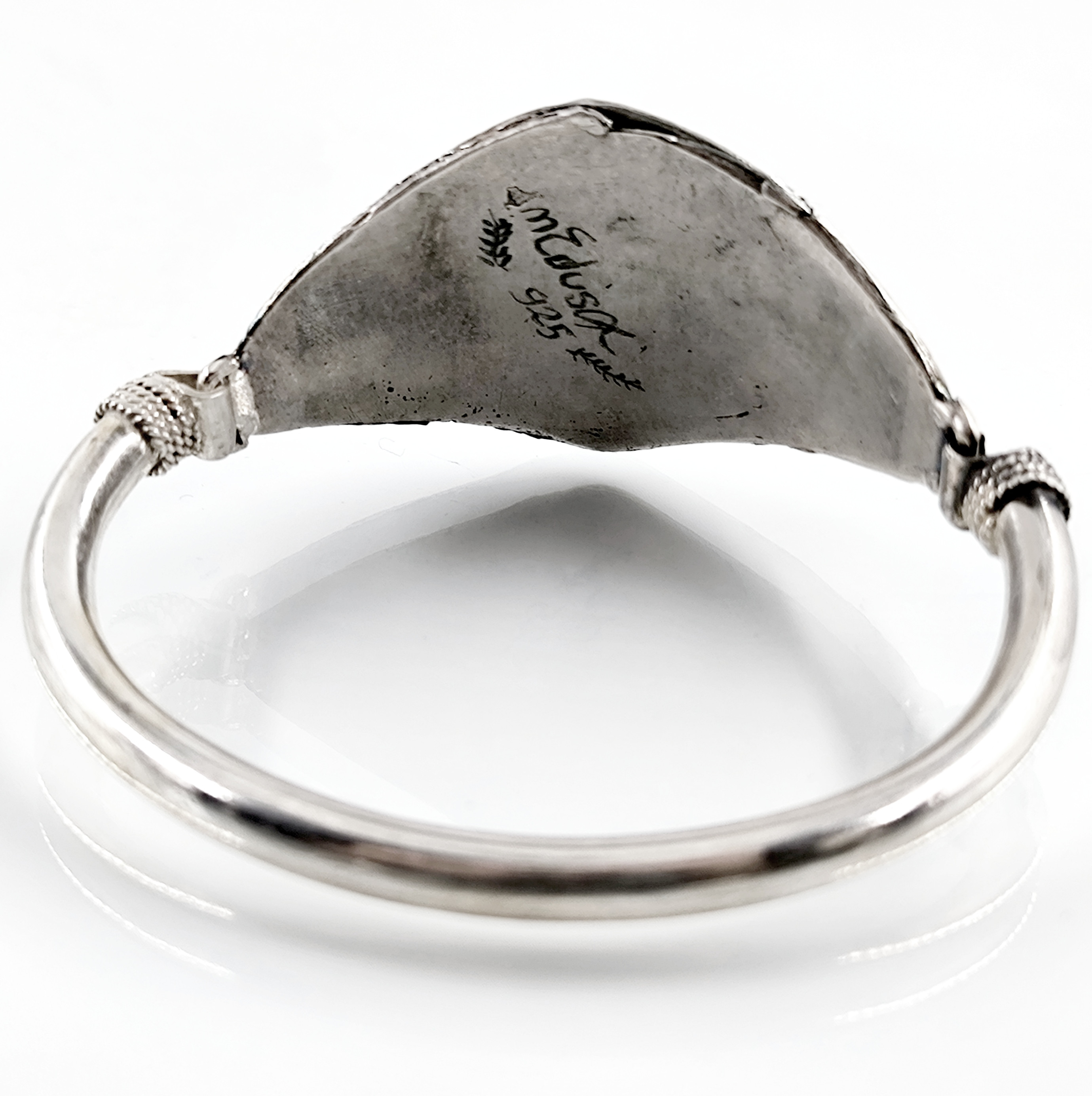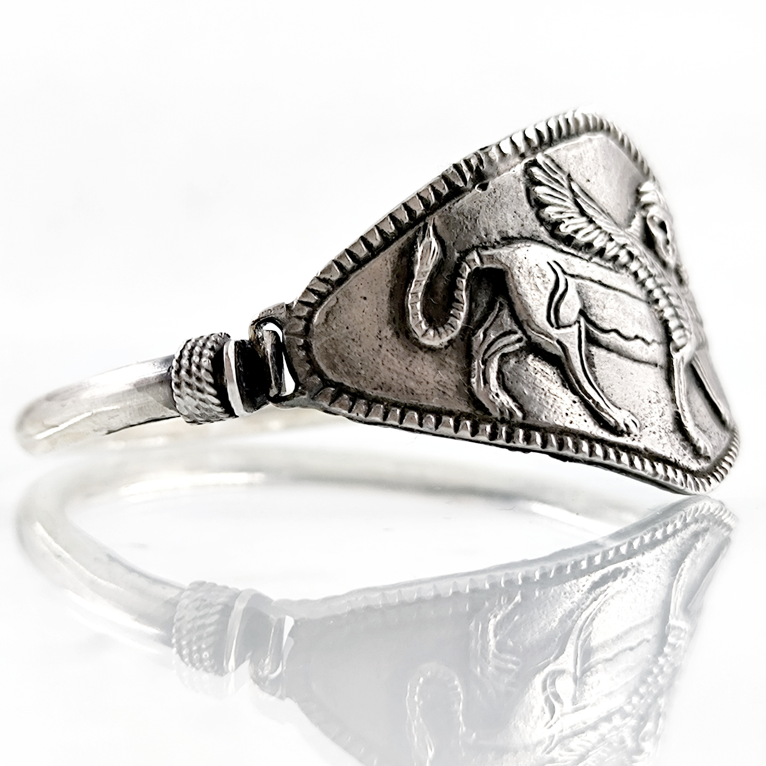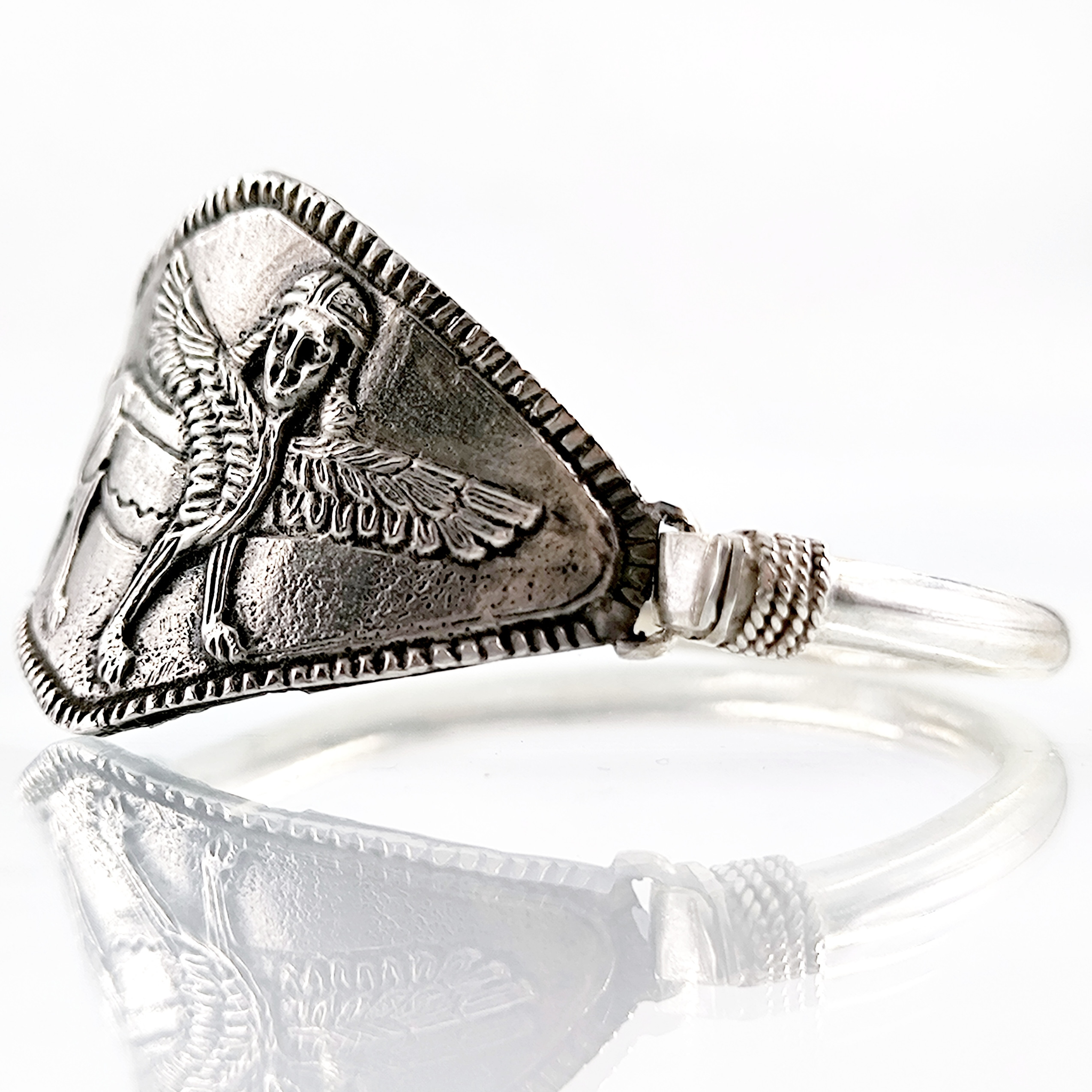 Sfenksler; kadın başlı, aslan gövdeli ve kartal kanatlı, tapınak ve mezar koruyucu mitolojik bir yaratıktır. Antik dönemde bir çok medeniyette kullanılan bu rölyef ve heykellerden esinlenerek çalıştığımız, mezopotamya stilinde gümüş Sfenks bileklik çalışmamız.! (İç çap 5.9cm & 32.6gr.)