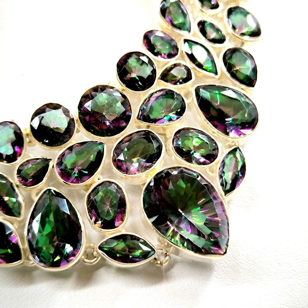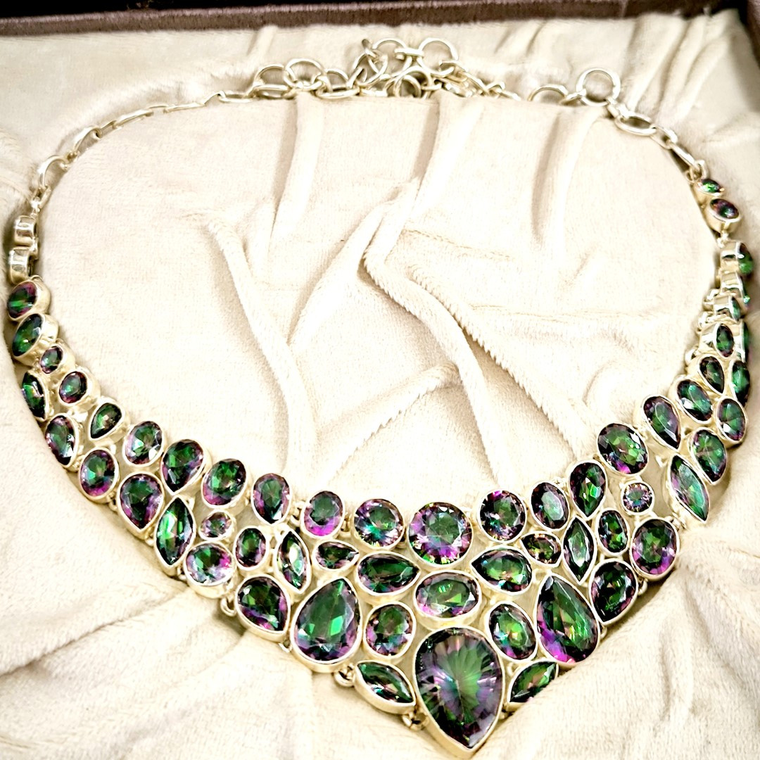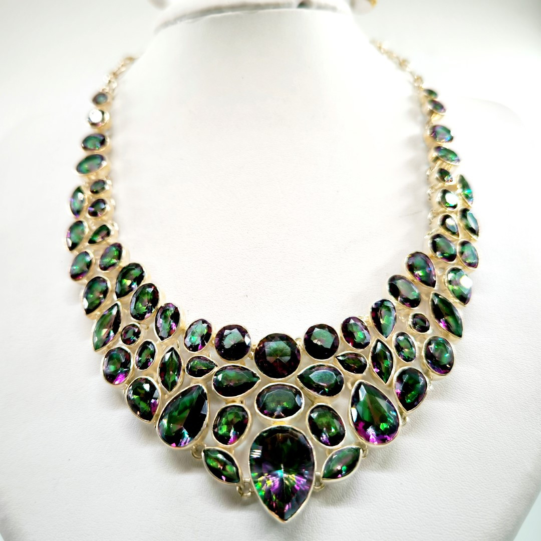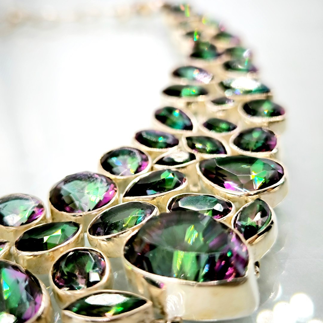 Komple faset kesim üst kalitede Mistik Topaz taşlar ile dekore edilen, tamamı gümüş ve tamamı çok özel bir işçiliğe sahip mücevher kalitesinde muhteşem göz alıcılığa sahip Mistik Topaz gerdanlığımız.! Ayrıca bu gerdanlığımıza özel gömme, işçilikli kadife tasarım kutumuz ile taçlandırdık.!!