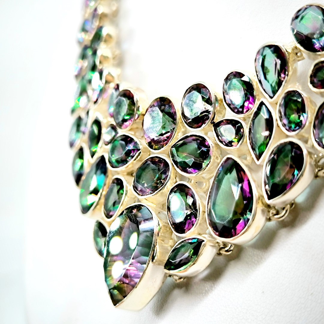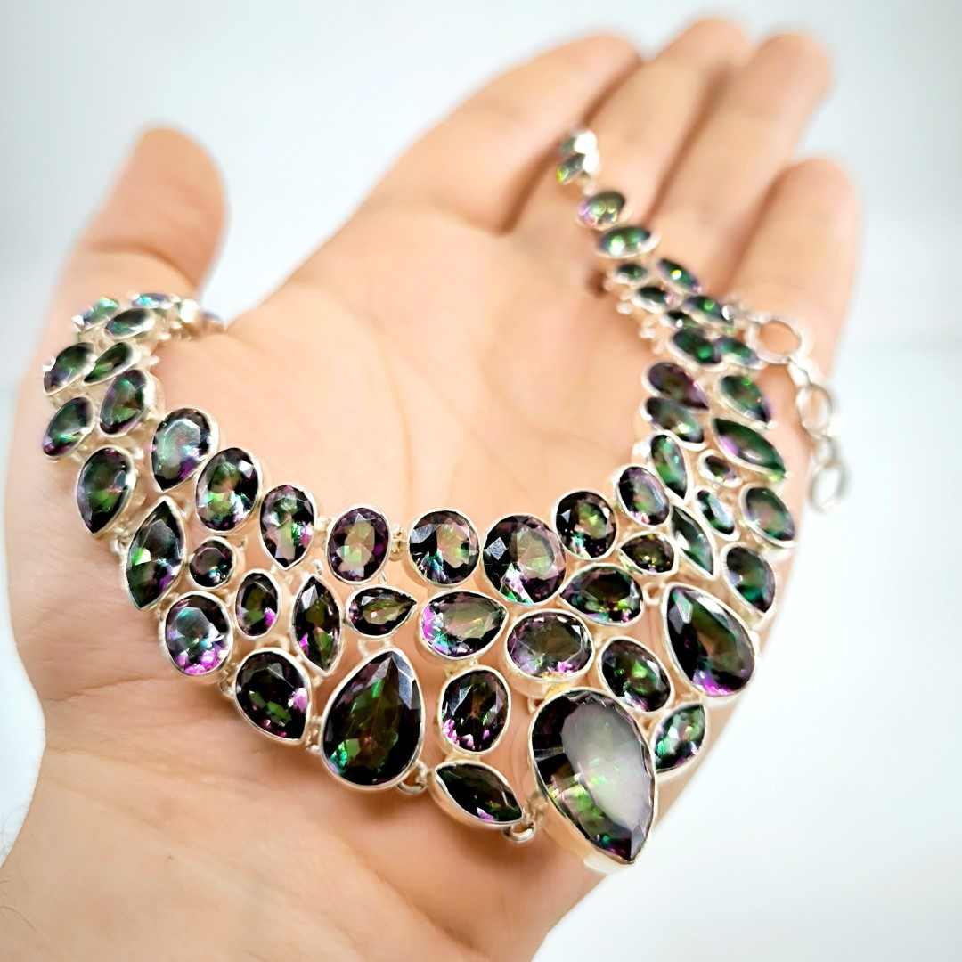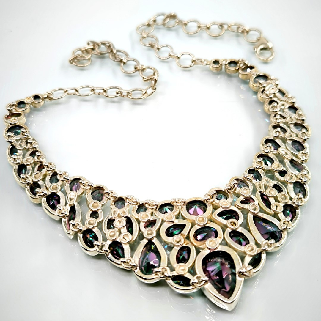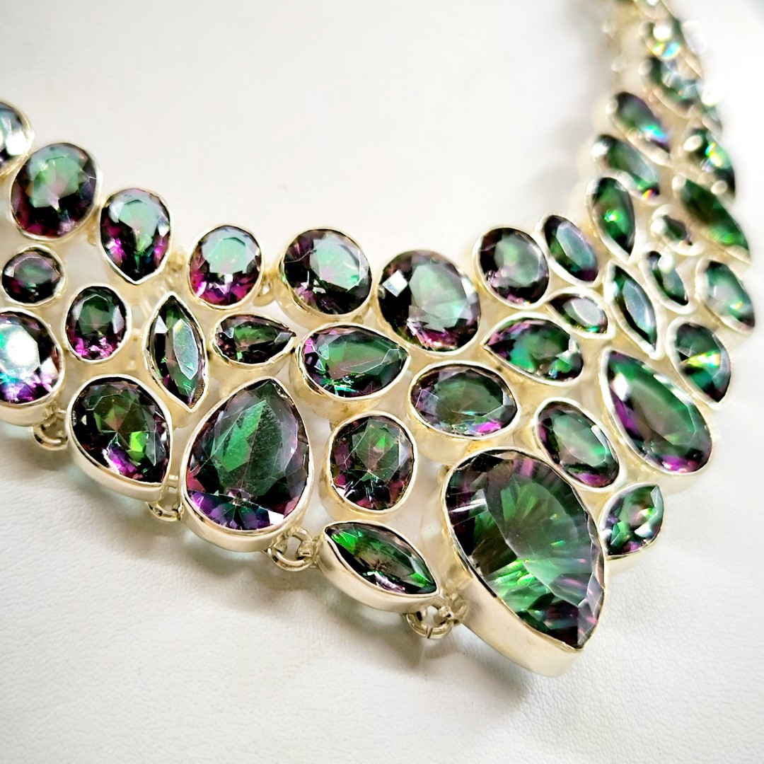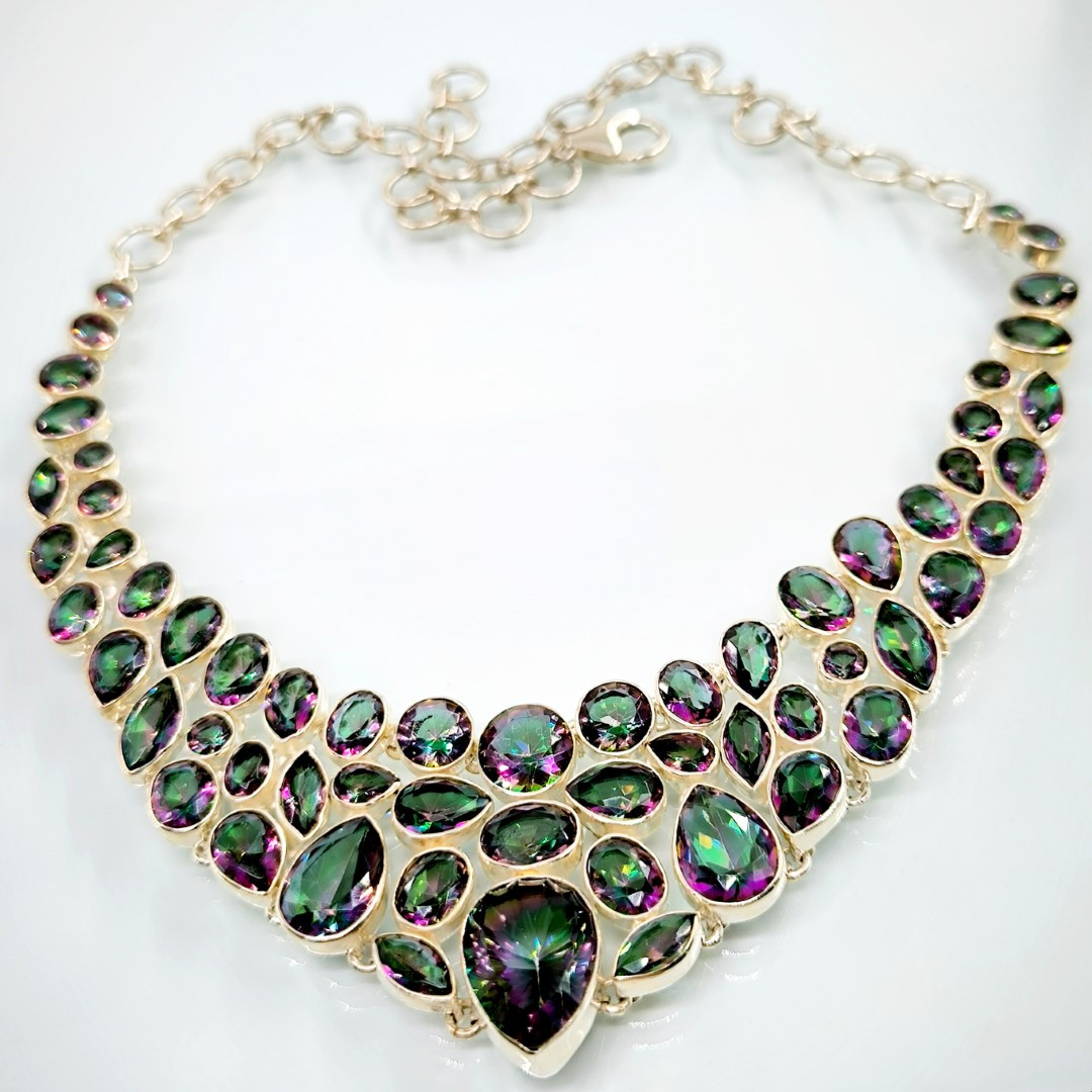 Komple faset kesim üst kalitede Mistik Topaz taşlar ile dekore edilen, tamamı gümüş ve tamamı çok özel bir işçiliğe sahip mücevher kalitesinde muhteşem göz alıcılığa sahip Mistik Topaz gerdanlığımız.! Ayrıca bu gerdanlığımıza özel gömme, işçilikli kadife tasarım kutumuz ile taçlandırdık.!!