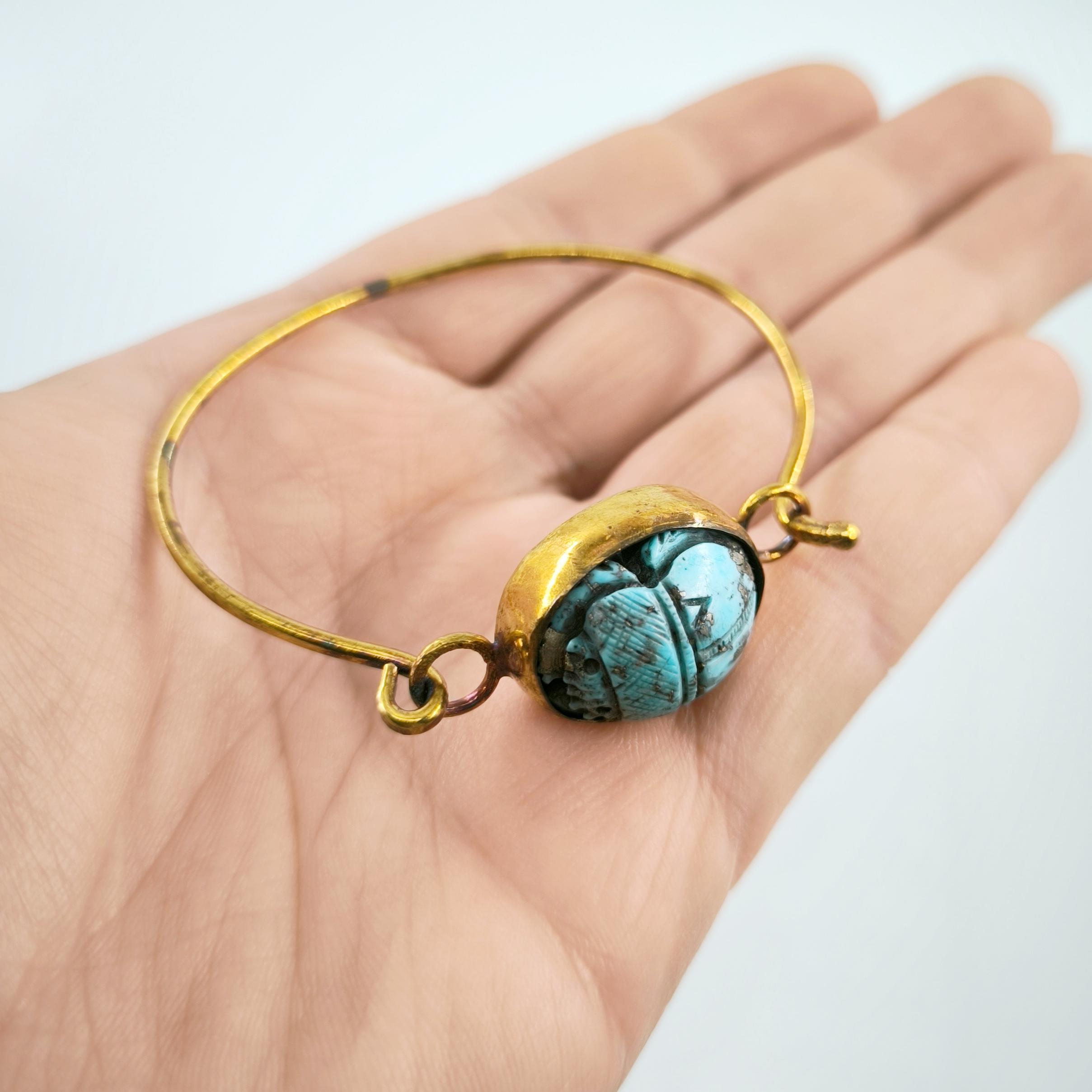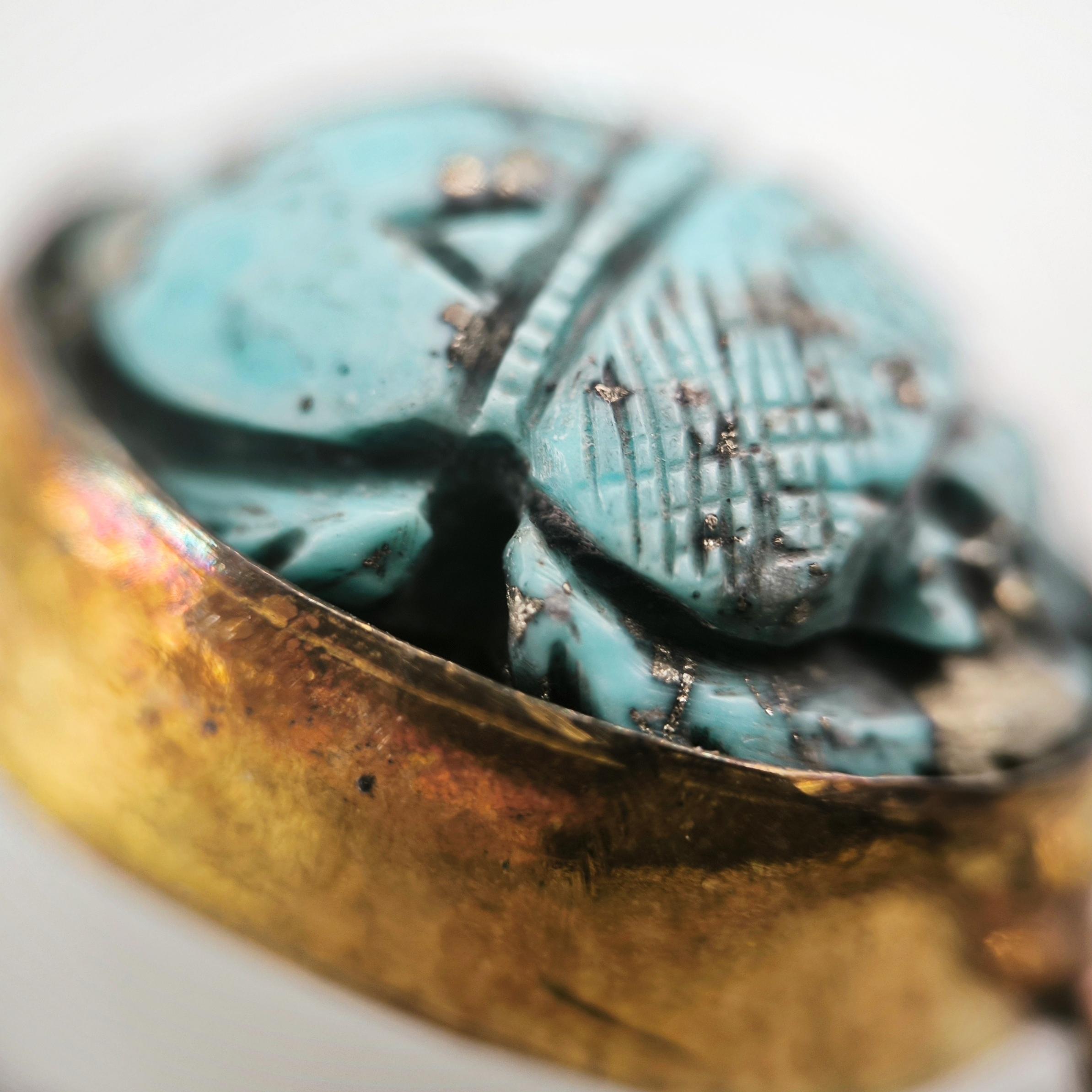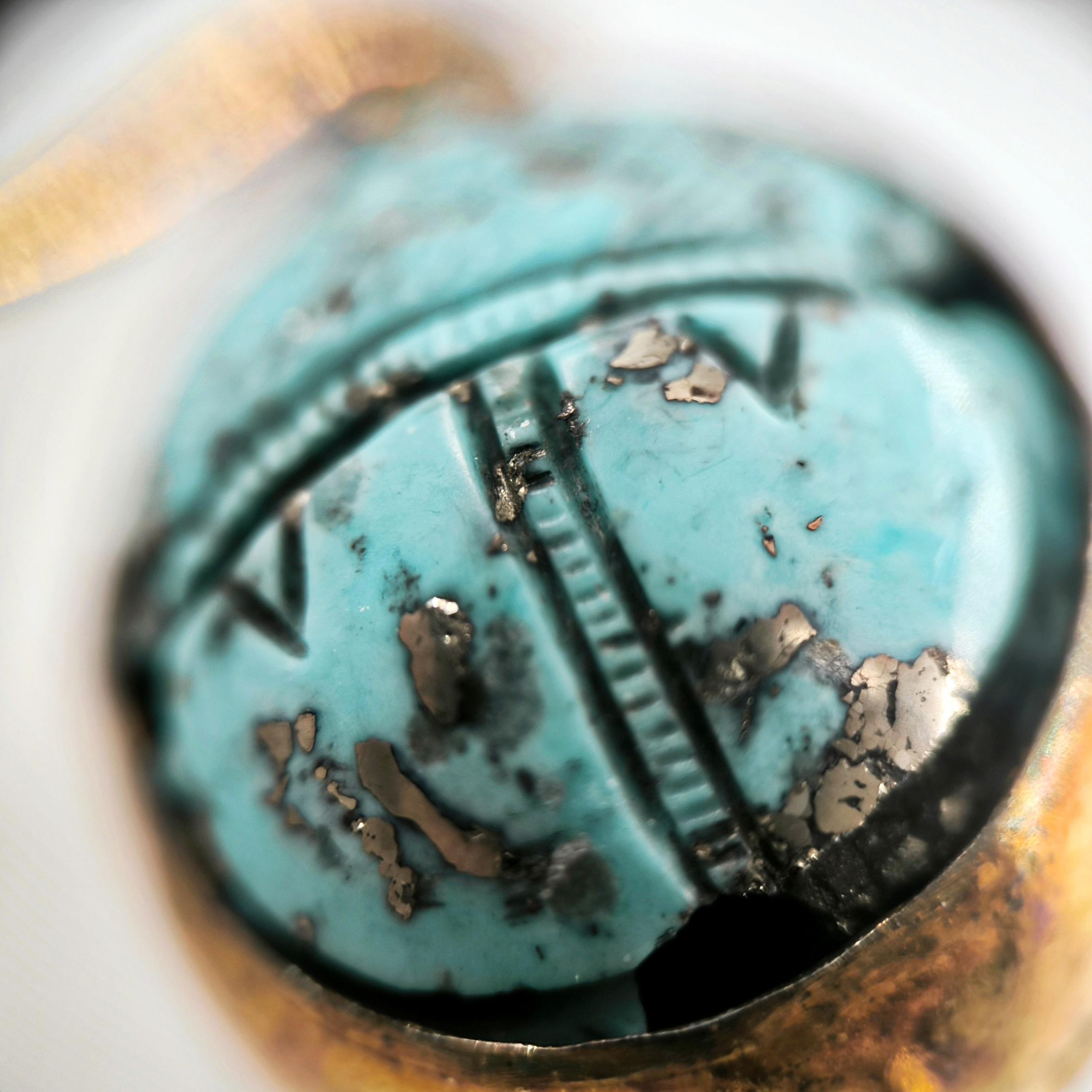 Natürel Firuze taş üzeri kabartma scarab çalıştığımız bu özel bilekliğimiz; tamamen bir ''mEdusA'' eseridir. Çerçevemiz komple 925 ayar gümüştür & üzeri 22K altın kaplamadır, ayrıca bu kaplamayı kendi tekniğimizle kızıllaştırarak daha antik bir görünüm elde ettik!