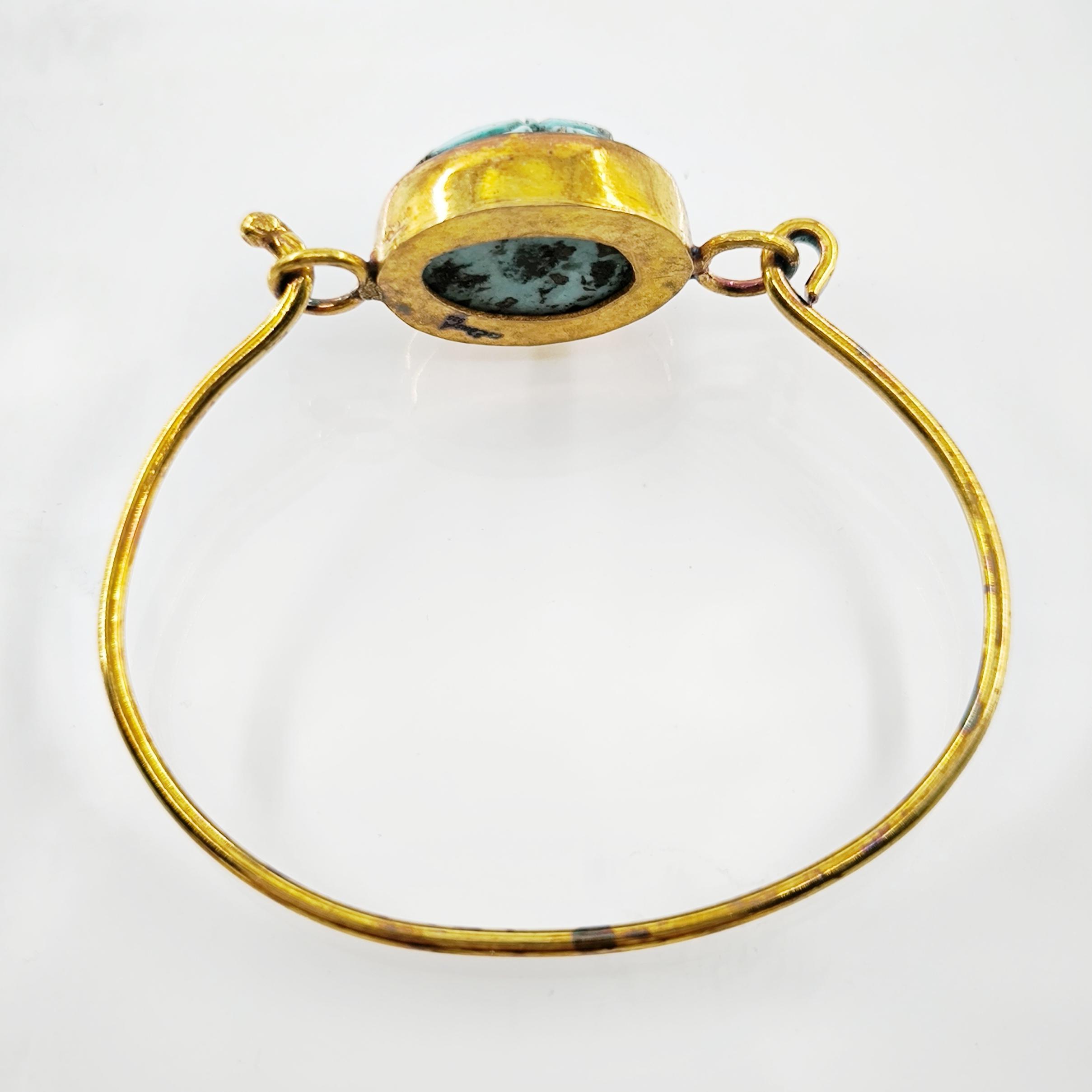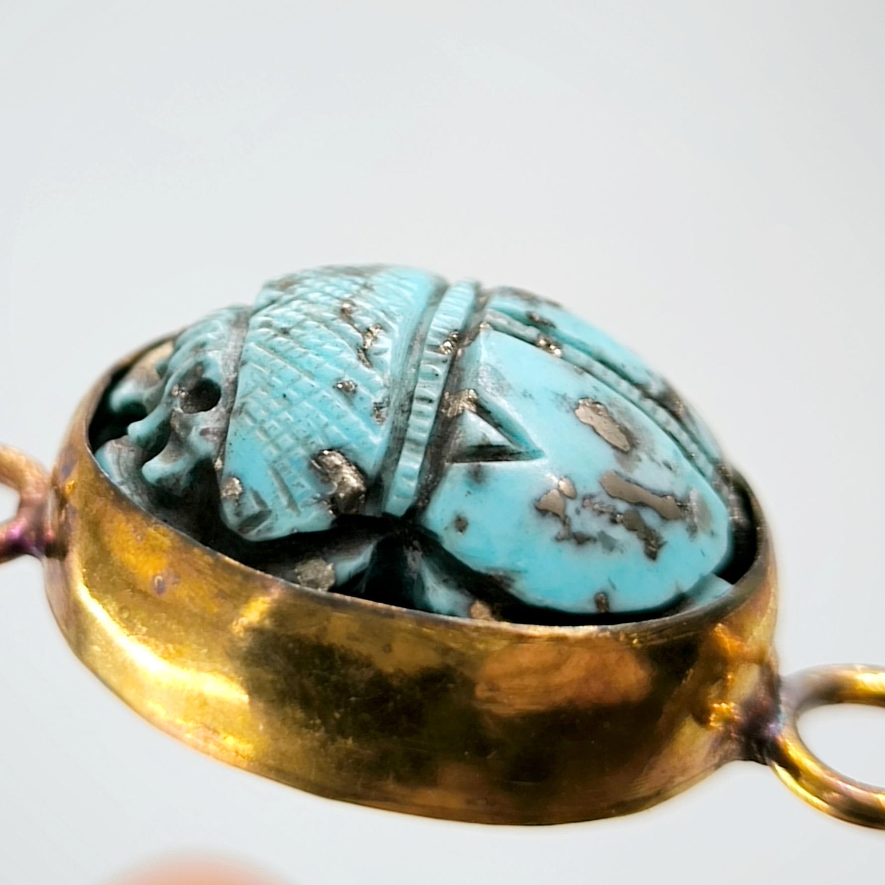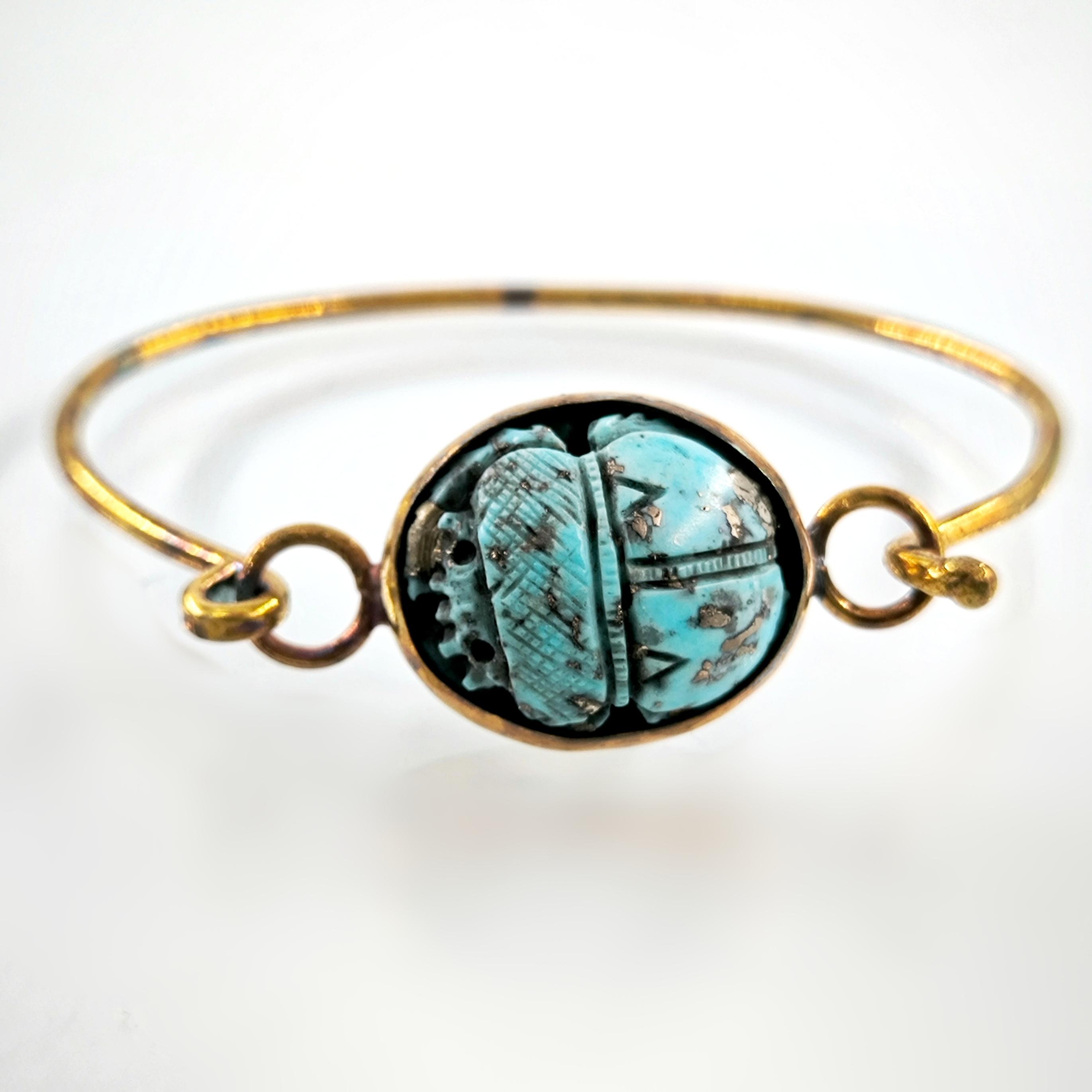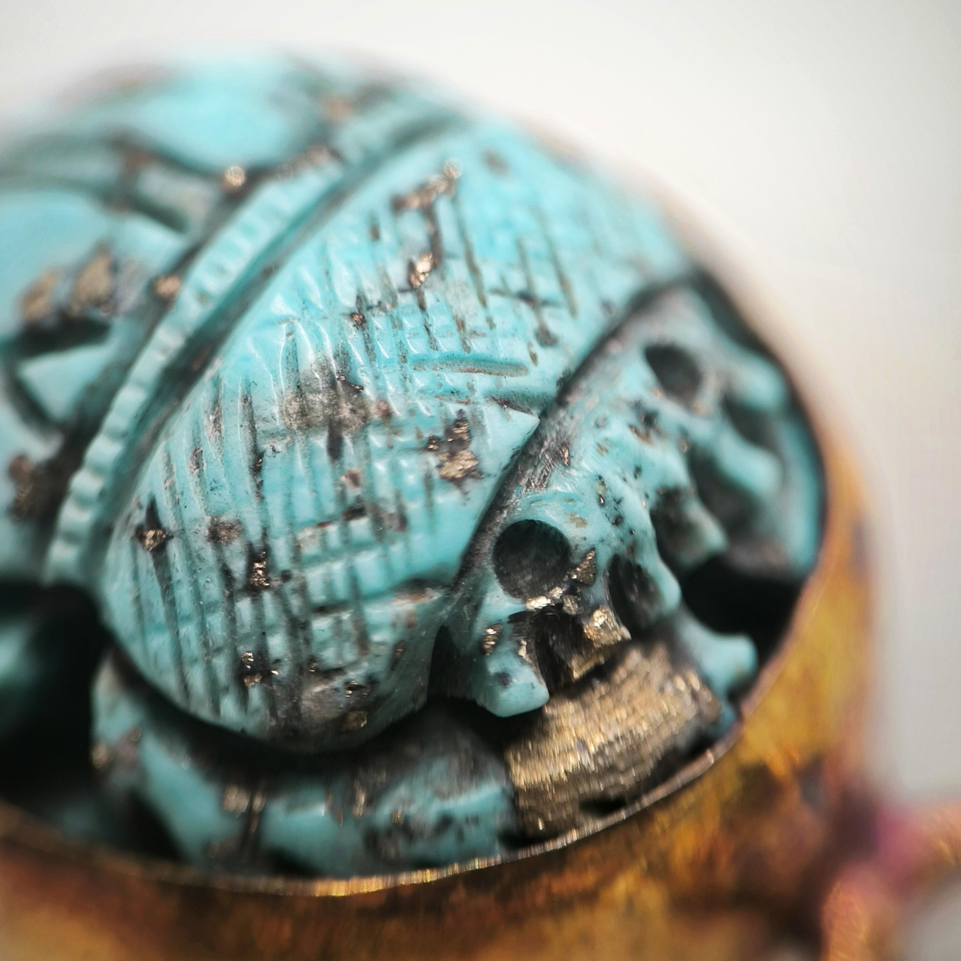 Natürel Firuze taş üzeri kabartma scarab çalıştığımız bu özel bilekliğimiz; tamamen bir ''mEdusA'' eseridir. Çerçevemiz komple 925 ayar gümüştür & üzeri 22K altın kaplamadır, ayrıca bu kaplamayı kendi tekniğimizle kızıllaştırarak daha antik bir görünüm elde ettik!