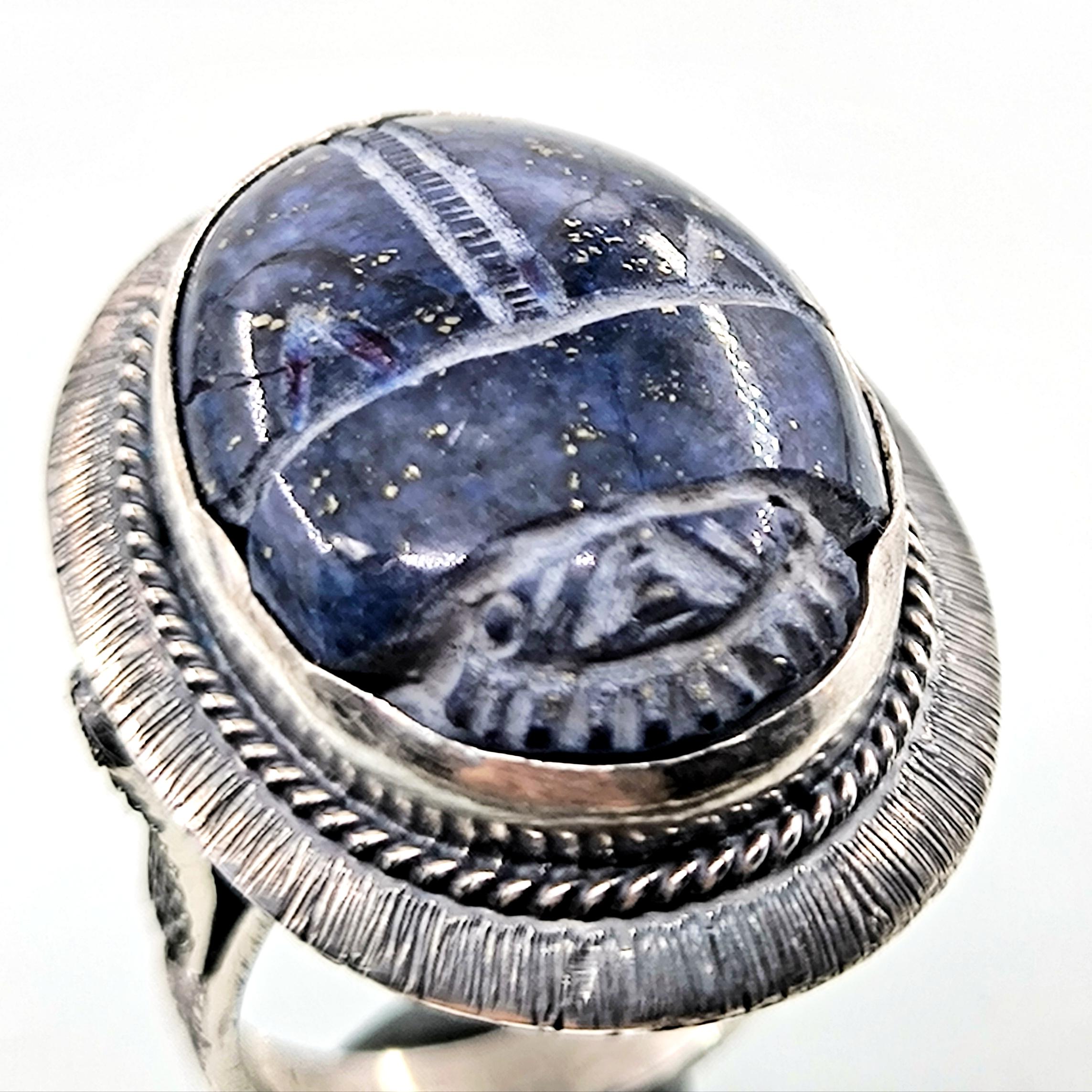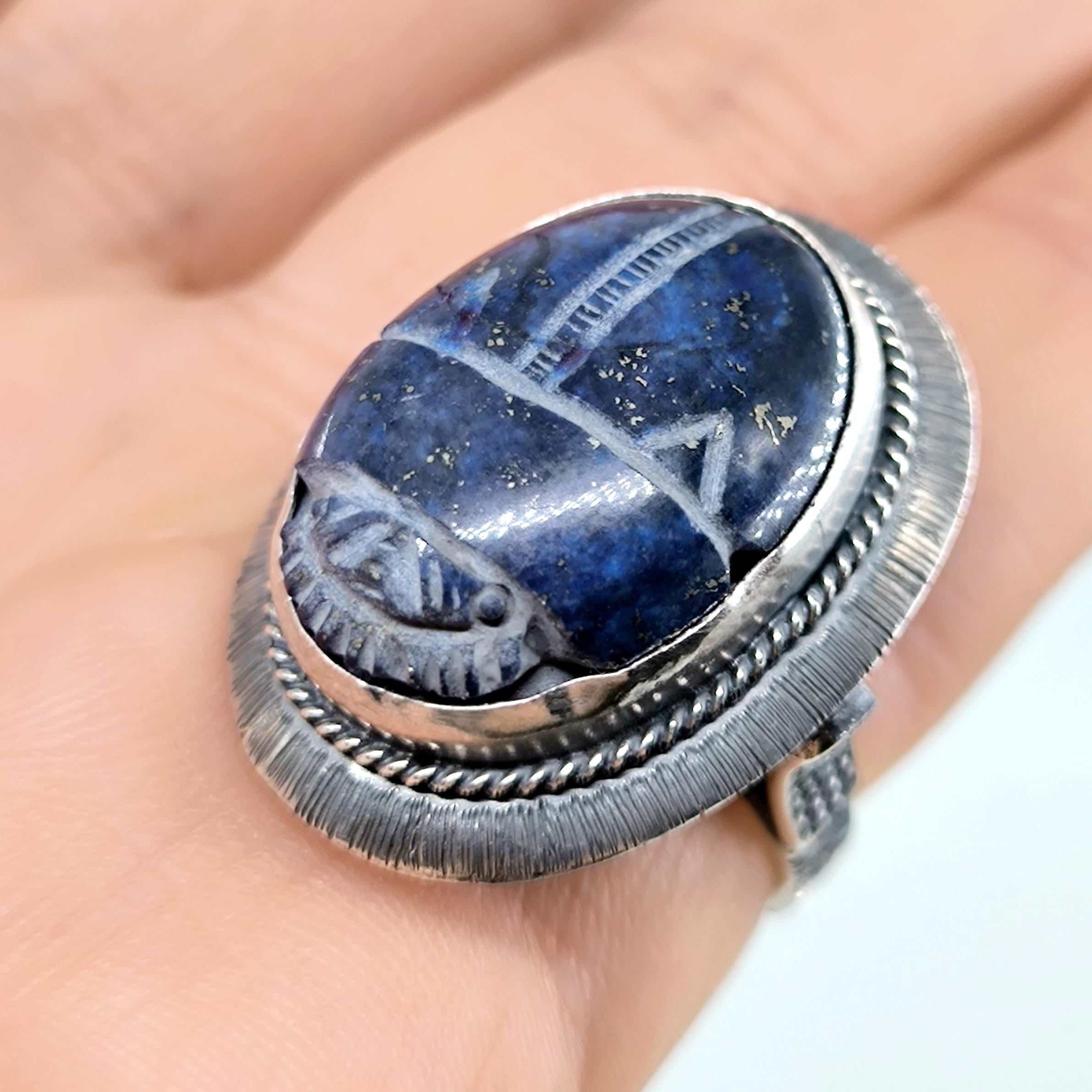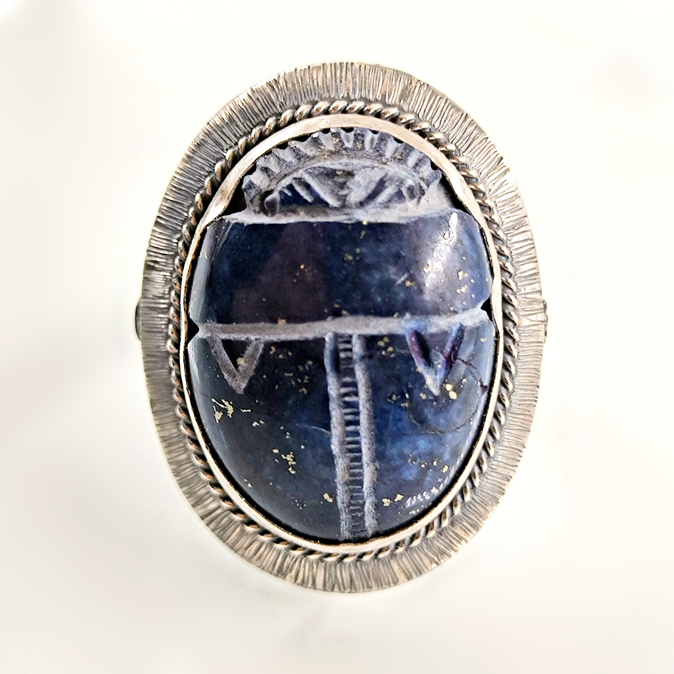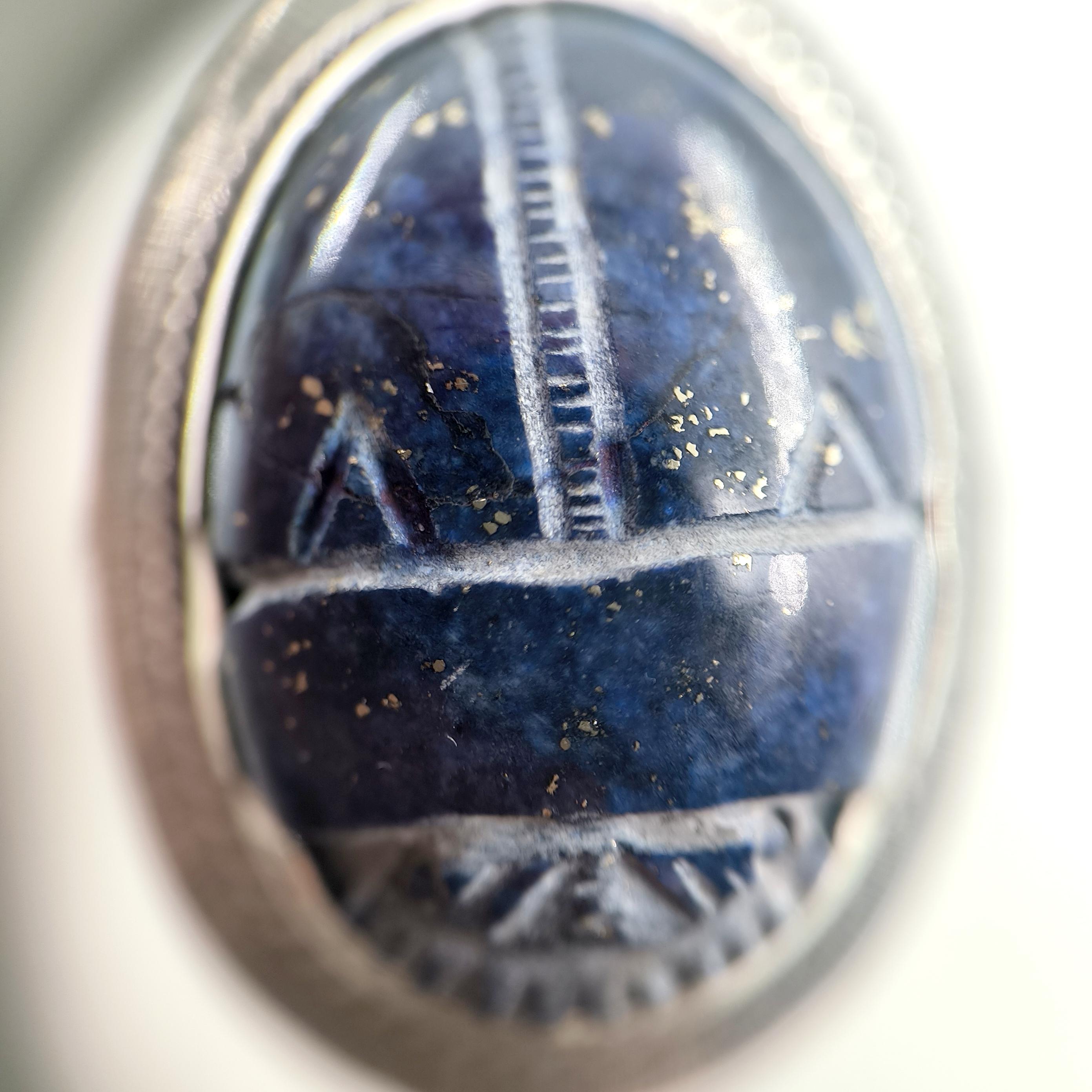 Antik Mısır’ın tapınak duvarlarında yazılıdır: Scarab, güneşin her gün yeniden doğuşunun ve ruhun ölümsüz dönüşüm yolculuğunun kutsal taşıyıcısıdır. Nil’in sessiz sularını yararak yükselen bu sembol, karanlıktan aydınlığa geçişin, değişimin ve yeniden doğuşun tılsımı olarak kabul edilirdi. Derin gece mavisi lapis lazuli üzerine oyulan scarab figürü, göklerin bilgelik taşının kadim gücünü modern bir tılsım gibi taşınabilir kılar. El işçiliği negatif intaglio tekniği, figürün her çizgisini yaşayan bir sembole dönüştürürken, bombeli tabanlı kallavi gümüş kasa güçlü bir duruş katmaktadır. El işçiliği 925 ayar gümüşten üretilmiş olup tek adet hazırlanmıştır.