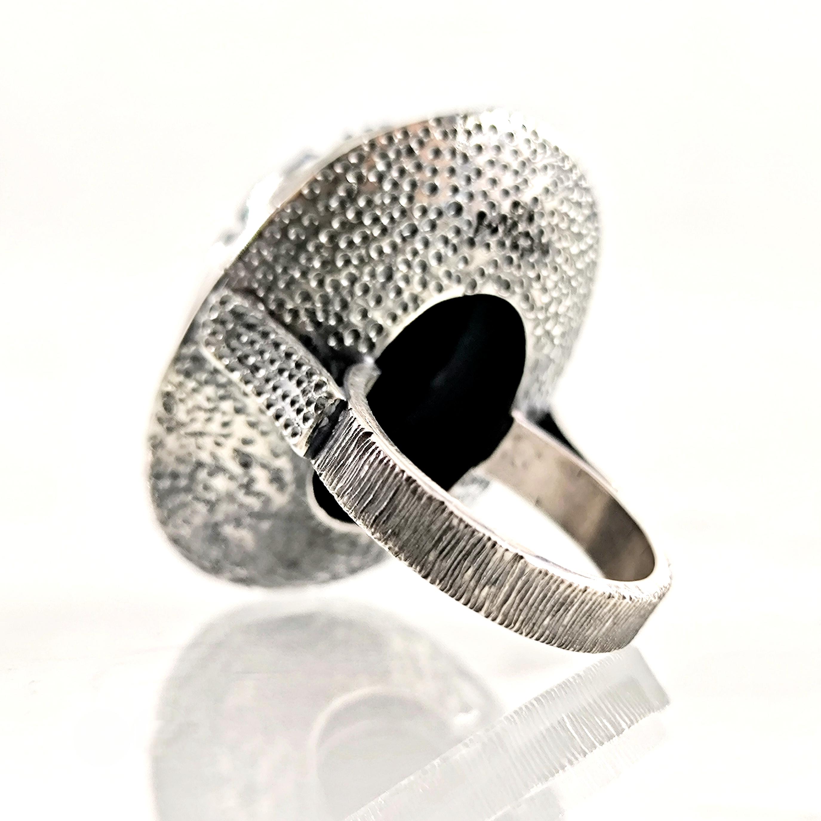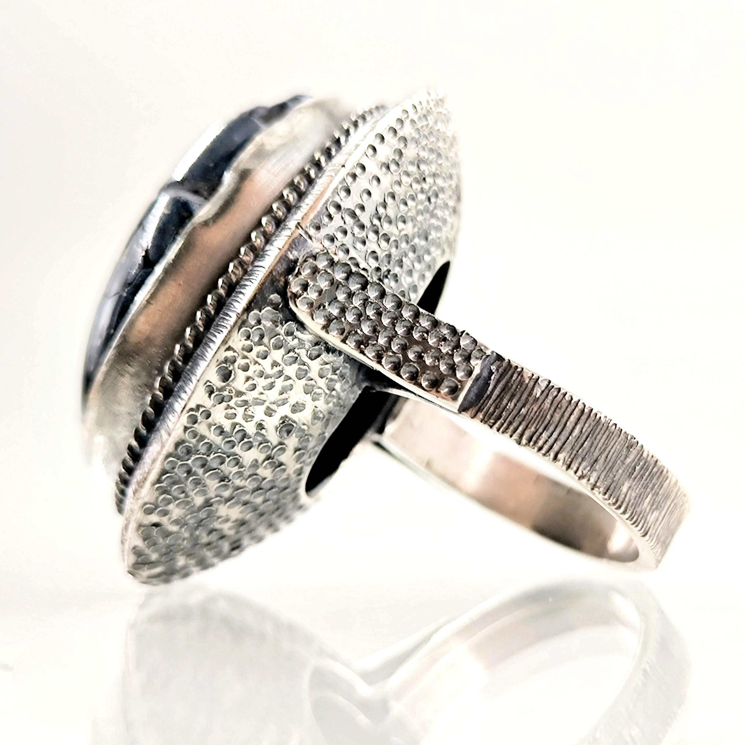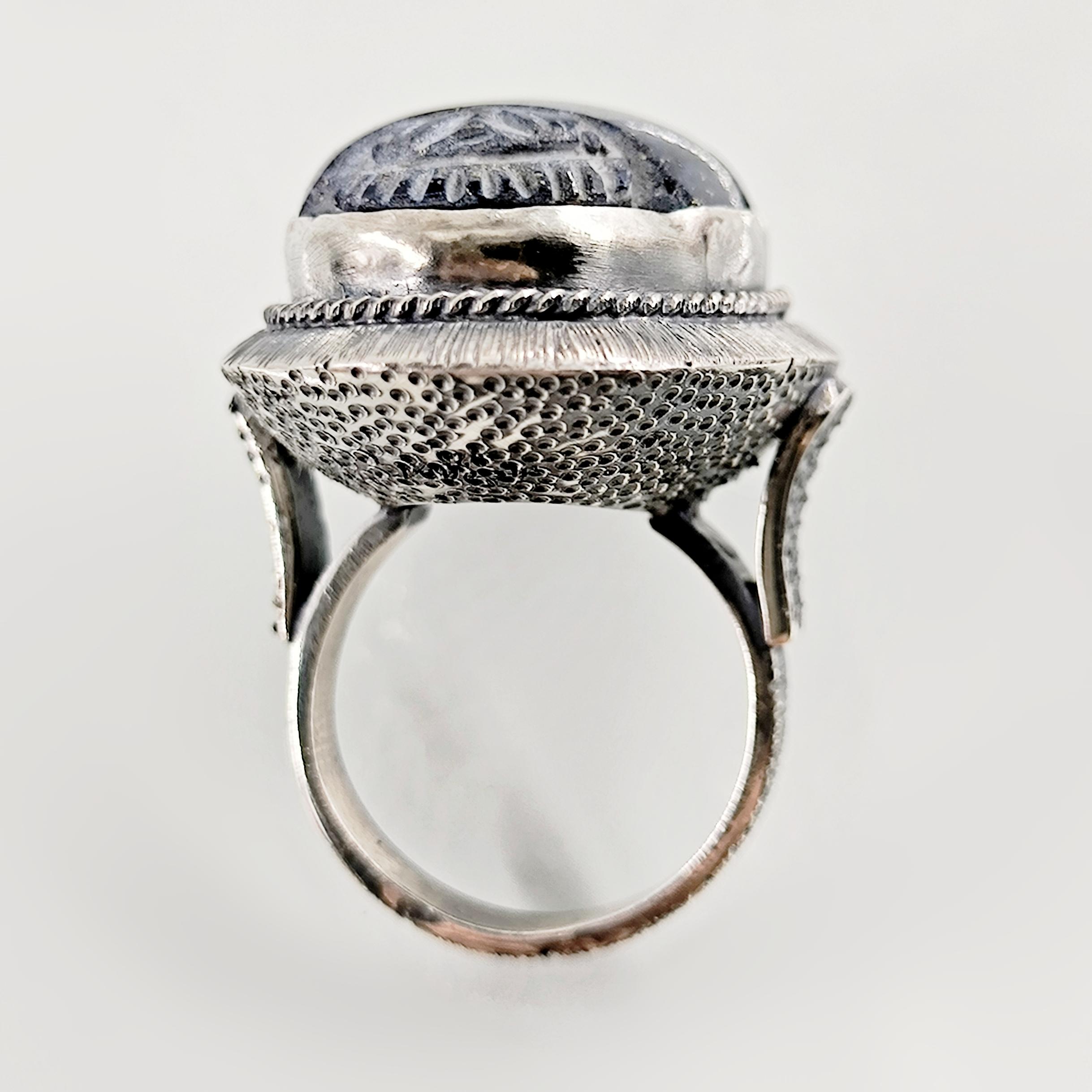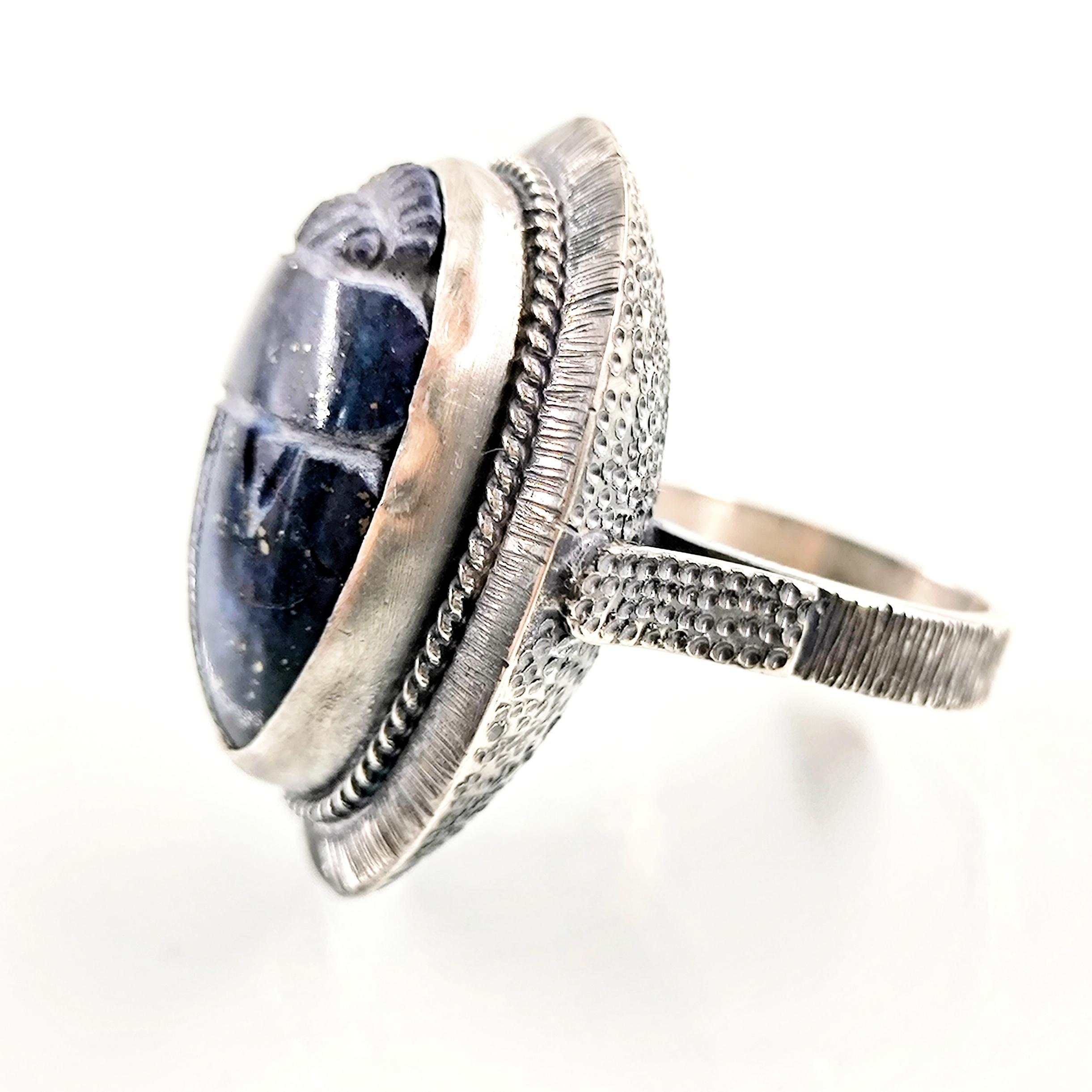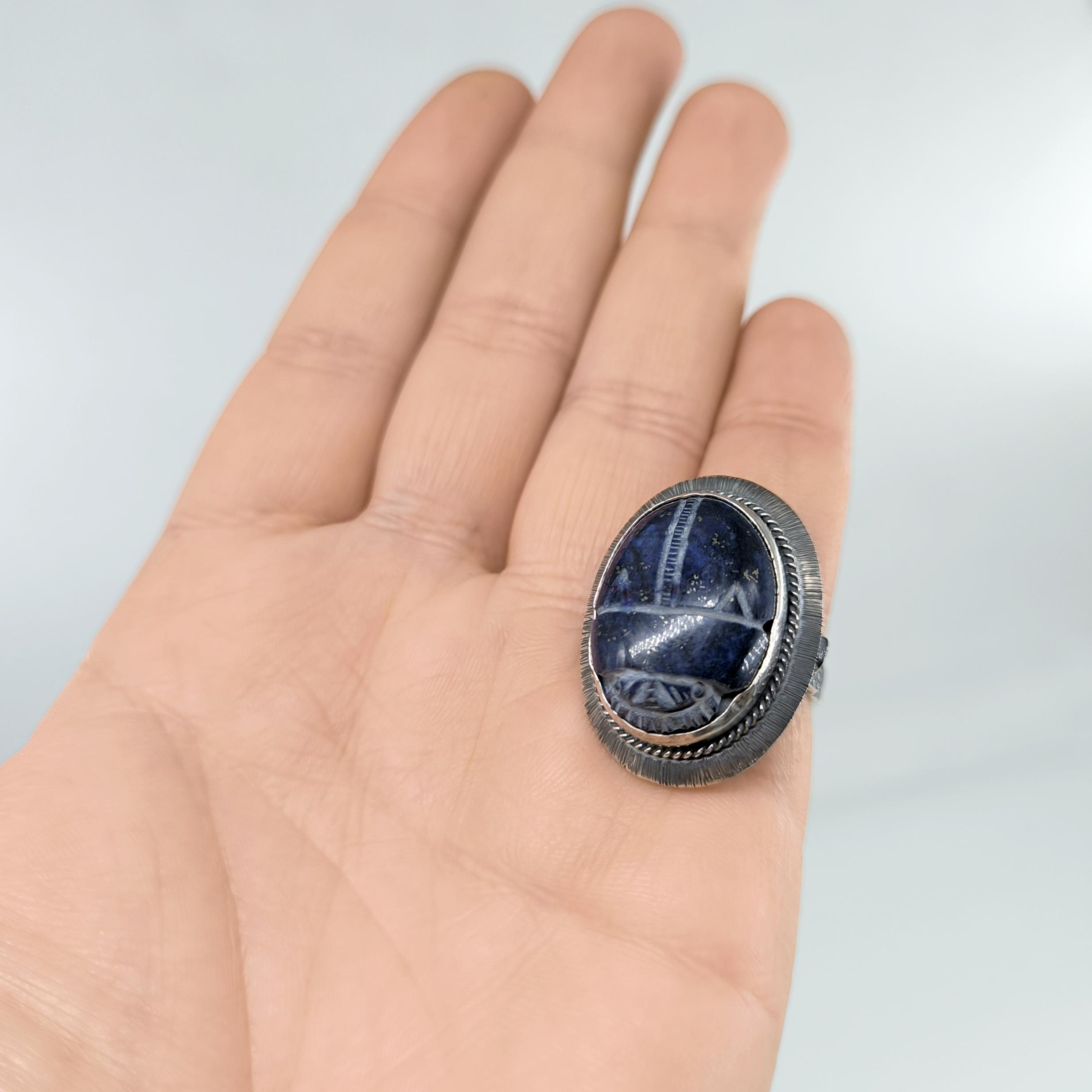 Antik Mısır’ın tapınak duvarlarında yazılıdır: Scarab, güneşin her gün yeniden doğuşunun ve ruhun ölümsüz dönüşüm yolculuğunun kutsal taşıyıcısıdır. Nil’in sessiz sularını yararak yükselen bu sembol, karanlıktan aydınlığa geçişin, değişimin ve yeniden doğuşun tılsımı olarak kabul edilirdi. Derin gece mavisi lapis lazuli üzerine oyulan scarab figürü, göklerin bilgelik taşının kadim gücünü modern bir tılsım gibi taşınabilir kılar. El işçiliği negatif intaglio tekniği, figürün her çizgisini yaşayan bir sembole dönüştürürken, bombeli tabanlı kallavi gümüş kasa güçlü bir duruş katmaktadır. El işçiliği 925 ayar gümüşten üretilmiş olup tek adet hazırlanmıştır.