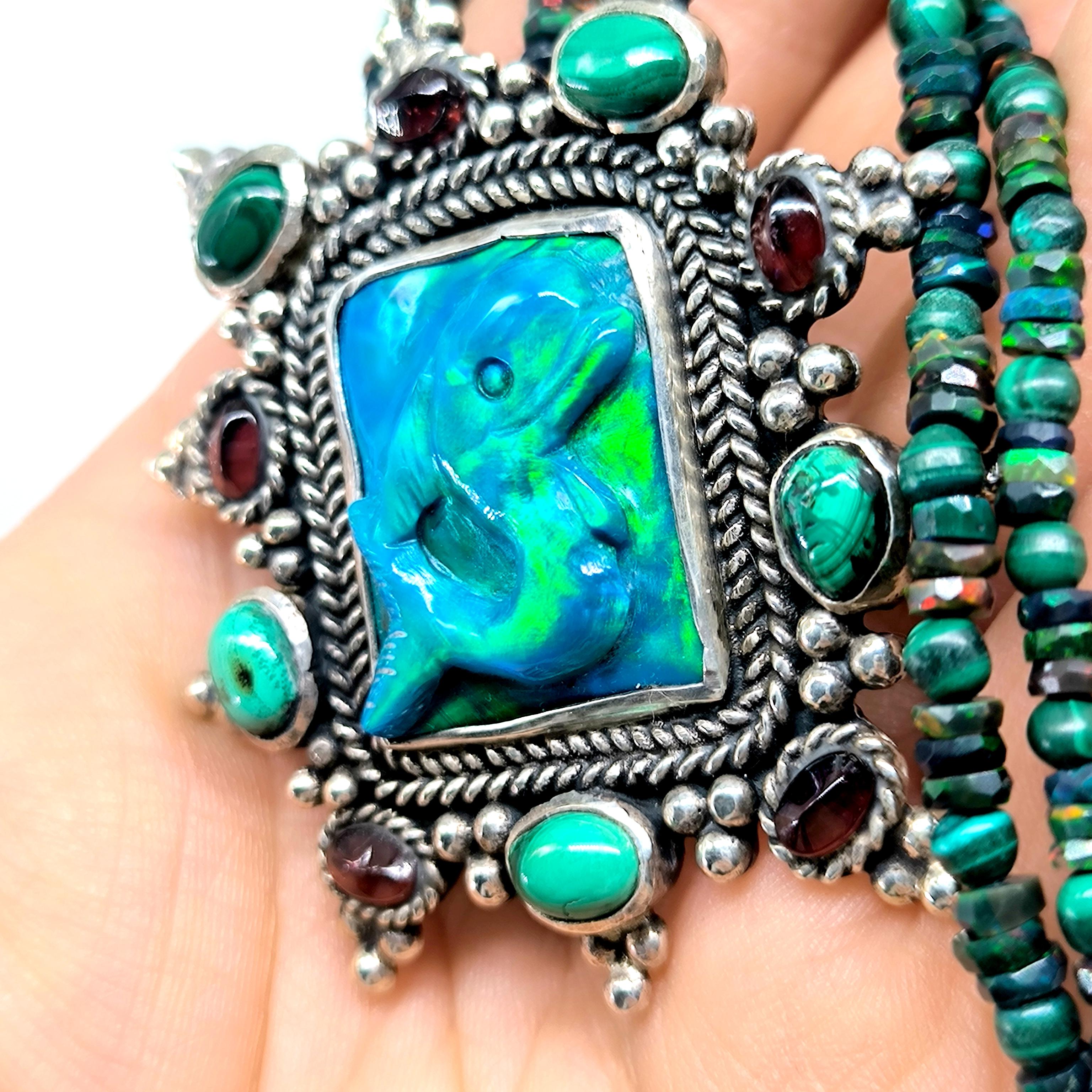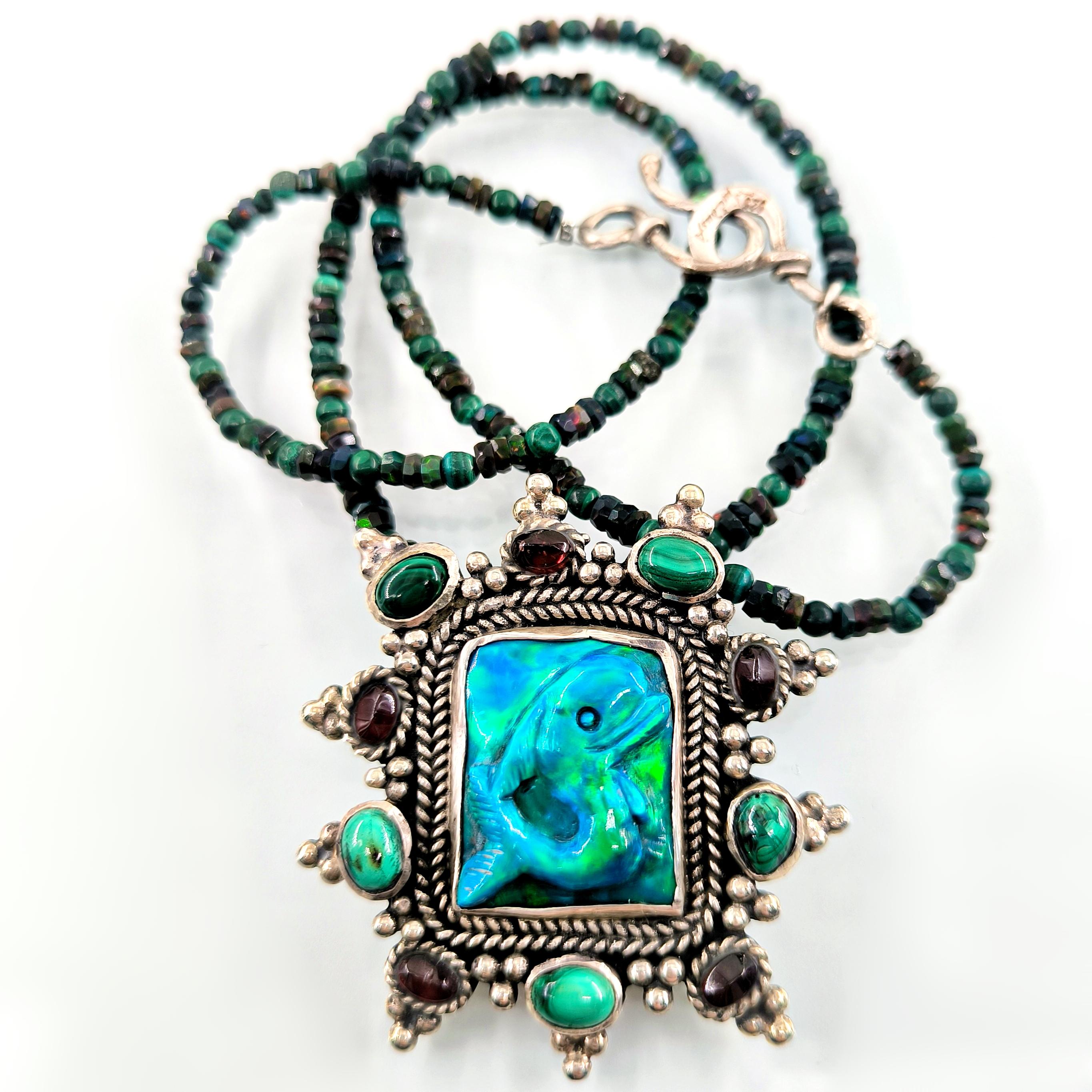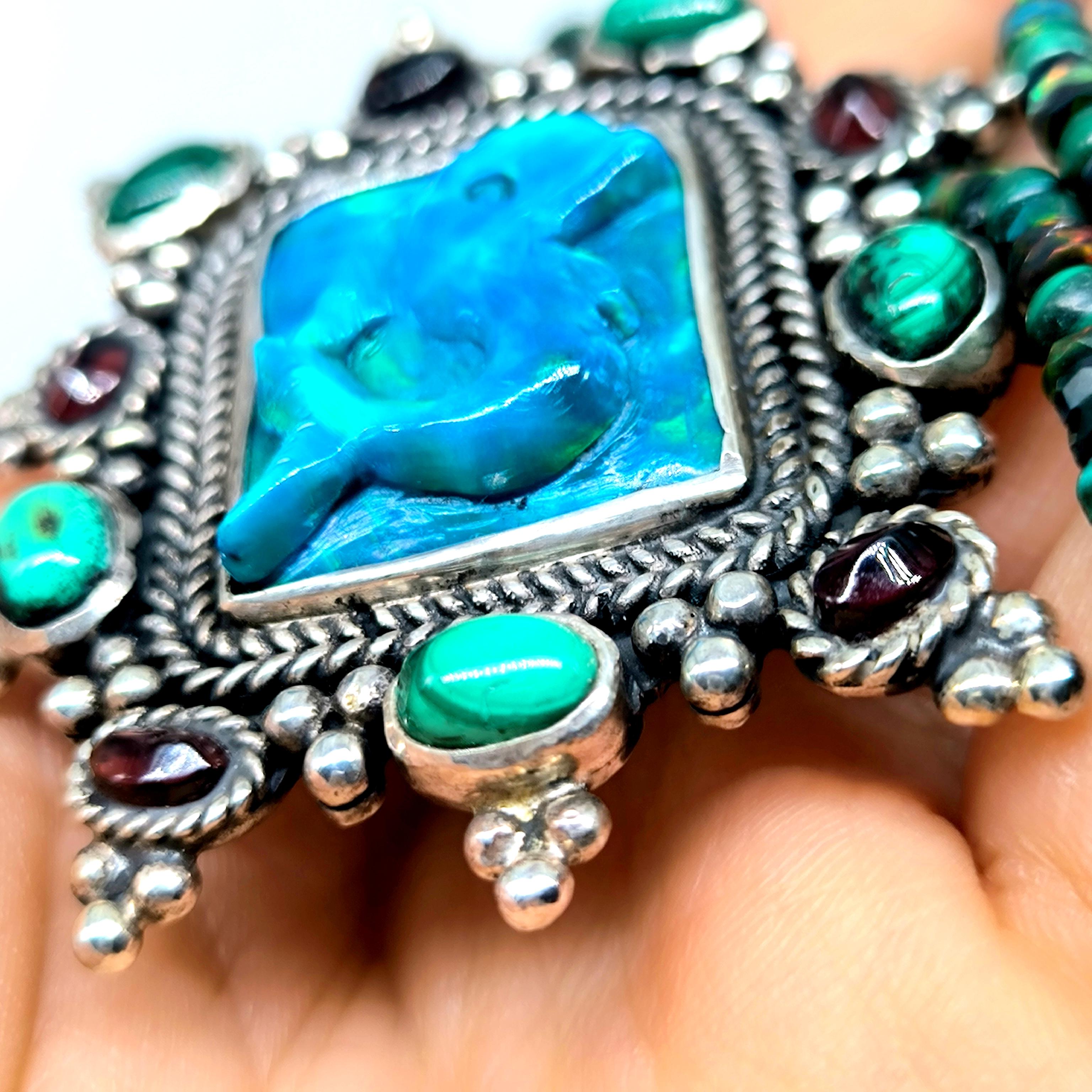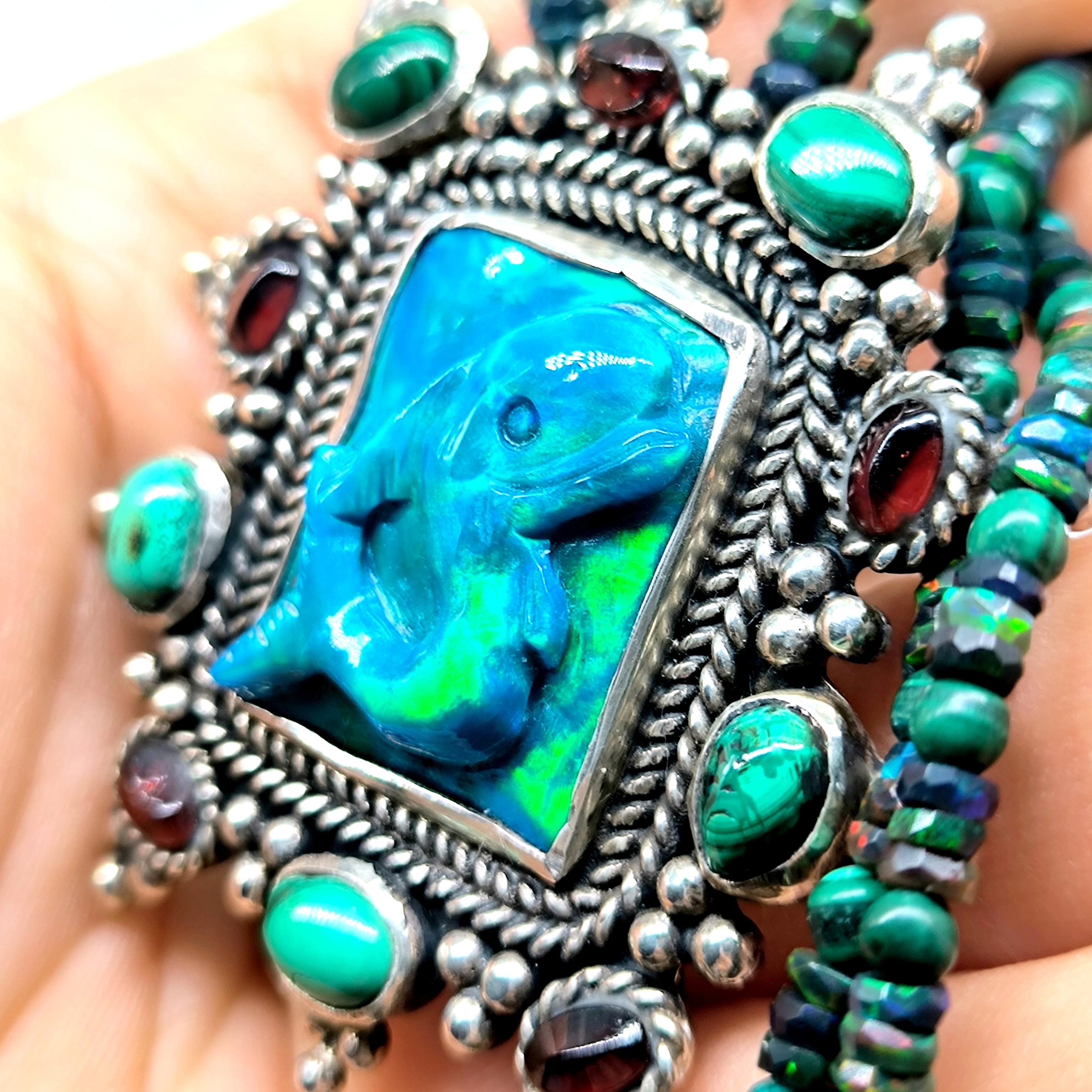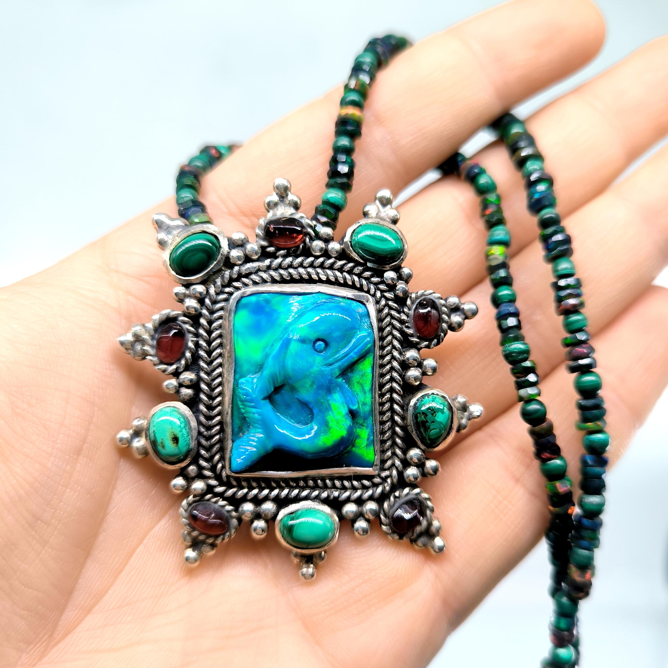 Bu tasarımda denizin enerjisini ve antik mücevher estetiğini bir araya getirdim. Zincir bölümünde yer alan natürel siyah opal taşlar, aralarındaki malahitlerle birlikte derin ve güçlü bir renk ritmi oluşturuyor. Merkezdeki sentetik opal taş üzerine kabartılmış yunus figürü, ışıkla birlikte adeta okyanusun içinde hareket ediyormuş hissi verir. Çevresini saran garnet ve malahit taşlar tasarıma zengin bir antik karakter kazandırırken, kompozisyonu güçlü bir çerçeveyle tamamlıyor. Medusa imzalı özel gümüş klips ile bitirdiğim bu parça, hem koleksiyon değeri taşıyan hem de boyunda dikkat çekici bir sanat eseri gibi duran özgün bir tasarımdır.