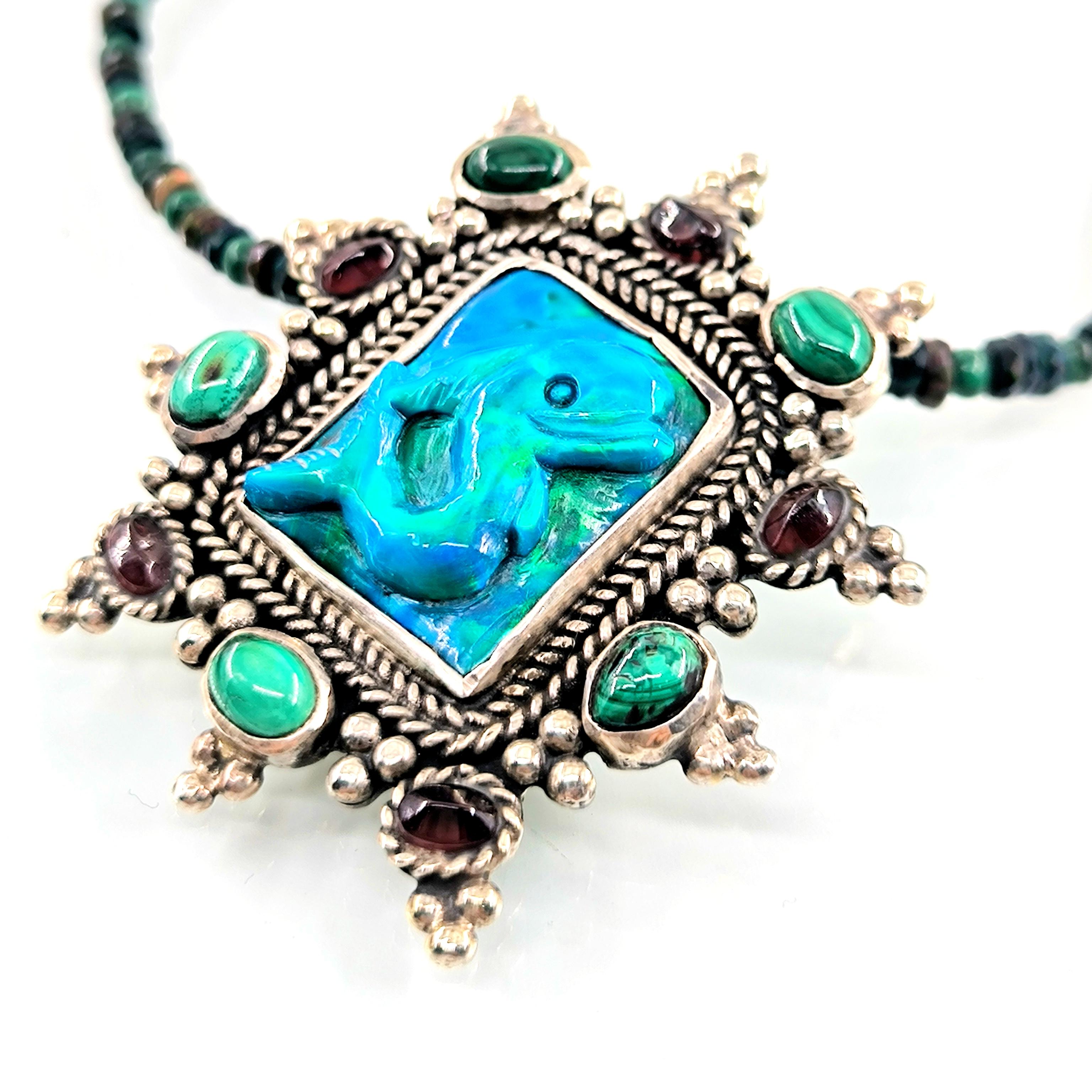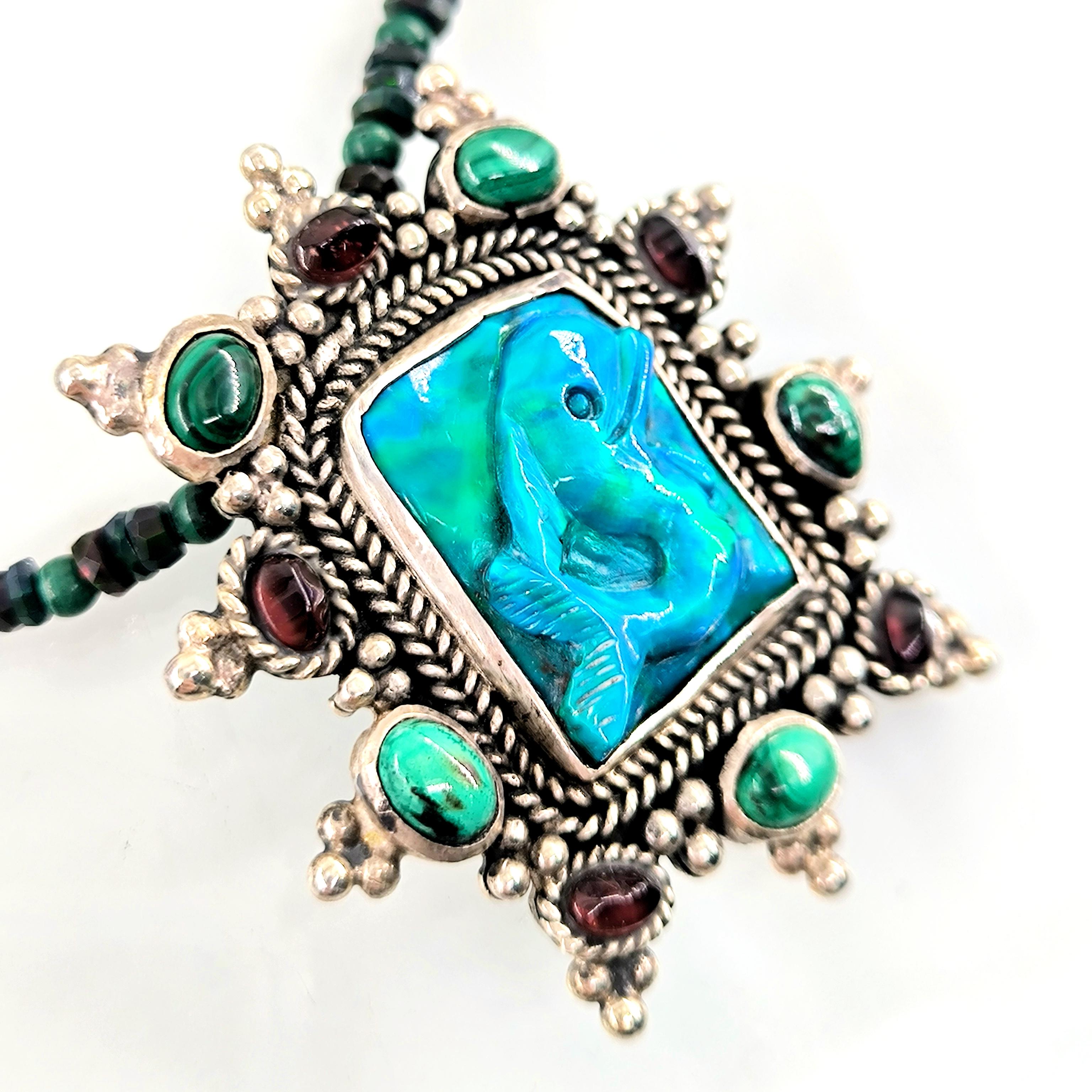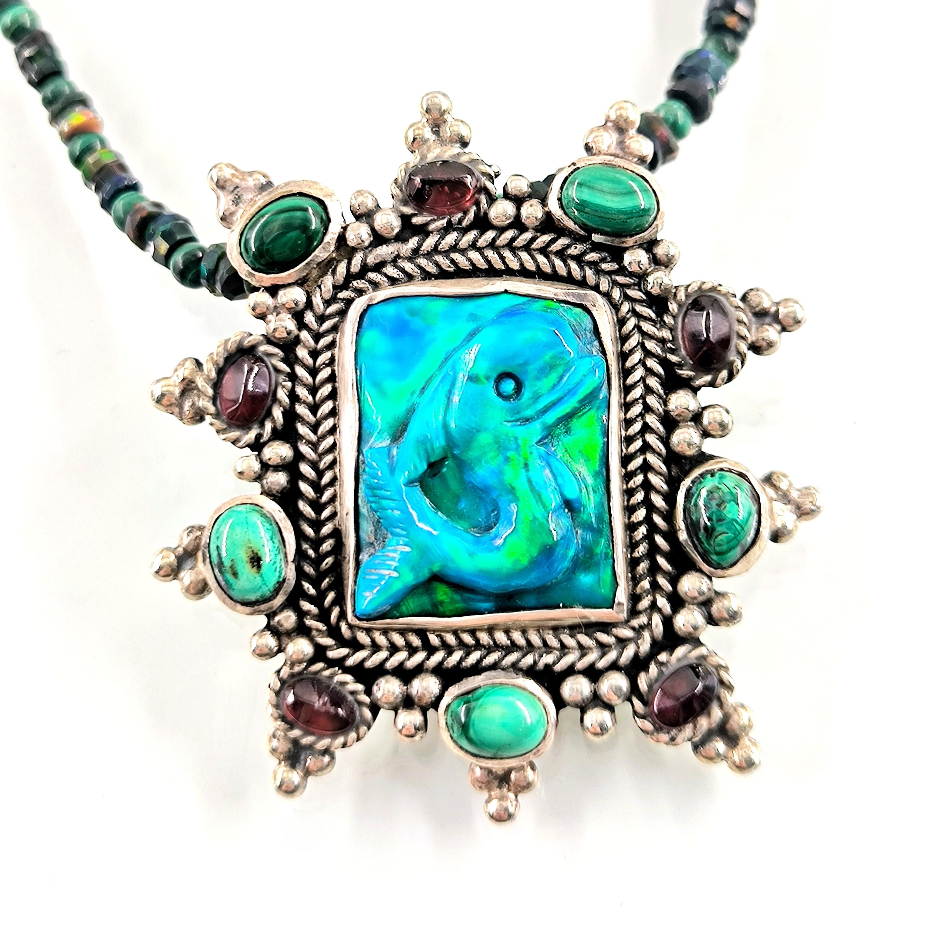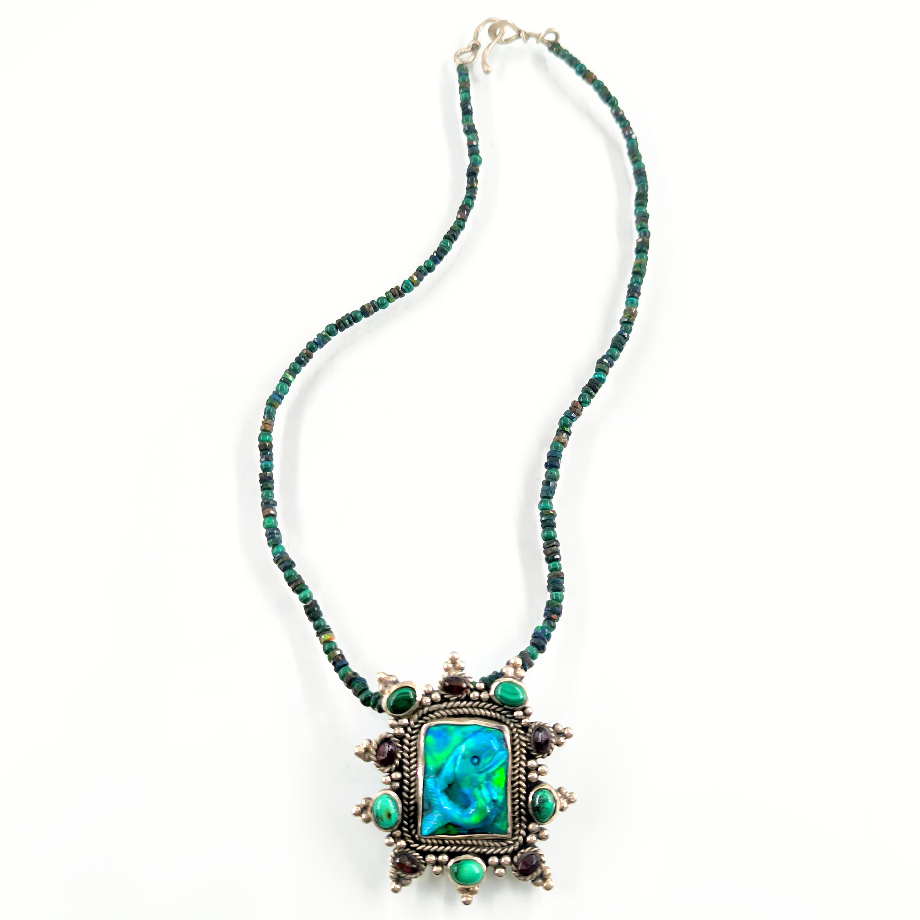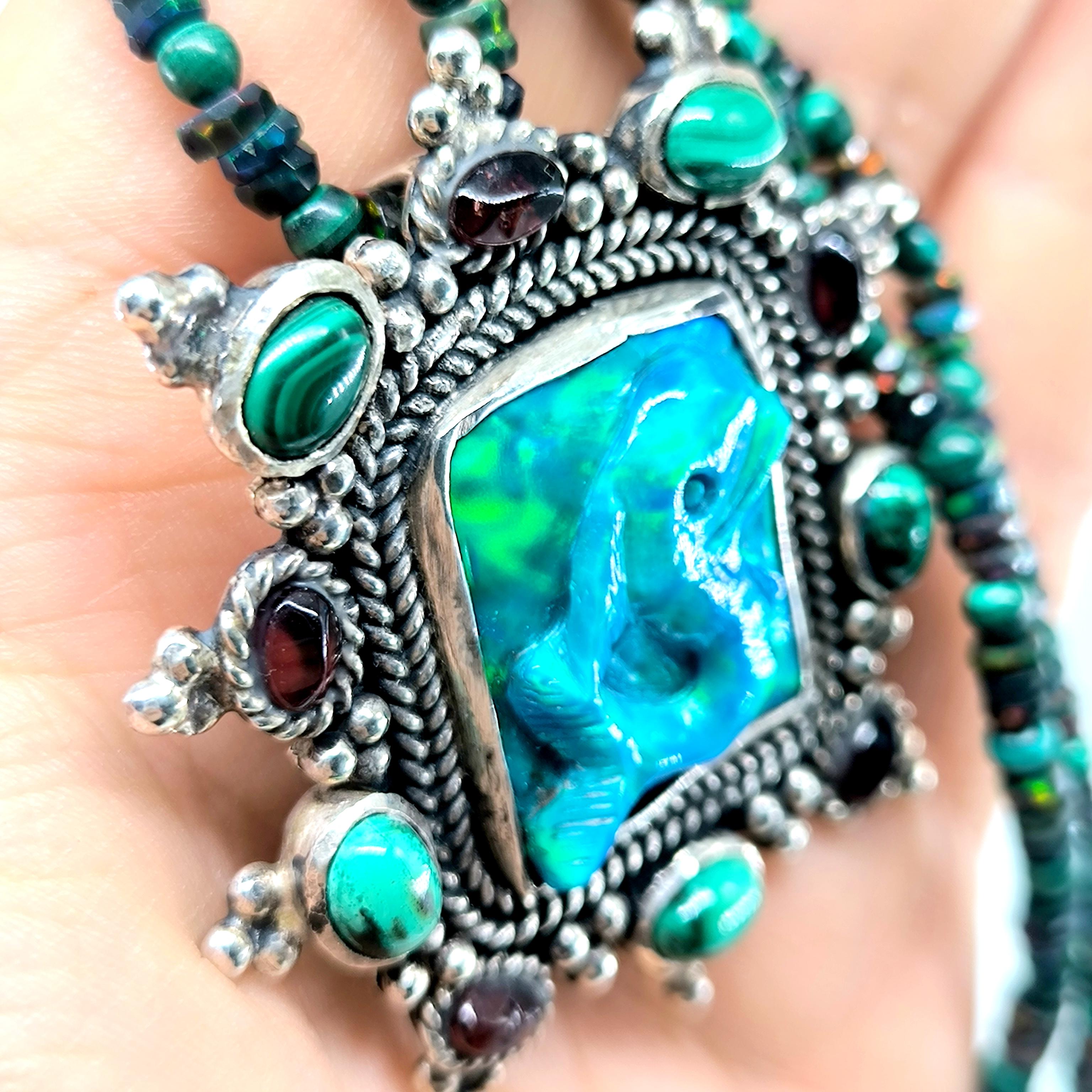 Bu tasarımda denizin enerjisini ve antik mücevher estetiğini bir araya getirdim. Zincir bölümünde yer alan natürel siyah opal taşlar, aralarındaki malahitlerle birlikte derin ve güçlü bir renk ritmi oluşturuyor. Merkezdeki sentetik opal taş üzerine kabartılmış yunus figürü, ışıkla birlikte adeta okyanusun içinde hareket ediyormuş hissi verir. Çevresini saran garnet ve malahit taşlar tasarıma zengin bir antik karakter kazandırırken, kompozisyonu güçlü bir çerçeveyle tamamlıyor. Medusa imzalı özel gümüş klips ile bitirdiğim bu parça, hem koleksiyon değeri taşıyan hem de boyunda dikkat çekici bir sanat eseri gibi duran özgün bir tasarımdır.