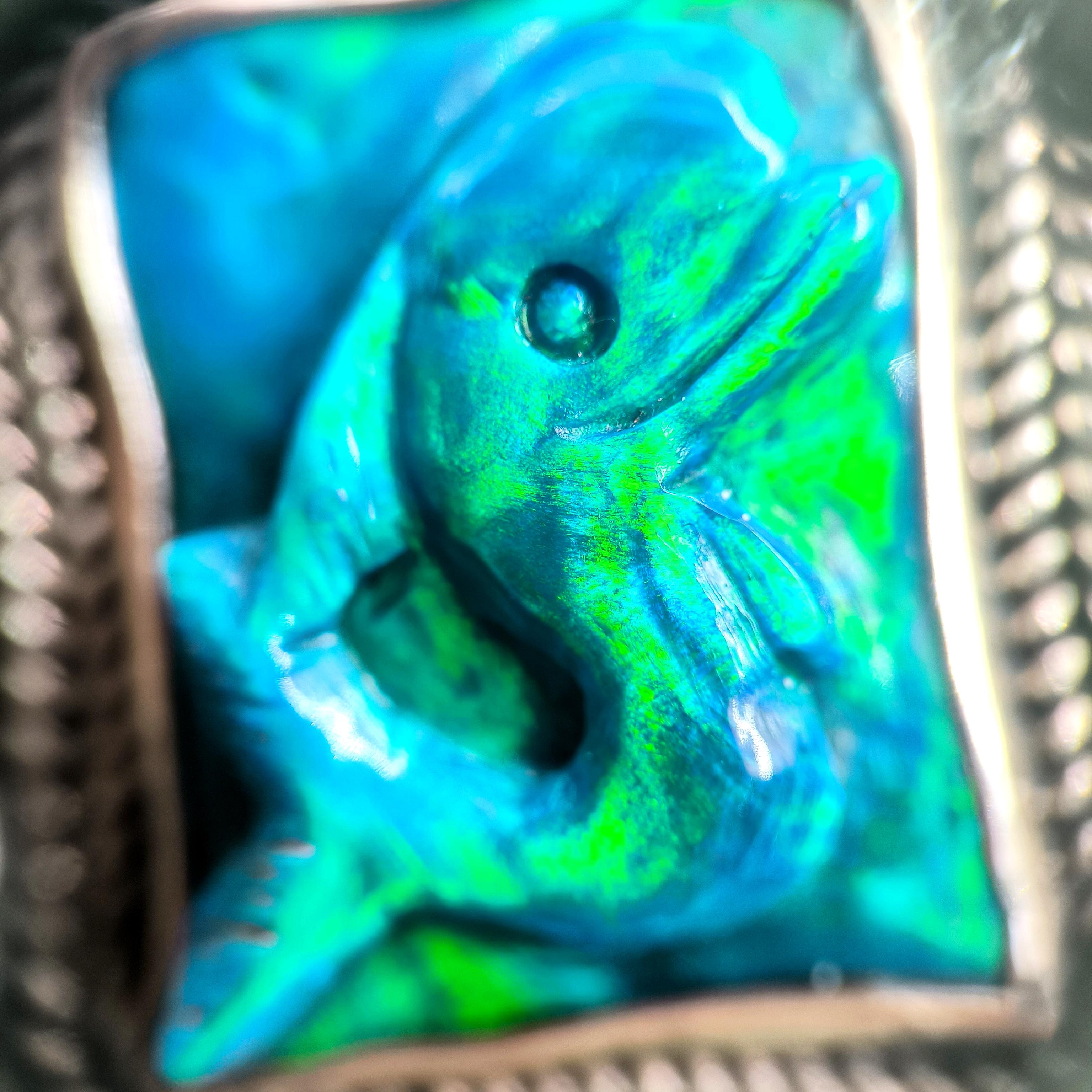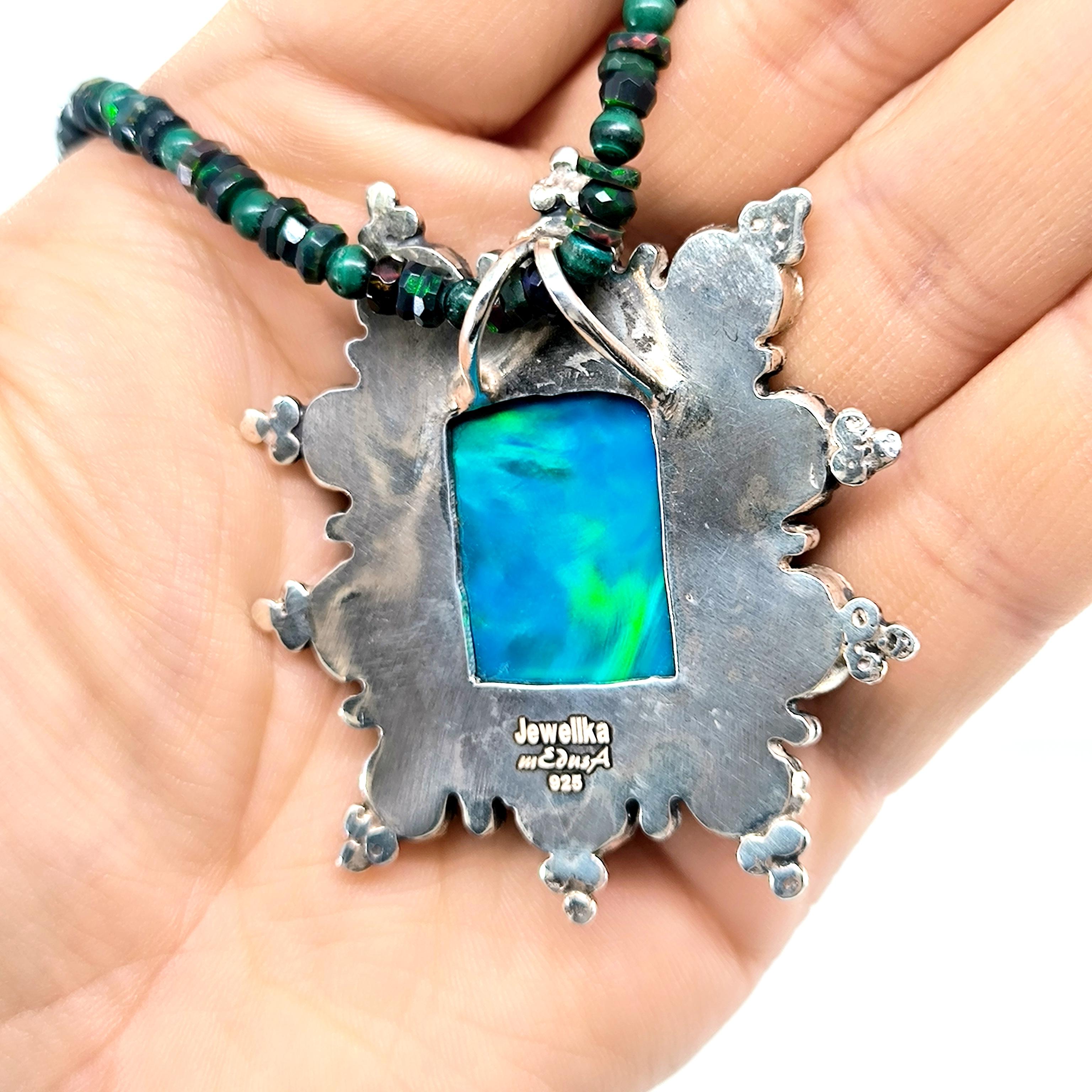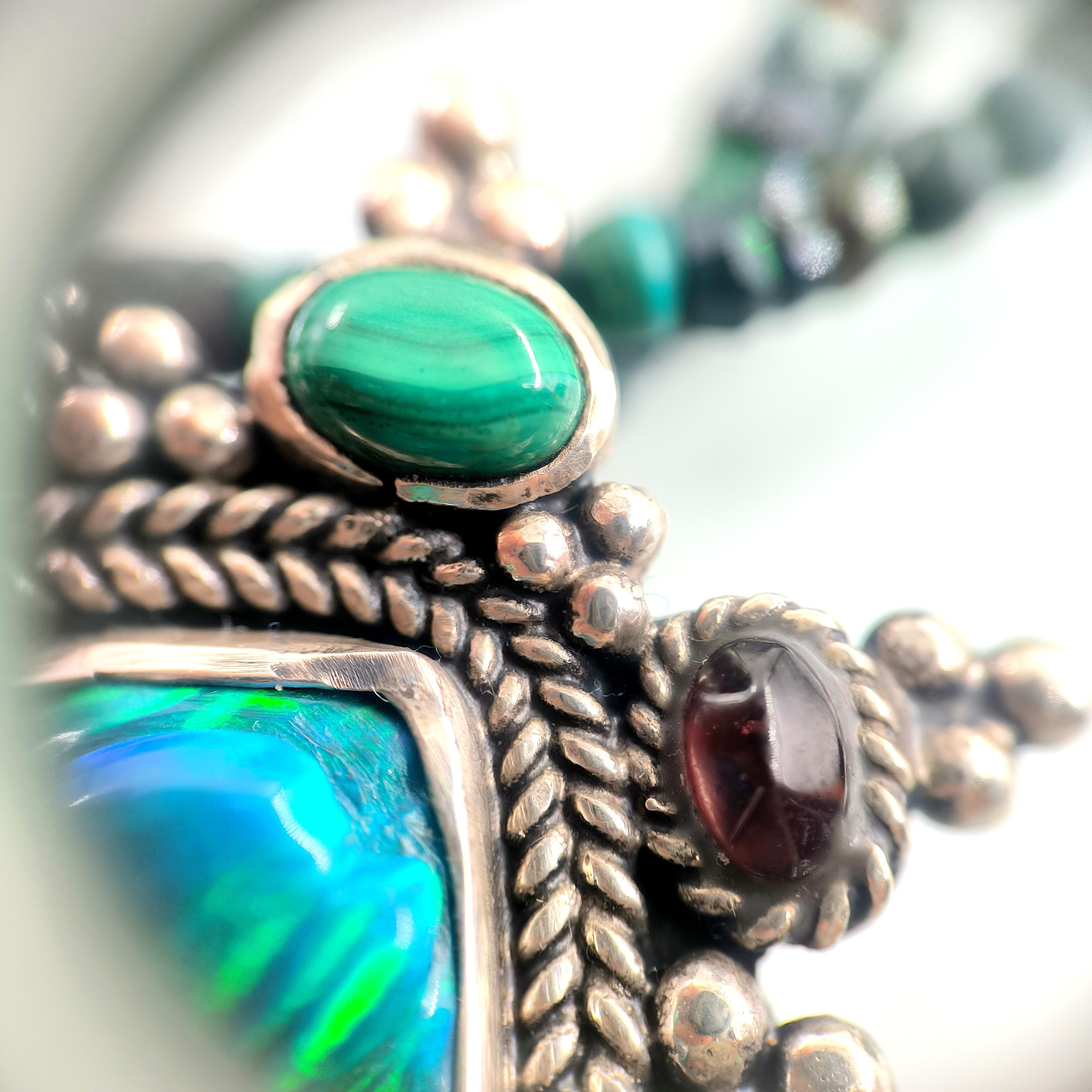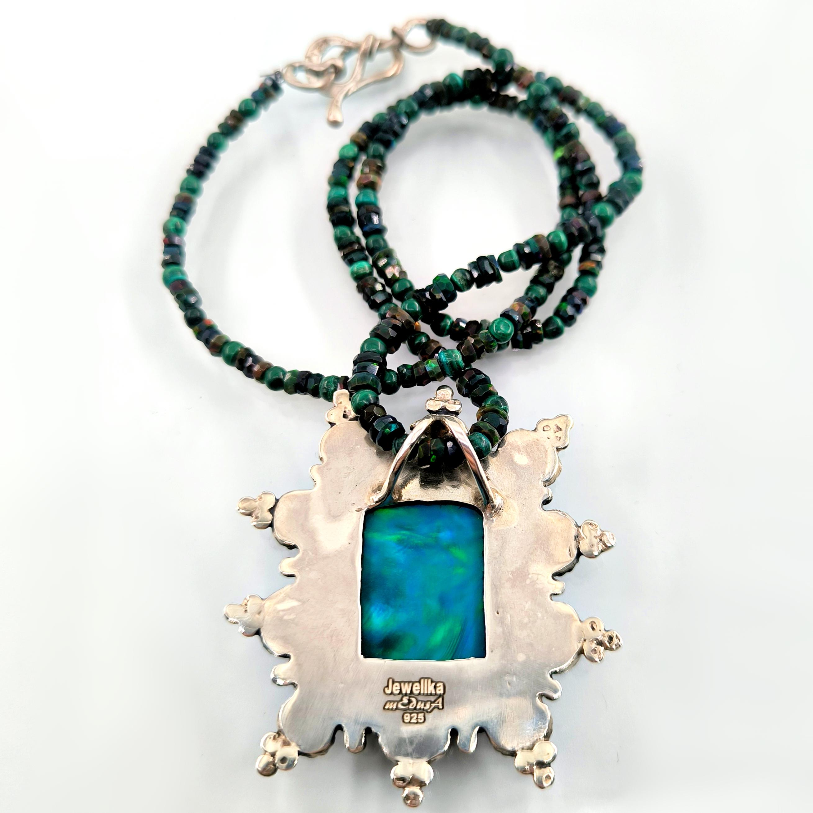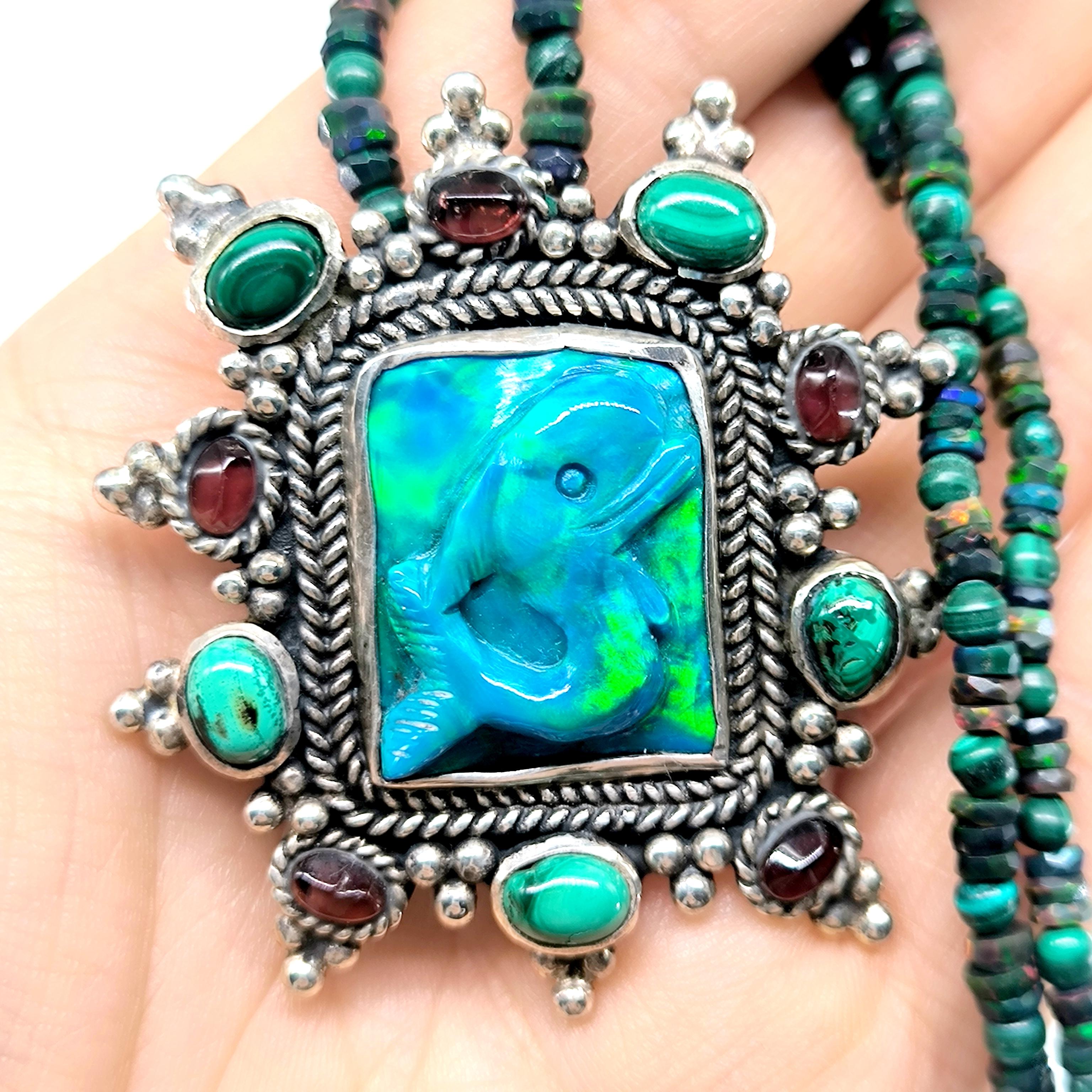 Bu tasarımda denizin enerjisini ve antik mücevher estetiğini bir araya getirdim. Zincir bölümünde yer alan natürel siyah opal taşlar, aralarındaki malahitlerle birlikte derin ve güçlü bir renk ritmi oluşturuyor. Merkezdeki sentetik opal taş üzerine kabartılmış yunus figürü, ışıkla birlikte adeta okyanusun içinde hareket ediyormuş hissi verir. Çevresini saran garnet ve malahit taşlar tasarıma zengin bir antik karakter kazandırırken, kompozisyonu güçlü bir çerçeveyle tamamlıyor. Medusa imzalı özel gümüş klips ile bitirdiğim bu parça, hem koleksiyon değeri taşıyan hem de boyunda dikkat çekici bir sanat eseri gibi duran özgün bir tasarımdır.