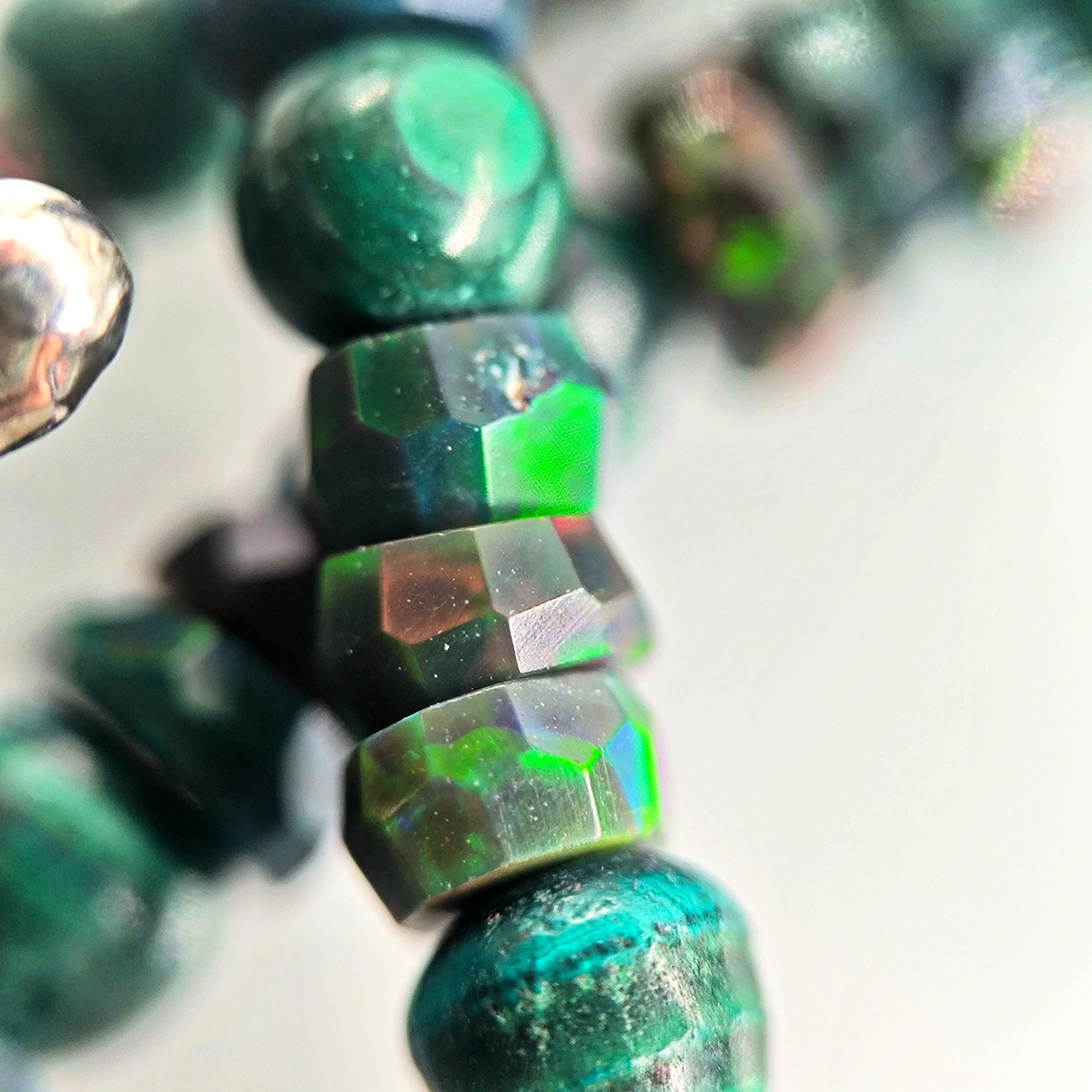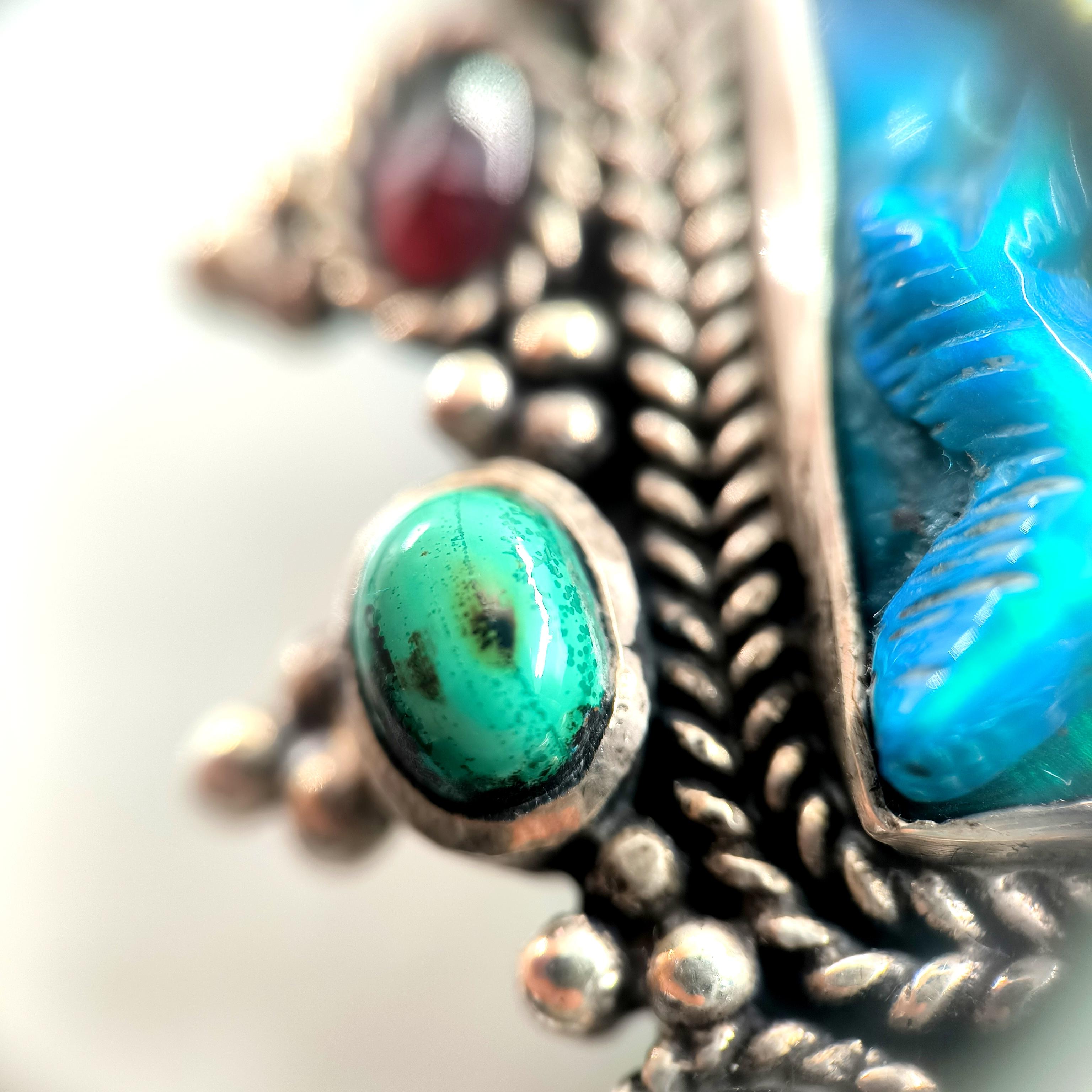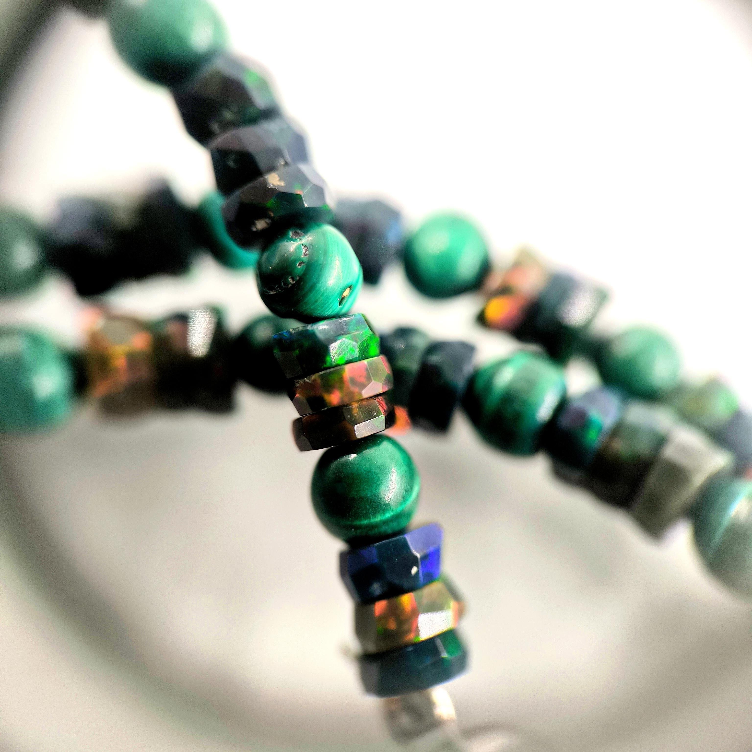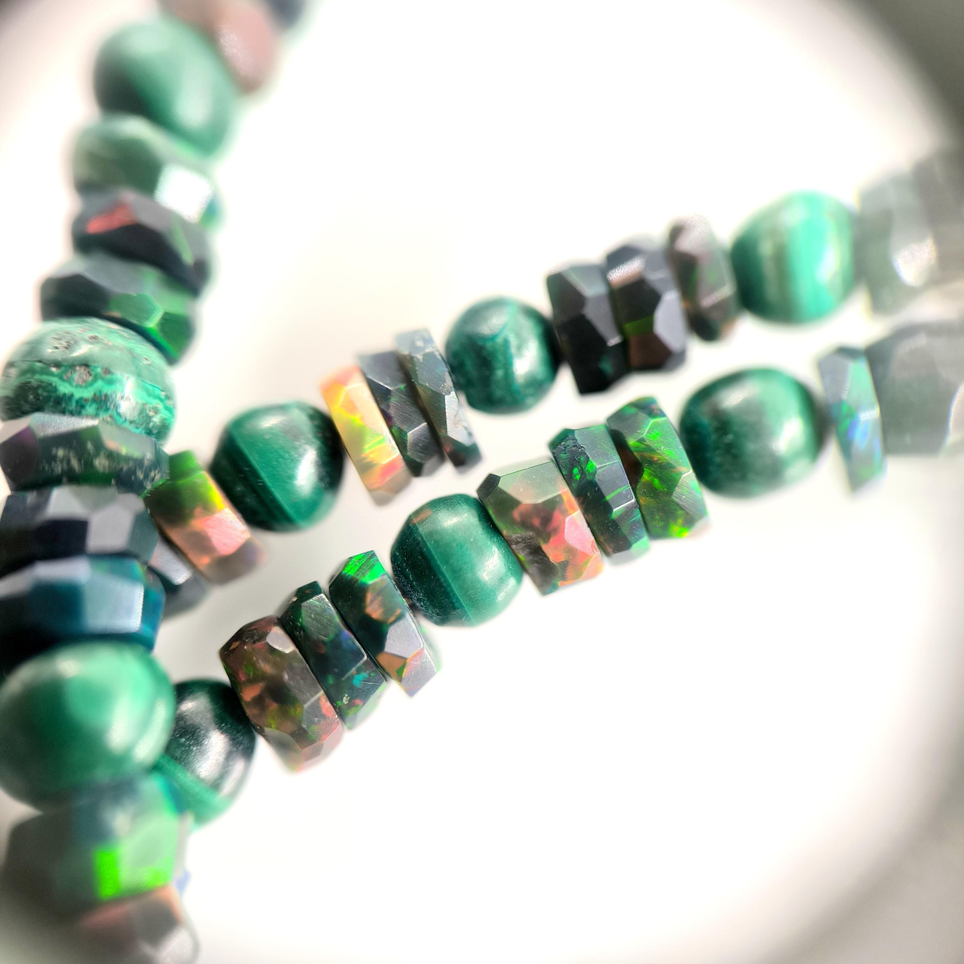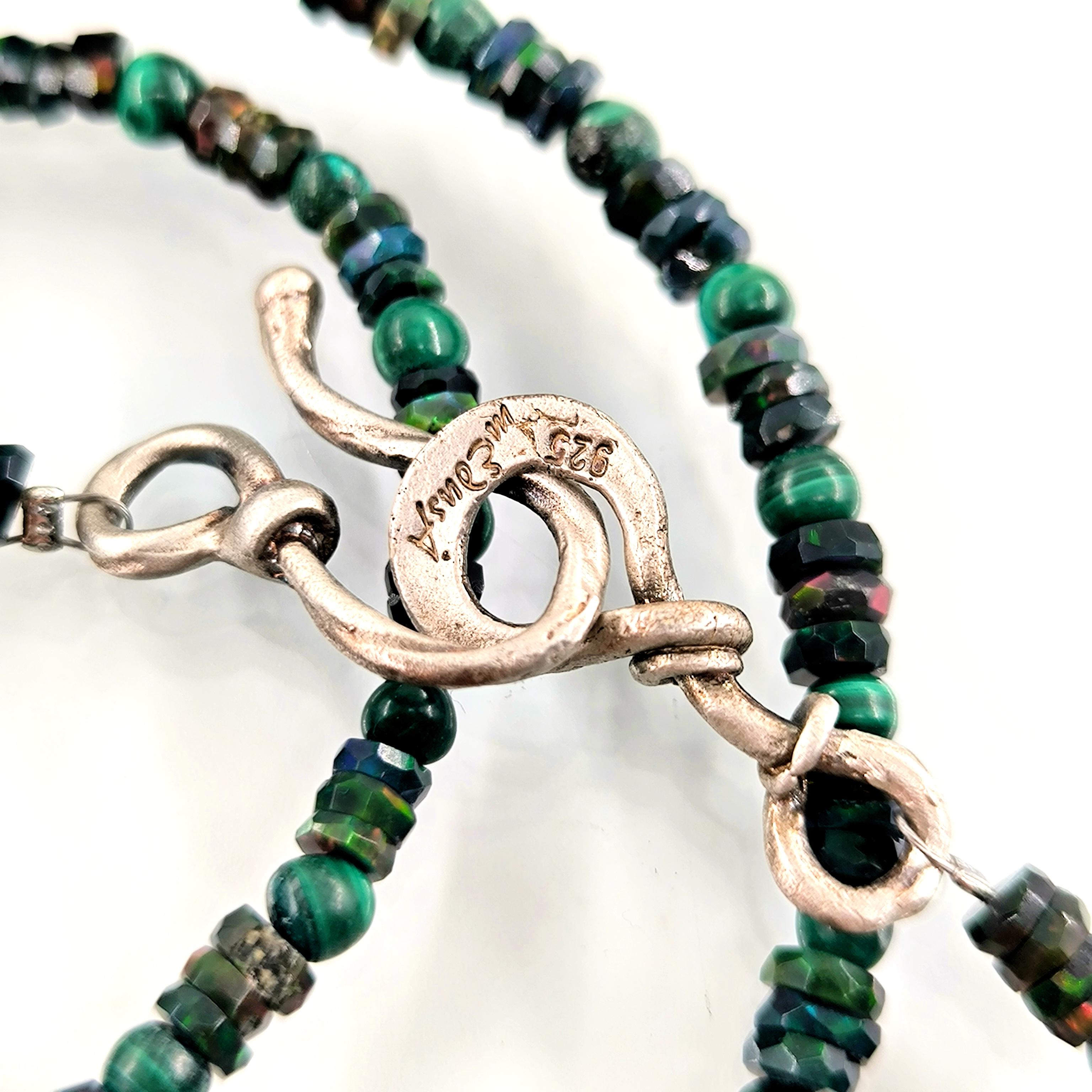 Bu tasarımda denizin enerjisini ve antik mücevher estetiğini bir araya getirdim. Zincir bölümünde yer alan natürel siyah opal taşlar, aralarındaki malahitlerle birlikte derin ve güçlü bir renk ritmi oluşturuyor. Merkezdeki sentetik opal taş üzerine kabartılmış yunus figürü, ışıkla birlikte adeta okyanusun içinde hareket ediyormuş hissi verir. Çevresini saran garnet ve malahit taşlar tasarıma zengin bir antik karakter kazandırırken, kompozisyonu güçlü bir çerçeveyle tamamlıyor. Medusa imzalı özel gümüş klips ile bitirdiğim bu parça, hem koleksiyon değeri taşıyan hem de boyunda dikkat çekici bir sanat eseri gibi duran özgün bir tasarımdır.