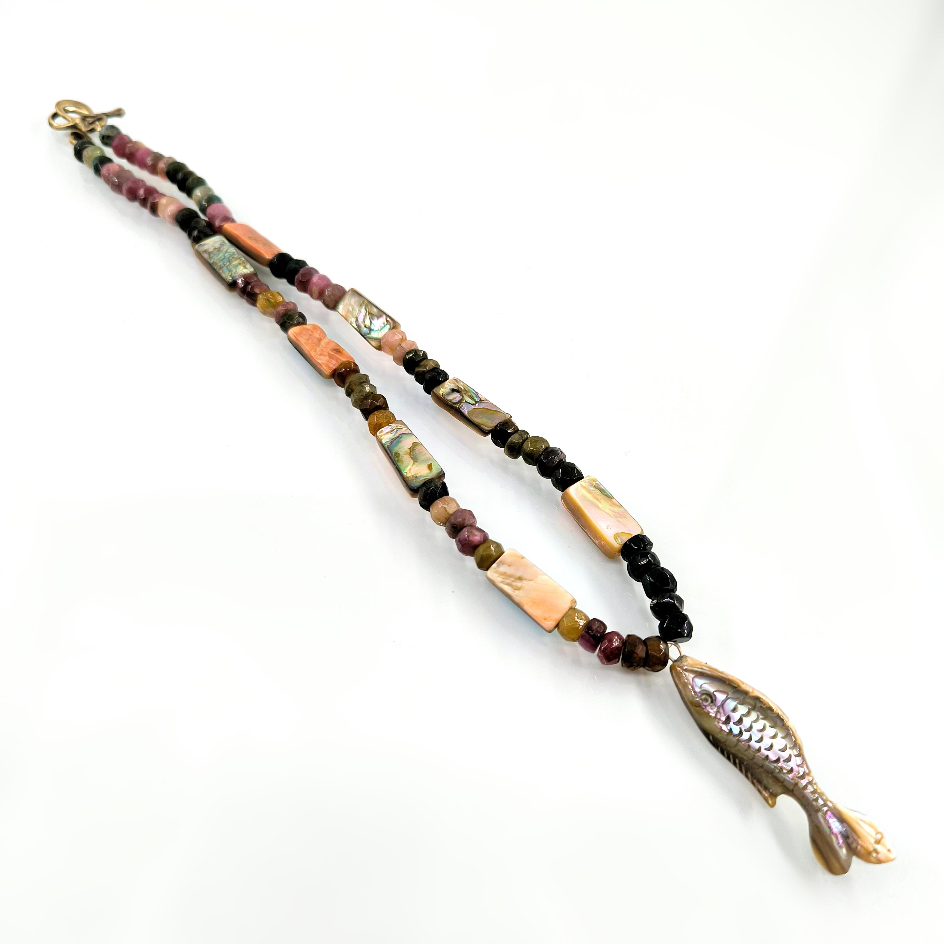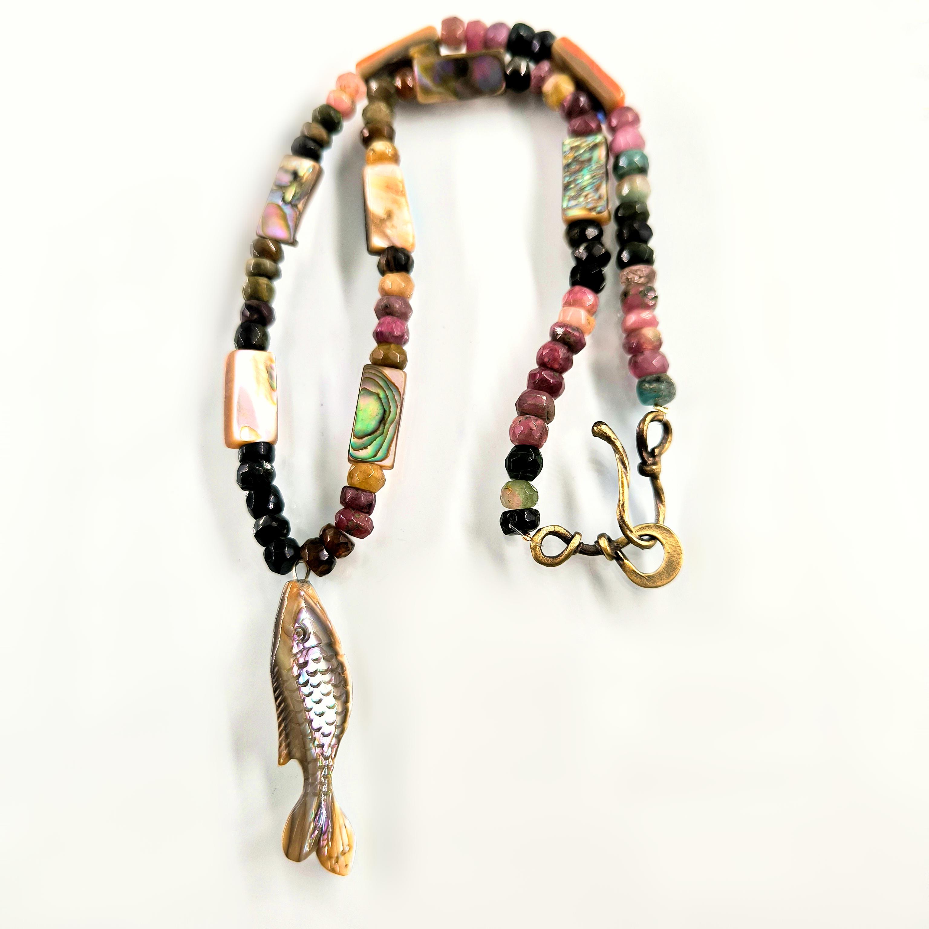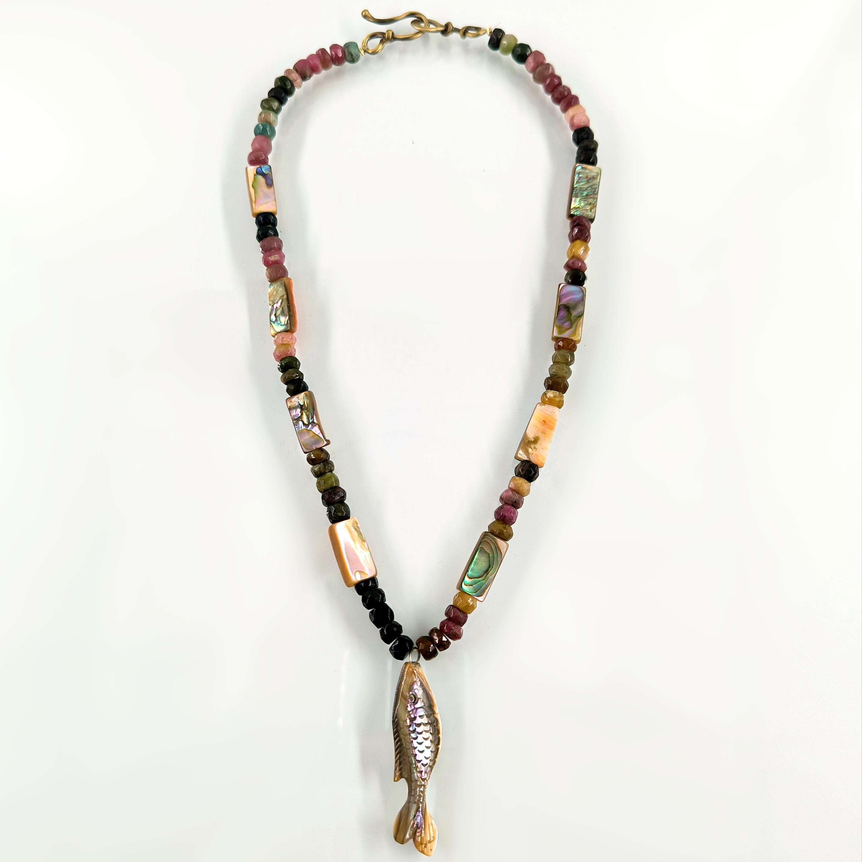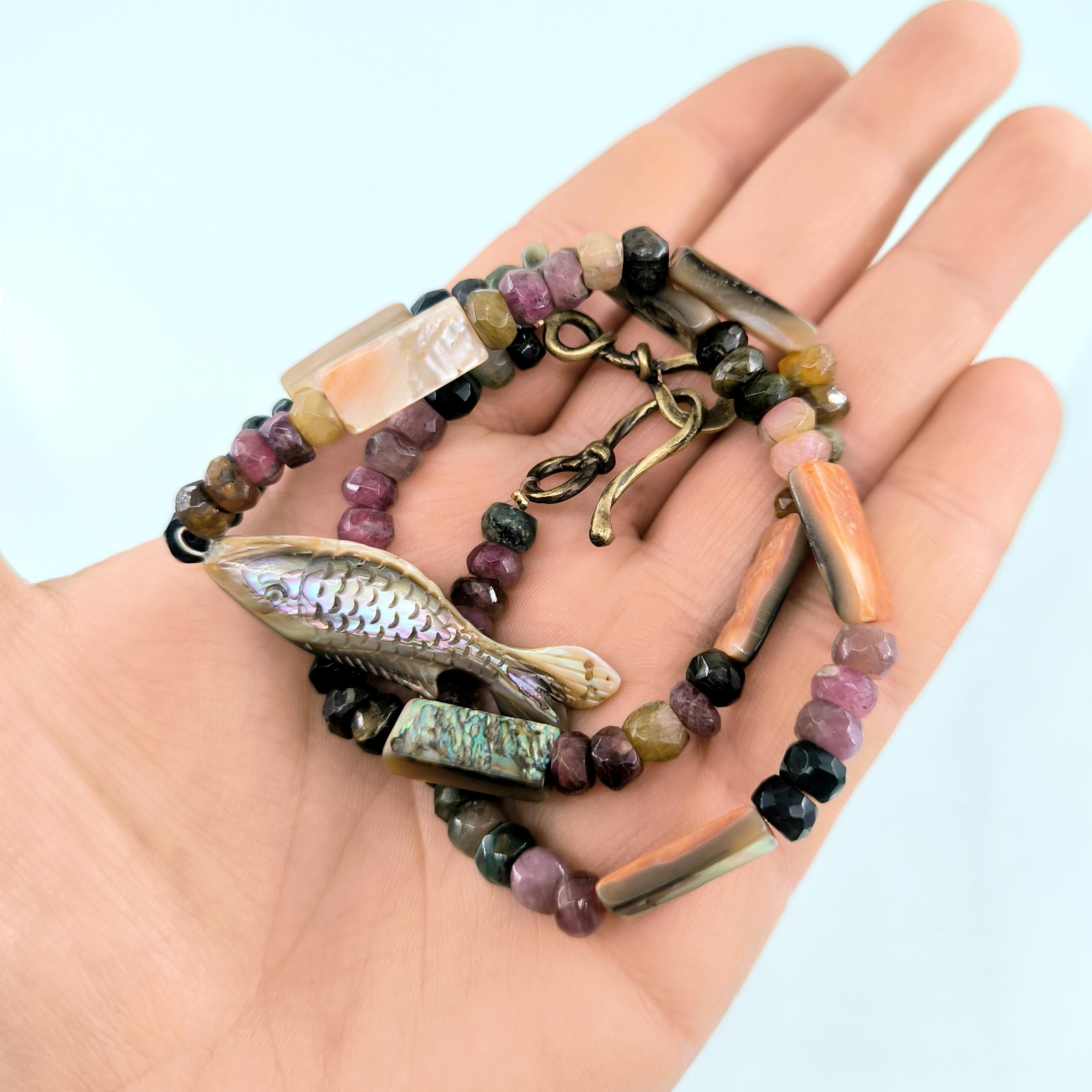 Bu tasarımda doğanın renklerini ve denizin ışığını bir araya getirdim. Zincir bölümünde yer alan fasetli turmalin taşlar, aralarındaki abalone sedef parçalarıyla birlikte canlı ve hareketli bir renk armonisi oluşturuyor. Merkezde ise tek parça abalone sedefinden oyulmuş balık figürü bulunuyor; ışıkla birlikte değişen iridesan tonları kolyeye adeta yaşayan bir karakter kazandırıyor. Balık figürü antik kültürlerde bereket ve akışın sembolüdür, bu nedenle tasarımın ruhunu da taşıyor. Medusa imzalı özel bronz klips ile tamamlanan bu parça, hem sanatsal hem de koleksiyon değeri taşıyan özgün bir tasarım kolyedir.
