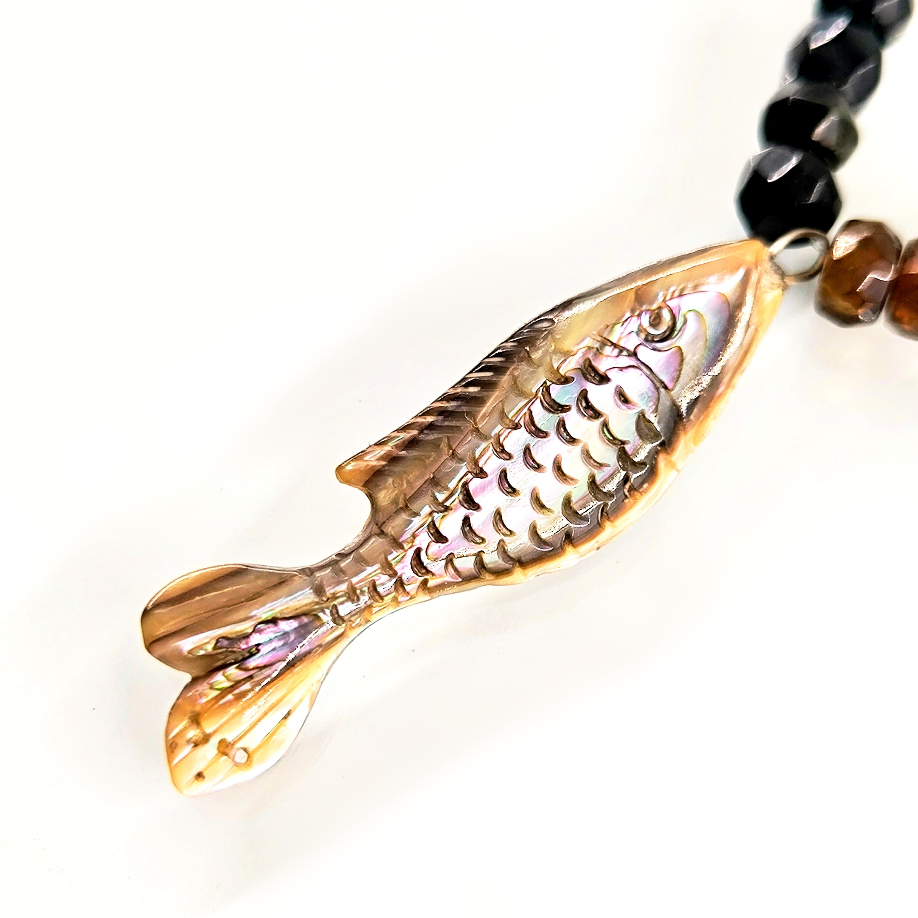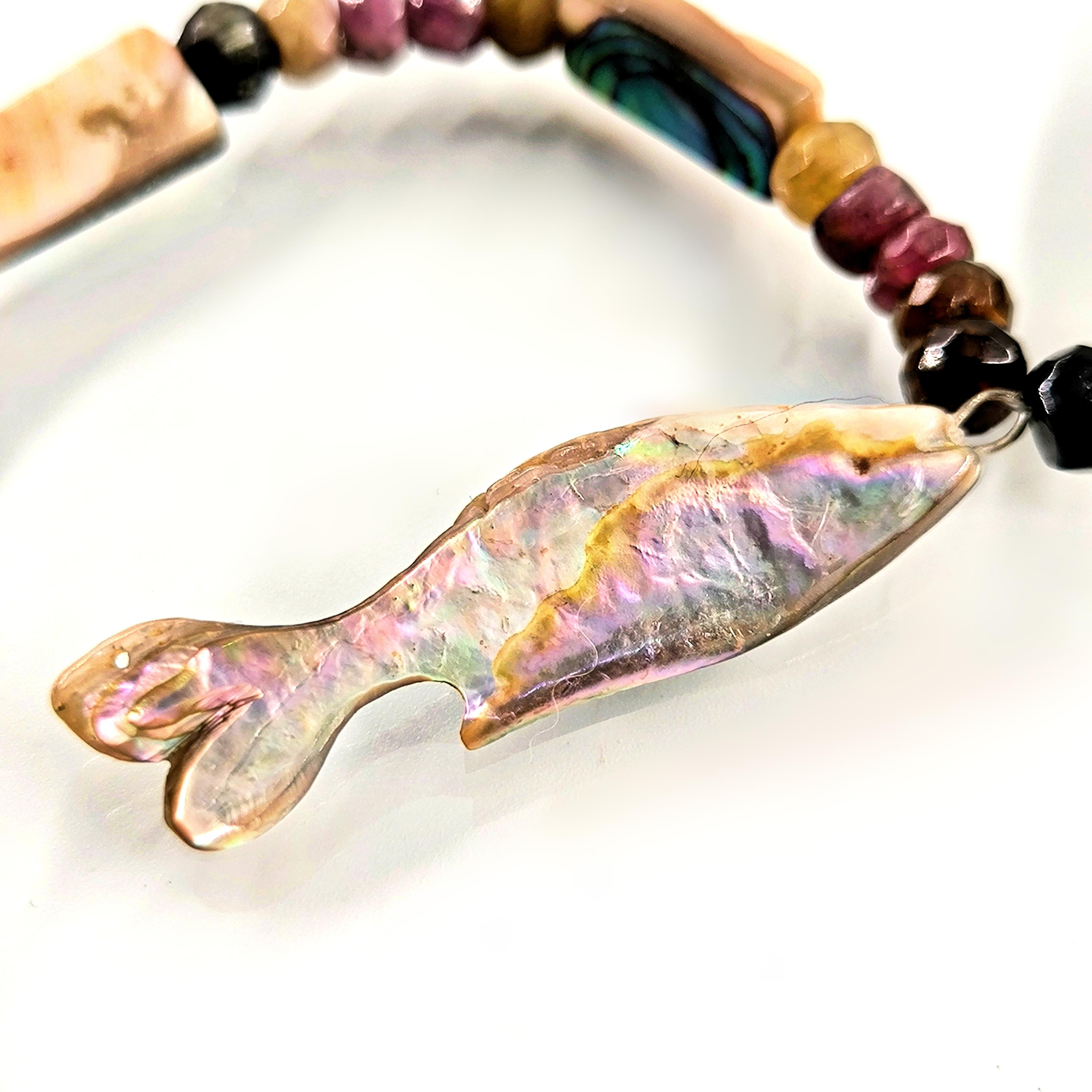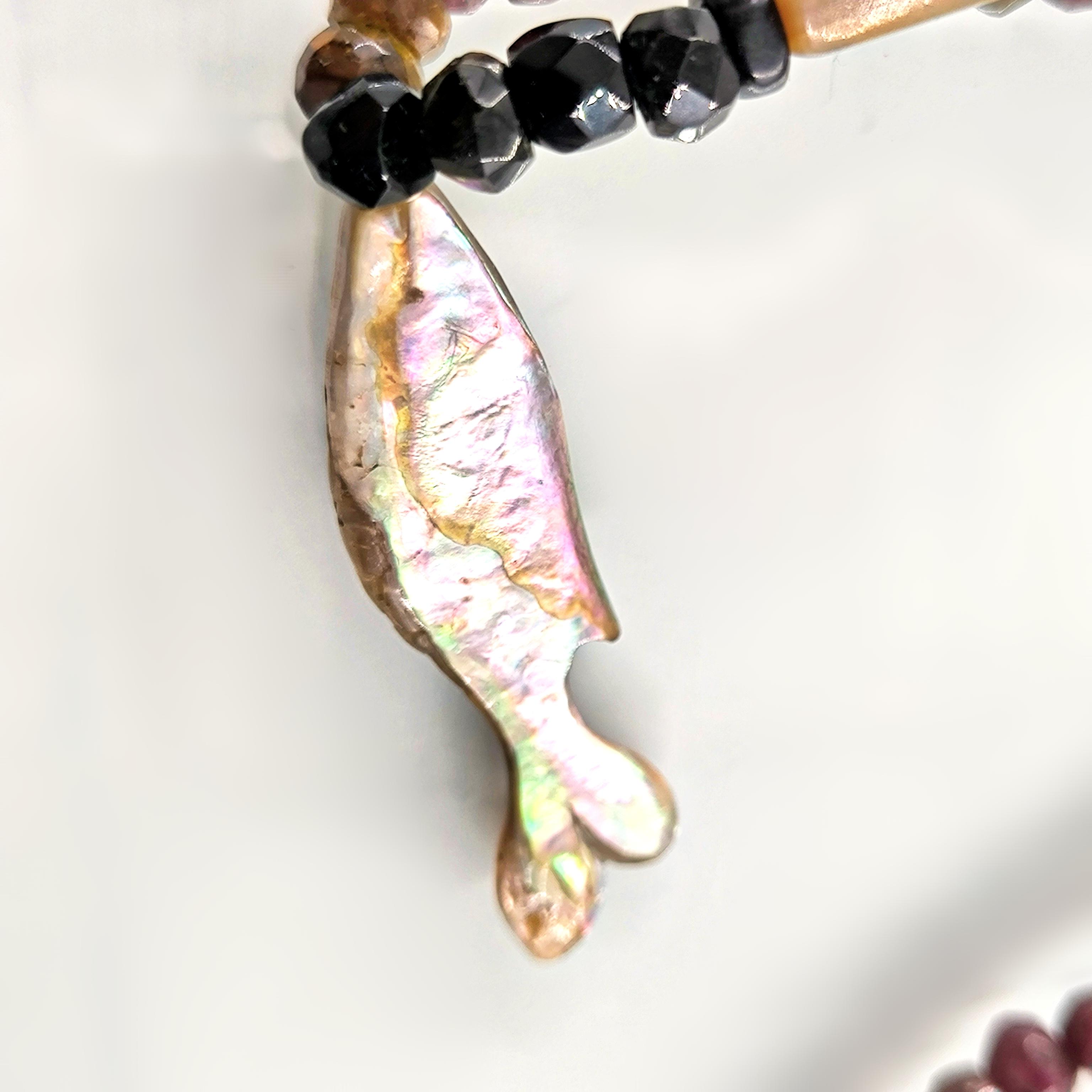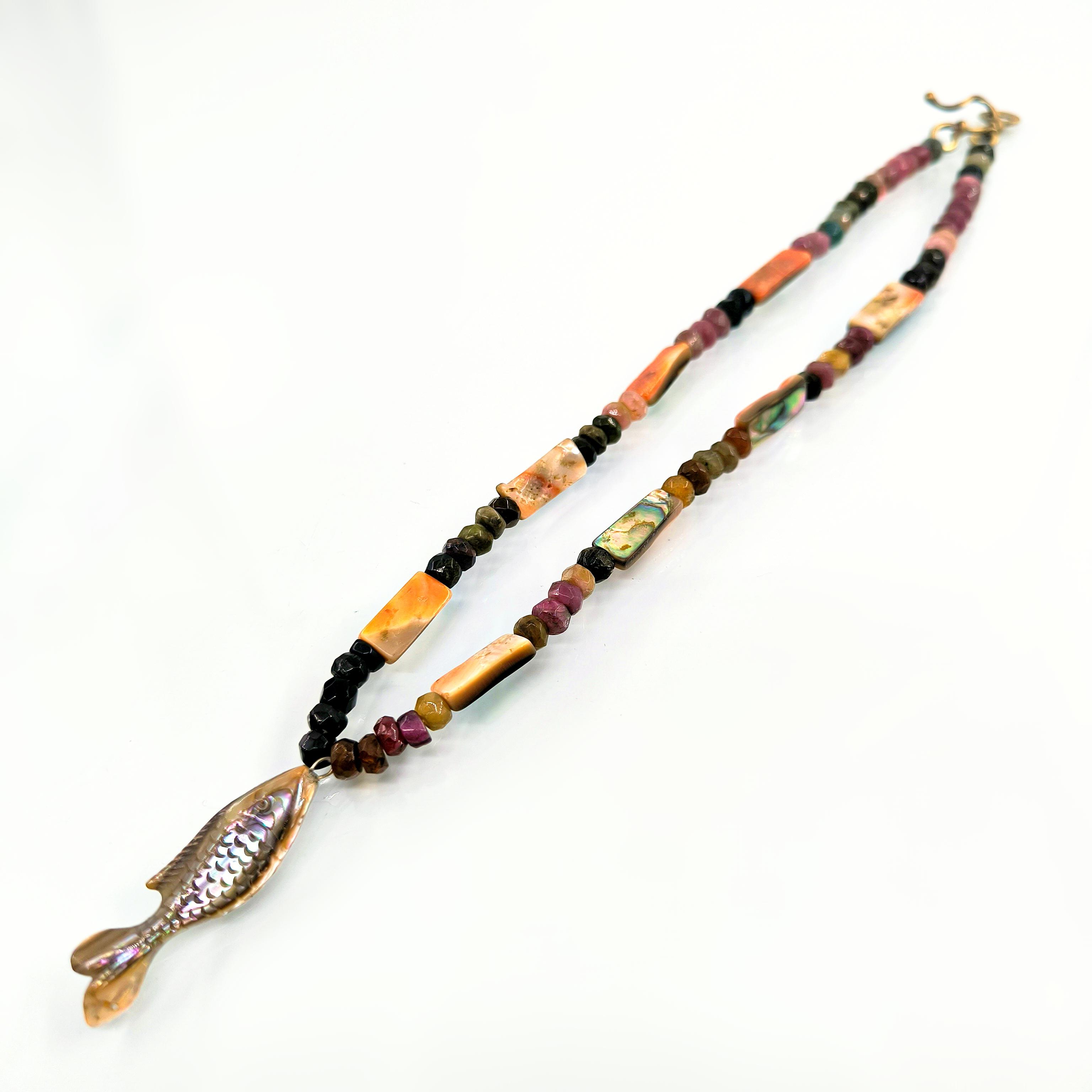 Bu tasarımda doğanın renklerini ve denizin ışığını bir araya getirdim. Zincir bölümünde yer alan fasetli turmalin taşlar, aralarındaki abalone sedef parçalarıyla birlikte canlı ve hareketli bir renk armonisi oluşturuyor. Merkezde ise tek parça abalone sedefinden oyulmuş balık figürü bulunuyor; ışıkla birlikte değişen iridesan tonları kolyeye adeta yaşayan bir karakter kazandırıyor. Balık figürü antik kültürlerde bereket ve akışın sembolüdür, bu nedenle tasarımın ruhunu da taşıyor. Medusa imzalı özel bronz klips ile tamamlanan bu parça, hem sanatsal hem de koleksiyon değeri taşıyan özgün bir tasarım kolyedir.