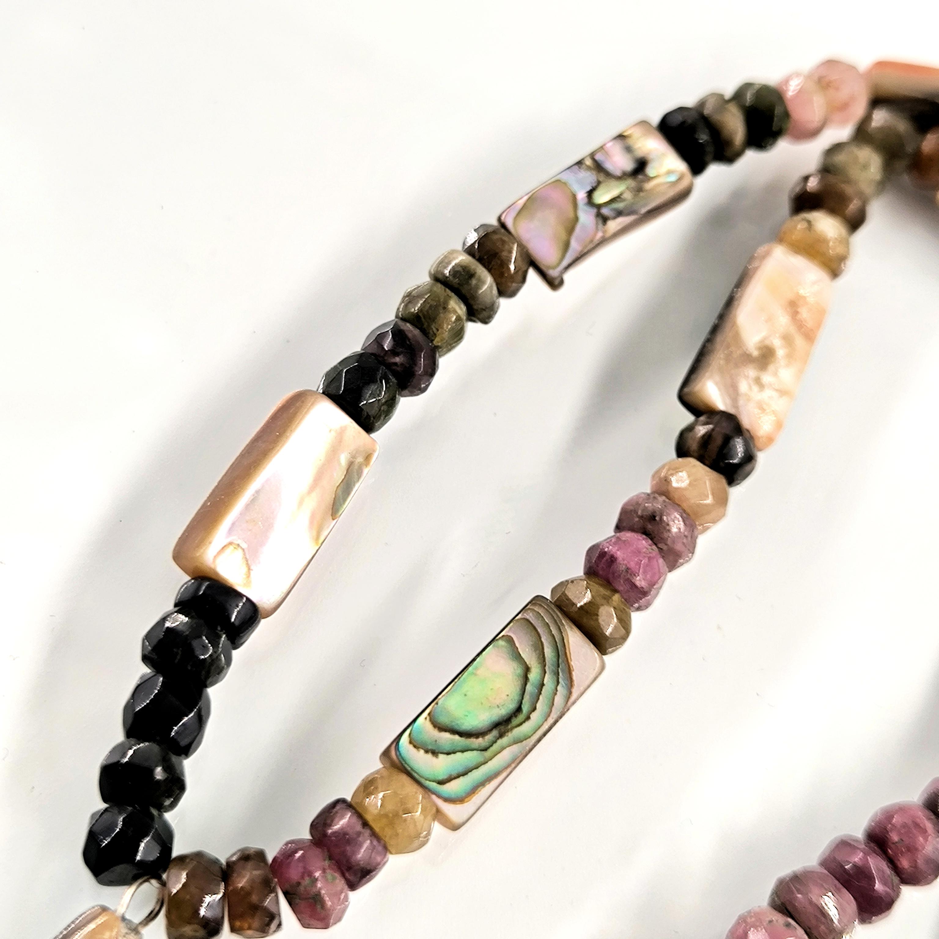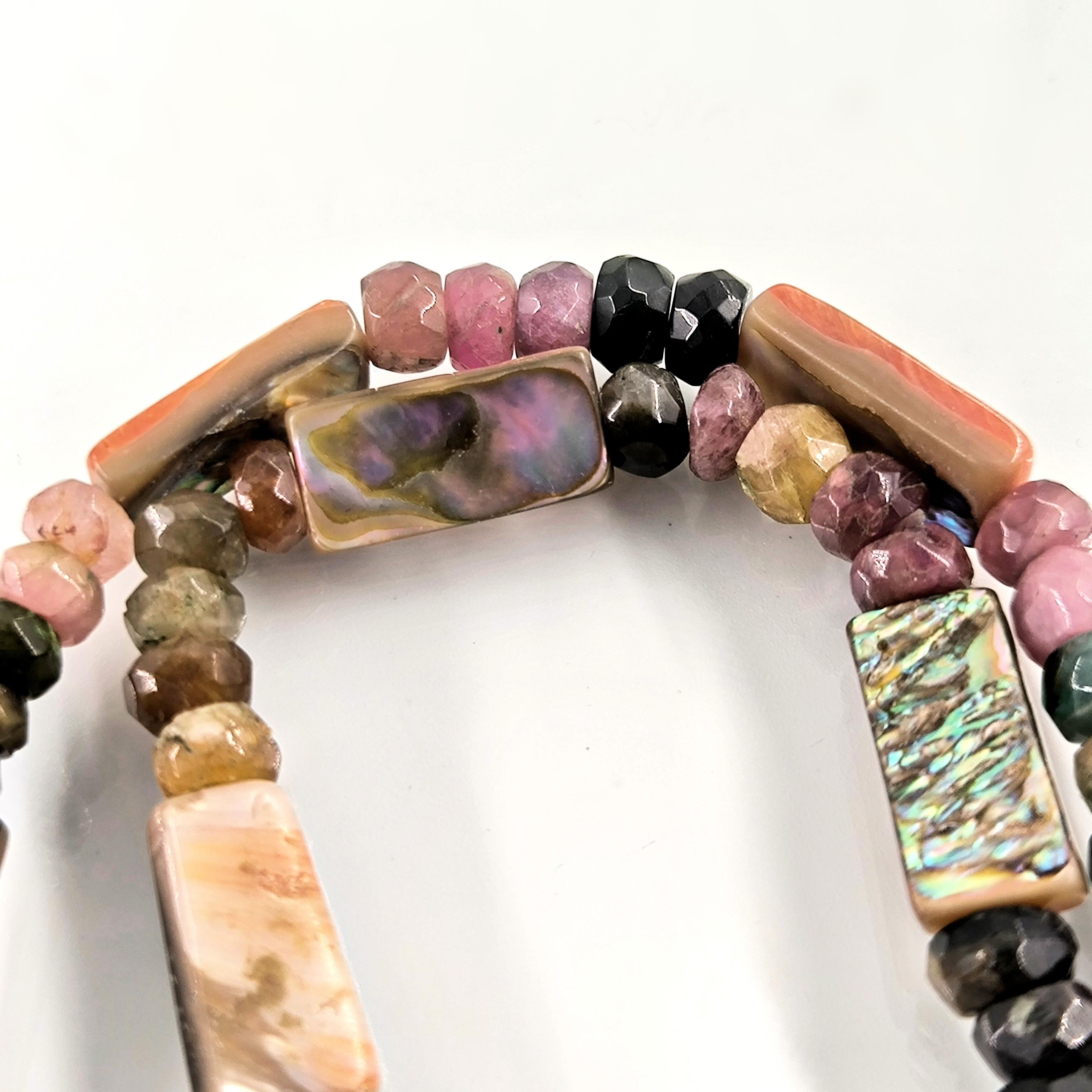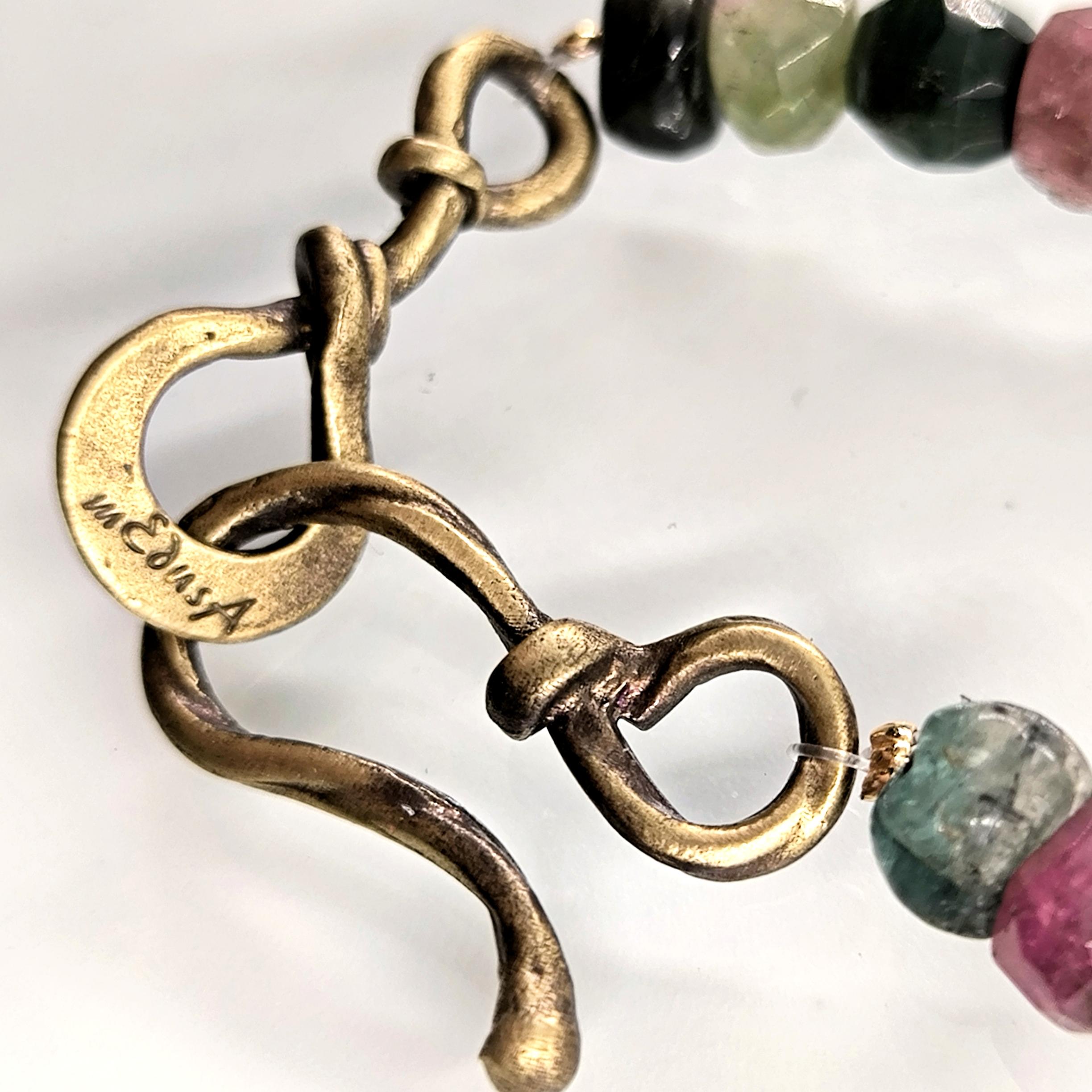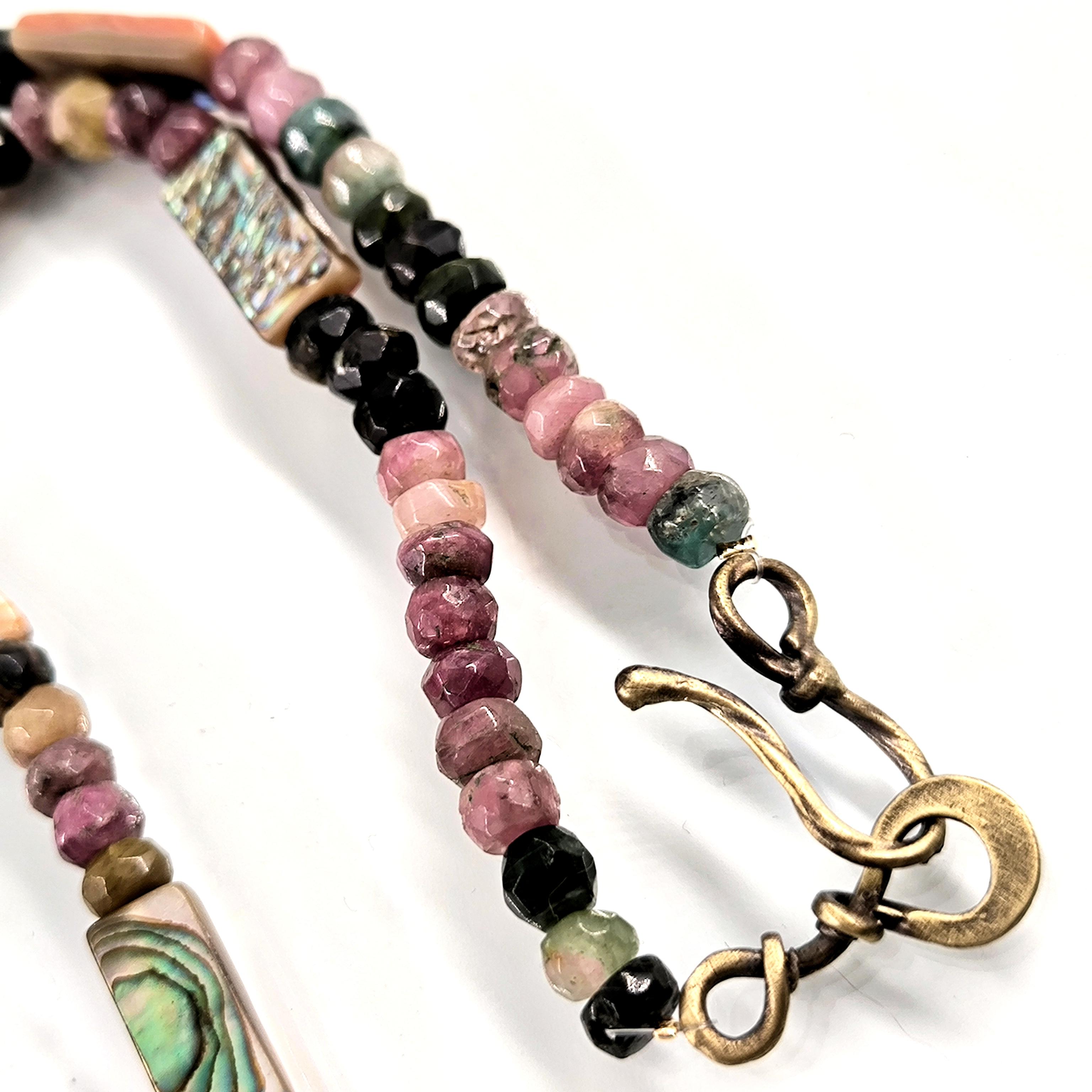 Bu tasarımda doğanın renklerini ve denizin ışığını bir araya getirdim. Zincir bölümünde yer alan fasetli turmalin taşlar, aralarındaki abalone sedef parçalarıyla birlikte canlı ve hareketli bir renk armonisi oluşturuyor. Merkezde ise tek parça abalone sedefinden oyulmuş balık figürü bulunuyor; ışıkla birlikte değişen iridesan tonları kolyeye adeta yaşayan bir karakter kazandırıyor. Balık figürü antik kültürlerde bereket ve akışın sembolüdür, bu nedenle tasarımın ruhunu da taşıyor. Medusa imzalı özel bronz klips ile tamamlanan bu parça, hem sanatsal hem de koleksiyon değeri taşıyan özgün bir tasarım kolyedir.