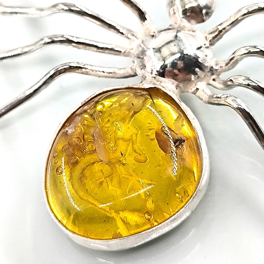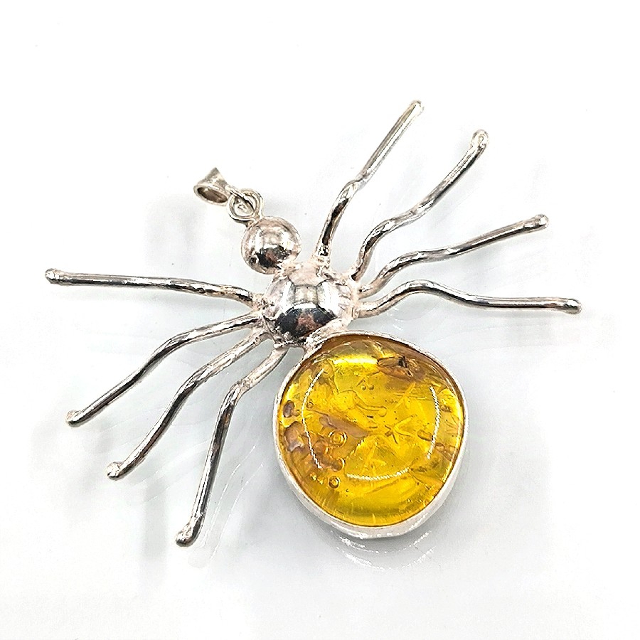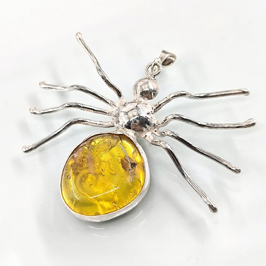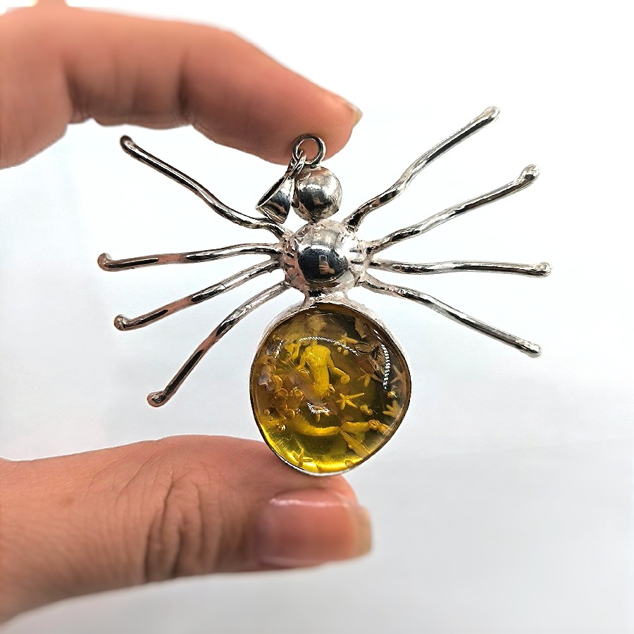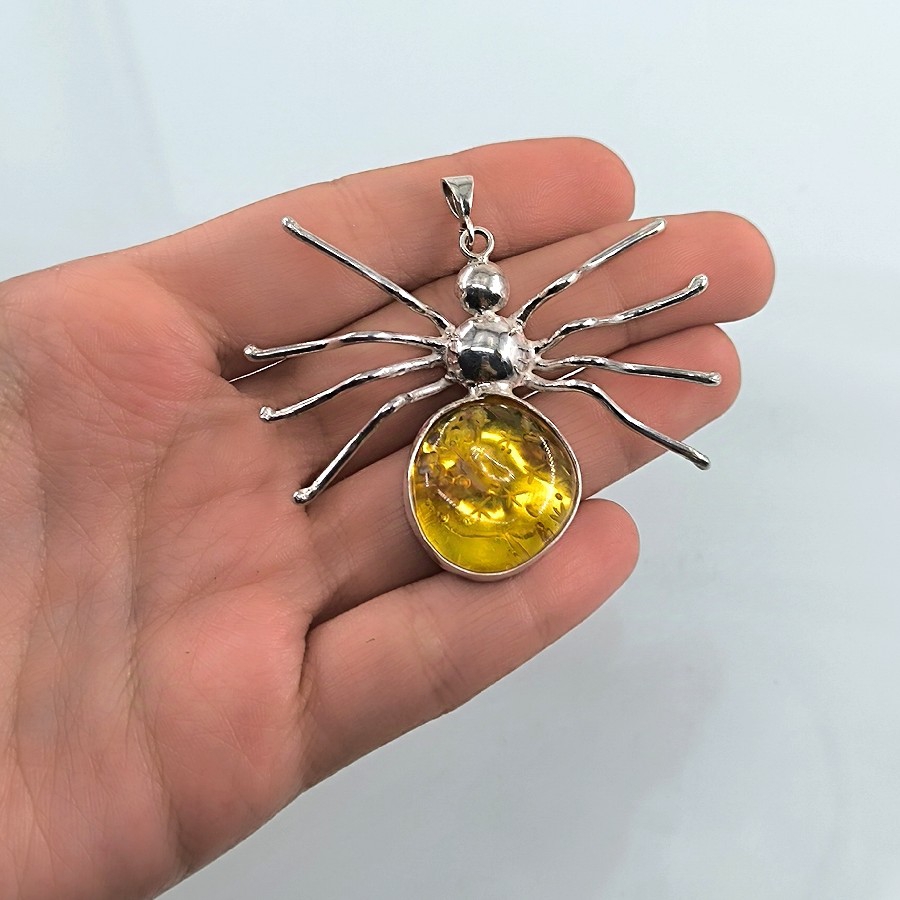 Kolyenin merkezinde yer alan etkileyici bir kehribar damla, eski zamanlardan günümüze tüm güzellik ve zarafetini korumaktadır. Doğanın bir armağanı olan kehribar, içinde sakladığı fosillerle de dikkatleri üzerine çeker. Özellikle de örümcek formunda olan bu fosil, kolyeye büyüleyici bir hava ve mistik bir enerji katar.