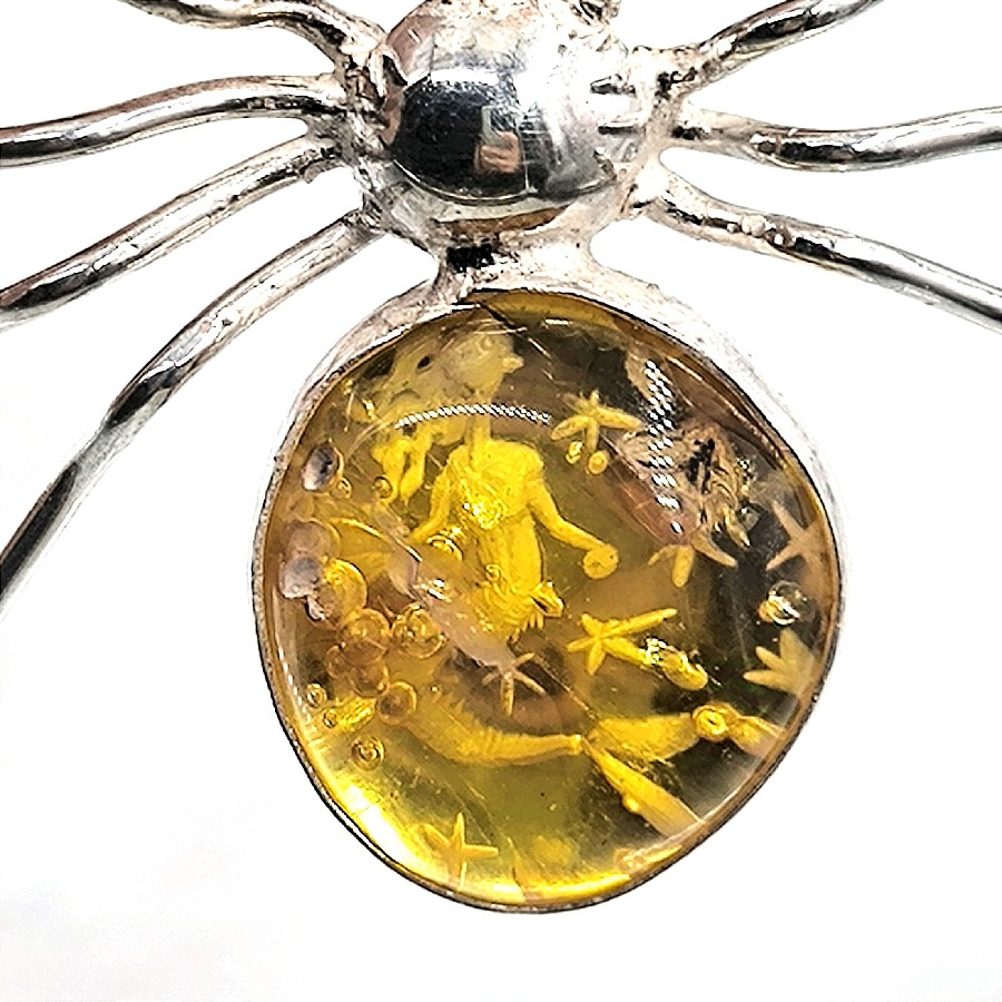 ÖRÜMCEK FORMUNDA FOSİLLİ DAMLA KEHRİBAR ÜZERİNE DENİZ KIZI İNTAGLİO GÜMÜŞ KOLYE, doğanın güzelliklerini ve eşsiz tasarımlarıyla birleştiren özel bir parçadır. Bu şaşırtıcı kolye, herkesin gözlerini üzerine çekecek ve büyüleyecek şekilde tasarlanmıştır.