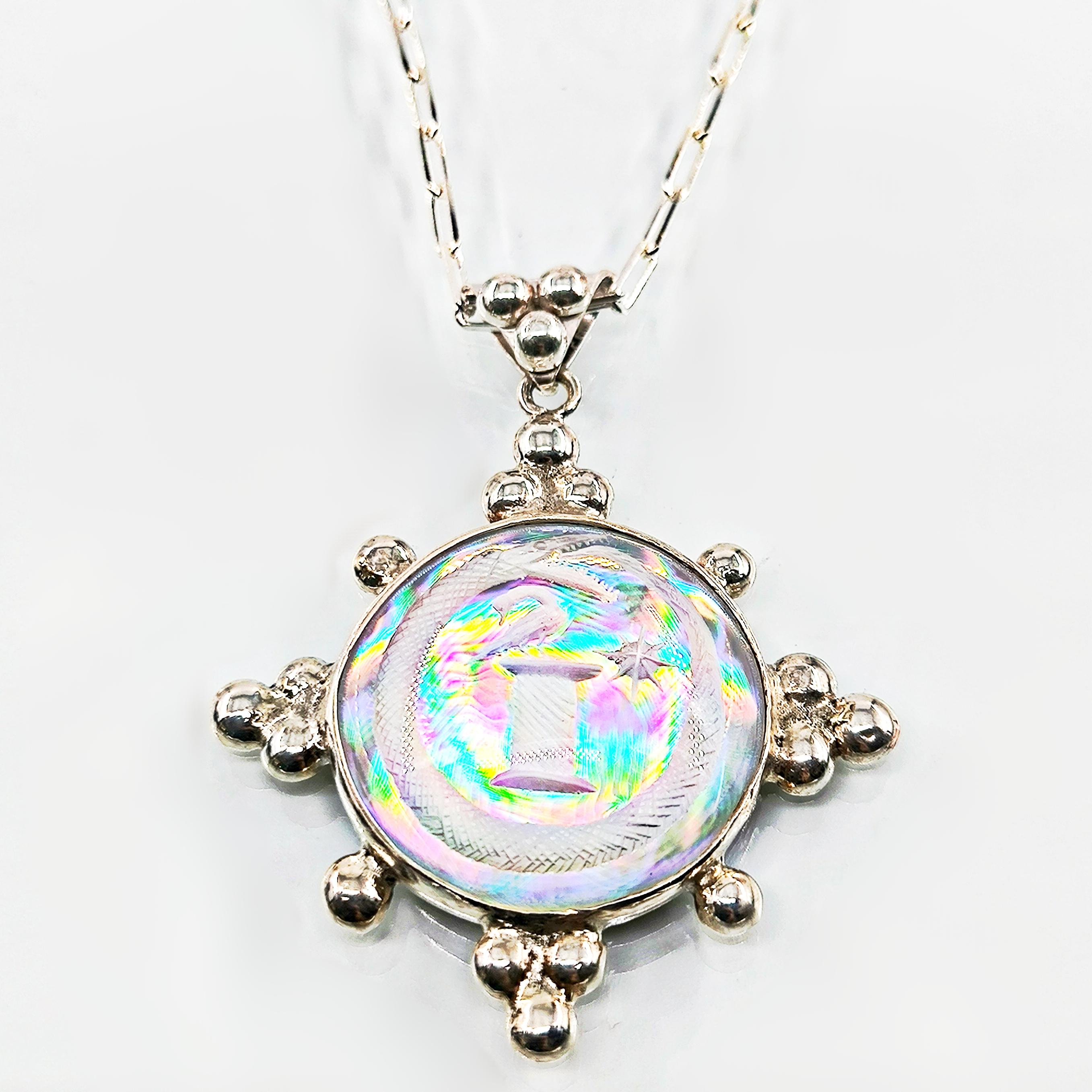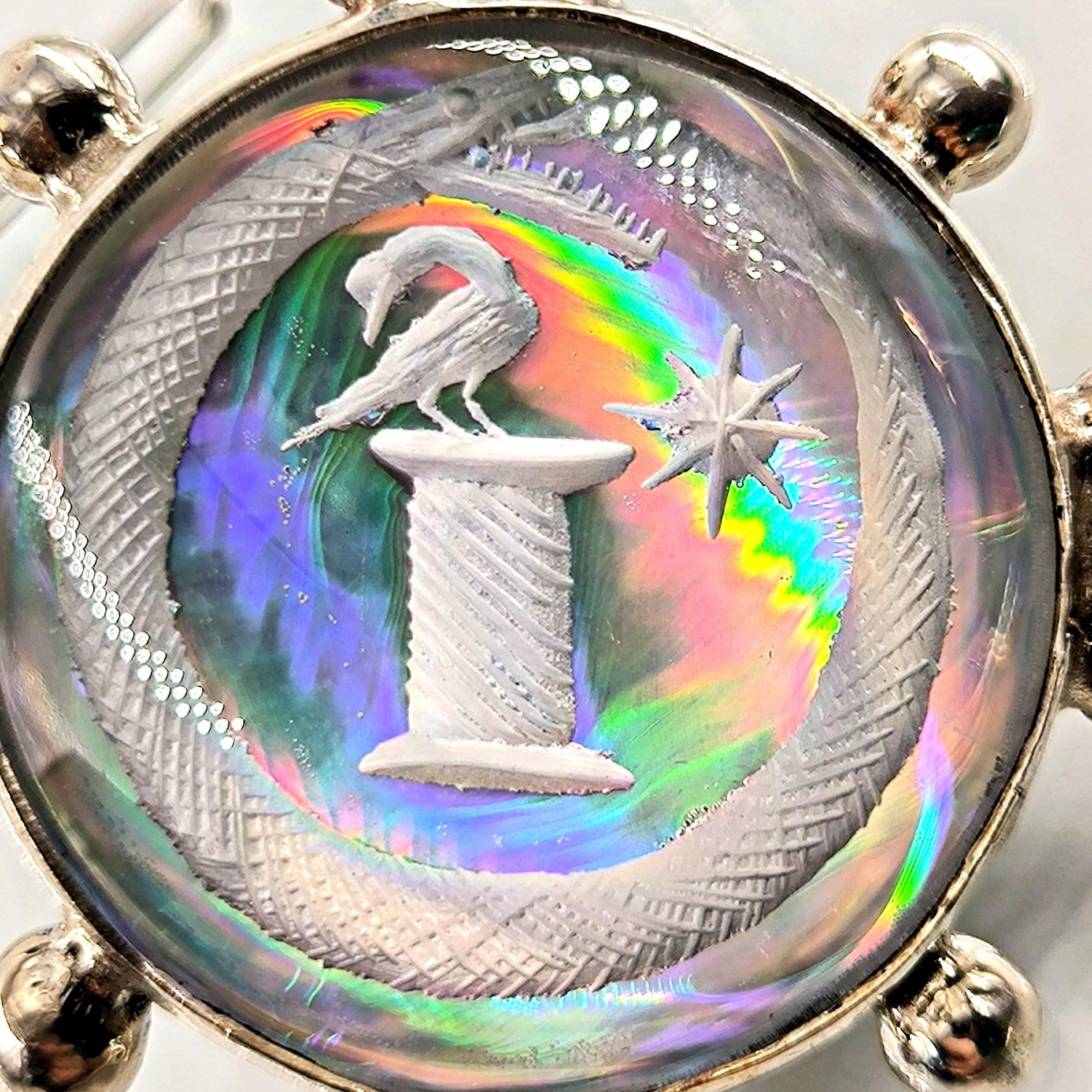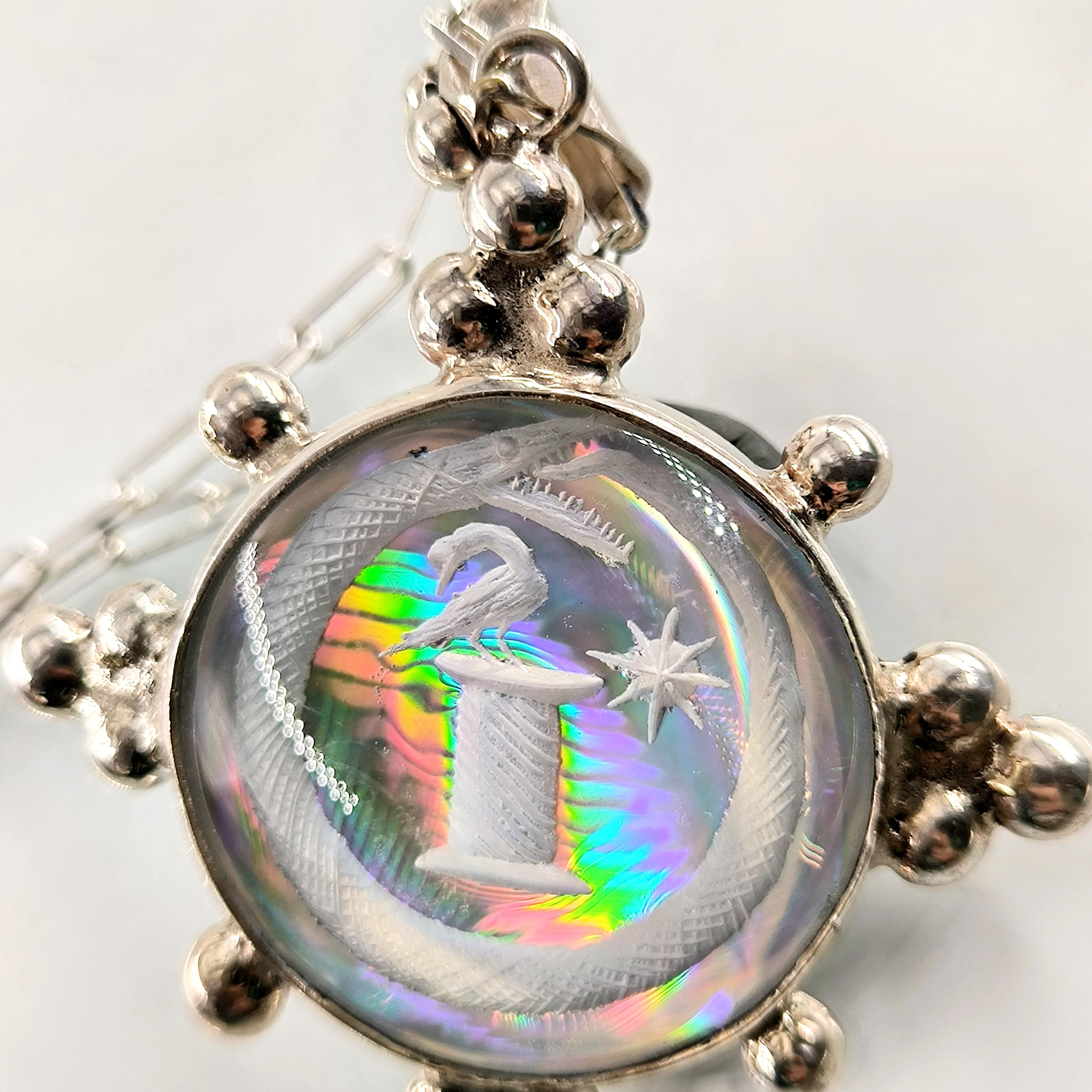 Ouroboros’un kadim döngüsünü, bir sütun üzerindeki kuşun bilgeliğiyle birleştirdiğim bu eser, negatif oyma tekniğiyle kabeşon camın içine tamamen el ile işlenmiştir. Yılanın kendi kuyruğunu ısırarak sonsuzluğu simgeleyen formu, merkezde yükselen sütunun üzerinde duran kuş ile birleşerek ruhun özgürleşmesini ve yeniden doğuşu temsil eder. Camın altına kendi geliştirdiğim özel hologram folyo tekniğini uyguladım; böylece ışık her açıdan gökkuşağı gibi kırılarak büyüleyici bir aura oluşturuyor. Çerçevesi 925 ayar gümüştür ve tek adet üretilmiştir. Kendine anlam yükleyen koleksiyonerler için tasarlanmış gerçek bir tılsım niteliğindedir.