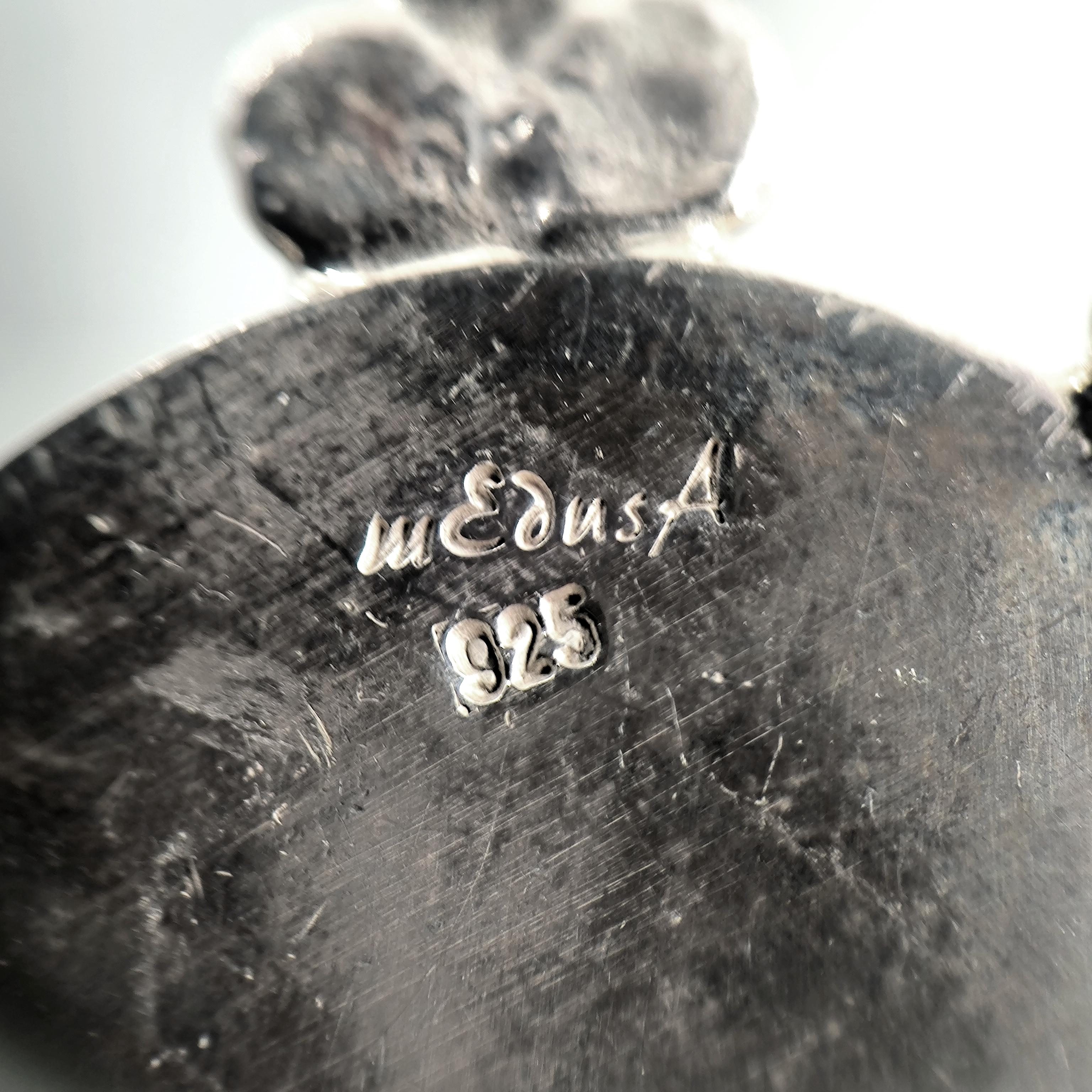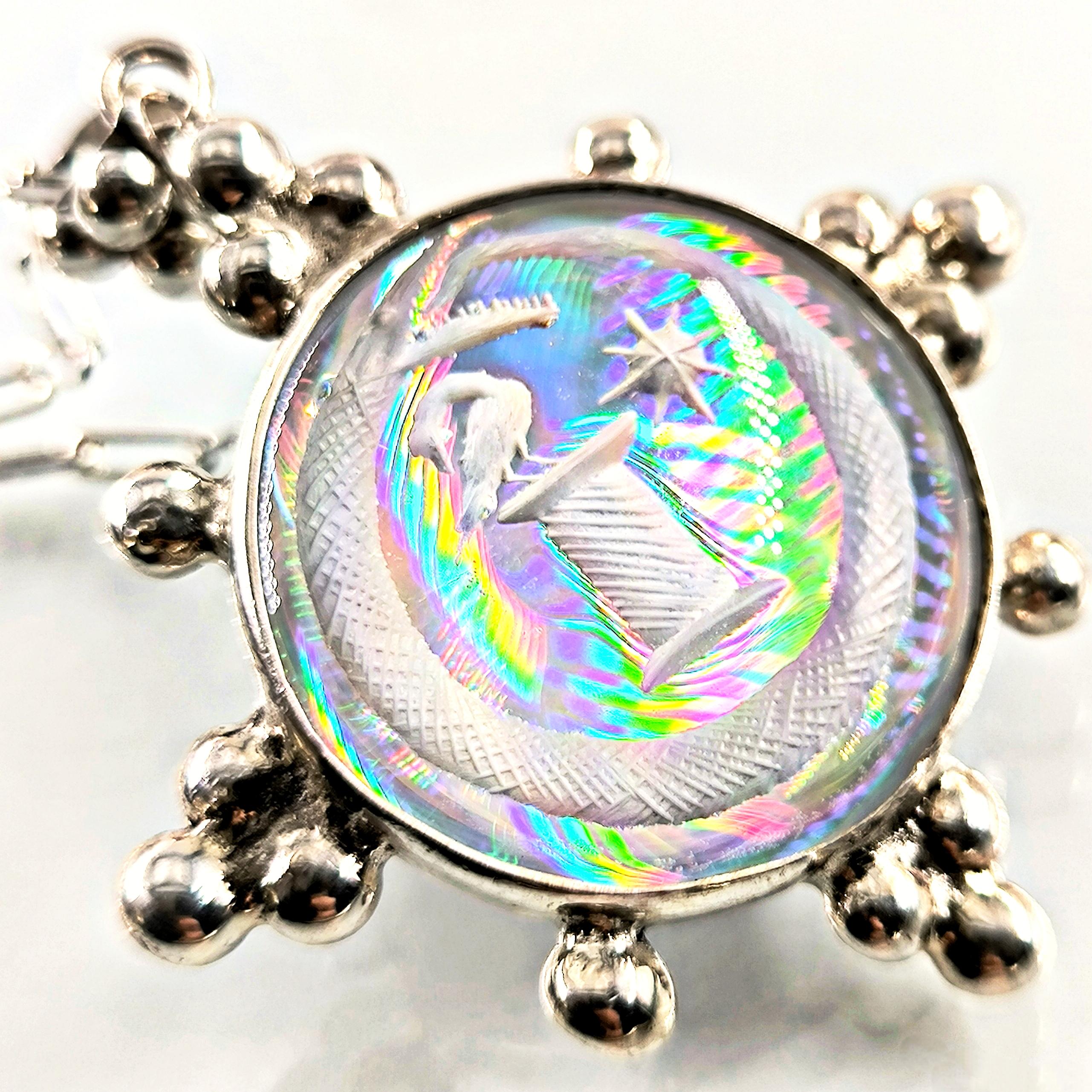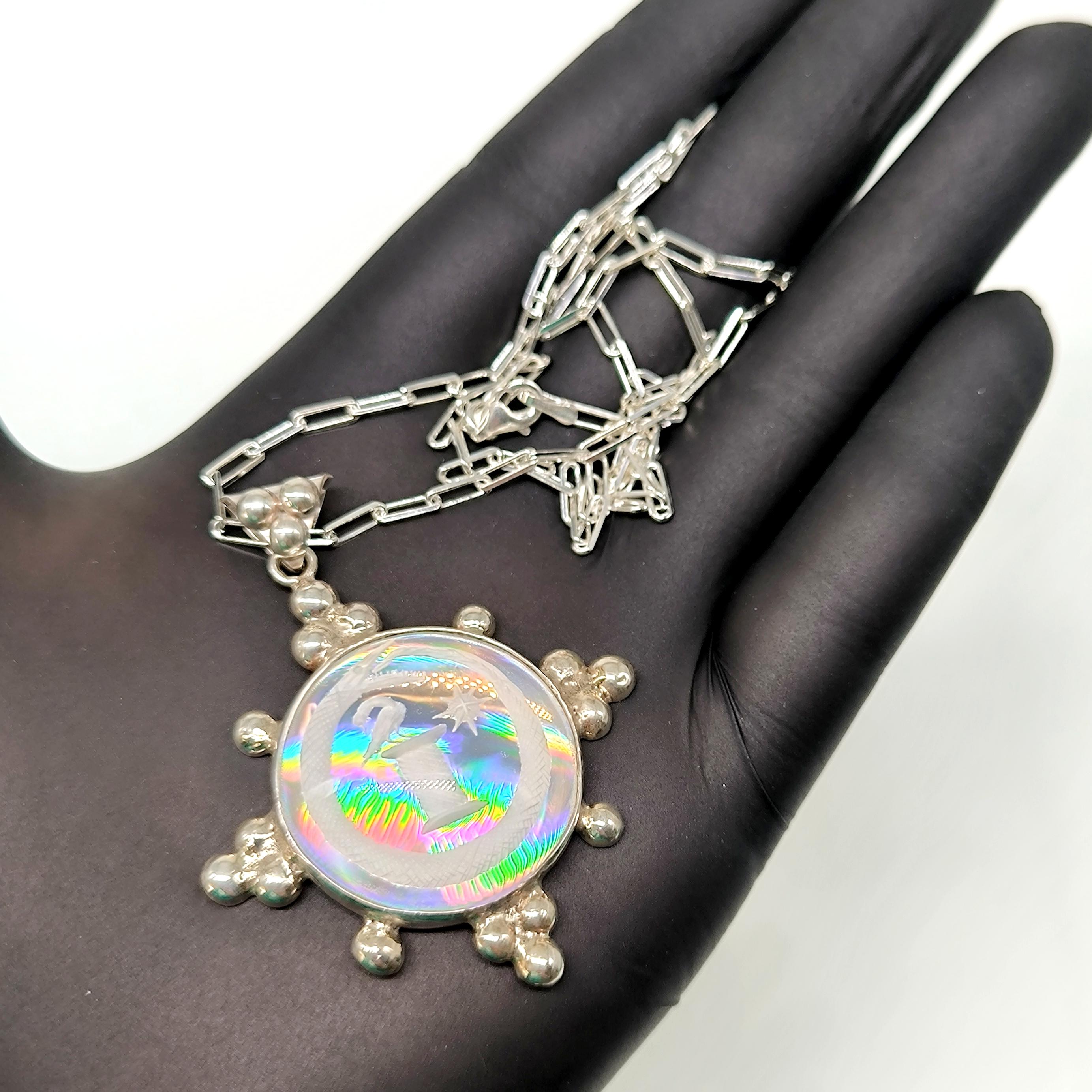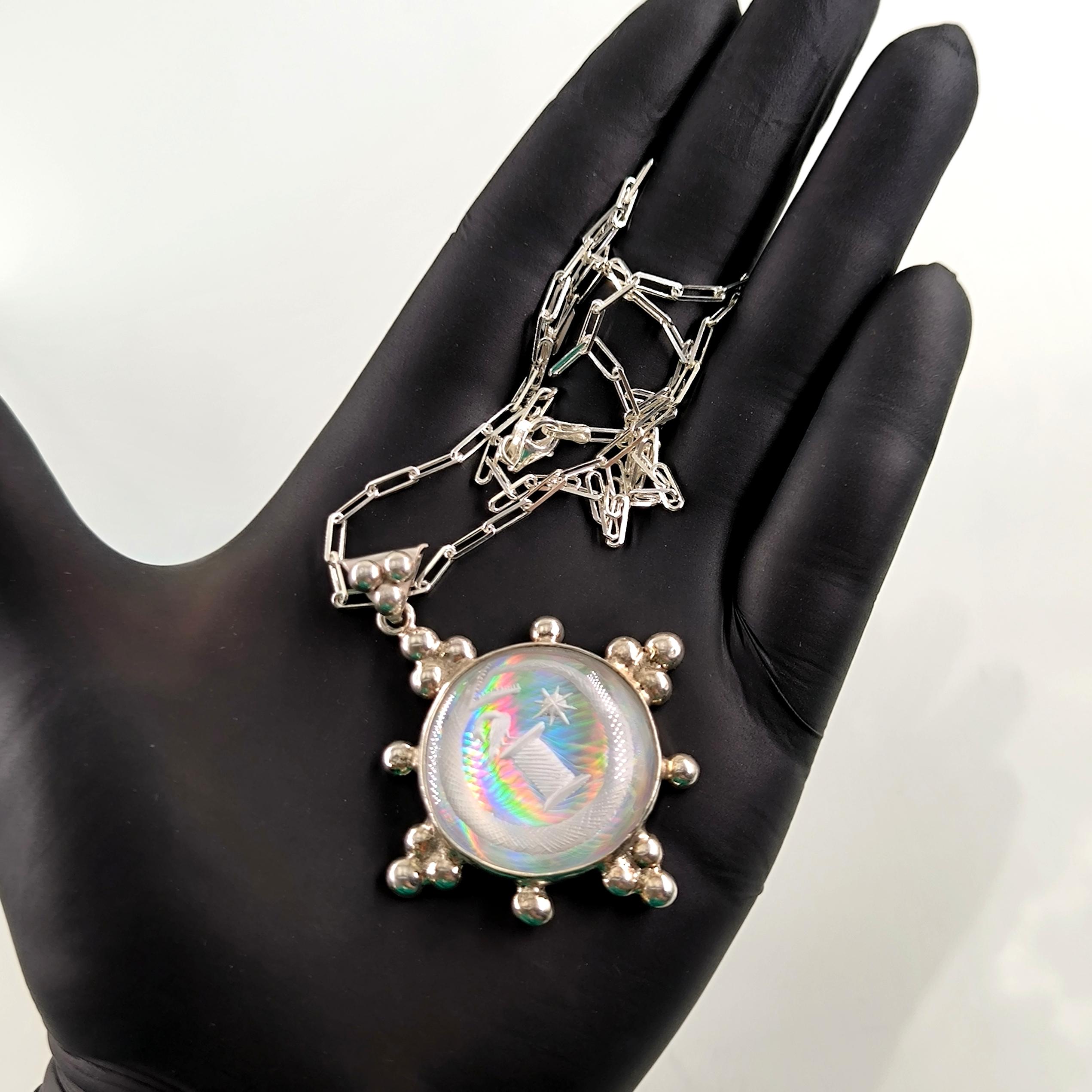 Ouroboros’un kadim döngüsünü, bir sütun üzerindeki kuşun bilgeliğiyle birleştirdiğim bu eser, negatif oyma tekniğiyle kabeşon camın içine tamamen el ile işlenmiştir. Yılanın kendi kuyruğunu ısırarak sonsuzluğu simgeleyen formu, merkezde yükselen sütunun üzerinde duran kuş ile birleşerek ruhun özgürleşmesini ve yeniden doğuşu temsil eder. Camın altına kendi geliştirdiğim özel hologram folyo tekniğini uyguladım; böylece ışık her açıdan gökkuşağı gibi kırılarak büyüleyici bir aura oluşturuyor. Çerçevesi 925 ayar gümüştür ve tek adet üretilmiştir. Kendine anlam yükleyen koleksiyonerler için tasarlanmış gerçek bir tılsım niteliğindedir.