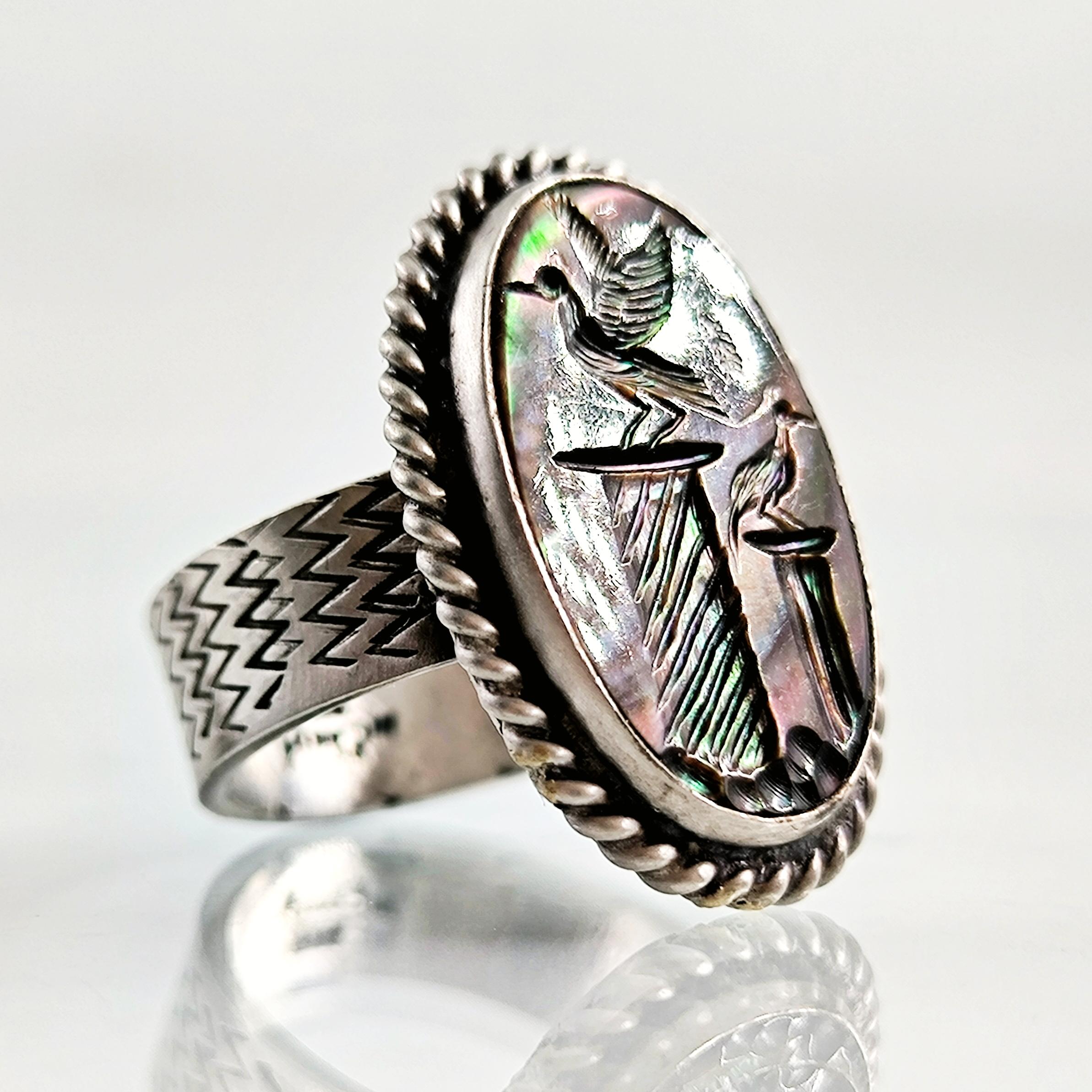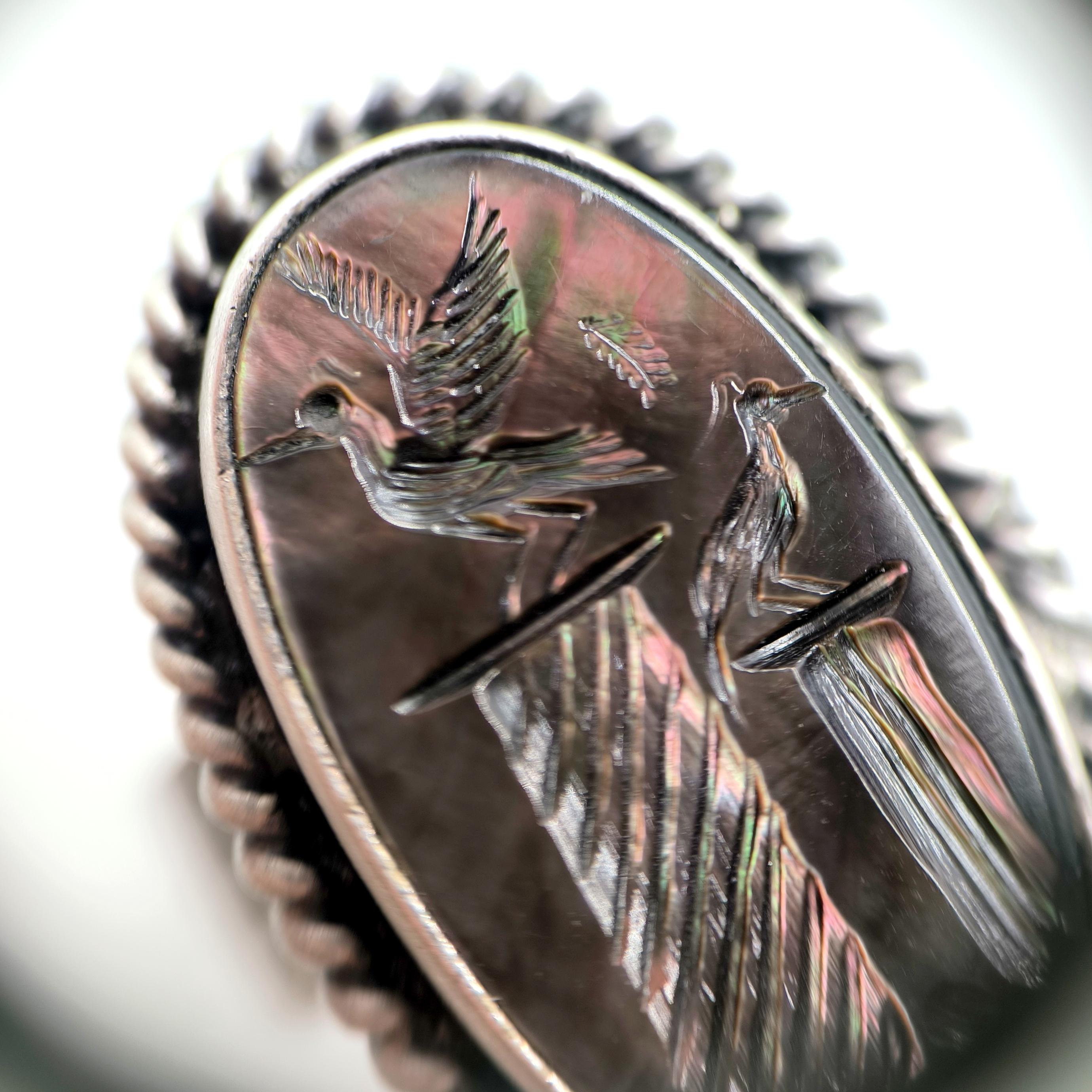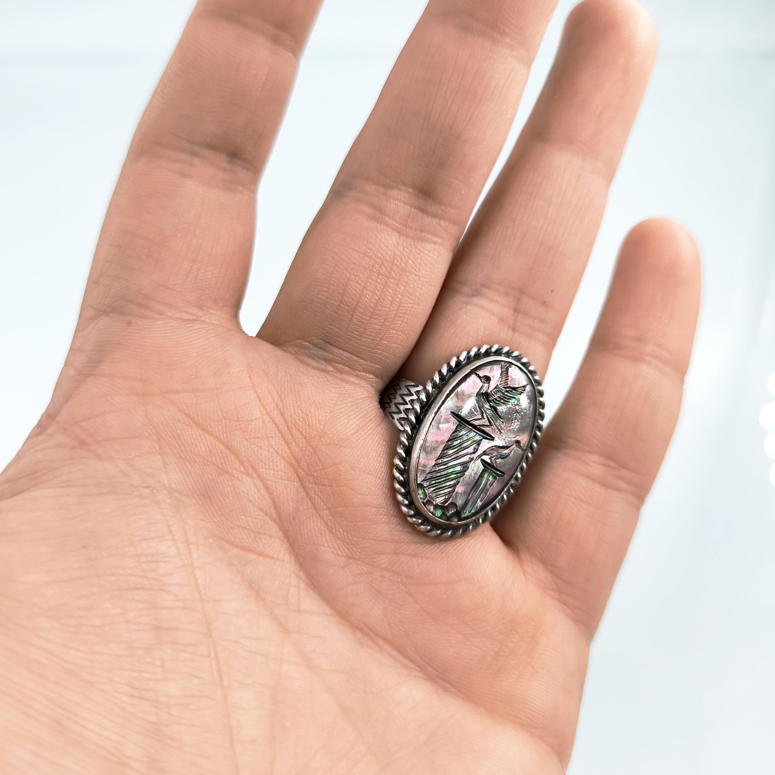 Sedef taş üzerine ince işçilikle kuş figürlü intaglio tekniğinde oyma yapılmıştır. Çerçevesi ve gövdesi tamamen 925 ayar gümüştür. Doğal sedefin ışık oyunları ve el işçiliği motifler, yüzüğe hem zarif hem de sanatsal bir karakter kazandırır.