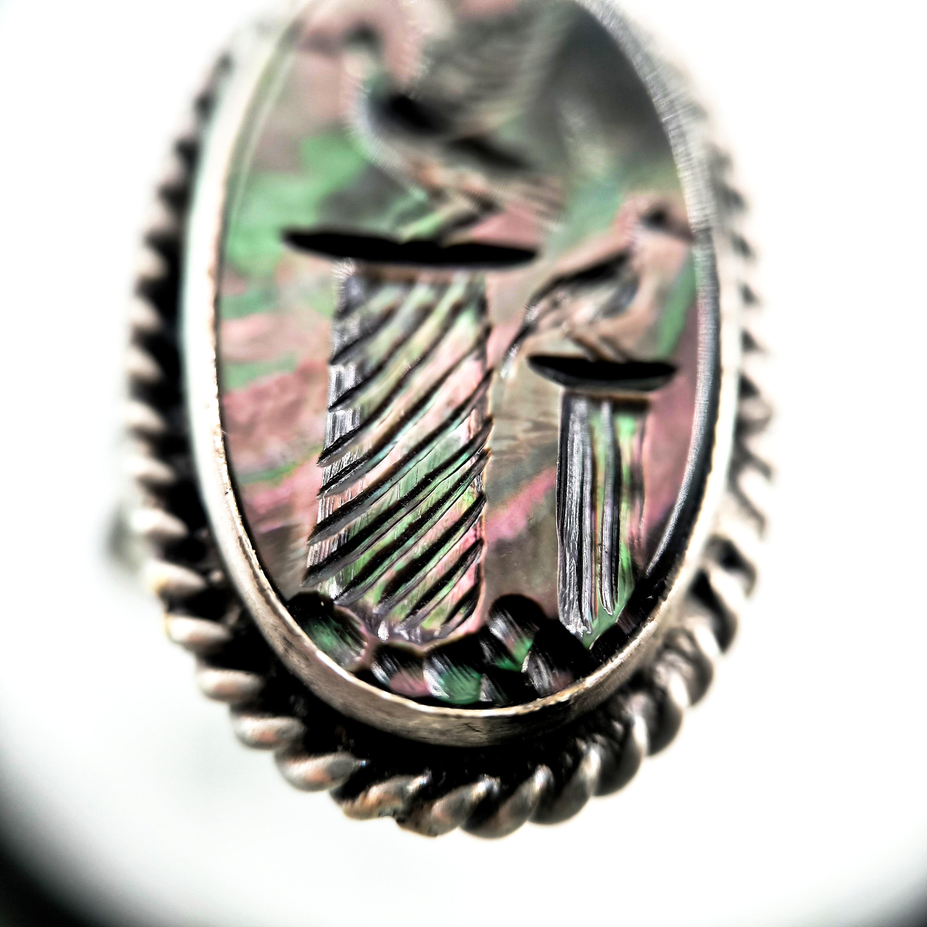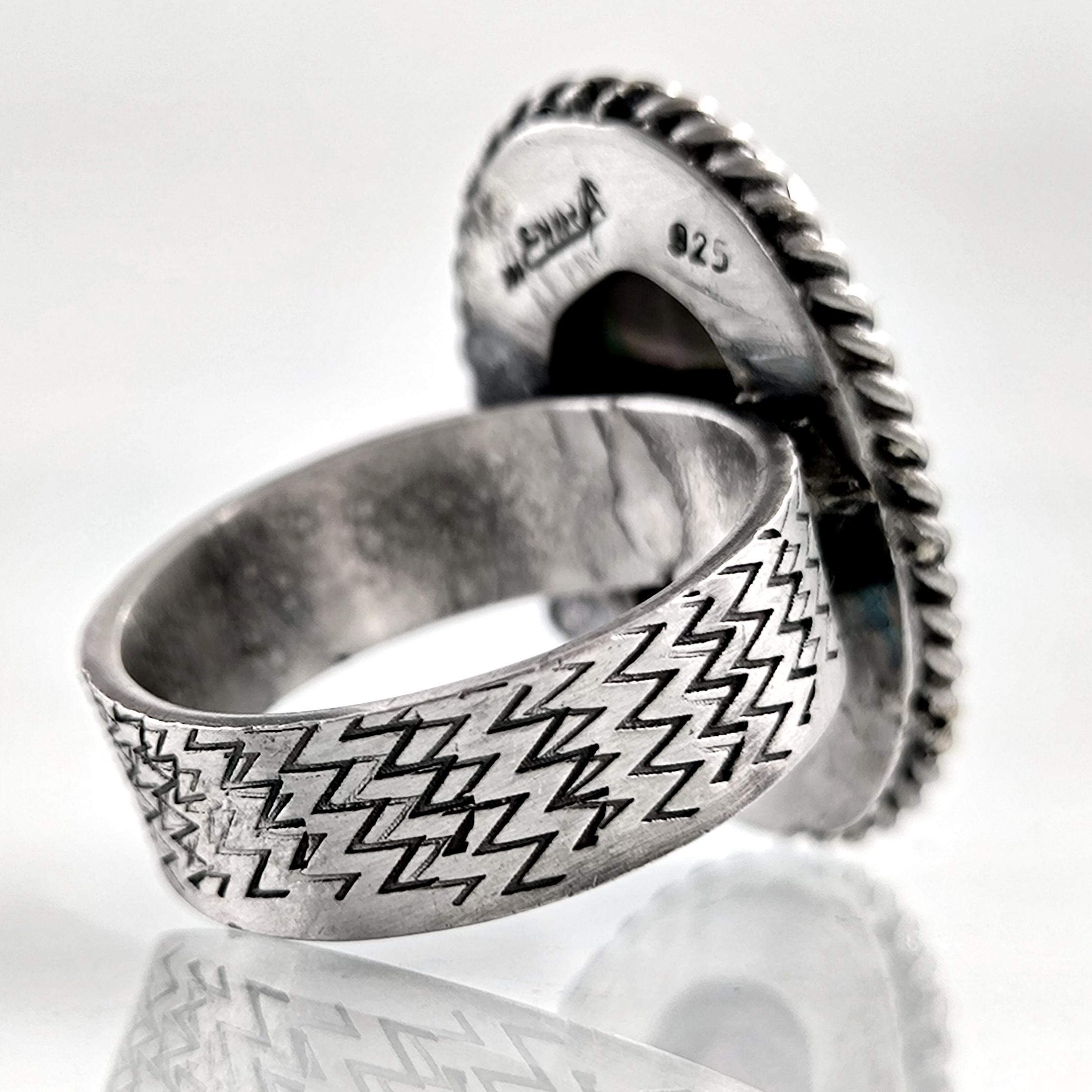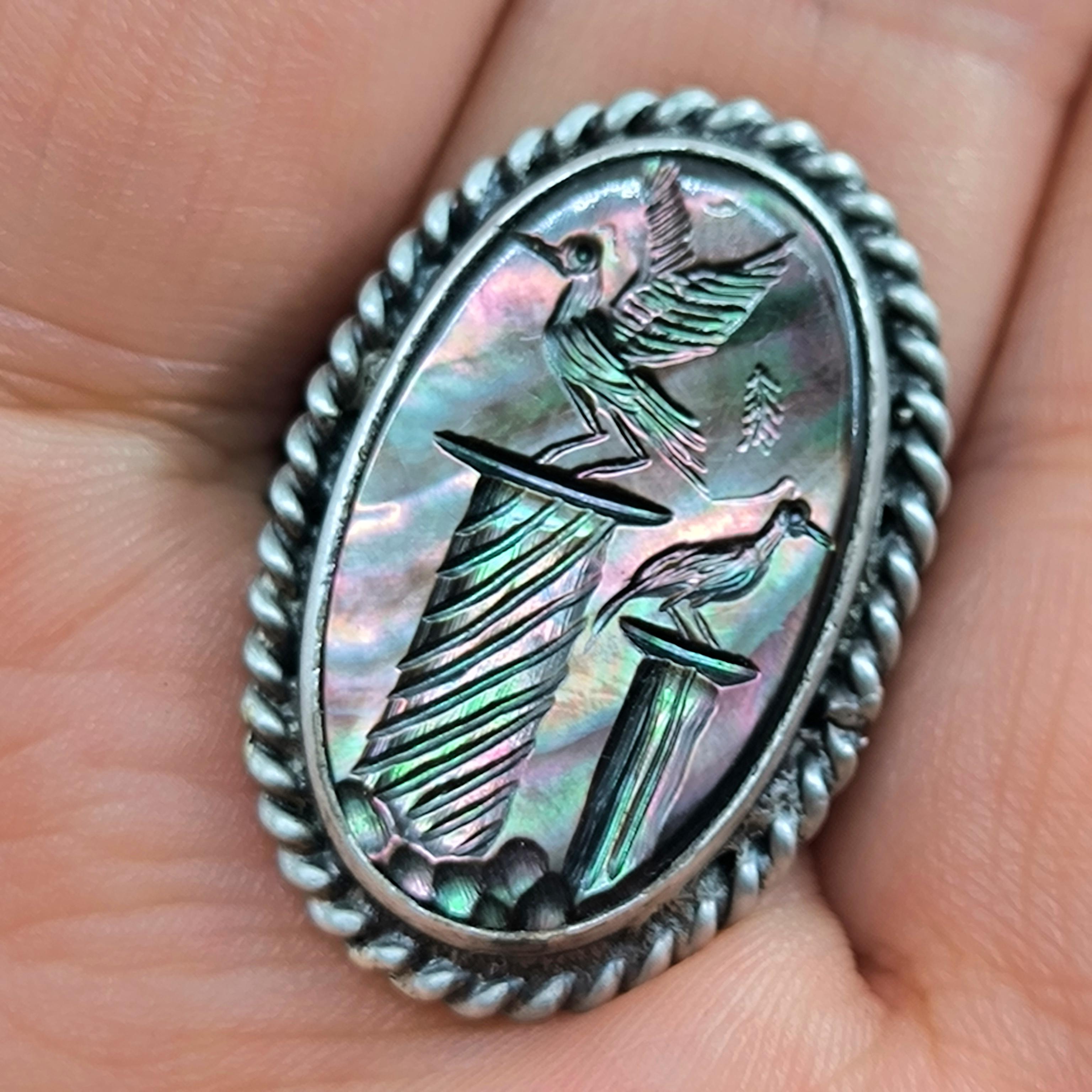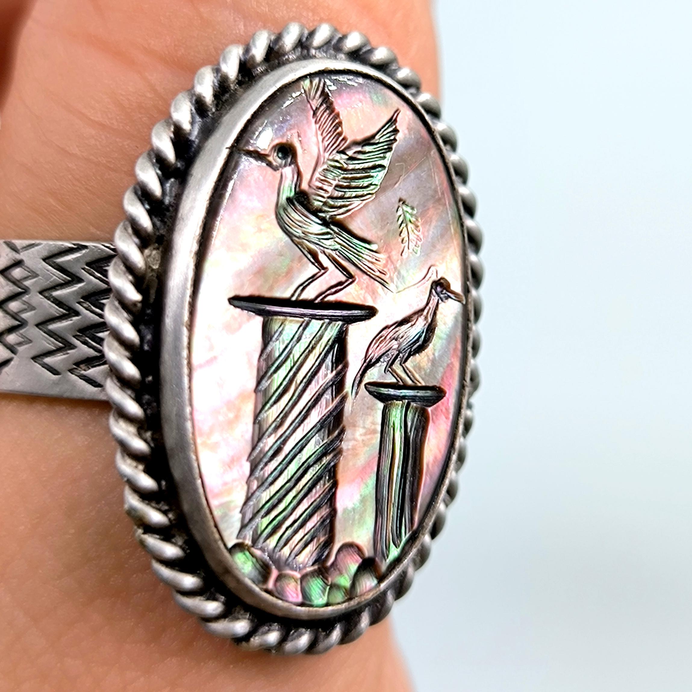 Sedef taş üzerine ince işçilikle kuş figürlü intaglio tekniğinde oyma yapılmıştır. Çerçevesi ve gövdesi tamamen 925 ayar gümüştür. Doğal sedefin ışık oyunları ve el işçiliği motifler, yüzüğe hem zarif hem de sanatsal bir karakter kazandırır.