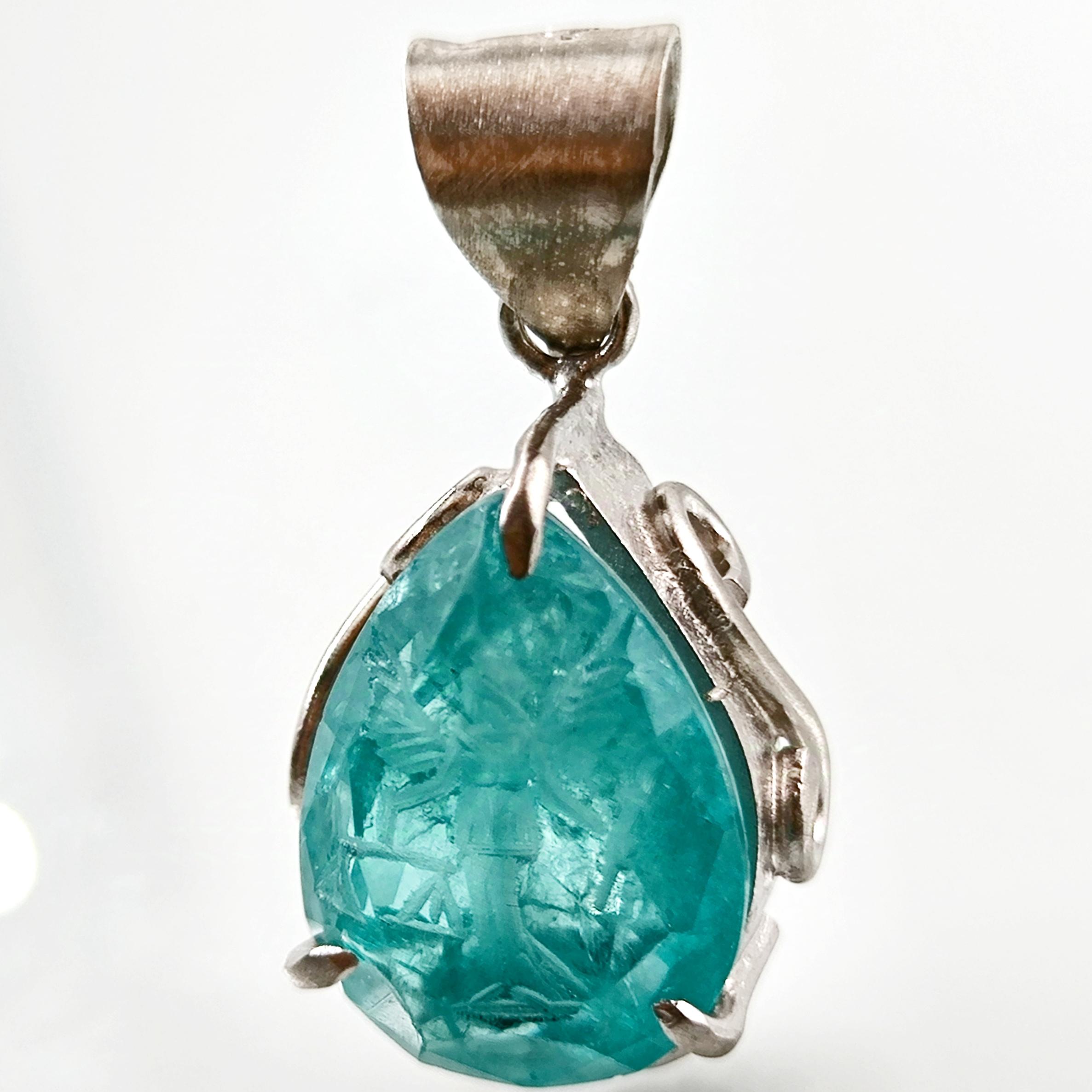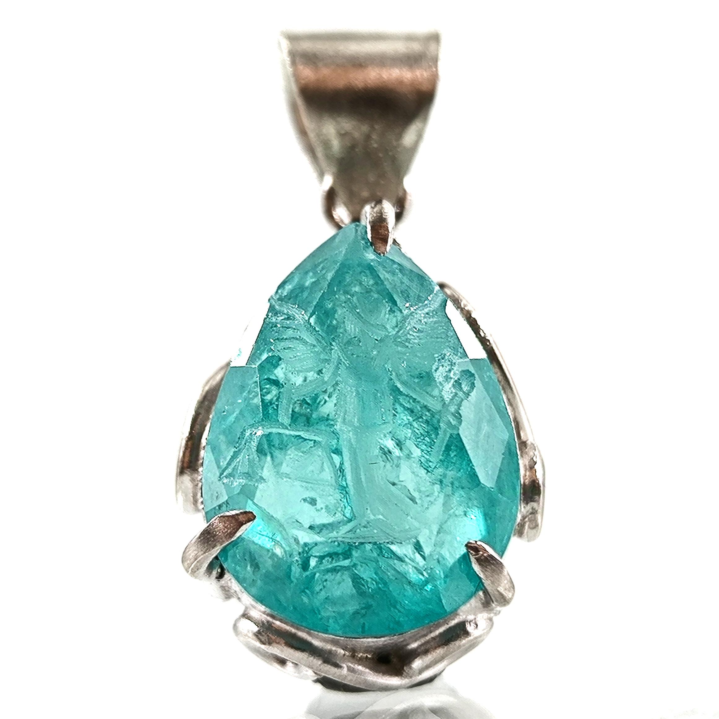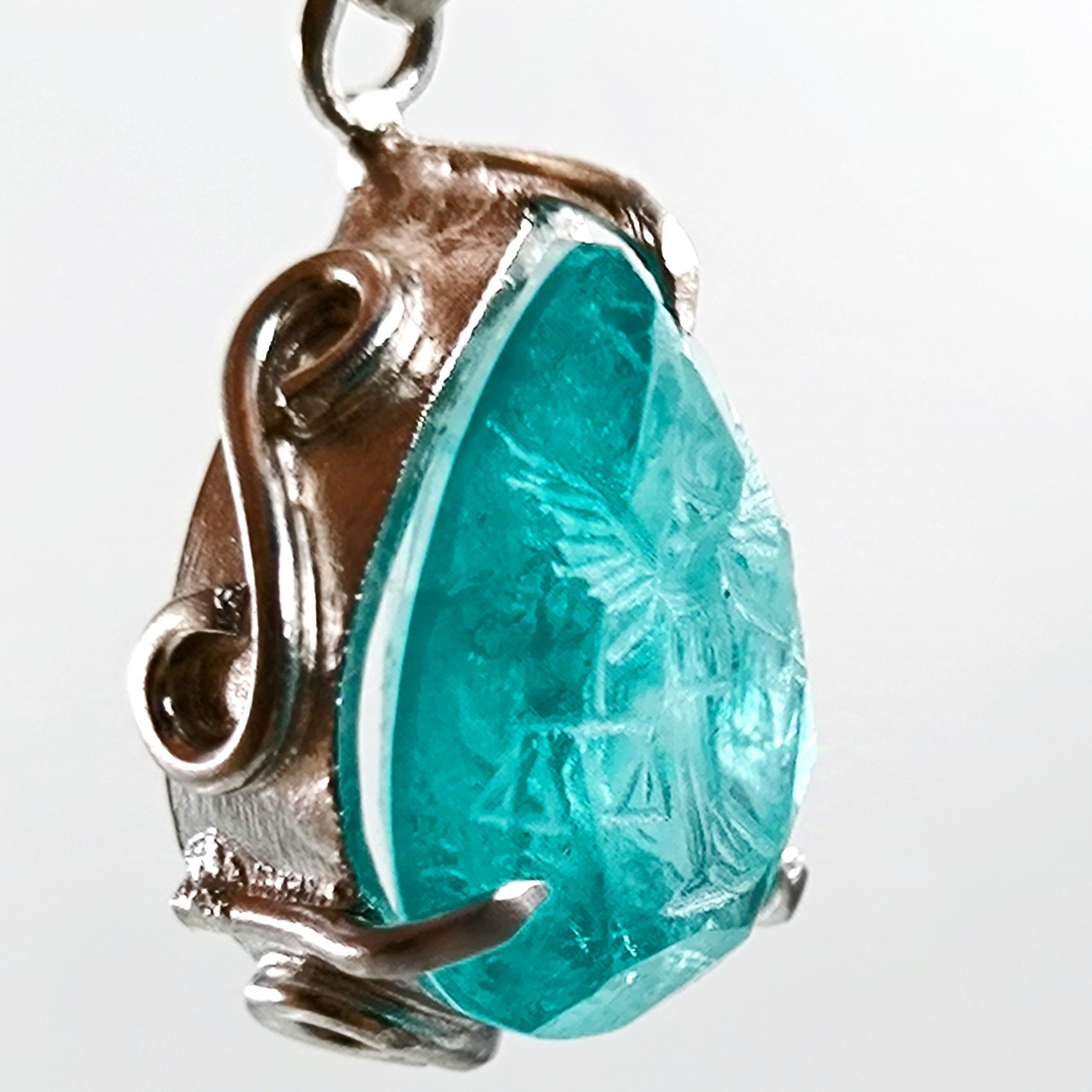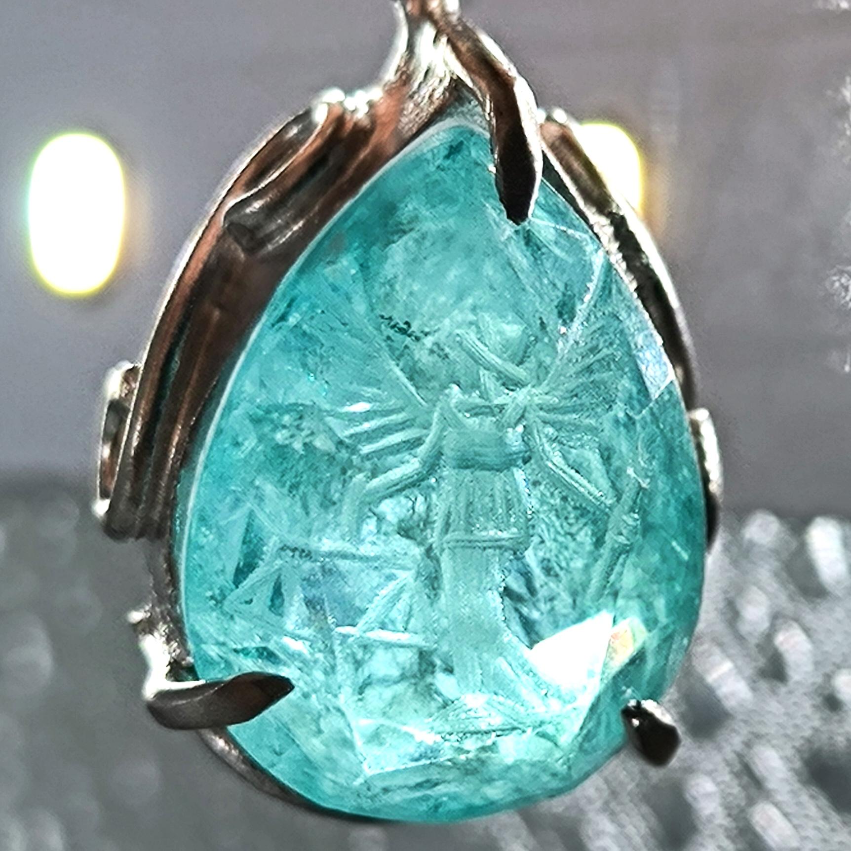 Drop damla pırlanta kesim paraiba (lab) taş üzerine, koruyucu tılsım sembollerinden Tanrıça Nike gravür sanatını işlediğimiz, Rodyum kaplama gümüş kolye!
