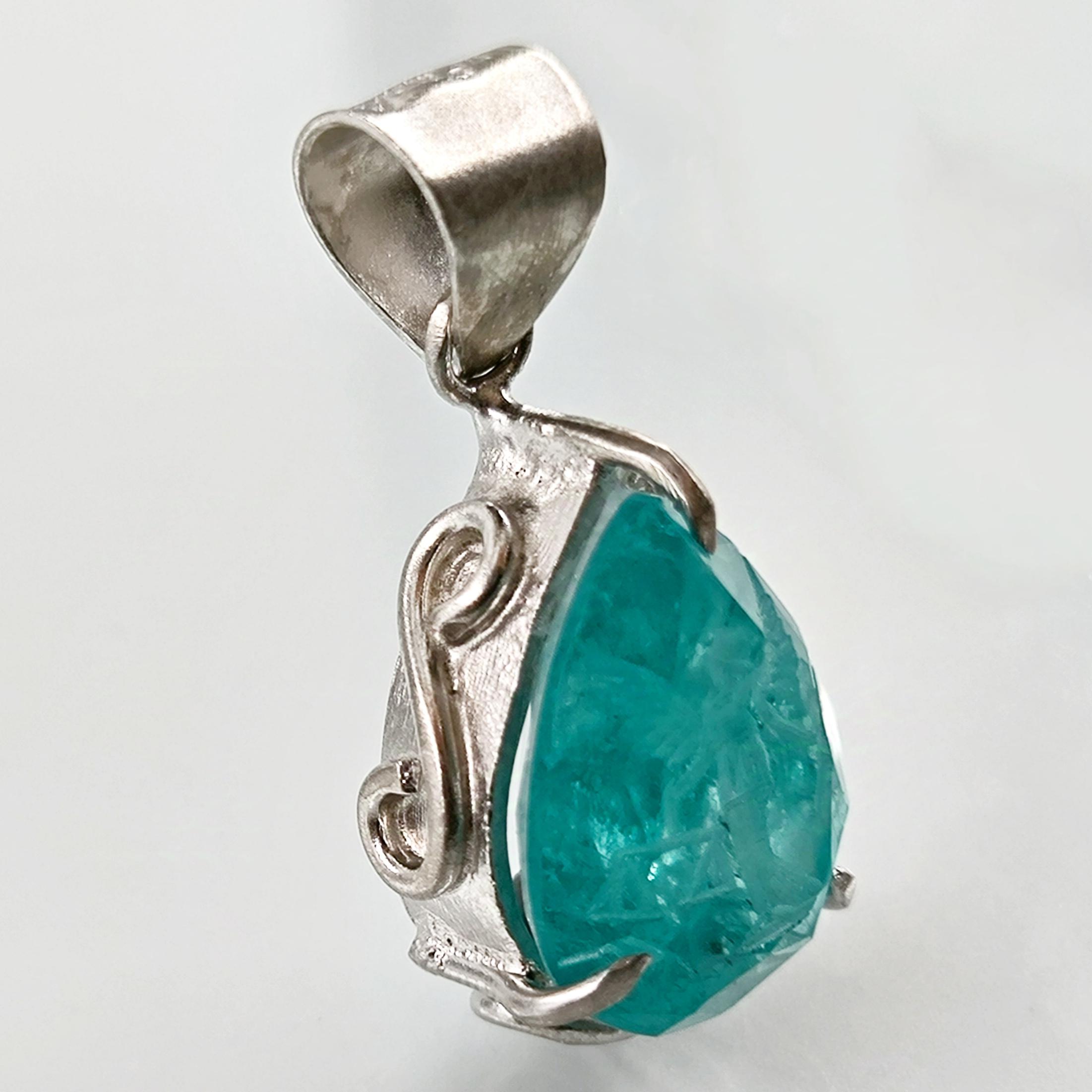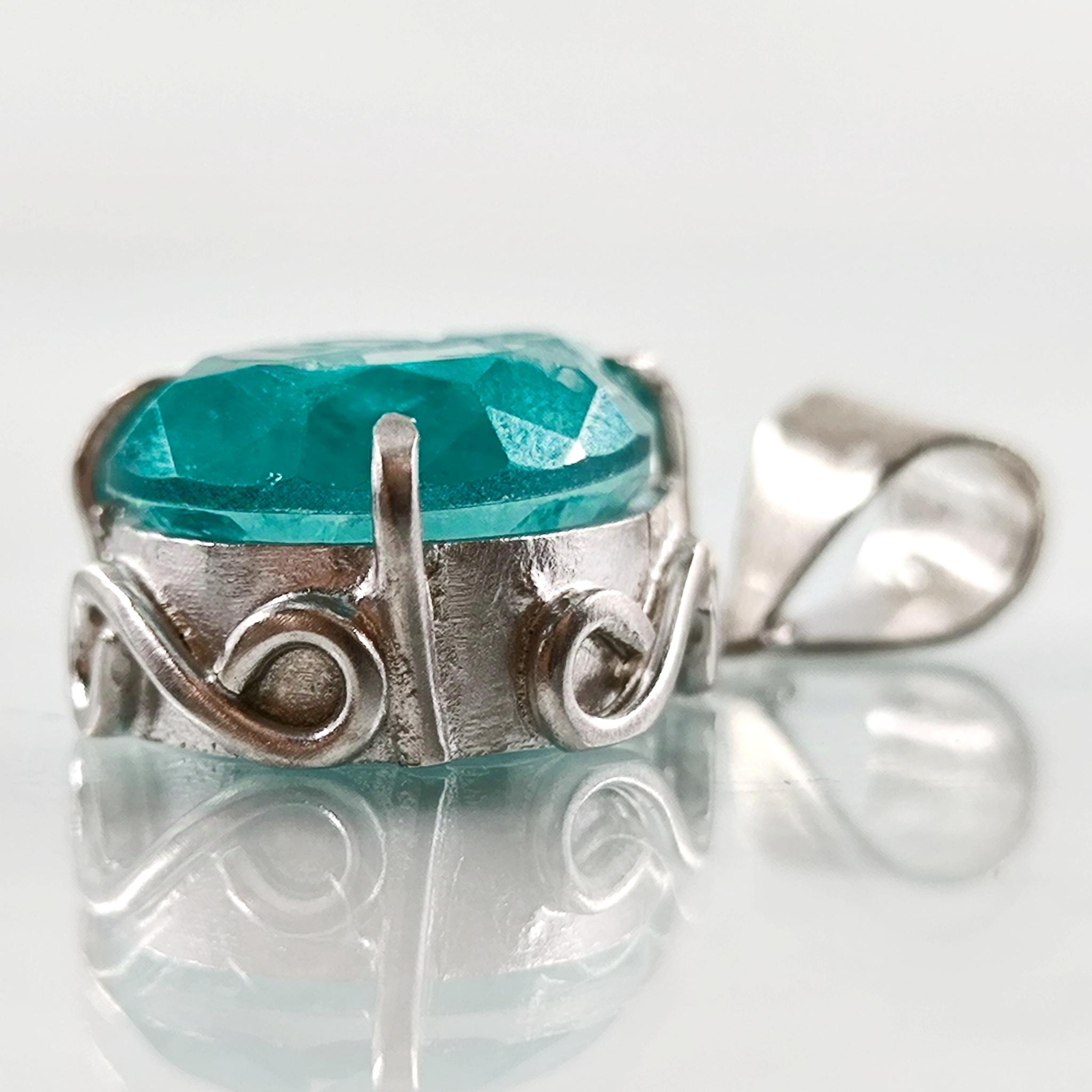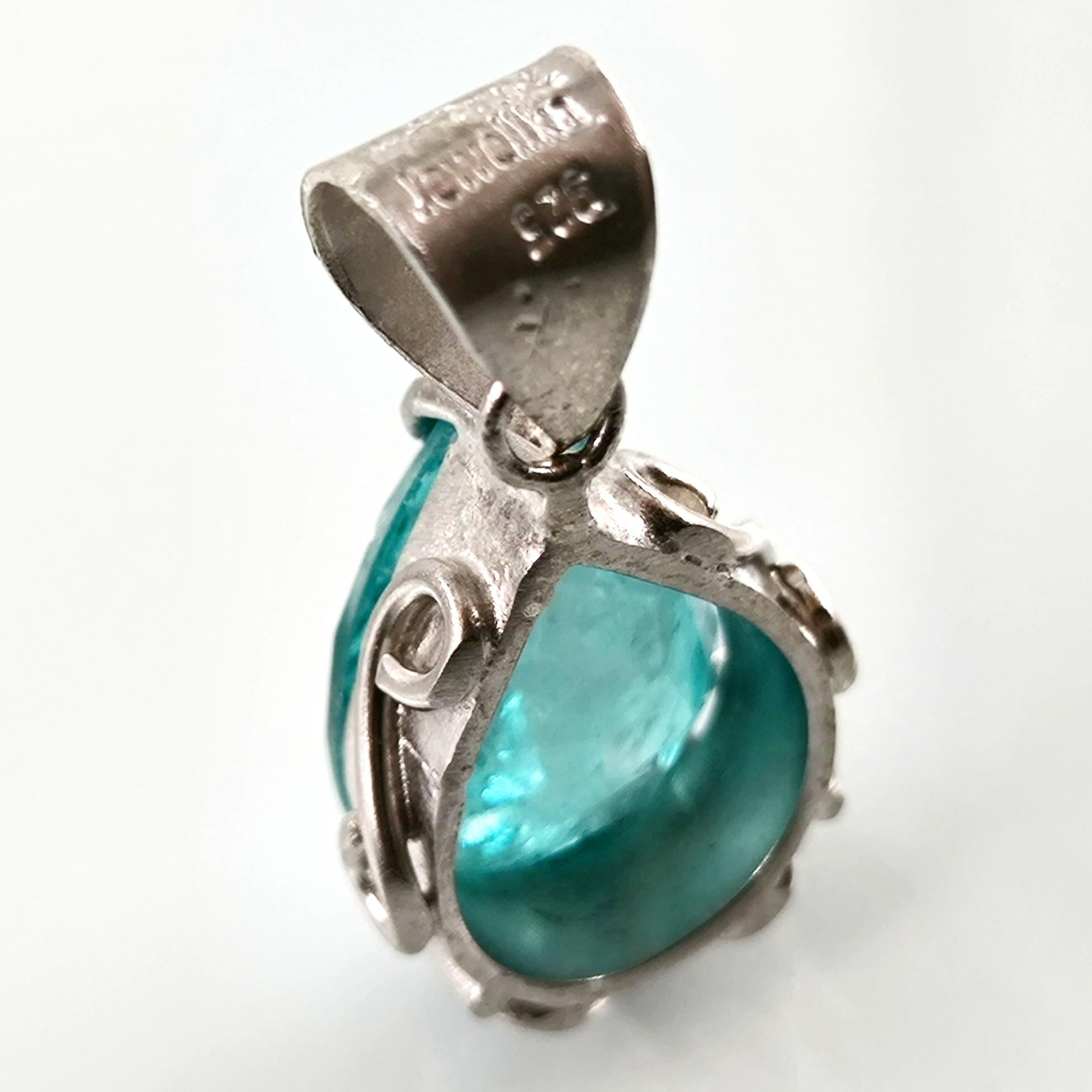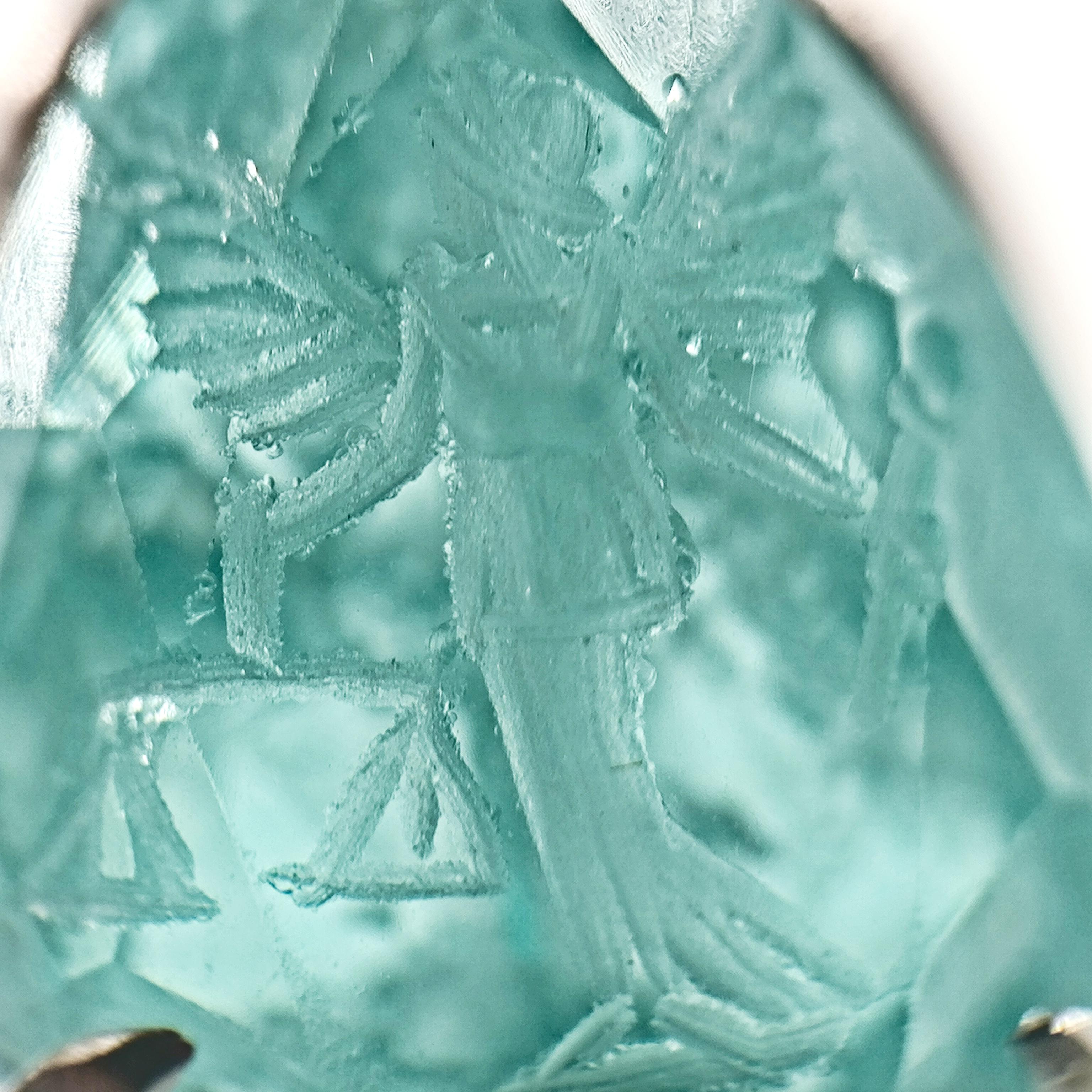 Drop damla pırlanta kesim paraiba (lab) taş üzerine, koruyucu tılsım sembollerinden Tanrıça Nike gravür sanatını işlediğimiz, Rodyum kaplama gümüş kolye!