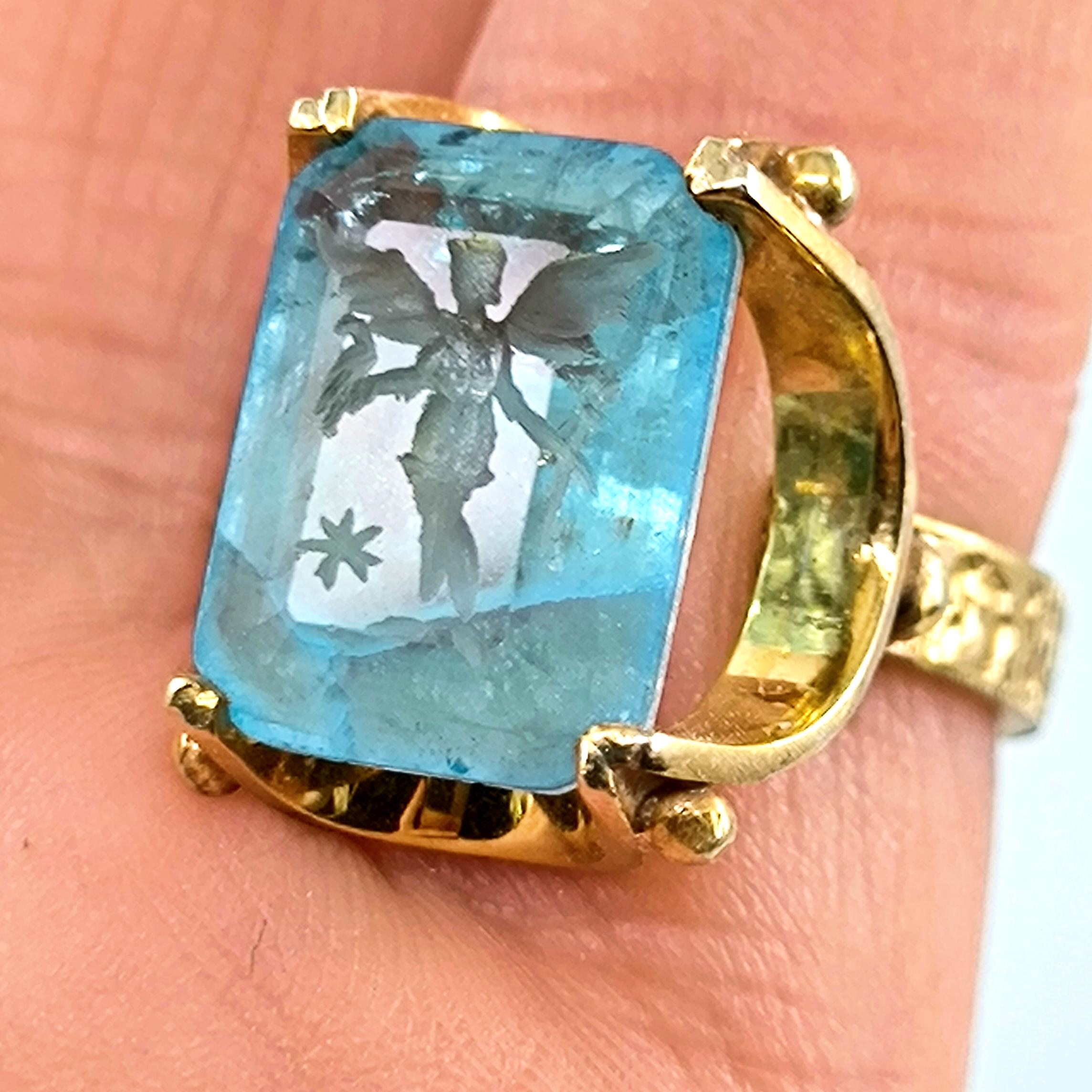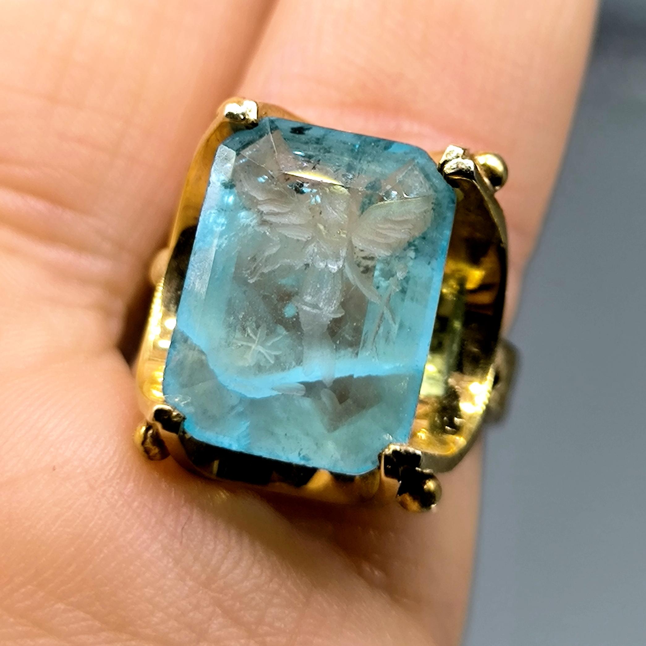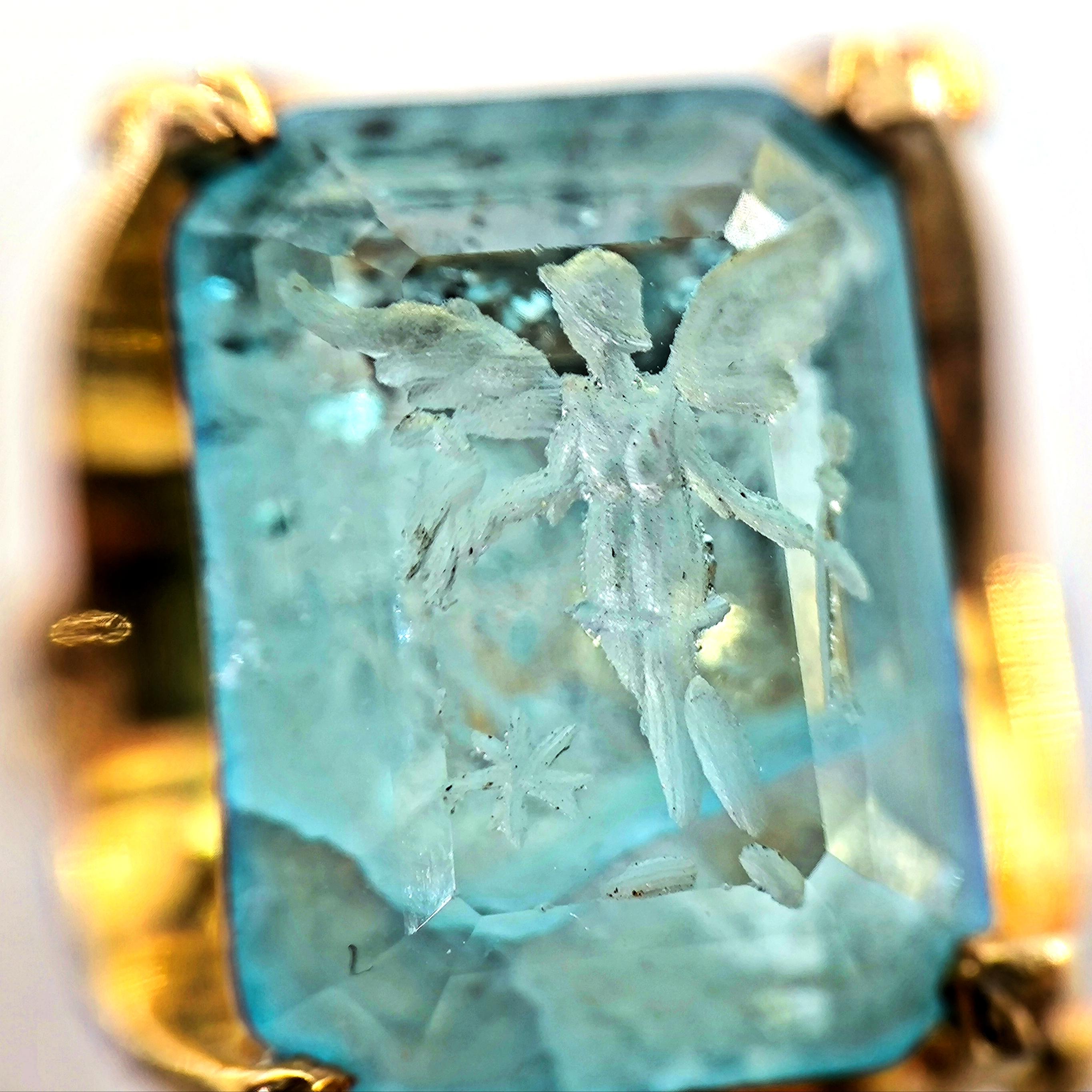 Laboratuvar üretimi paraiba taşın iç derinliğine negatif intaglio tekniğiyle oyduğumuz kanatlı tanrıça figürü, bilgelik, özgürlük ve ilahi enerjiyi temsil eder. 925 ayar gümüş üzerine uygulanan 22 ayar altın kaplama, taşın mavi ışıltısıyla birleşerek göz kamaştırıcı bir kontrast yaratır. Her detayı el işçiliğiyle tamamlanan bu yüzük, mitolojik estetik ile çağdaş zarafetin birleştiği özgün bir sanat eseridir.