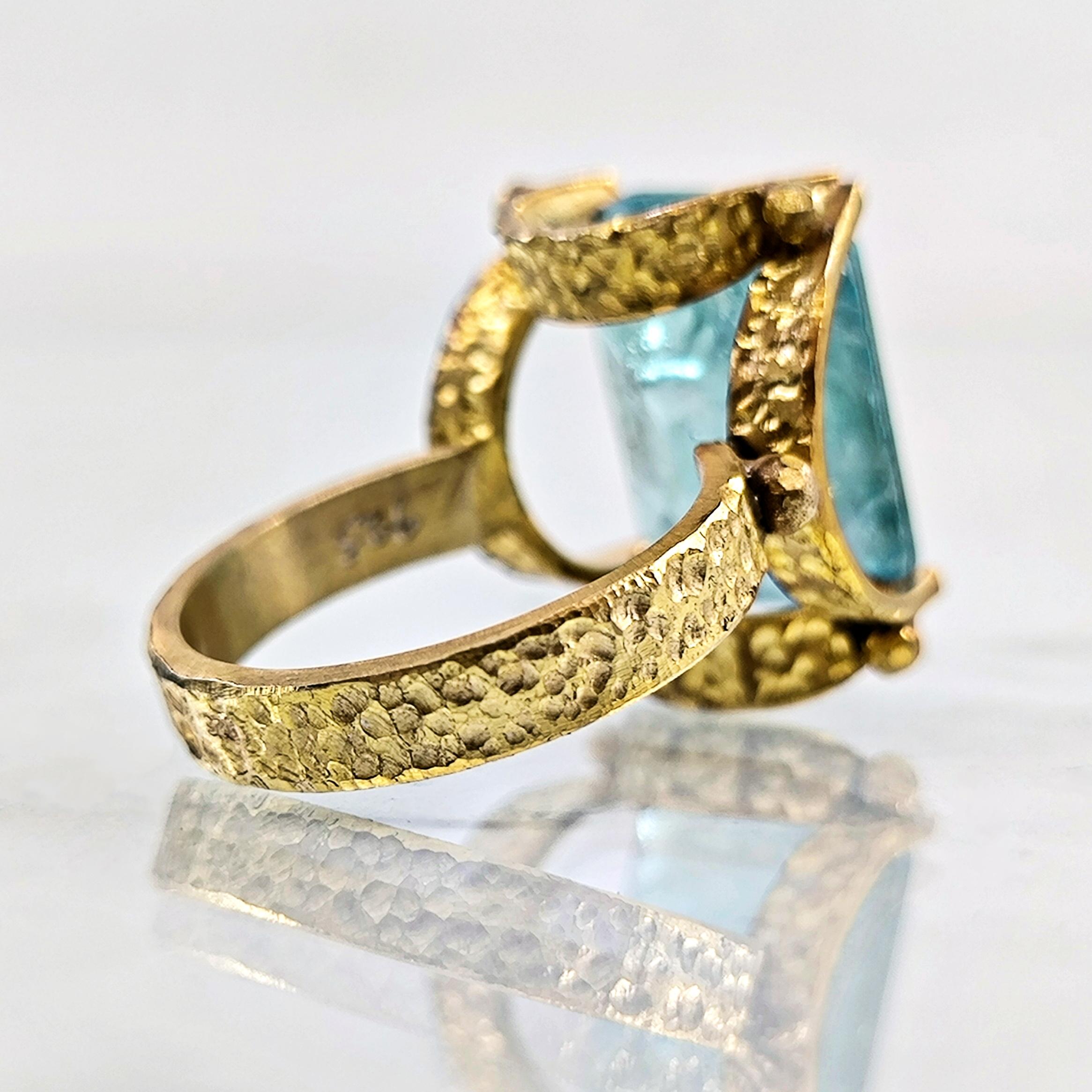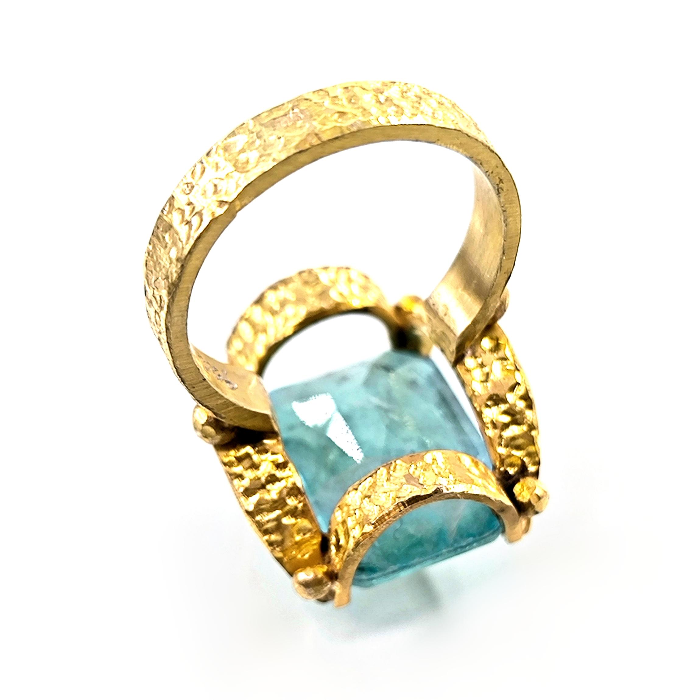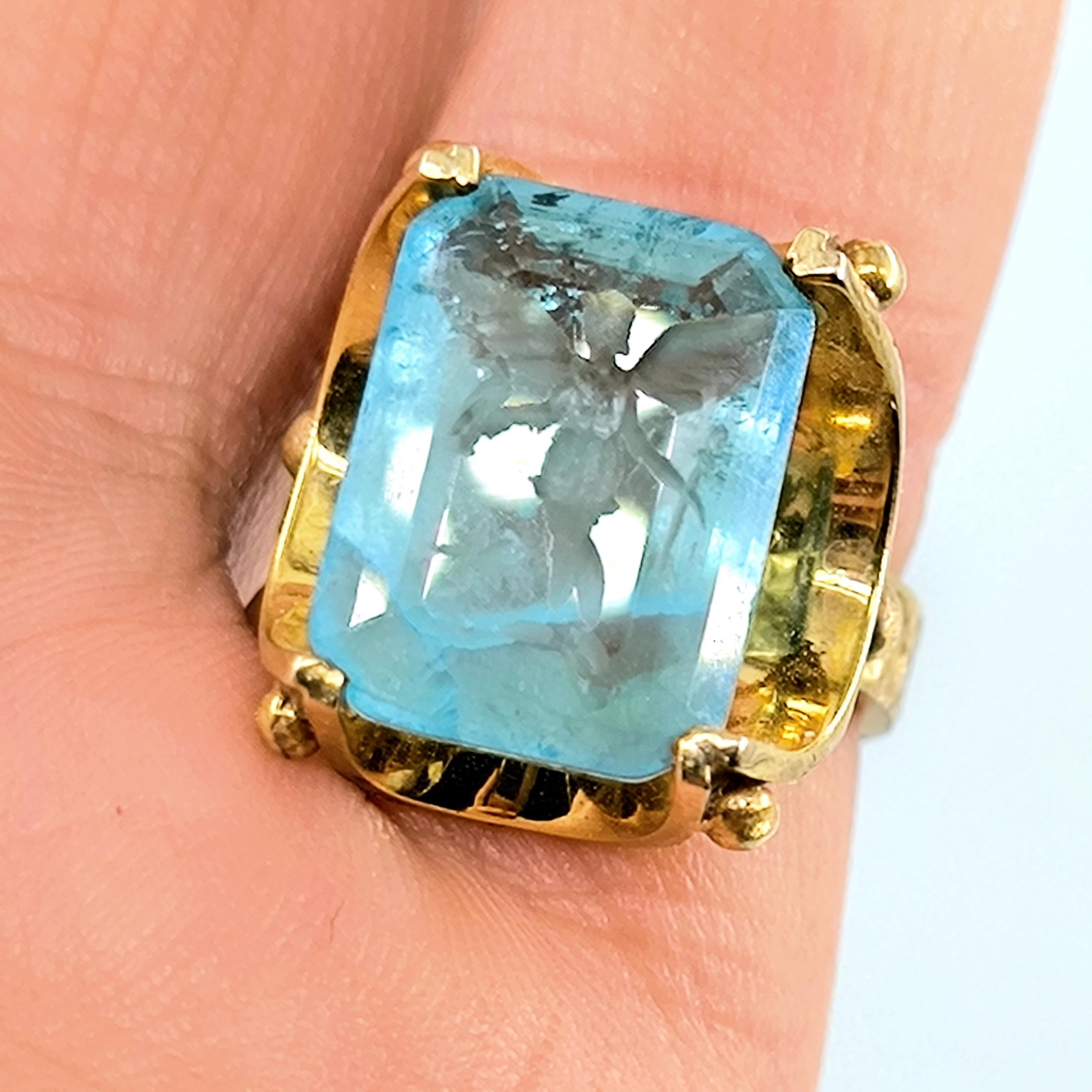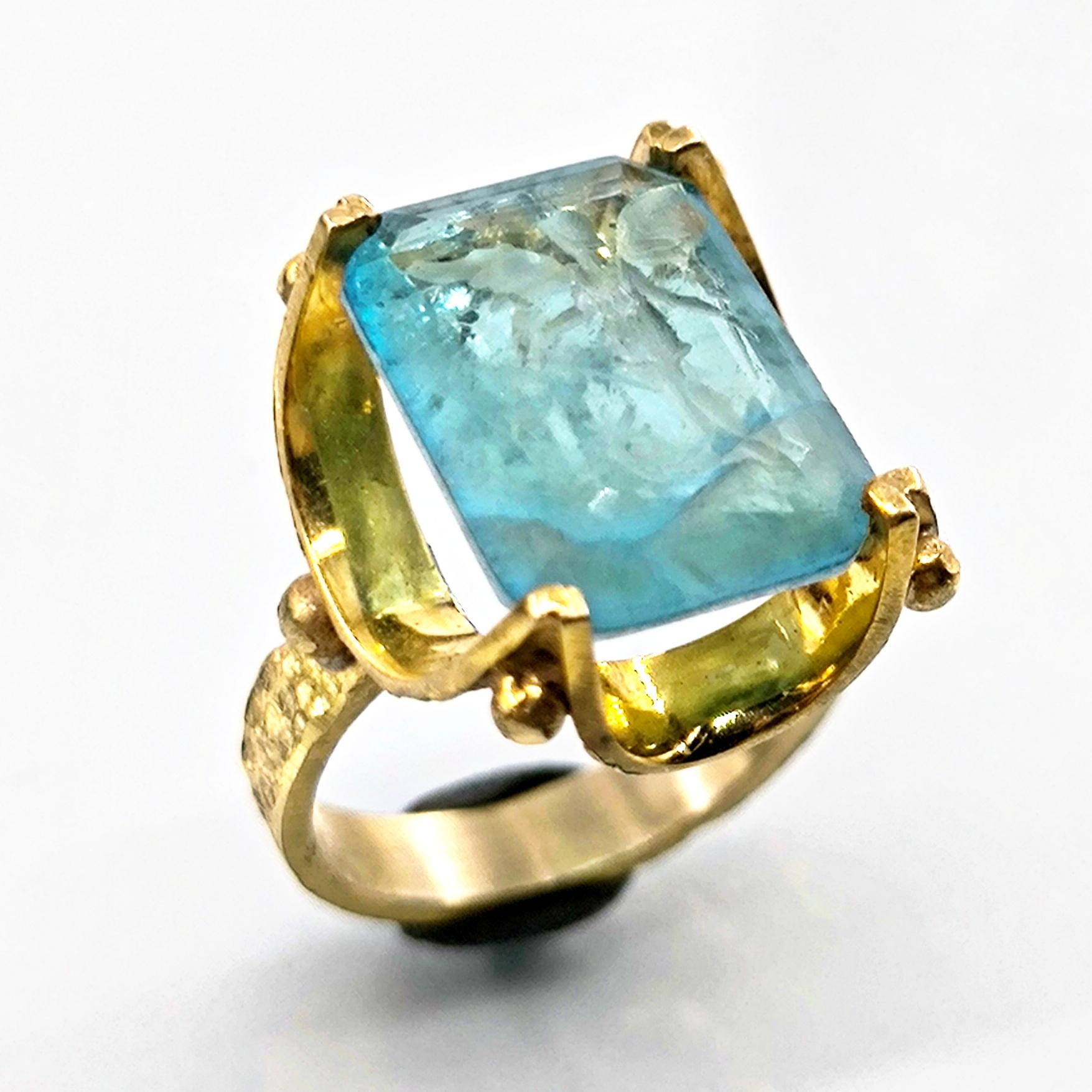 Laboratuvar üretimi paraiba taşın iç derinliğine negatif intaglio tekniğiyle oyduğumuz kanatlı tanrıça figürü, bilgelik, özgürlük ve ilahi enerjiyi temsil eder. 925 ayar gümüş üzerine uygulanan 22 ayar altın kaplama, taşın mavi ışıltısıyla birleşerek göz kamaştırıcı bir kontrast yaratır. Her detayı el işçiliğiyle tamamlanan bu yüzük, mitolojik estetik ile çağdaş zarafetin birleştiği özgün bir sanat eseridir.