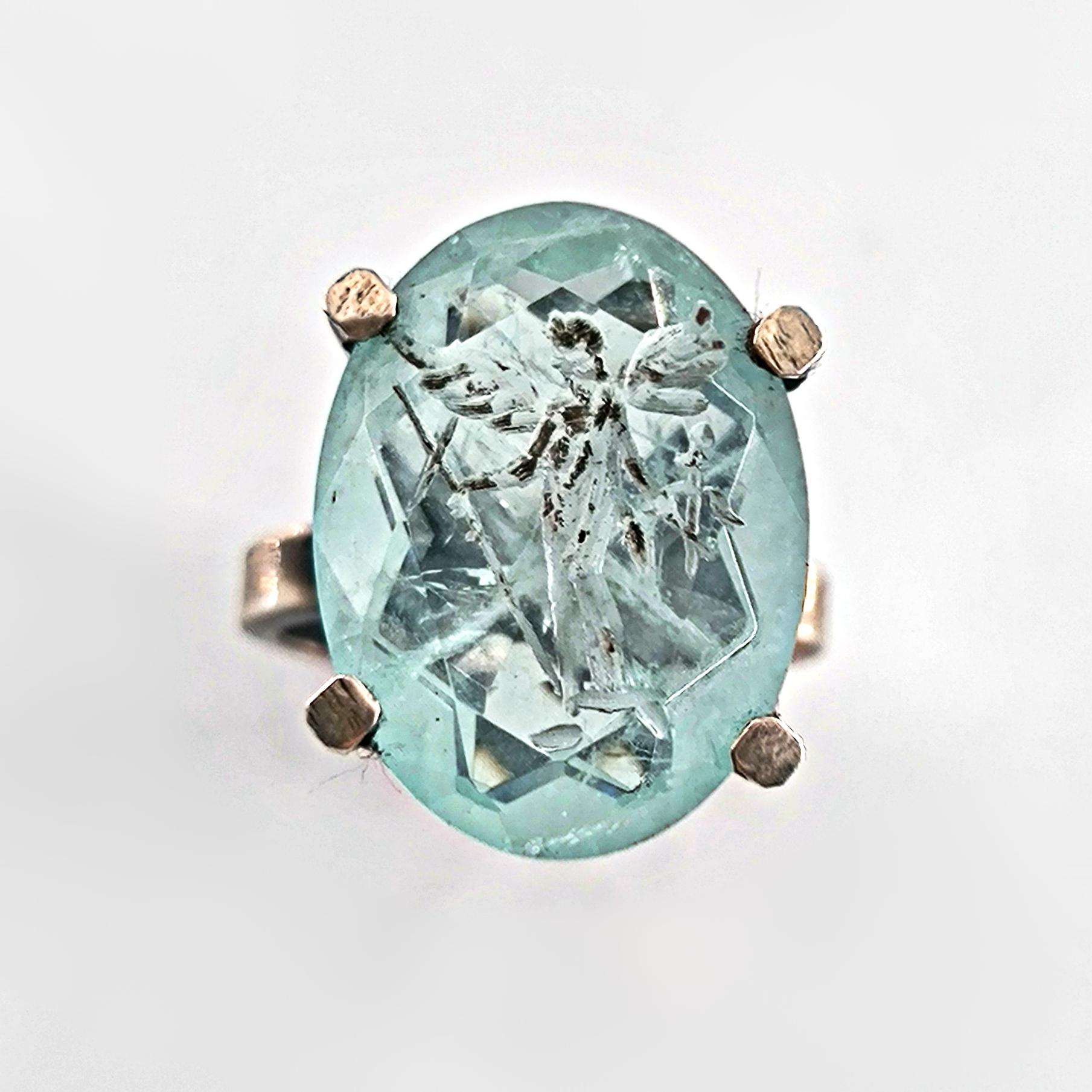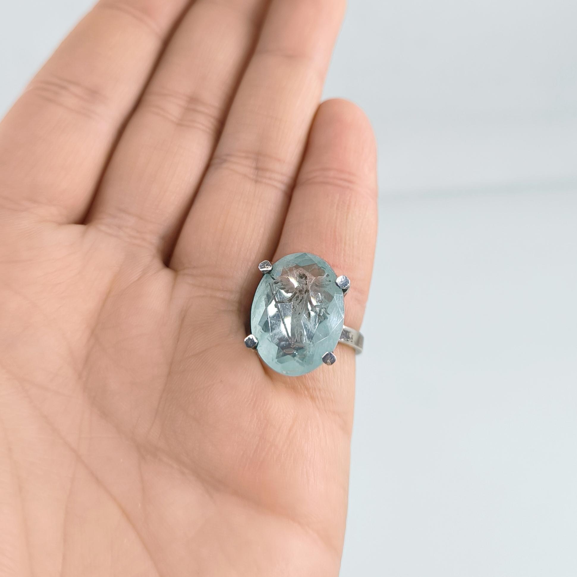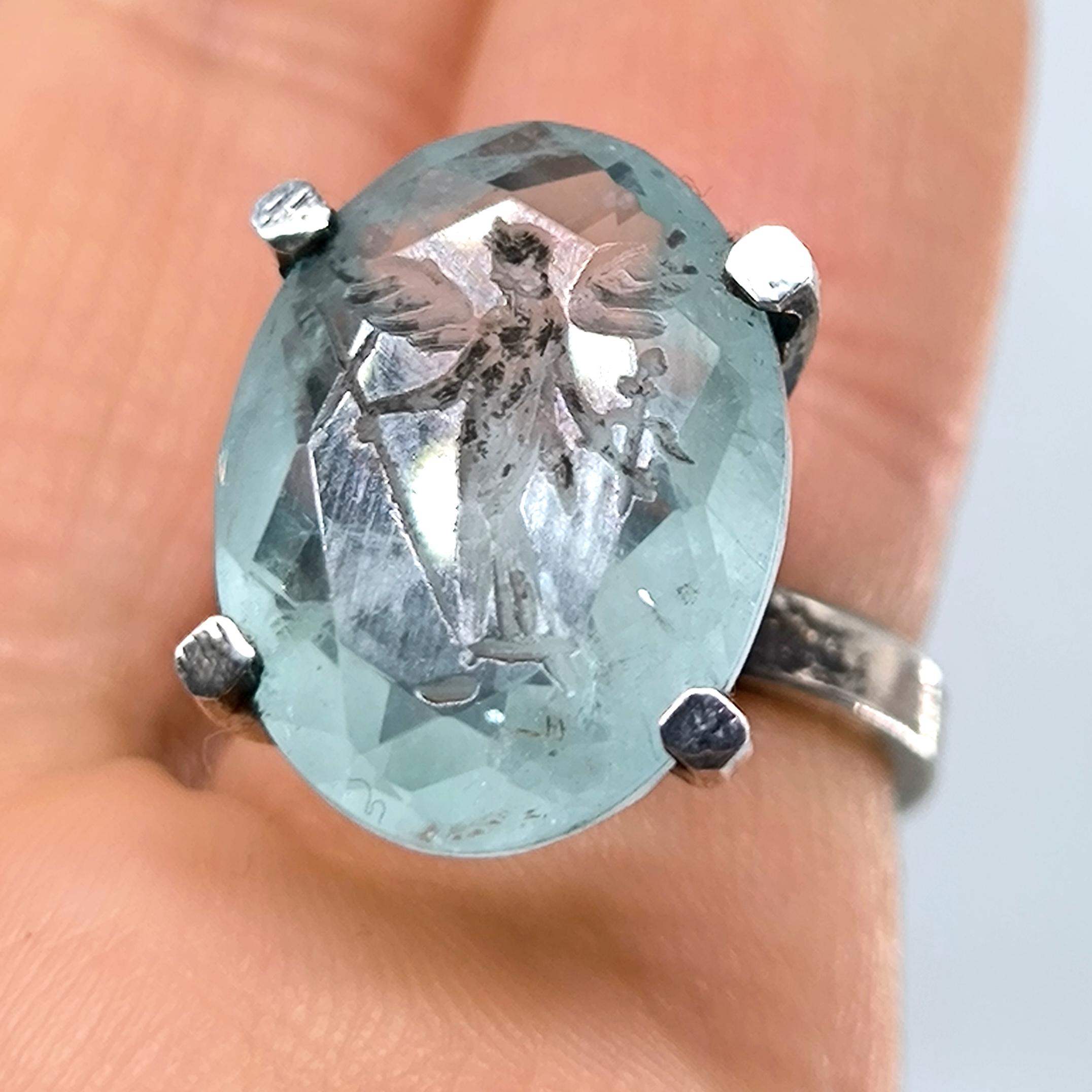 Laboratuvar üretimi paraiba taşın içine negatif intaglio tekniğiyle oyduğumuz kanatlı tanrıça, özgürlük ve ilahi rehberliği simgeler. Yüksek, açık galerili mimari kurulum ve dört pençeli kafes yapı; taşın her açıdan ışıkla dolmasını ve figürün kristal netlikte görünmesini sağlar. Tamamı 925 ayar gümüşten elde üretilen yüzük, serin turkuaz tonların modern çizgiyle buluştuğu heykelsi bir form sunar. Günlük stile incelik katan, özel anlarda ise güçlü bir imza parçası olarak öne çıkar.