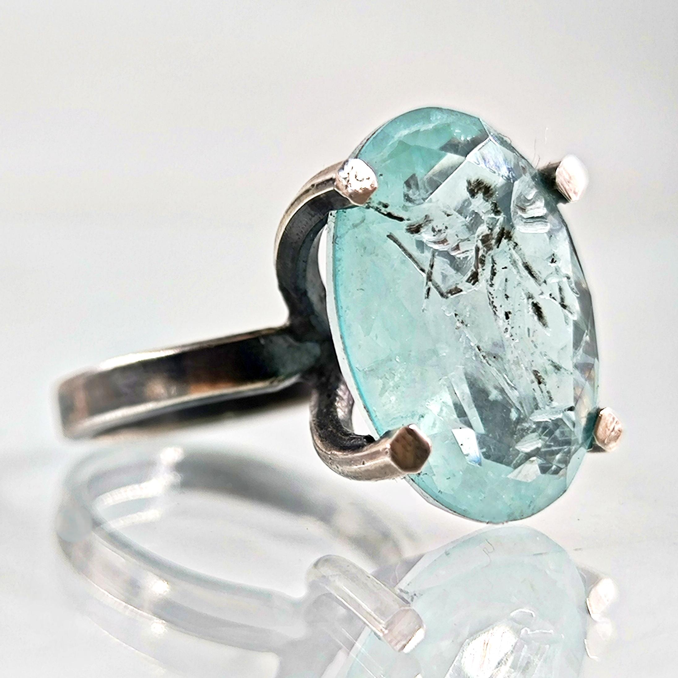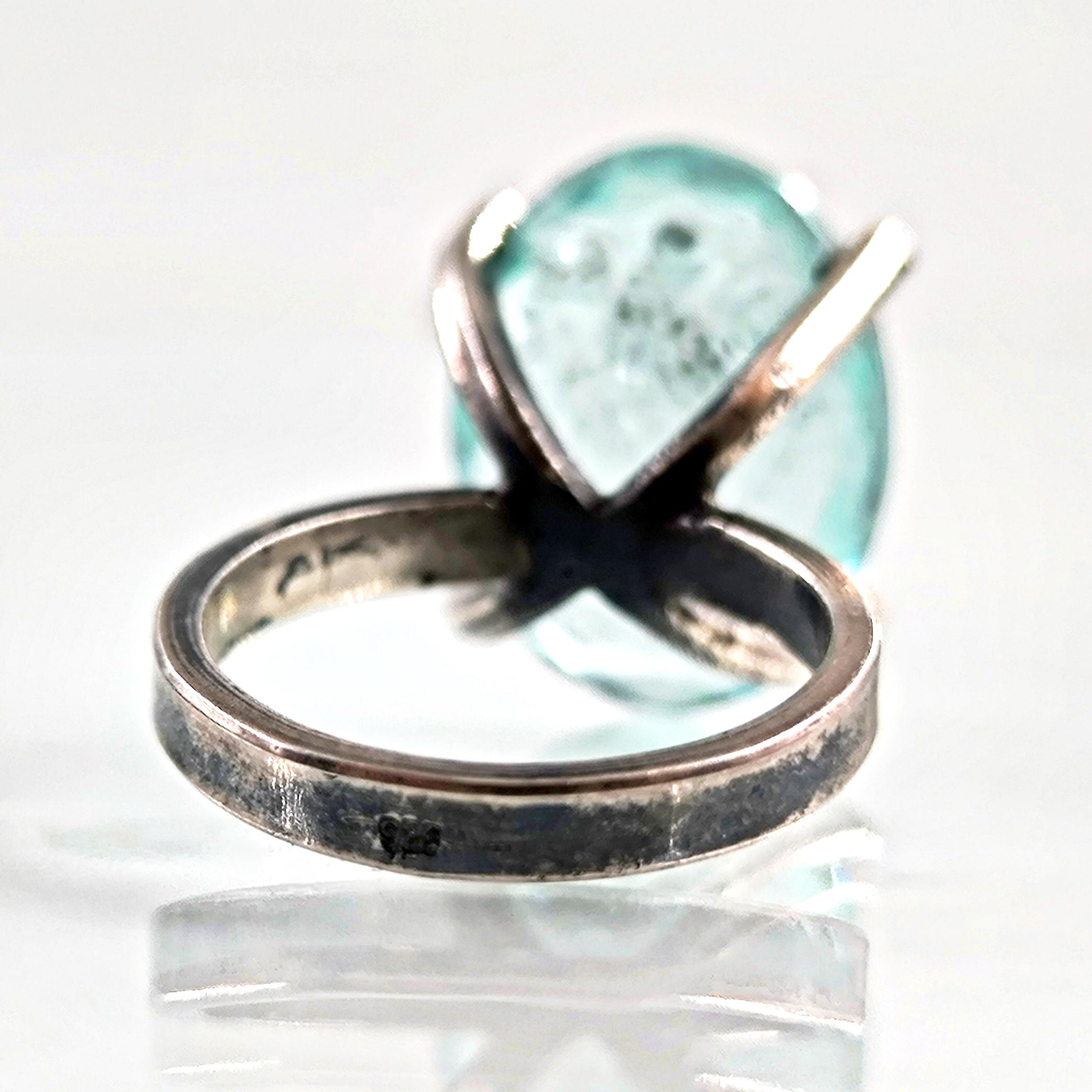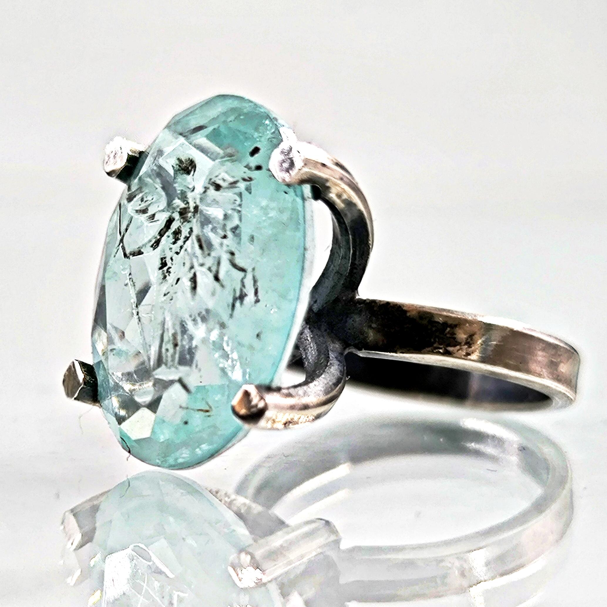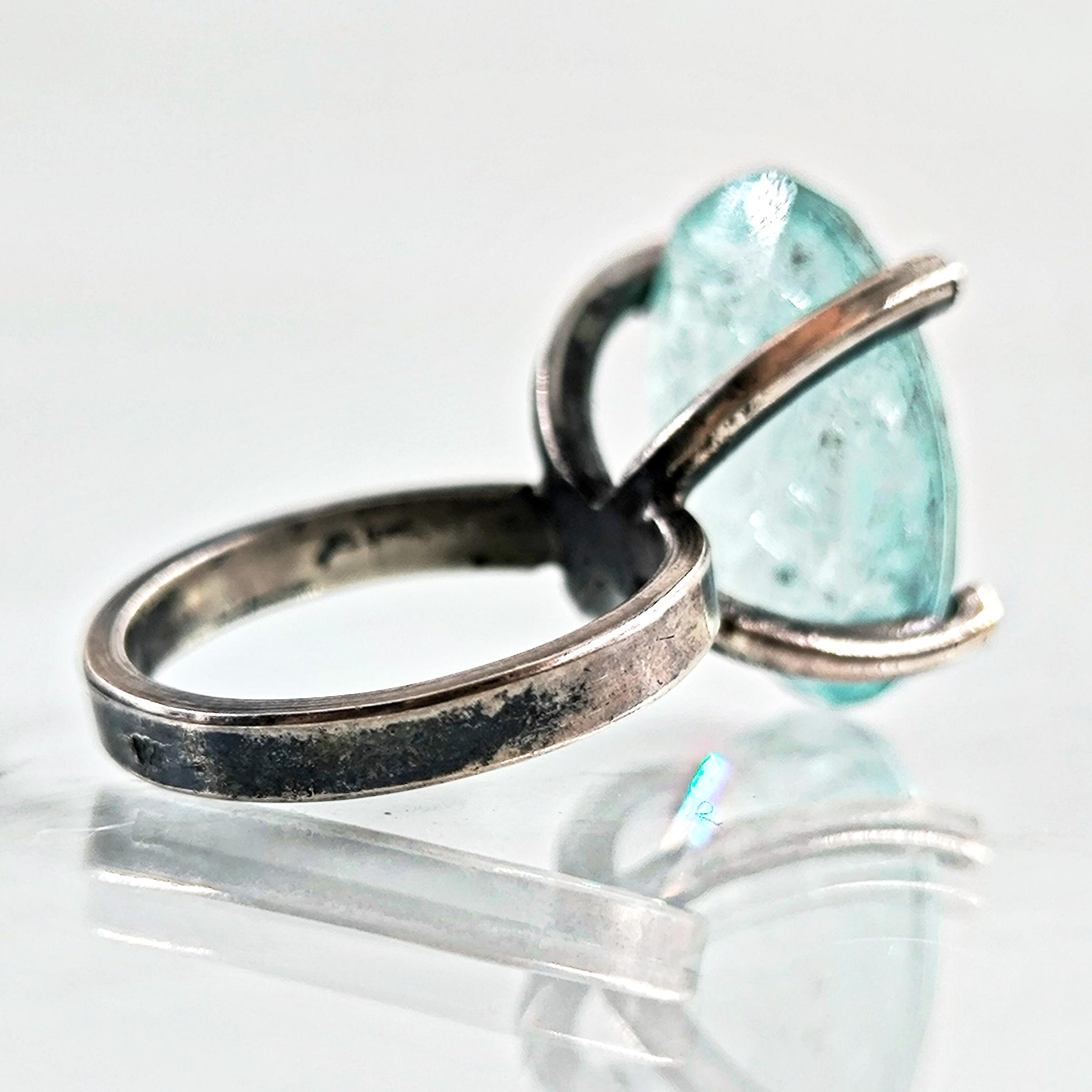 Laboratuvar üretimi paraiba taşın içine negatif intaglio tekniğiyle oyduğumuz kanatlı tanrıça, özgürlük ve ilahi rehberliği simgeler. Yüksek, açık galerili mimari kurulum ve dört pençeli kafes yapı; taşın her açıdan ışıkla dolmasını ve figürün kristal netlikte görünmesini sağlar. Tamamı 925 ayar gümüşten elde üretilen yüzük, serin turkuaz tonların modern çizgiyle buluştuğu heykelsi bir form sunar. Günlük stile incelik katan, özel anlarda ise güçlü bir imza parçası olarak öne çıkar.