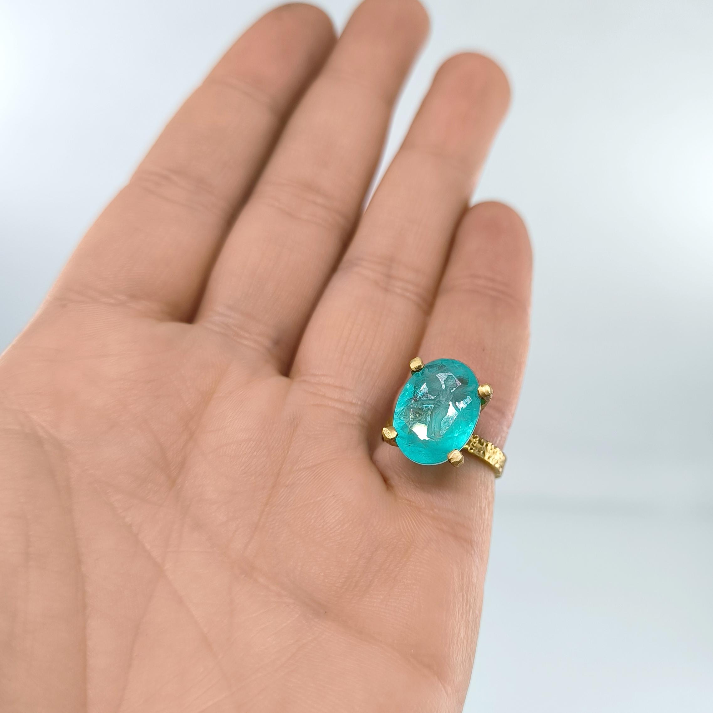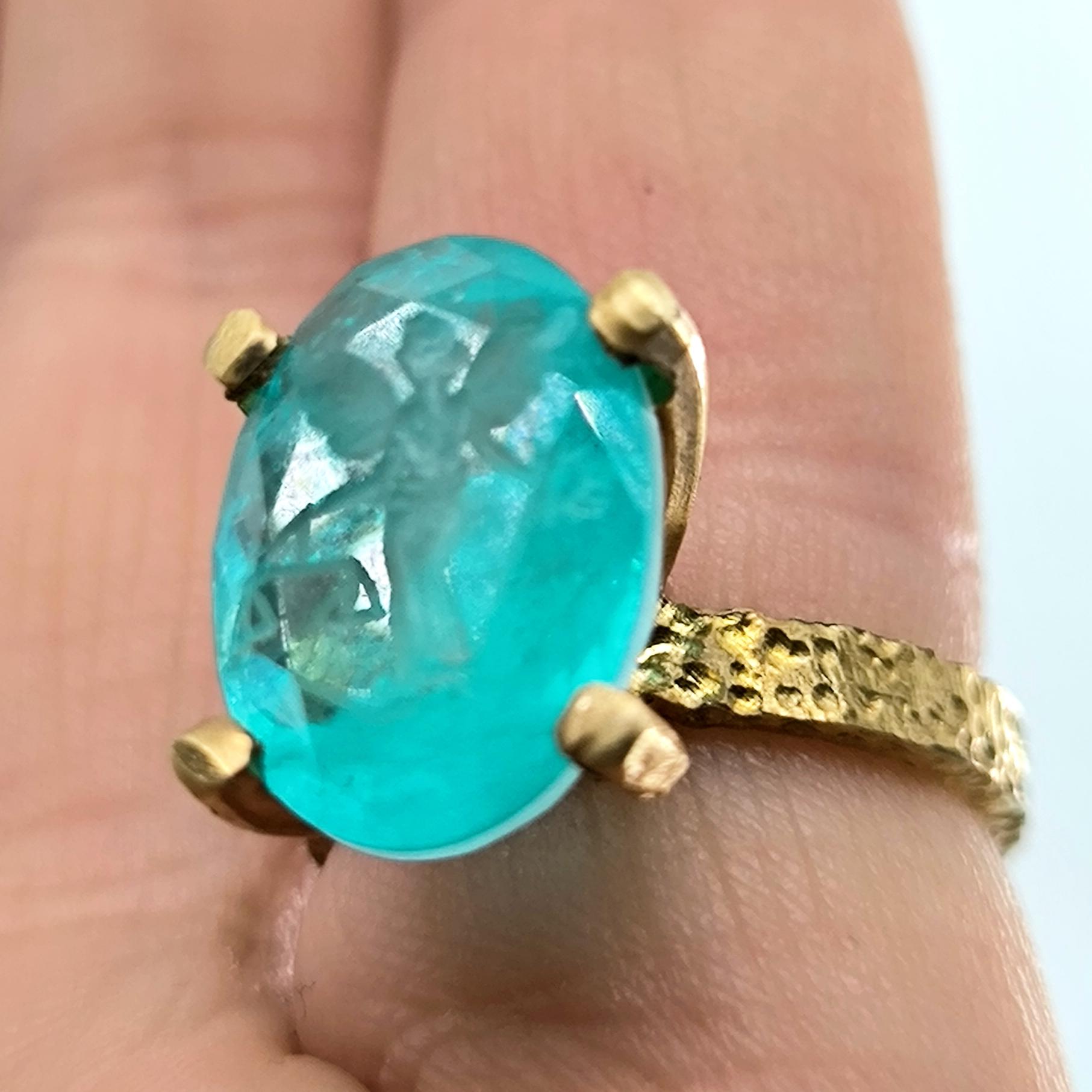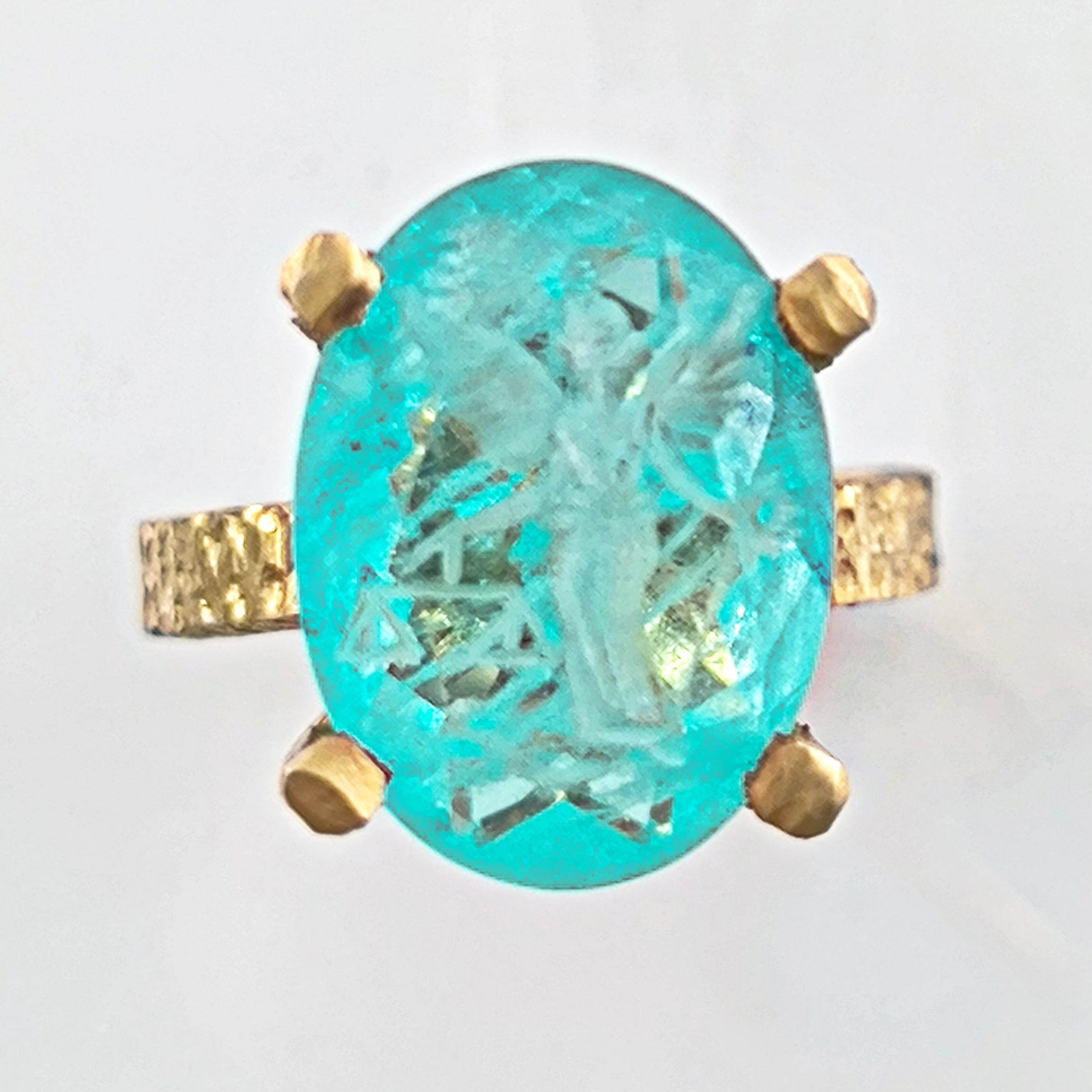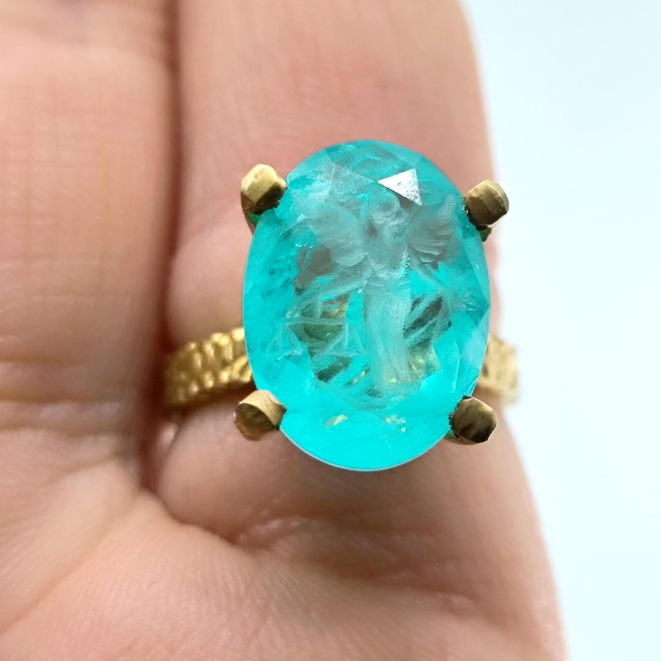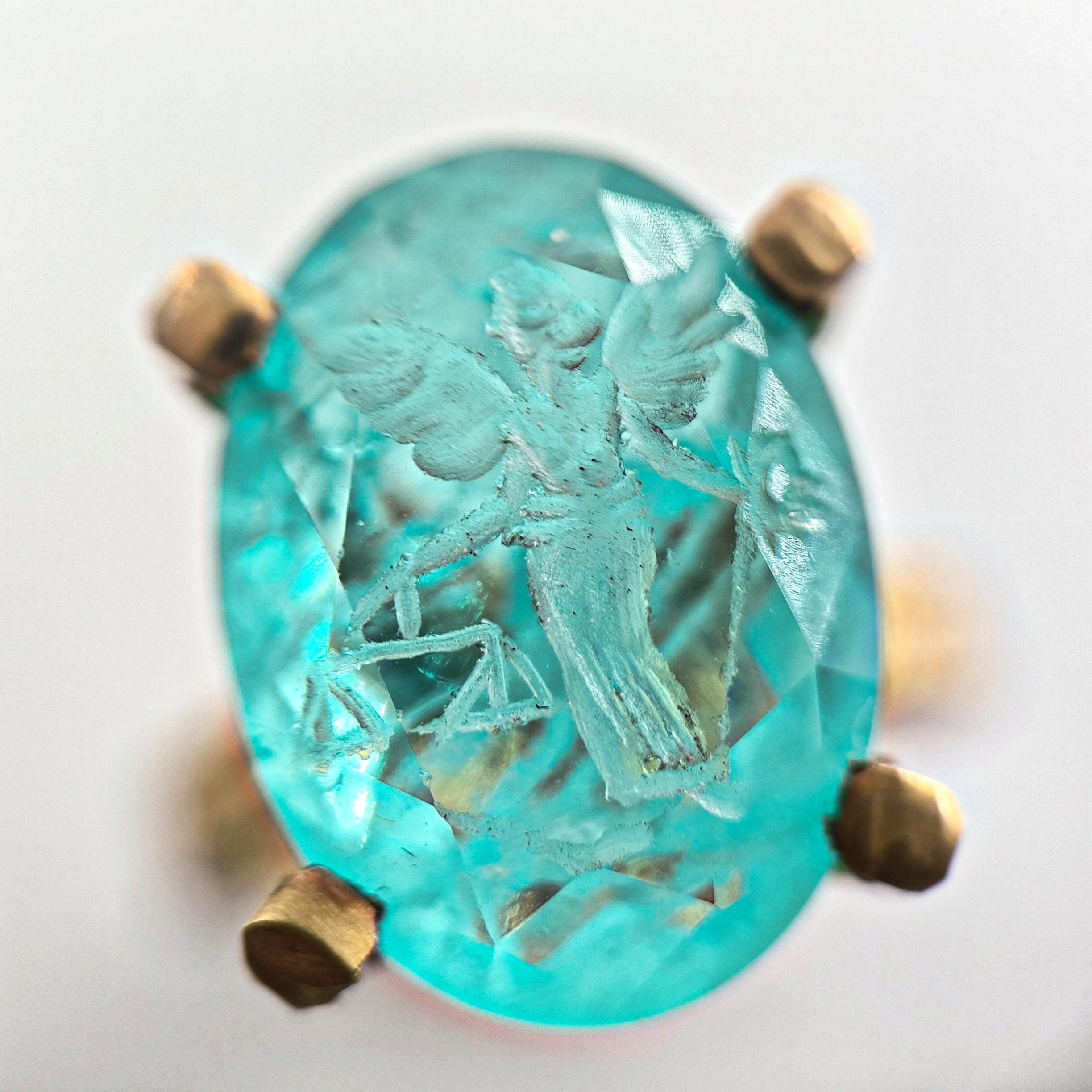 Laboratuvar üretimi paraiba taşın içine negatif intaglio tekniğiyle oyulan kanatlı tanrıça, özgürlük ve koruyucu sezgiyi simgeler. Oval taşın dört pençeli yüksek kurulumu, turkuaz derinliği ışıkla buluşturup figürü her açıdan kristal netlikte ortaya çıkarır. Çekiç dokulu bant ve heykelsi pençeler, el işçiliği karakterini güçlendirir. 925 ayar gümüş gövde, altın kaplama dokunuşla modern bir ihtişama kavuşur; günün her saatinde güçlü bir imza parçasıdır.