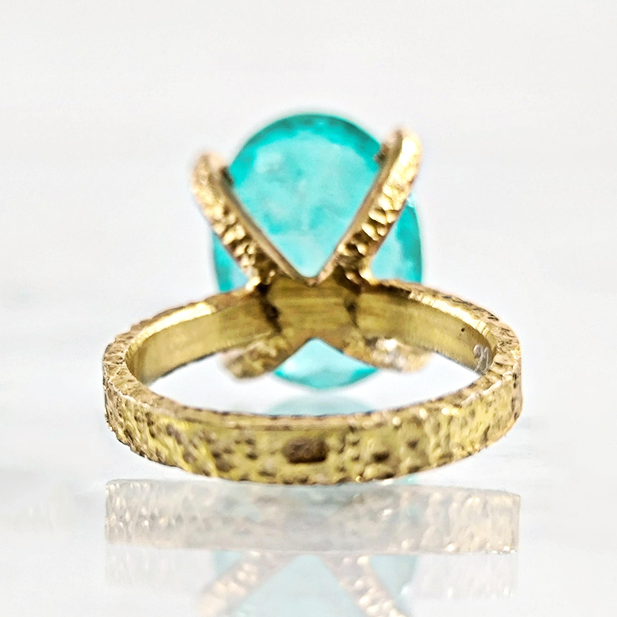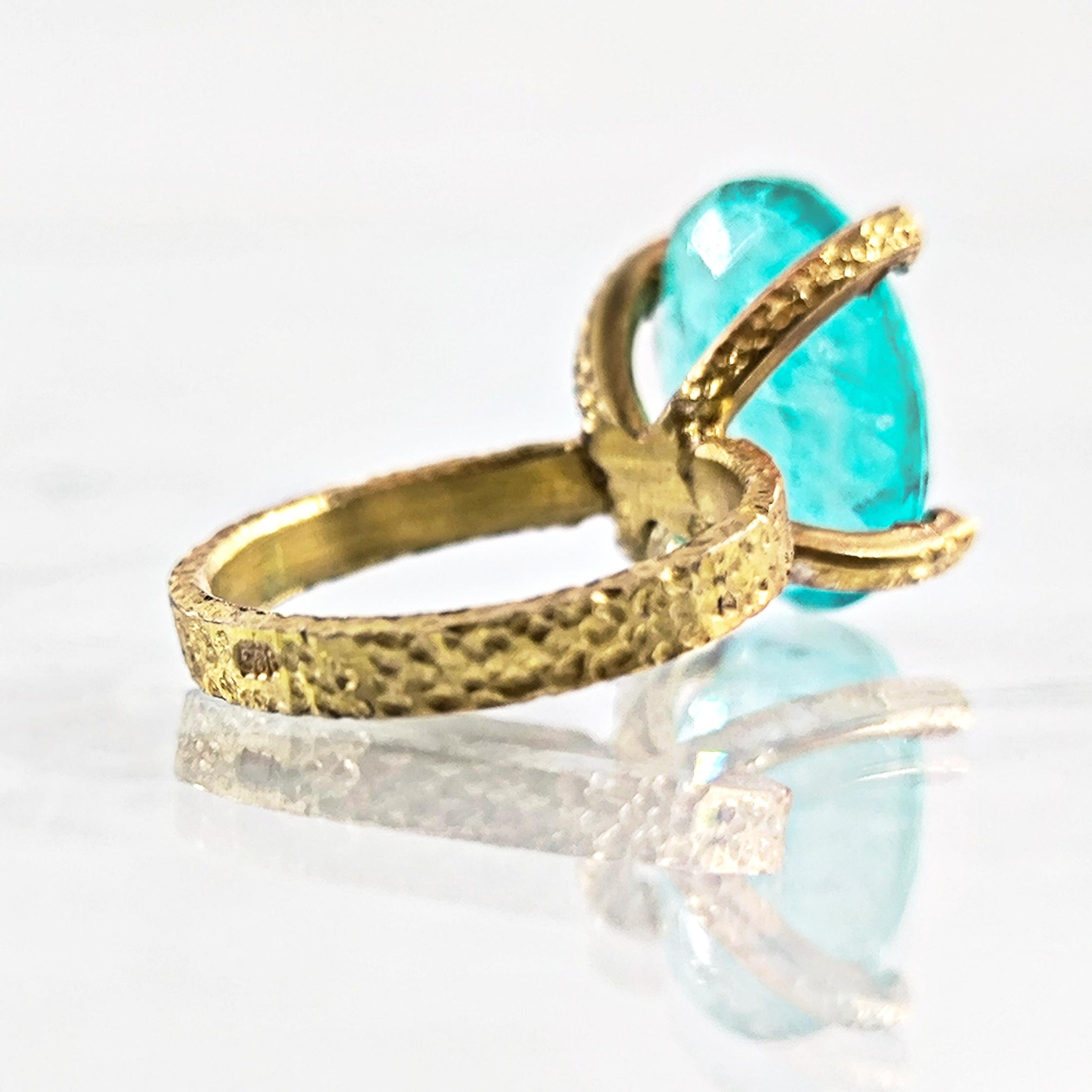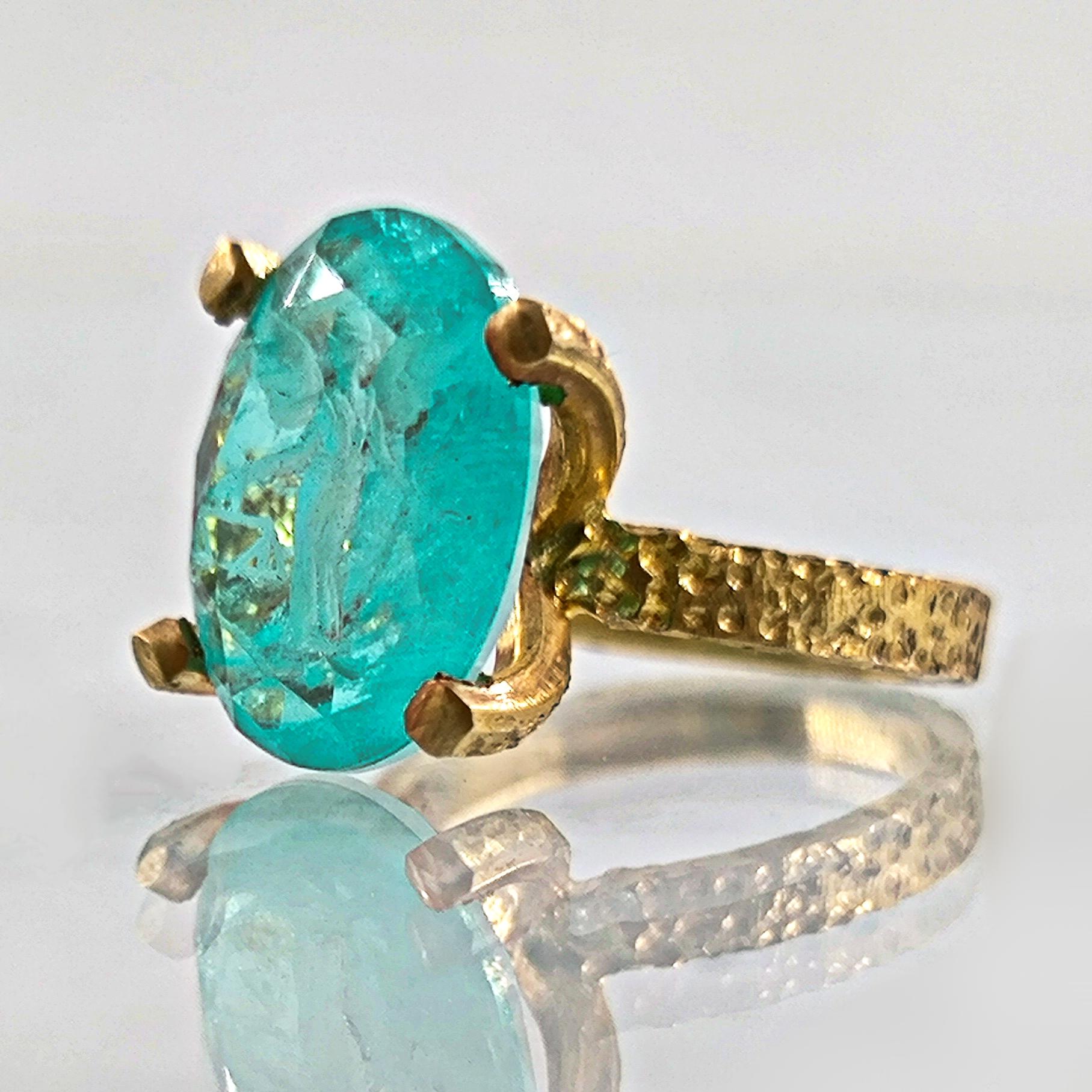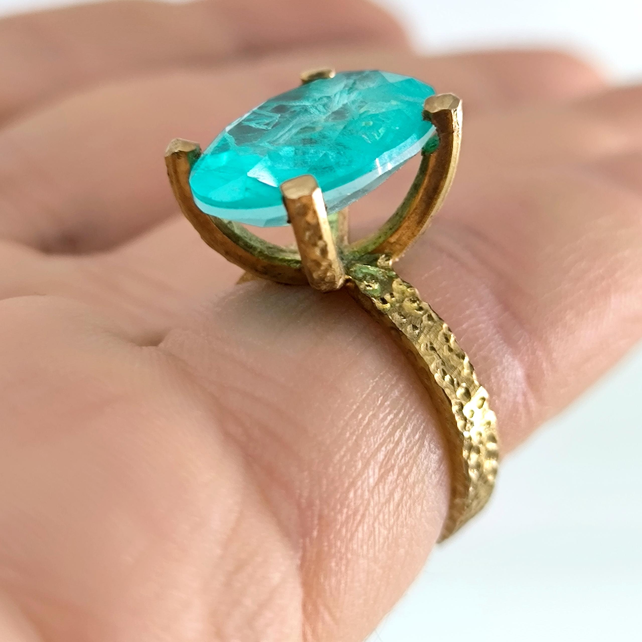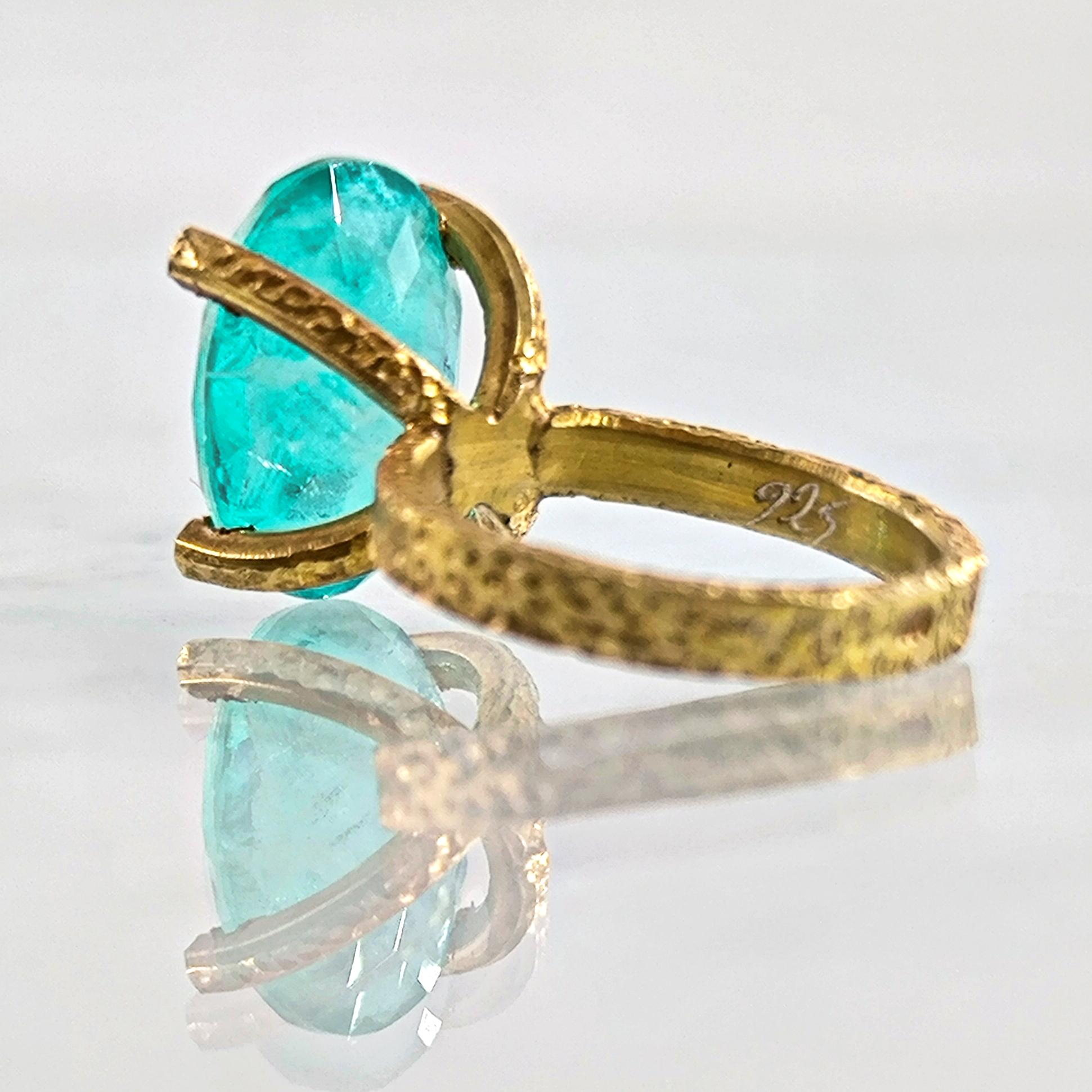 Laboratuvar üretimi paraiba taşın içine negatif intaglio tekniğiyle oyulan kanatlı tanrıça, özgürlük ve koruyucu sezgiyi simgeler. Oval taşın dört pençeli yüksek kurulumu, turkuaz derinliği ışıkla buluşturup figürü her açıdan kristal netlikte ortaya çıkarır. Çekiç dokulu bant ve heykelsi pençeler, el işçiliği karakterini güçlendirir. 925 ayar gümüş gövde, altın kaplama dokunuşla modern bir ihtişama kavuşur; günün her saatinde güçlü bir imza parçasıdır.