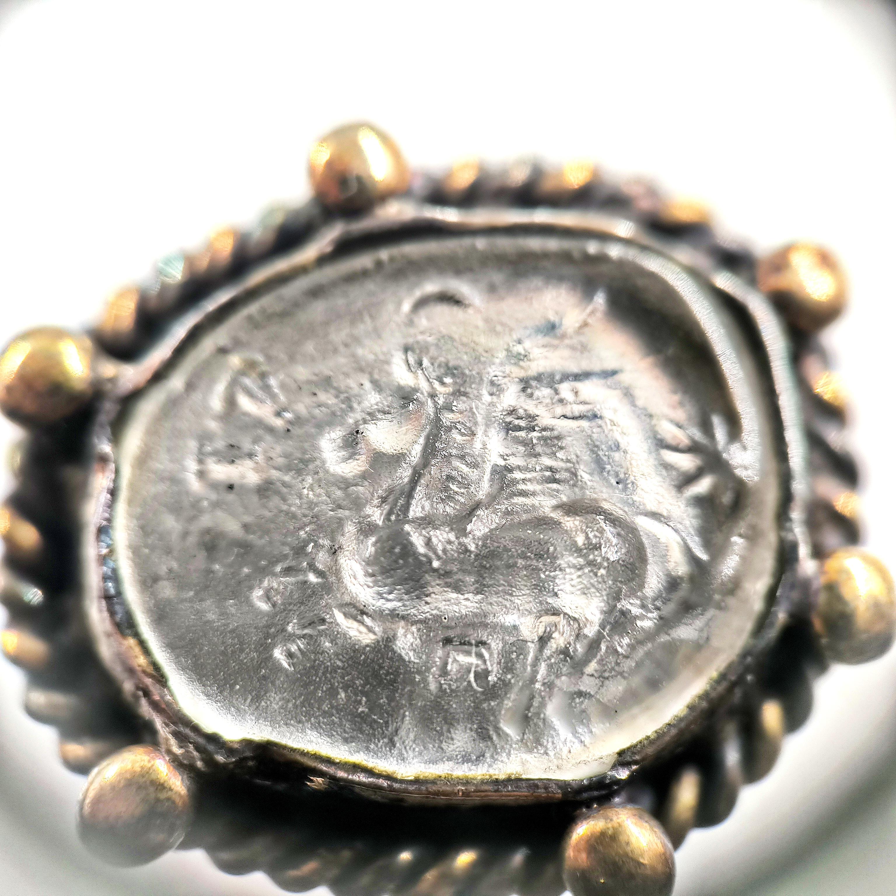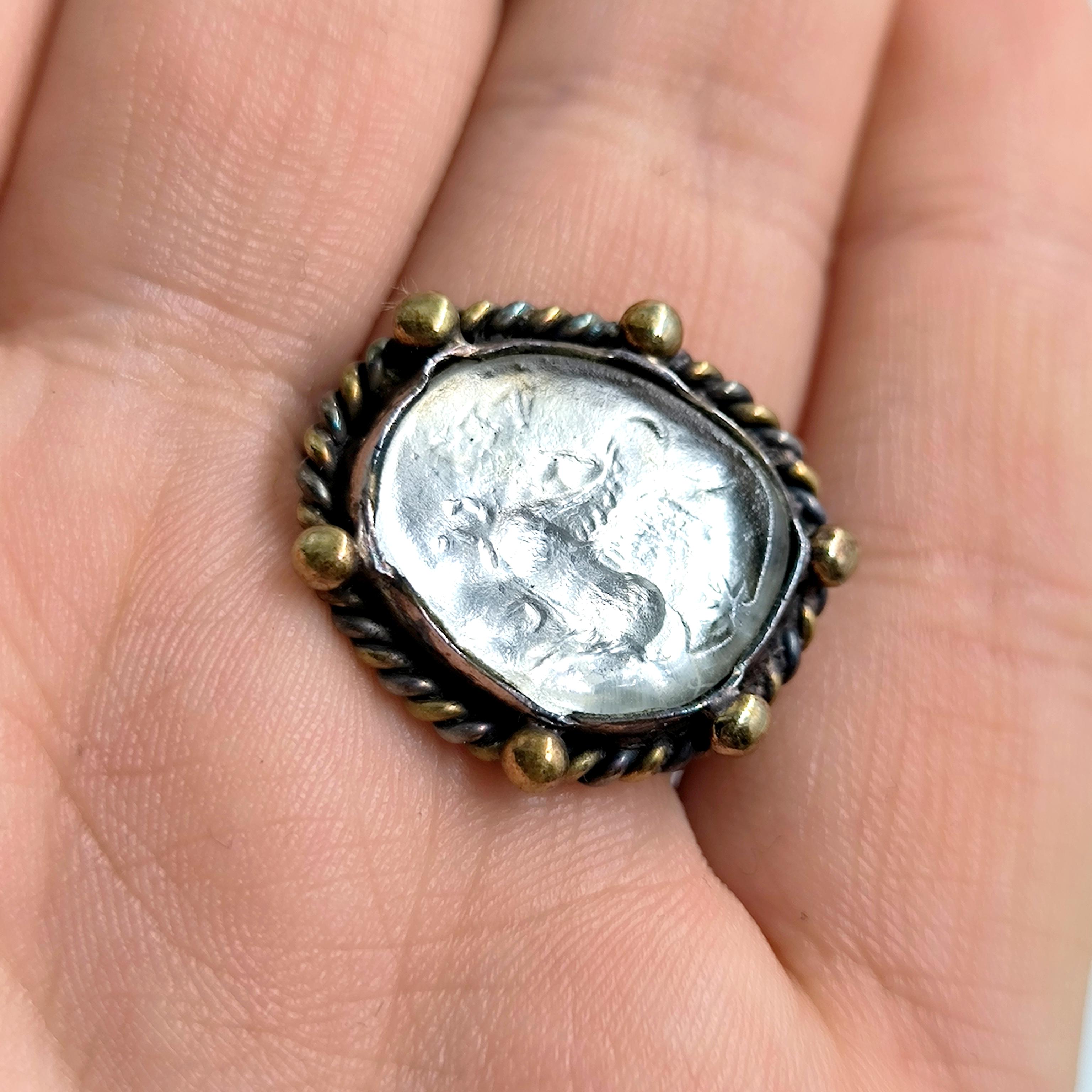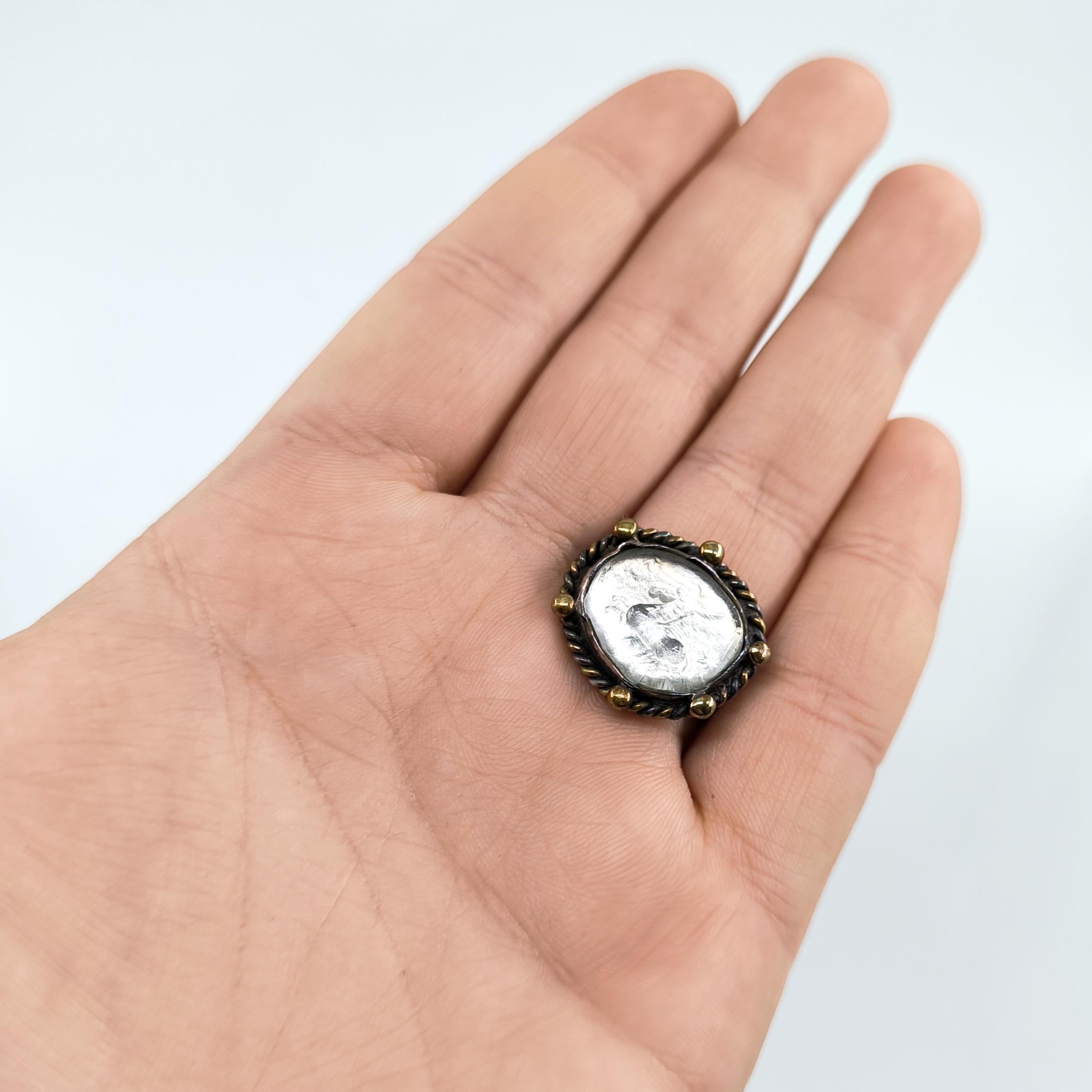 925 ayar gümüşten ustalıkla şekillendirilmiş bu yüzüğün merkezinde, efsanelerin kanatlı atı Pegasus’un kabartması yer alıyor. Taş kısmı, kendi özel pres tekniğimle şekillendirdiğim camdan oluşturuldu ve arkasına eklediğim foya sayesinde gümüşvari, yanar dönerli bir parlaklığa kavuştu. Çevresini saran bronz toplar ve antikleştirilmiş dokusu, yüzüğe zamansız bir karakter kazandırırken mitolojik ihtişamı modern bir sanat eseri gibi parmaklara taşıyor.
