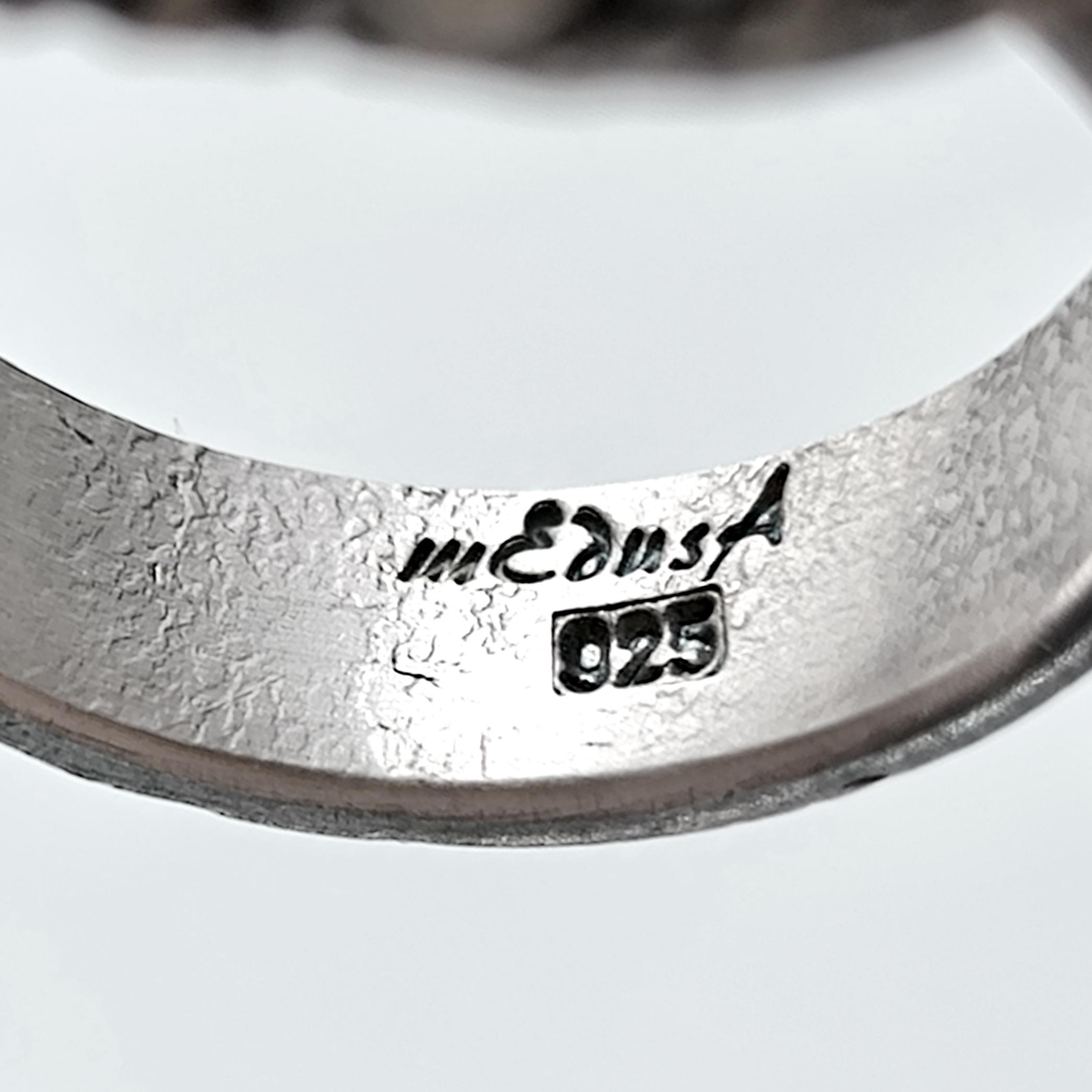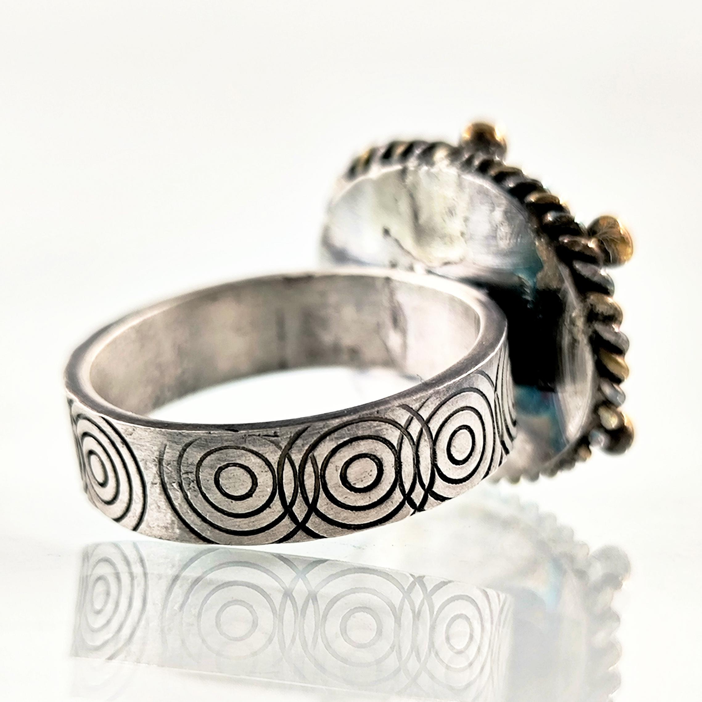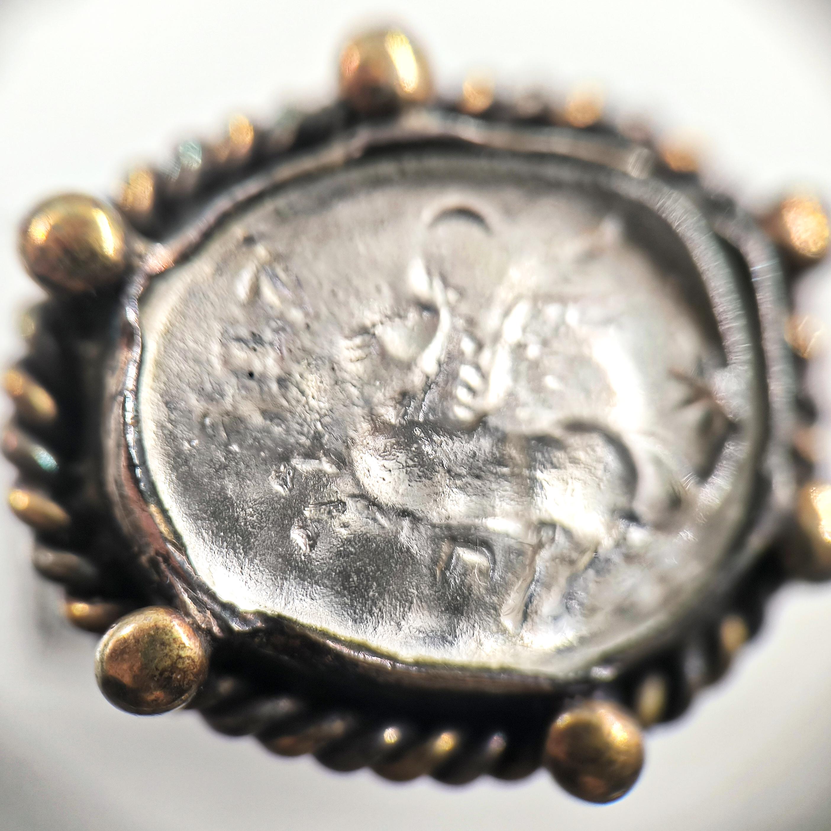 925 ayar gümüşten ustalıkla şekillendirilmiş bu yüzüğün merkezinde, efsanelerin kanatlı atı Pegasus’un kabartması yer alıyor. Taş kısmı, kendi özel pres tekniğimle şekillendirdiğim camdan oluşturuldu ve arkasına eklediğim foya sayesinde gümüşvari, yanar dönerli bir parlaklığa kavuştu. Çevresini saran bronz toplar ve antikleştirilmiş dokusu, yüzüğe zamansız bir karakter kazandırırken mitolojik ihtişamı modern bir sanat eseri gibi parmaklara taşıyor.