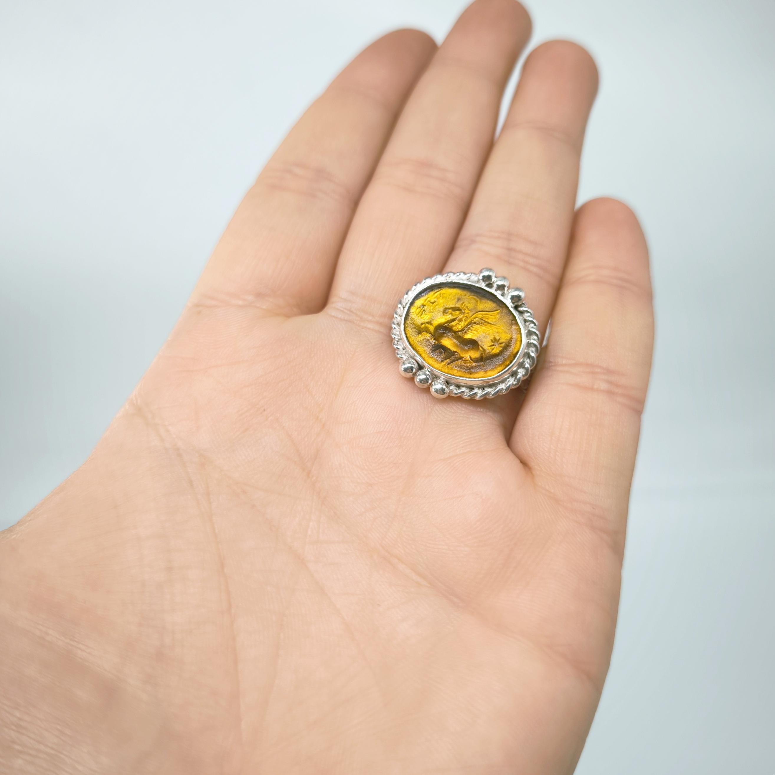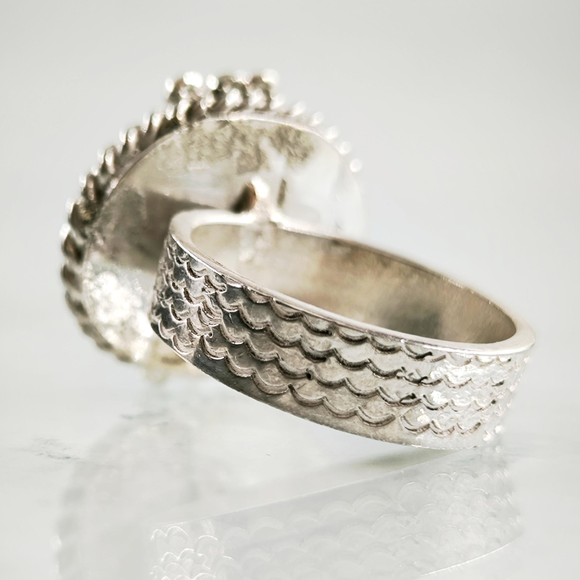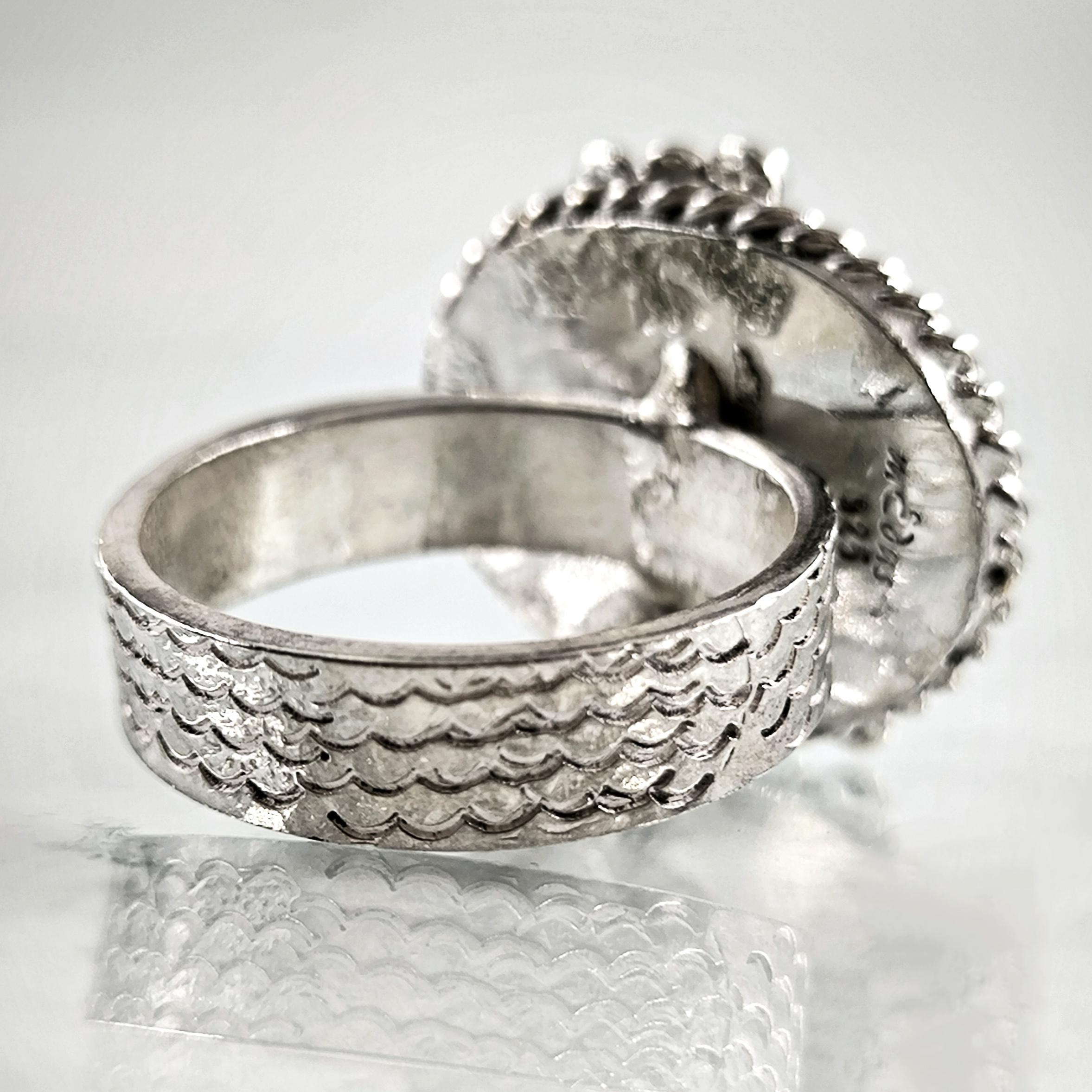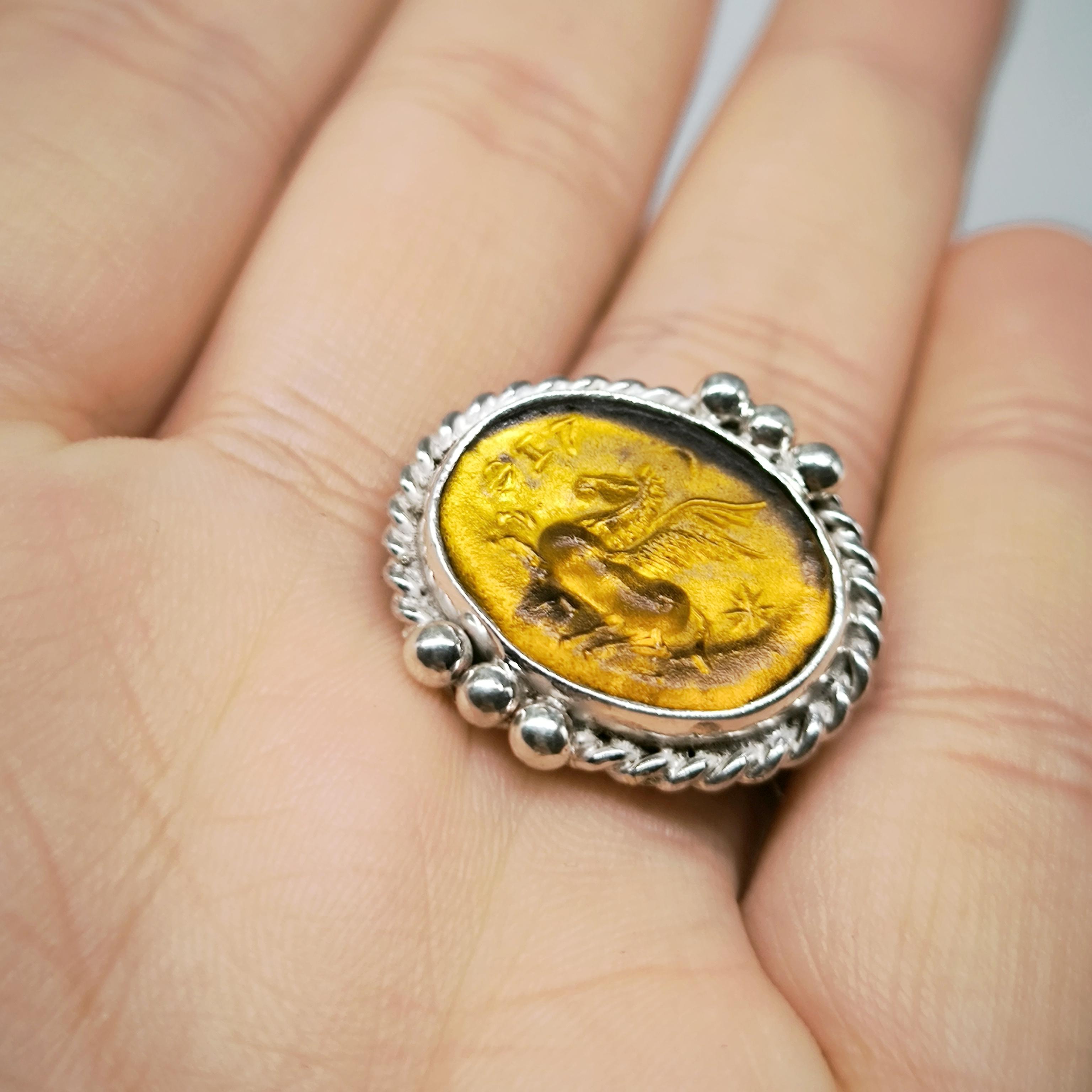 925 ayar gümüş üzerine, özel pres tekniğimle şekillendirdiğim cam yüzeyde mitolojik kanatlı at Pegasus figürü yer alıyor. Antik efsanelerin ilhamıyla işlediğim bu tasarım, camın arkasına eklediğim özel foya sayesinde ışıkla buluştuğunda janjanlı ve büyüleyici bir derinlik kazanıyor. Gücün, özgürlüğün ve ilhamın sembolü olan bu parça; koleksiyon değeri ve estetik gücüyle öne çıkıyor.