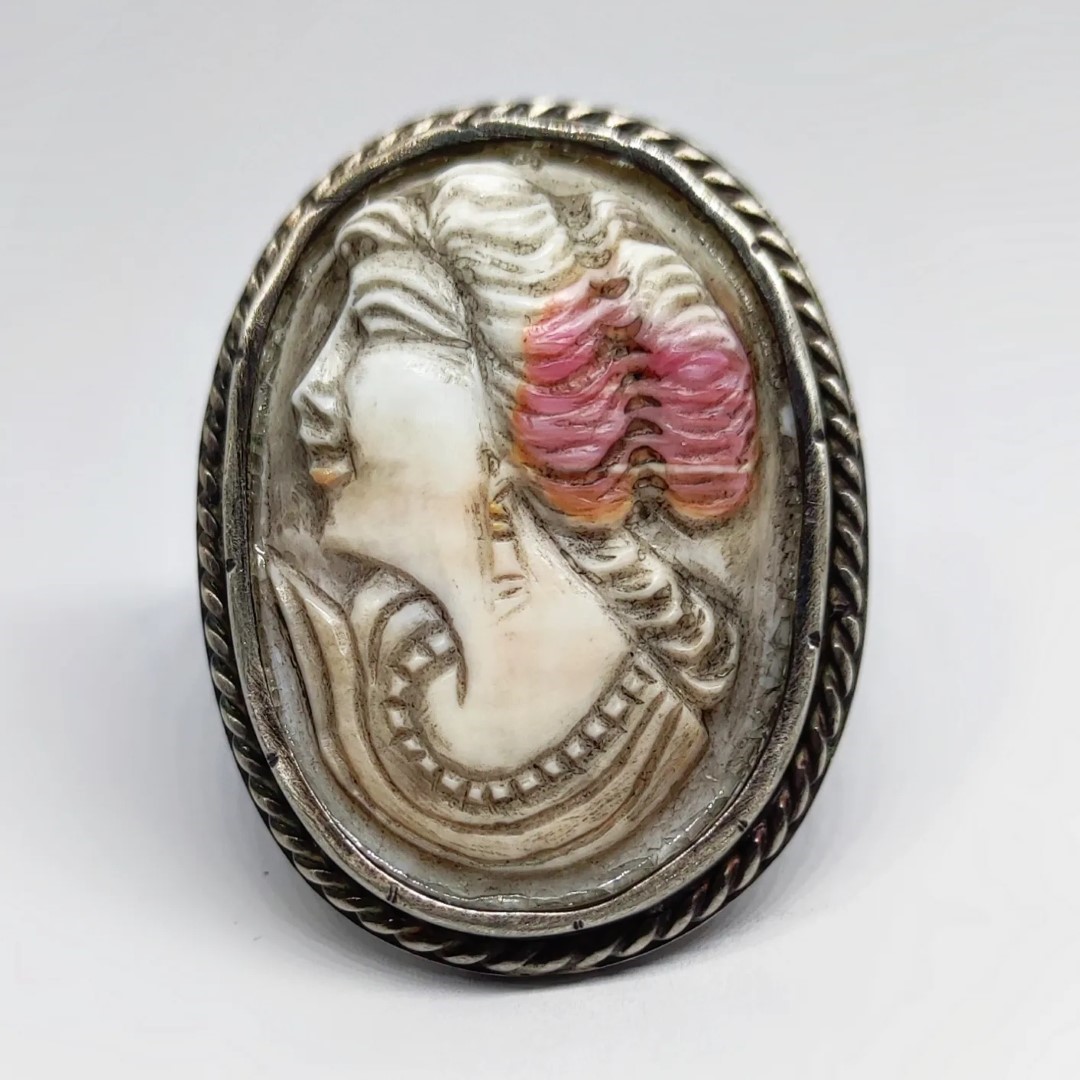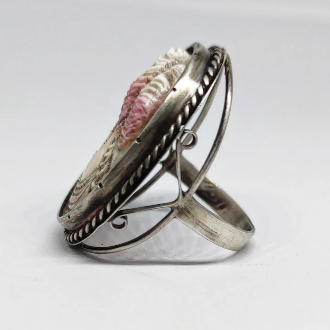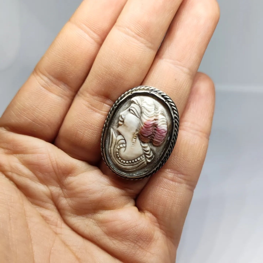 Alışılmışın dışında Pembe & beyaz renkli Deniz kabuğu Üzerine "Leydi" kabartması çalışılmış, Eski Avrupa yapımı gerçek bir Antika mücevher! Çerçevesi kendi tasarımımız olan Gümüş Cameo yüzüğümüz! (Ölçü 16)