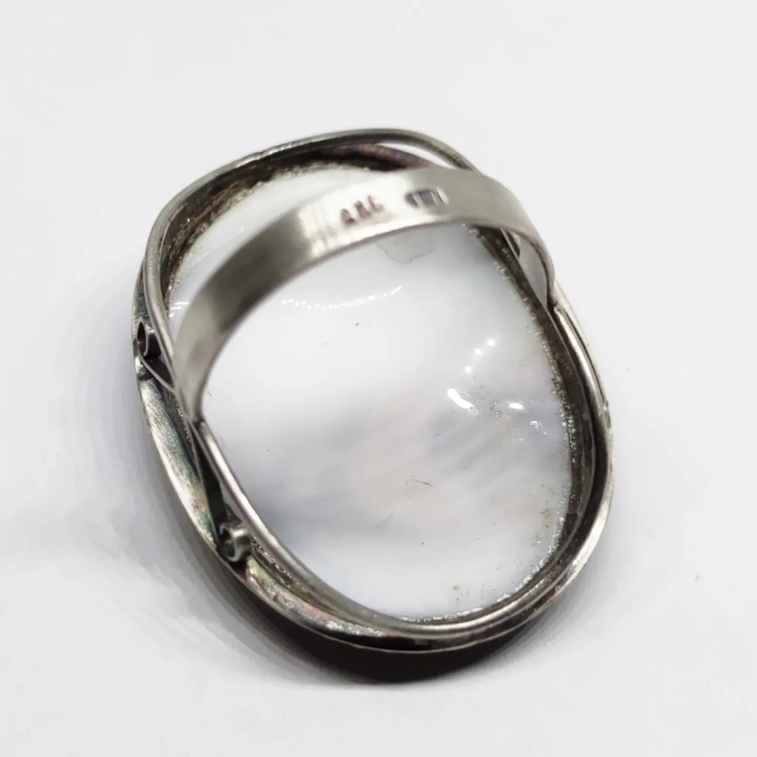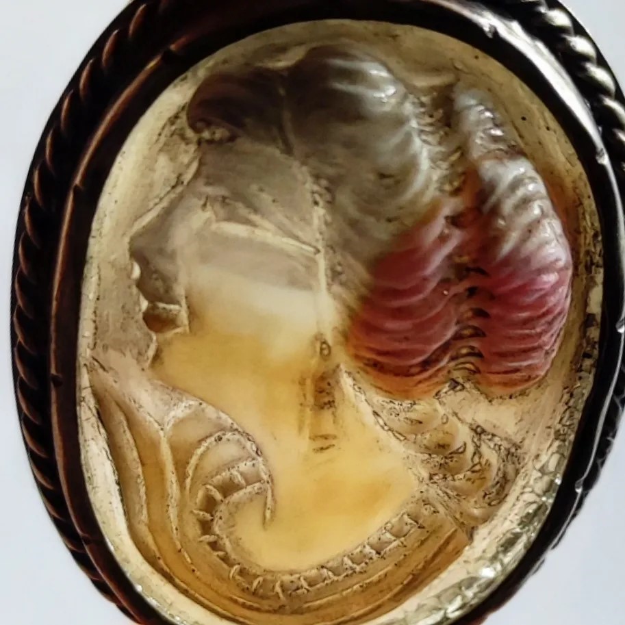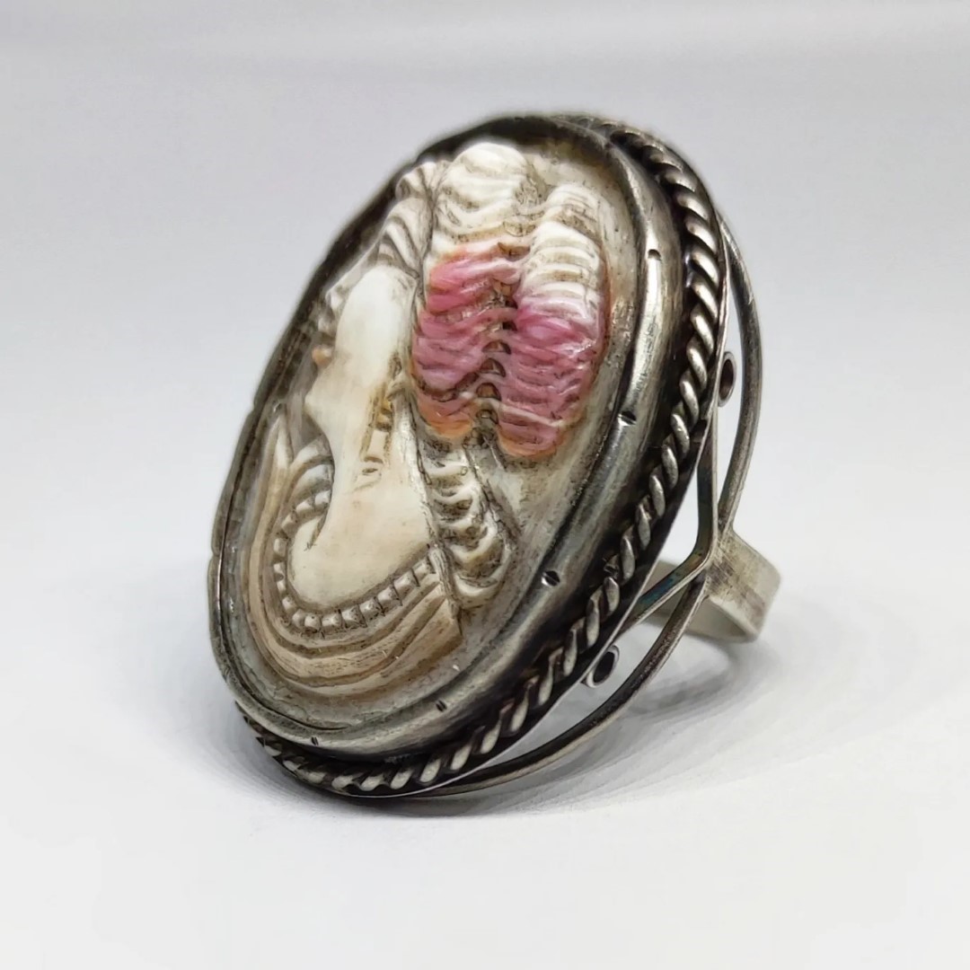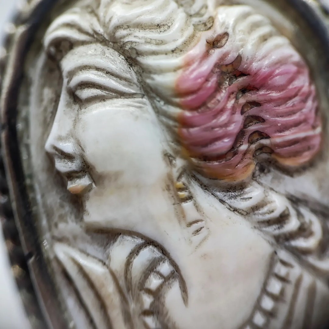 Alışılmışın dışında Pembe & beyaz renkli Deniz kabuğu Üzerine "Leydi" kabartması çalışılmış, Eski Avrupa yapımı gerçek bir Antika mücevher! Çerçevesi kendi tasarımımız olan Gümüş Cameo yüzüğümüz! (Ölçü 16)