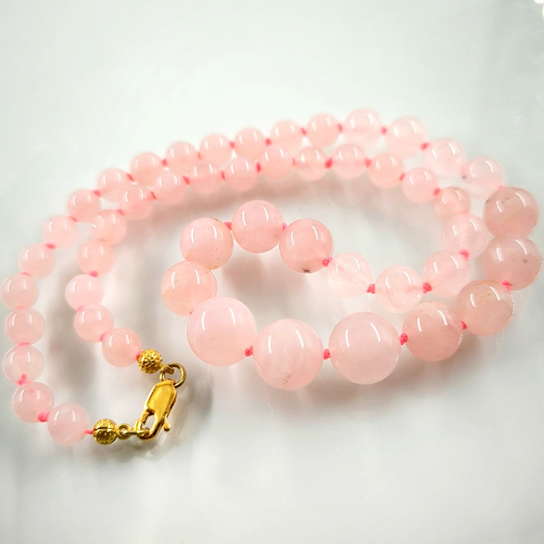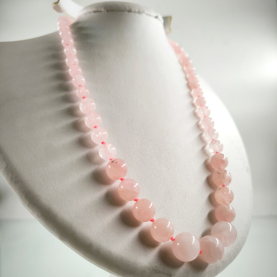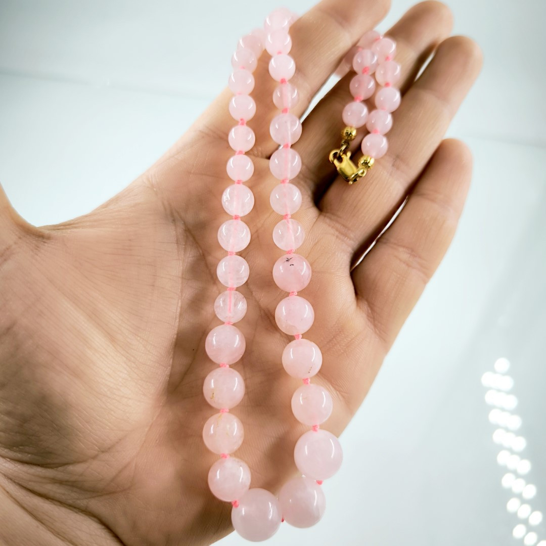 Tüm habbeler yüksek kalitede olup süzme formda tasarlanmış, Klip kısmı tamamen gümüş ve üzeri 22k Altın kaplama olan eşsiz güzellikte bir Doğaltaş Pembe Kuvars gerdanlık!