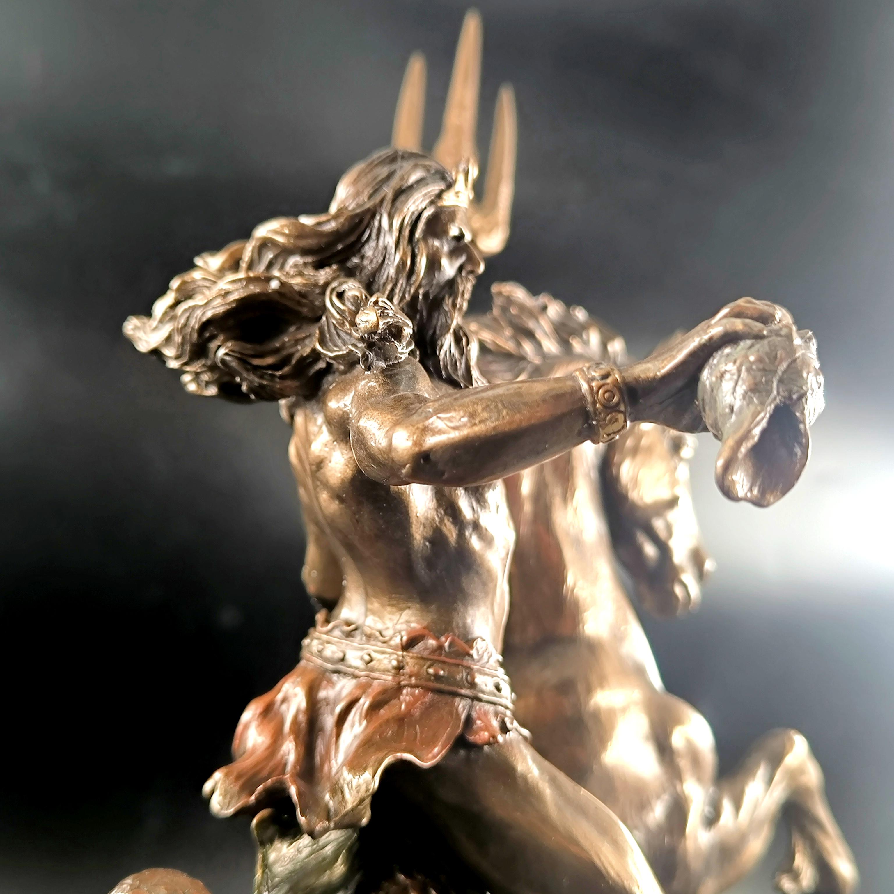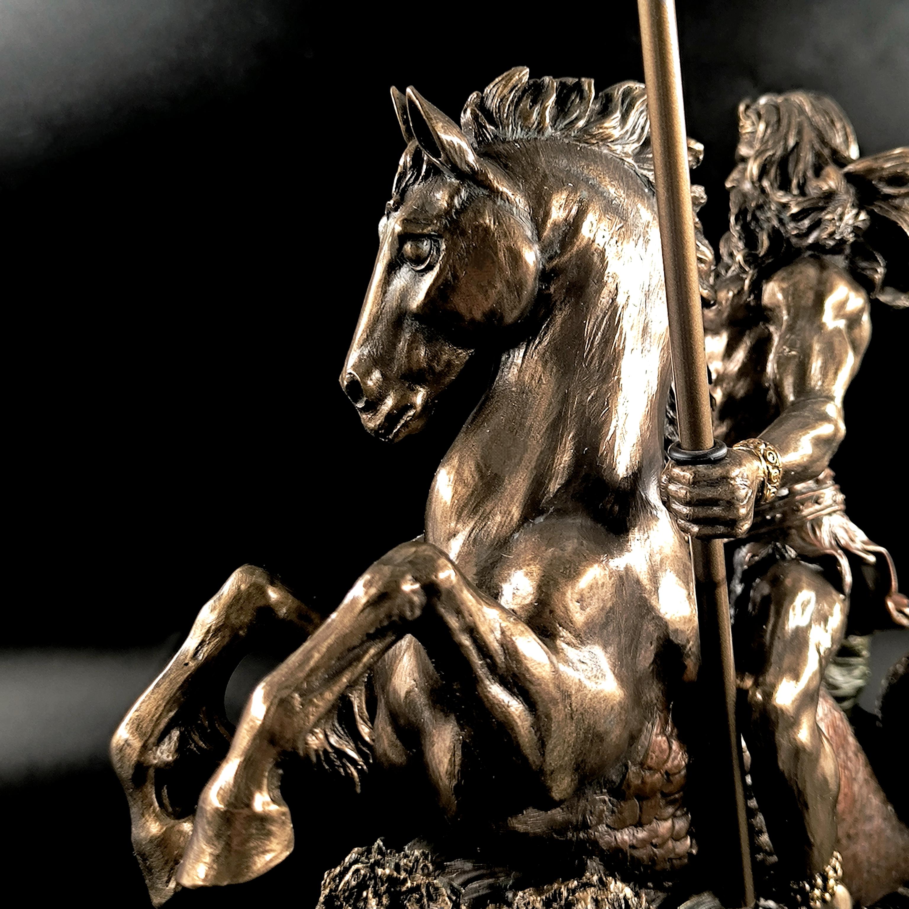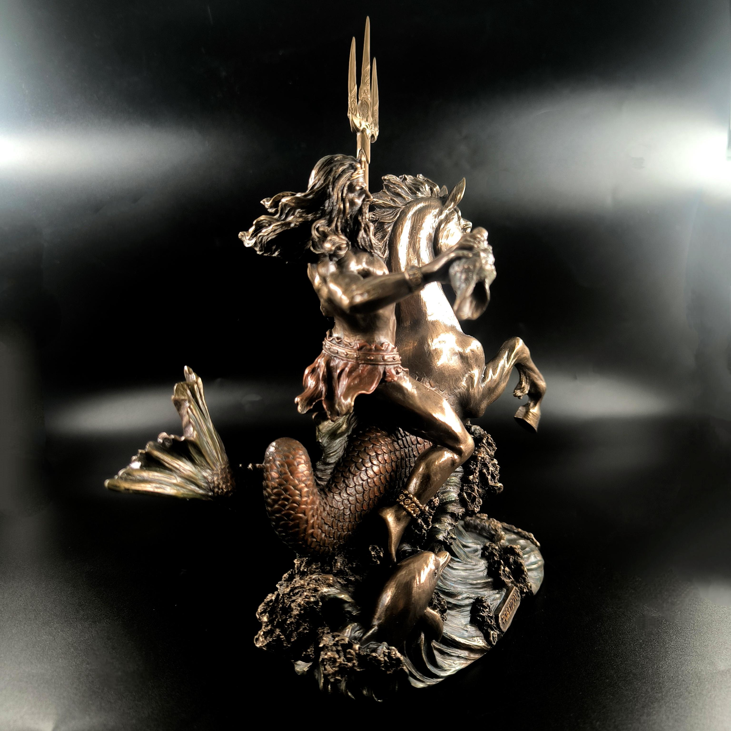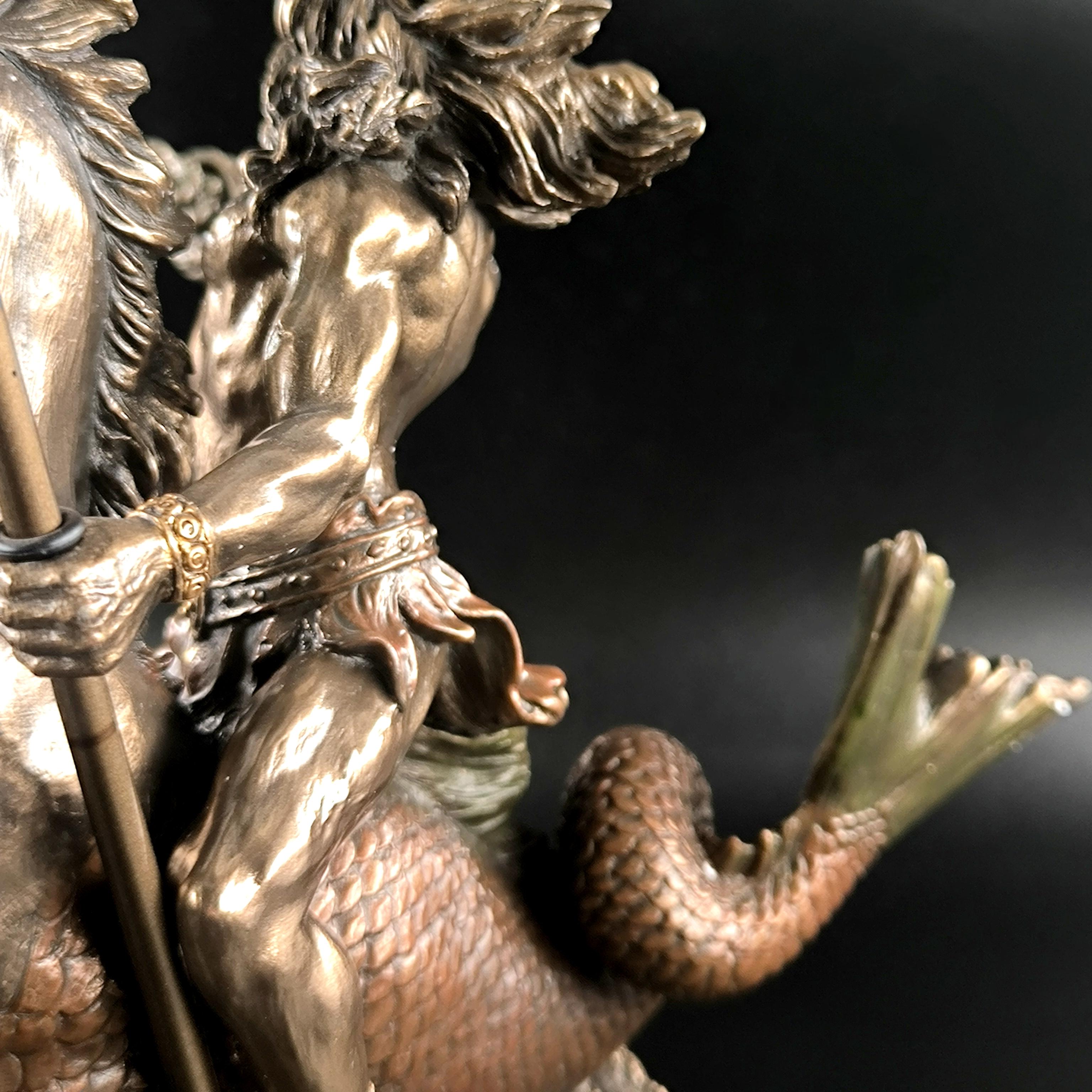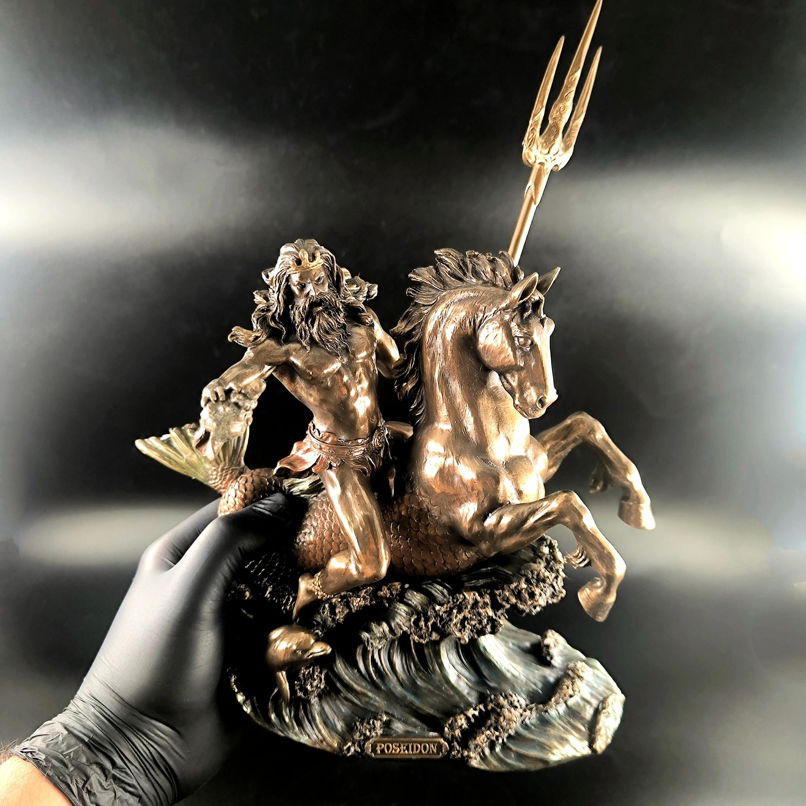 Okyanusların kudretli tanrısı Poseidon’un görkemli sahnesini taşıyan bu Veronese imzalı heykel, mitolojik ihtişamı olağanüstü detaylarla yansıtan özel bir koleksiyon parçasıdır. Üç dişli mızrağını (trident) göğe kaldırmış halde dalgaları yararak ilerleyen deniz atı Hippokampos’un üzerinde betimlenen Poseidon, güç, hâkimiyet ve sınırsız özgürlüğün sembolüdür. Dalgaların arasından sıçrayan yunus figürü ise denizlerin bereketini ve koruyuculuğu temsil eder. Her bir kas detayından dalgaların kıvrımına kadar kusursuz biçimde modellenmiş bu eser, dramatik bronz tonlu yüzeyi ve etkileyici kompozisyonuyla mekâna ihtişam katan güçlü bir sanat objesidir. Mermer ve kemik tozu karışımlı özel bir madde ile şekillendirilmiş olup usta sanatçılar tarafından itina ile el boyaması yapılmıştır. Çok detaylı ve gerçekçi dokulara sahip olan bu heykel, dünya çapında işçilik kalitesiyle tanınan Veronese markasının damgasını taşımaktadır.