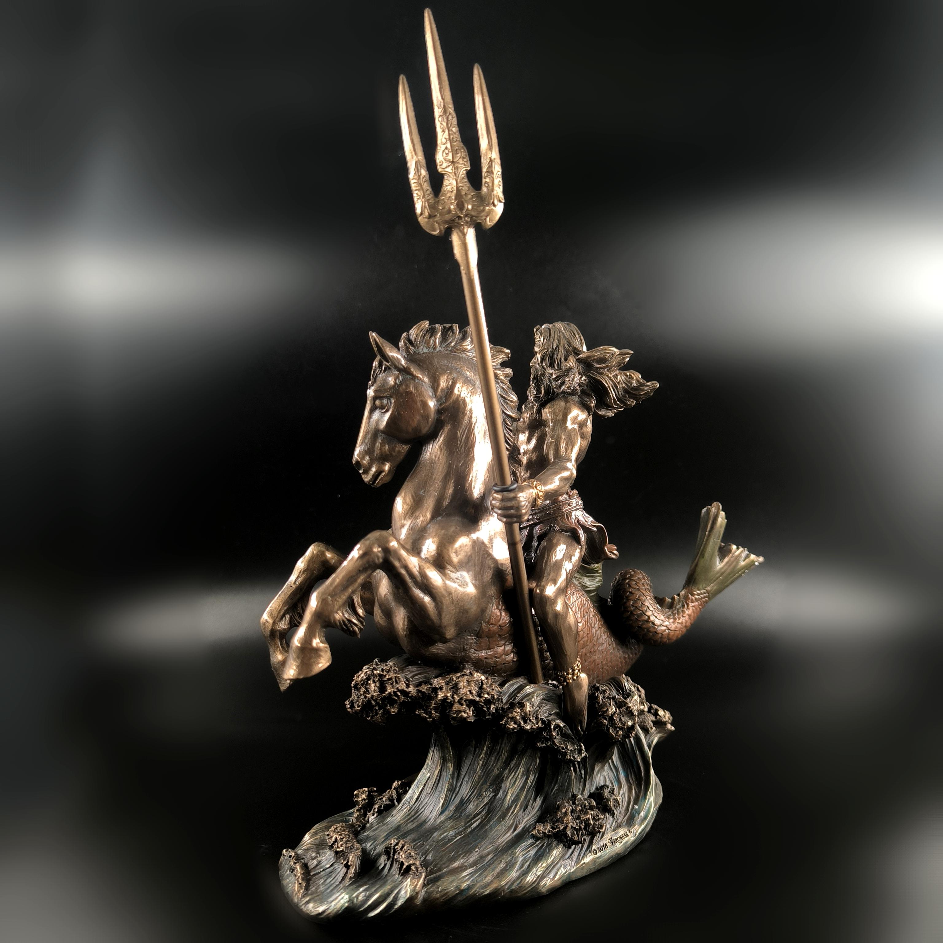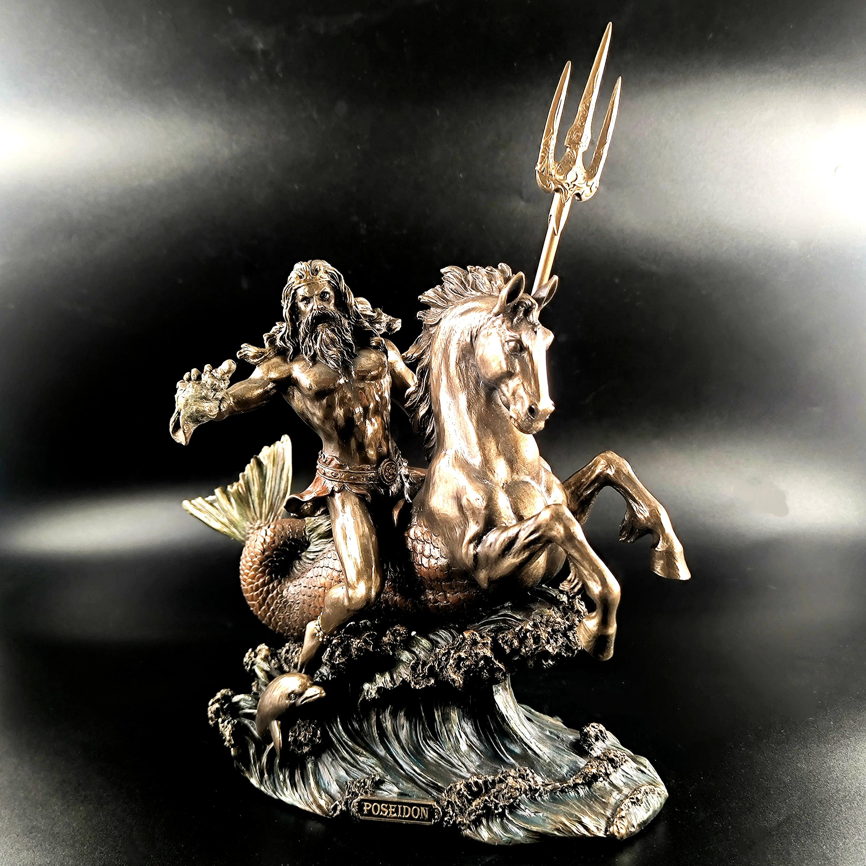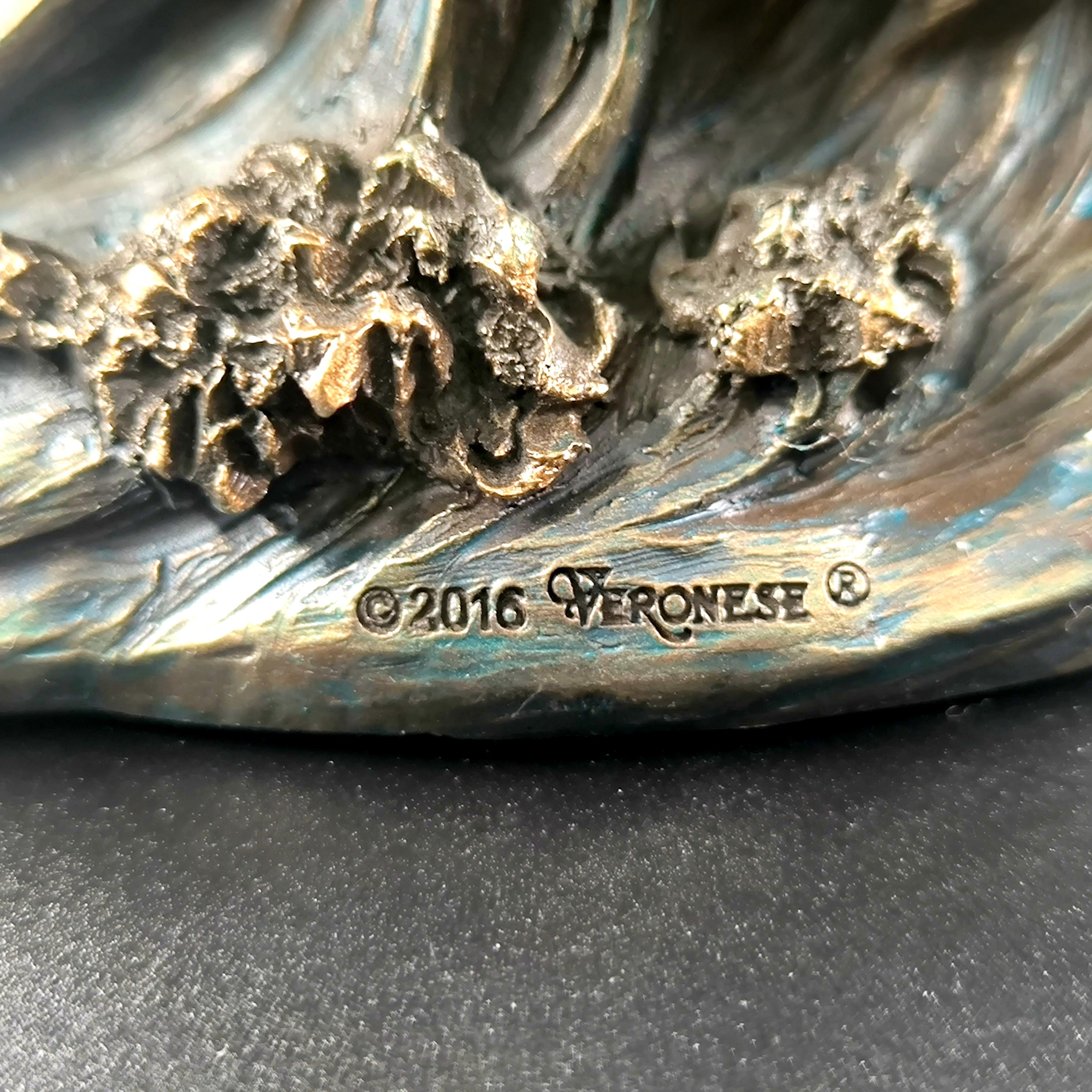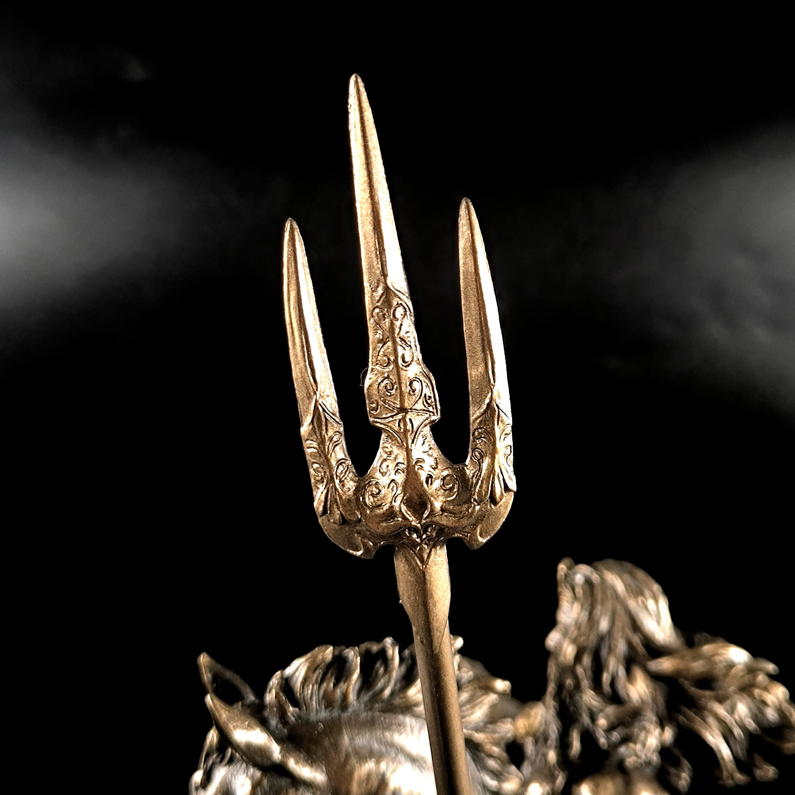 Okyanusların kudretli tanrısı Poseidon’un görkemli sahnesini taşıyan bu Veronese imzalı heykel, mitolojik ihtişamı olağanüstü detaylarla yansıtan özel bir koleksiyon parçasıdır. Üç dişli mızrağını (trident) göğe kaldırmış halde dalgaları yararak ilerleyen deniz atı Hippokampos’un üzerinde betimlenen Poseidon, güç, hâkimiyet ve sınırsız özgürlüğün sembolüdür. Dalgaların arasından sıçrayan yunus figürü ise denizlerin bereketini ve koruyuculuğu temsil eder. Her bir kas detayından dalgaların kıvrımına kadar kusursuz biçimde modellenmiş bu eser, dramatik bronz tonlu yüzeyi ve etkileyici kompozisyonuyla mekâna ihtişam katan güçlü bir sanat objesidir. Mermer ve kemik tozu karışımlı özel bir madde ile şekillendirilmiş olup usta sanatçılar tarafından itina ile el boyaması yapılmıştır. Çok detaylı ve gerçekçi dokulara sahip olan bu heykel, dünya çapında işçilik kalitesiyle tanınan Veronese markasının damgasını taşımaktadır.