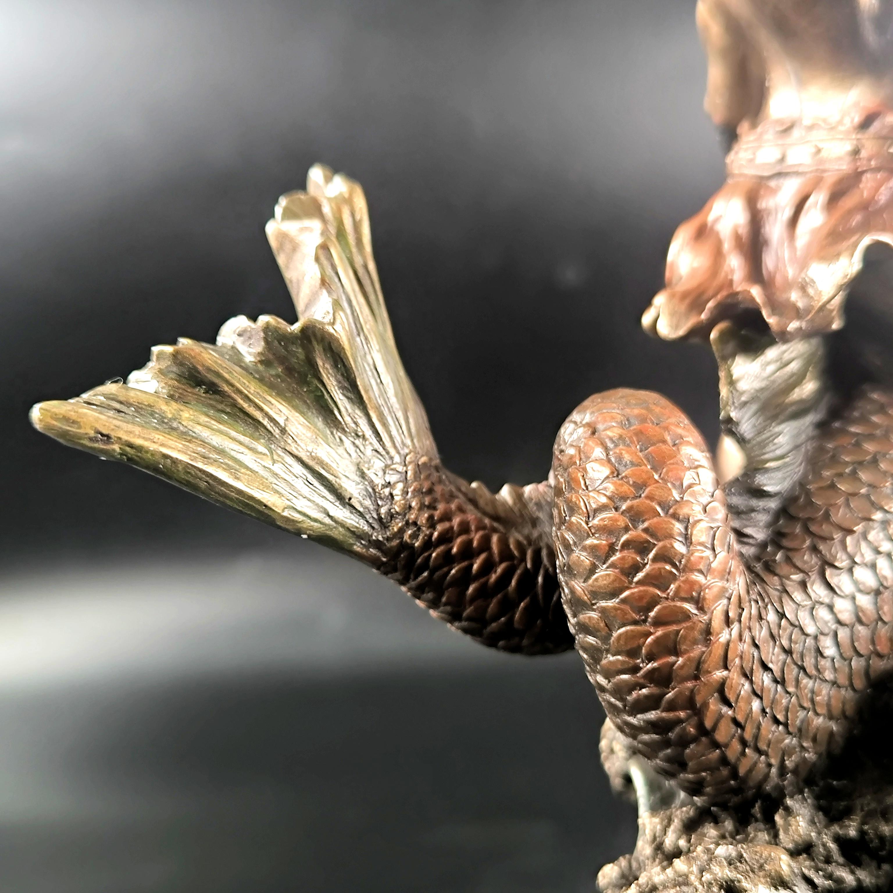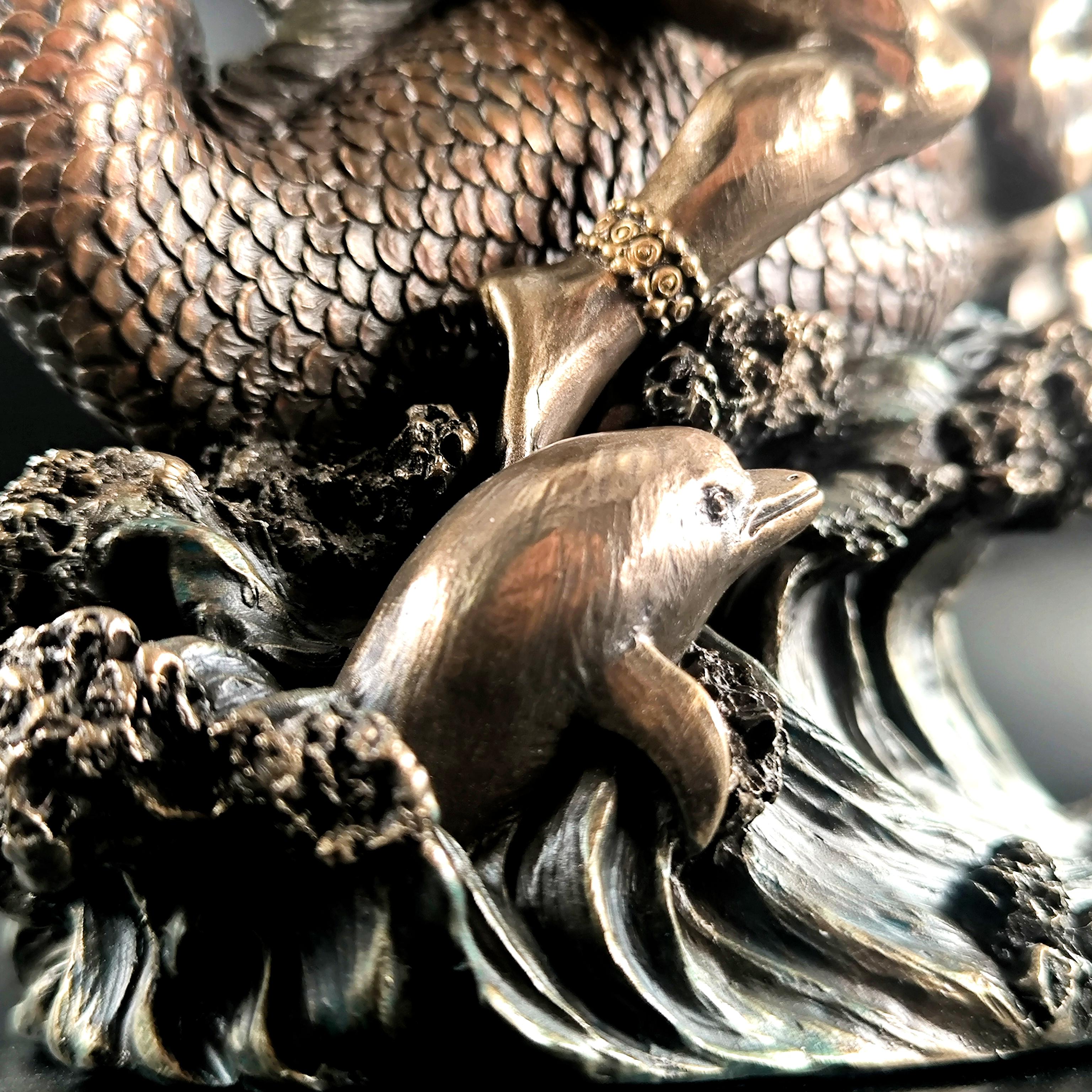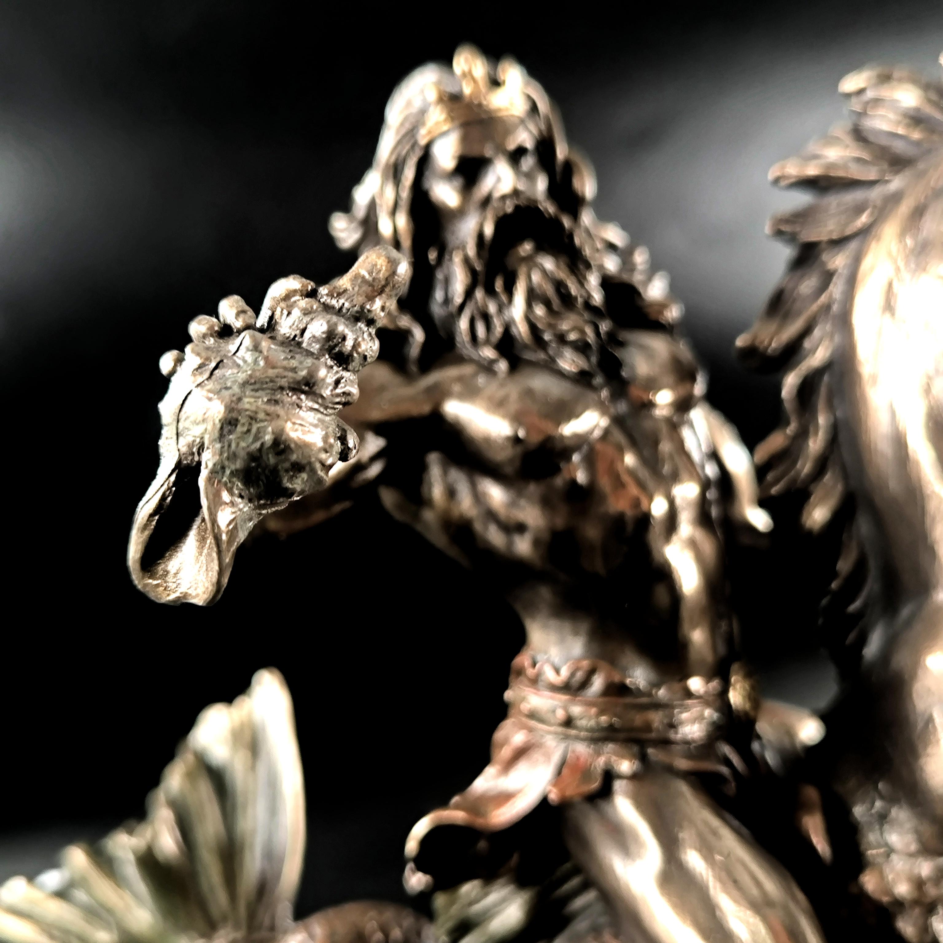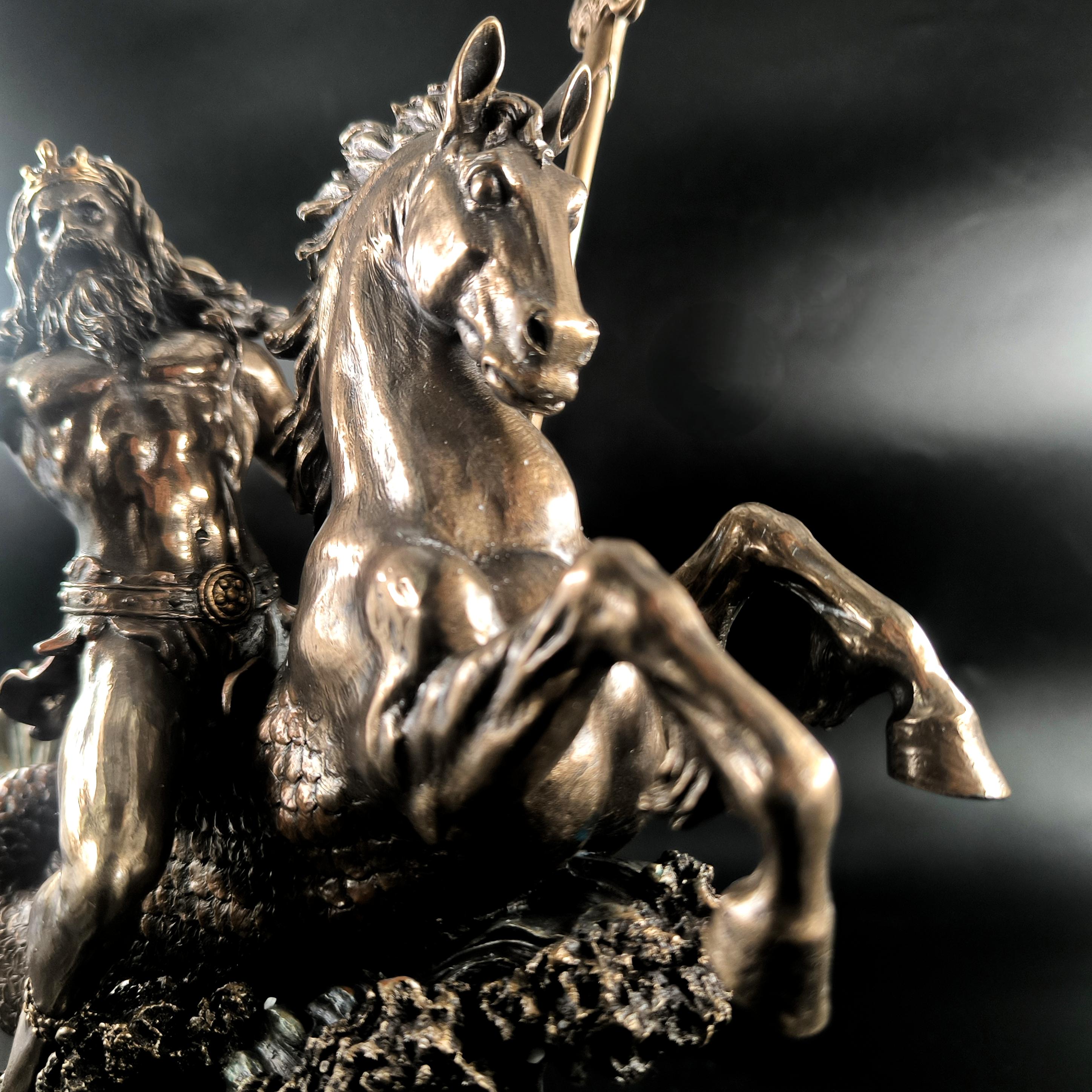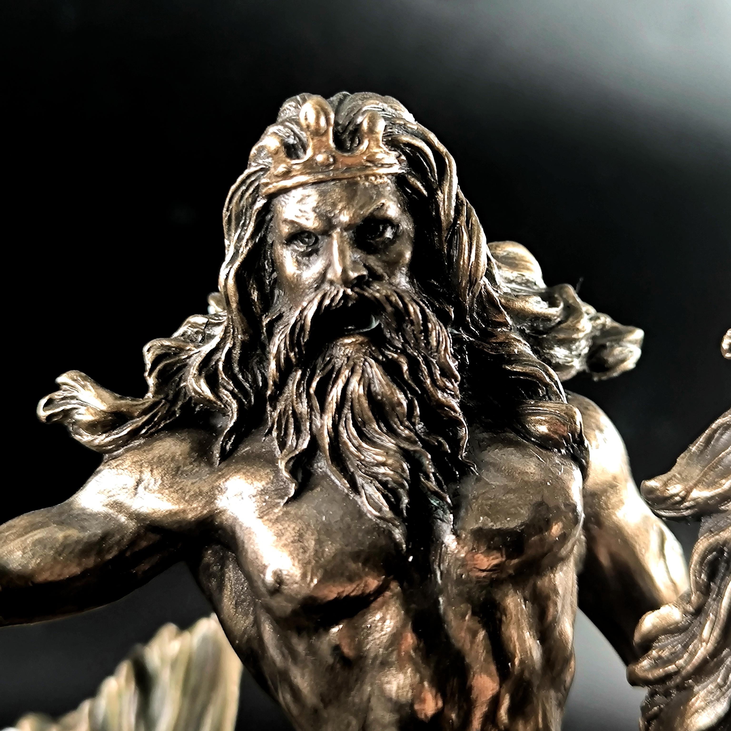 Okyanusların kudretli tanrısı Poseidon’un görkemli sahnesini taşıyan bu Veronese imzalı heykel, mitolojik ihtişamı olağanüstü detaylarla yansıtan özel bir koleksiyon parçasıdır. Üç dişli mızrağını (trident) göğe kaldırmış halde dalgaları yararak ilerleyen deniz atı Hippokampos’un üzerinde betimlenen Poseidon, güç, hâkimiyet ve sınırsız özgürlüğün sembolüdür. Dalgaların arasından sıçrayan yunus figürü ise denizlerin bereketini ve koruyuculuğu temsil eder. Her bir kas detayından dalgaların kıvrımına kadar kusursuz biçimde modellenmiş bu eser, dramatik bronz tonlu yüzeyi ve etkileyici kompozisyonuyla mekâna ihtişam katan güçlü bir sanat objesidir. Mermer ve kemik tozu karışımlı özel bir madde ile şekillendirilmiş olup usta sanatçılar tarafından itina ile el boyaması yapılmıştır. Çok detaylı ve gerçekçi dokulara sahip olan bu heykel, dünya çapında işçilik kalitesiyle tanınan Veronese markasının damgasını taşımaktadır.