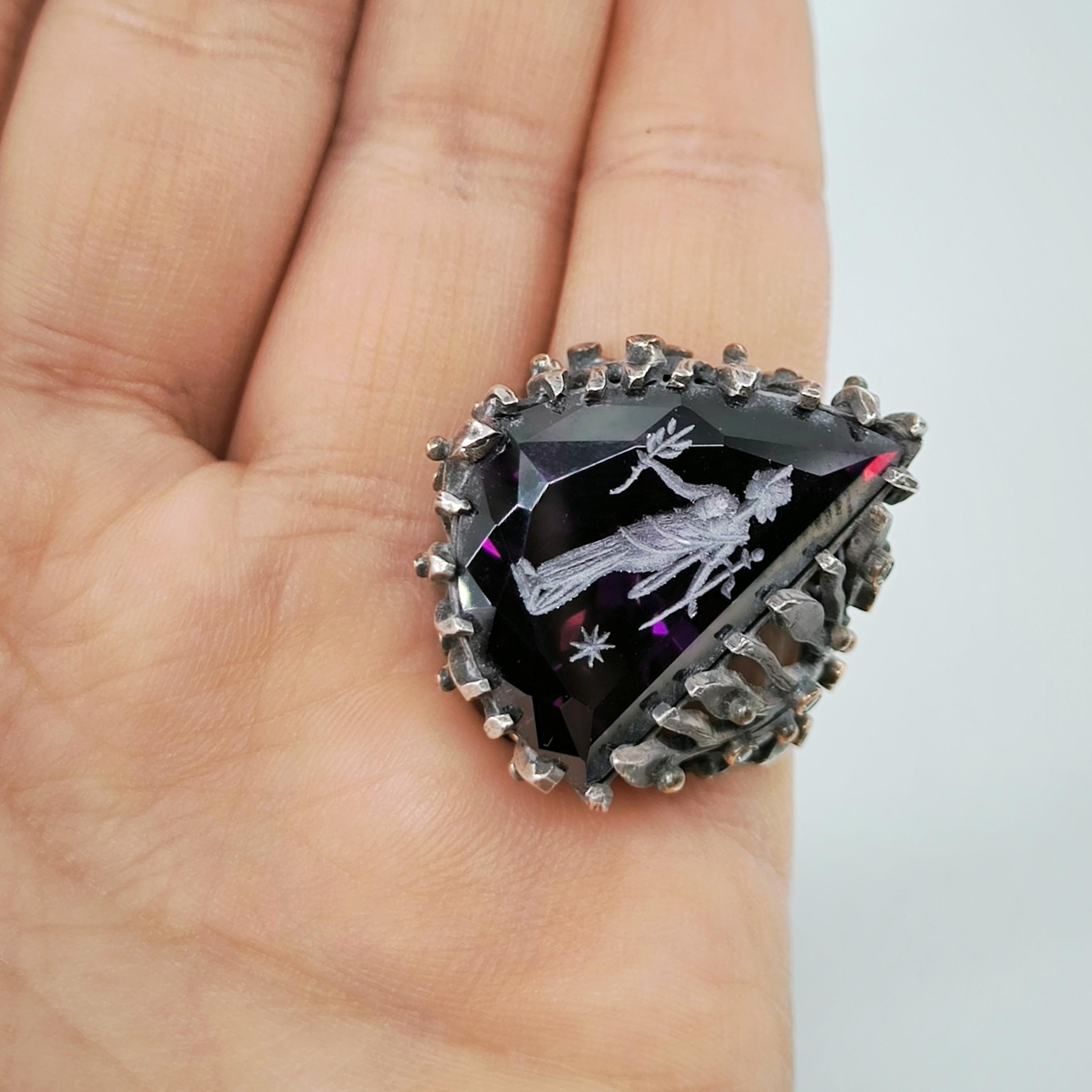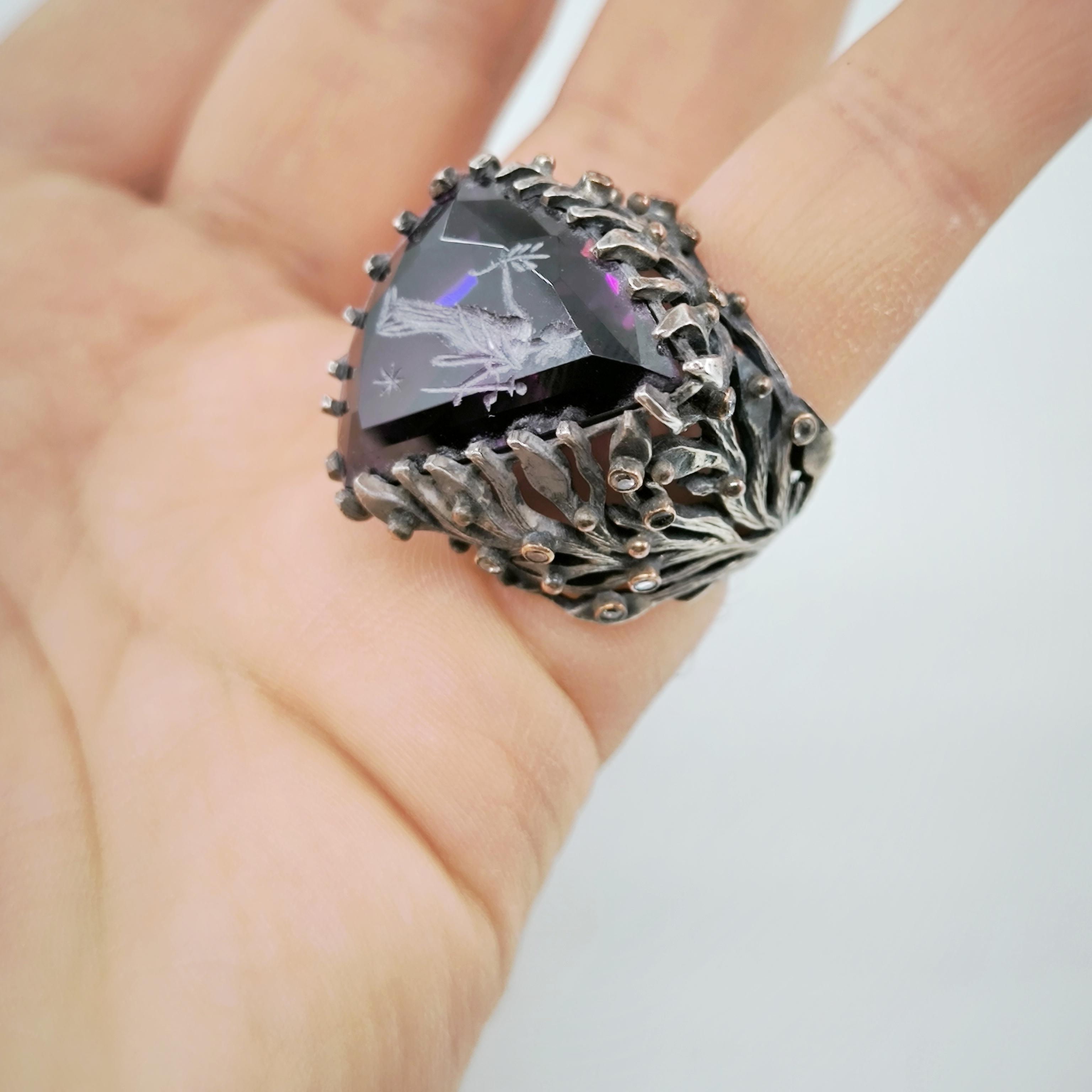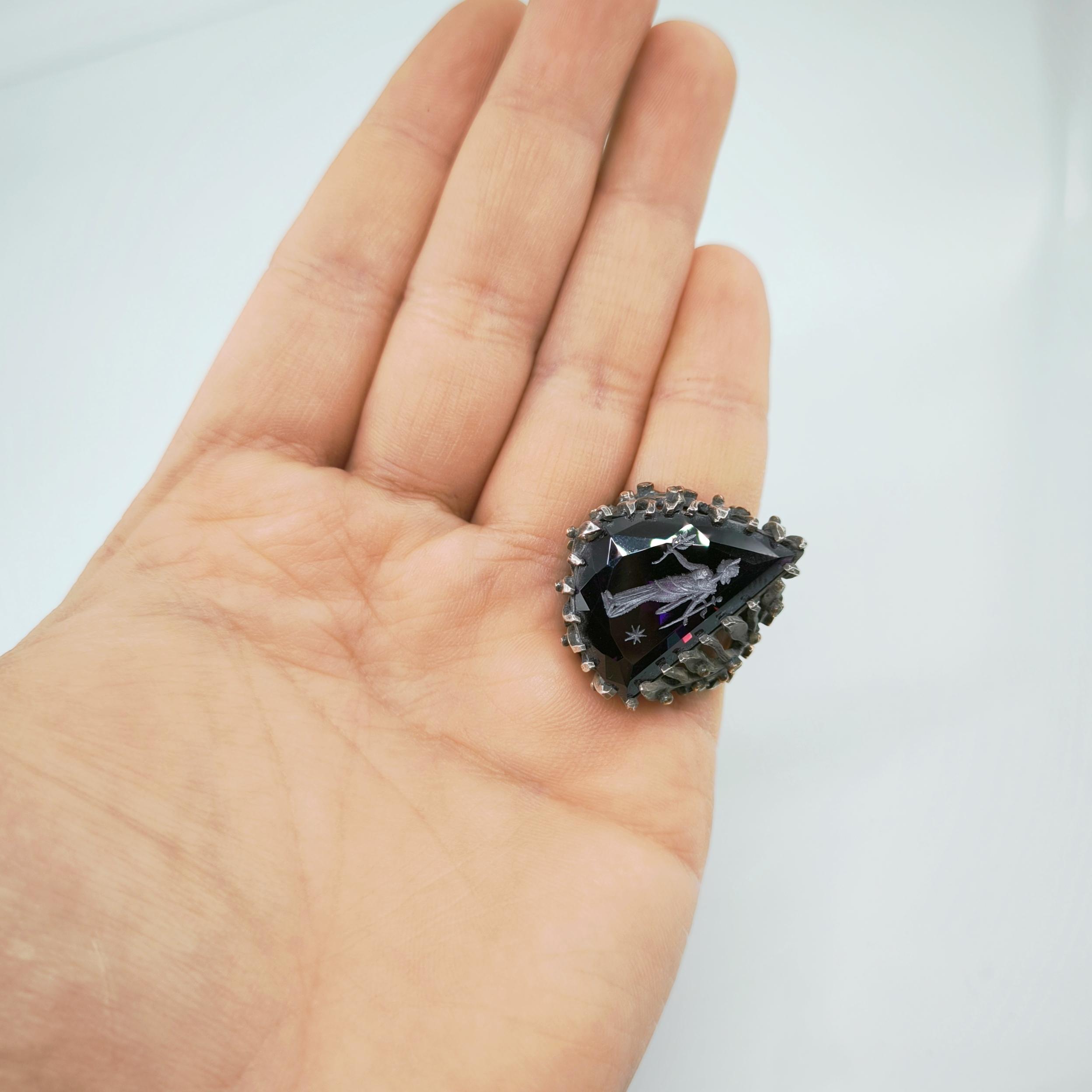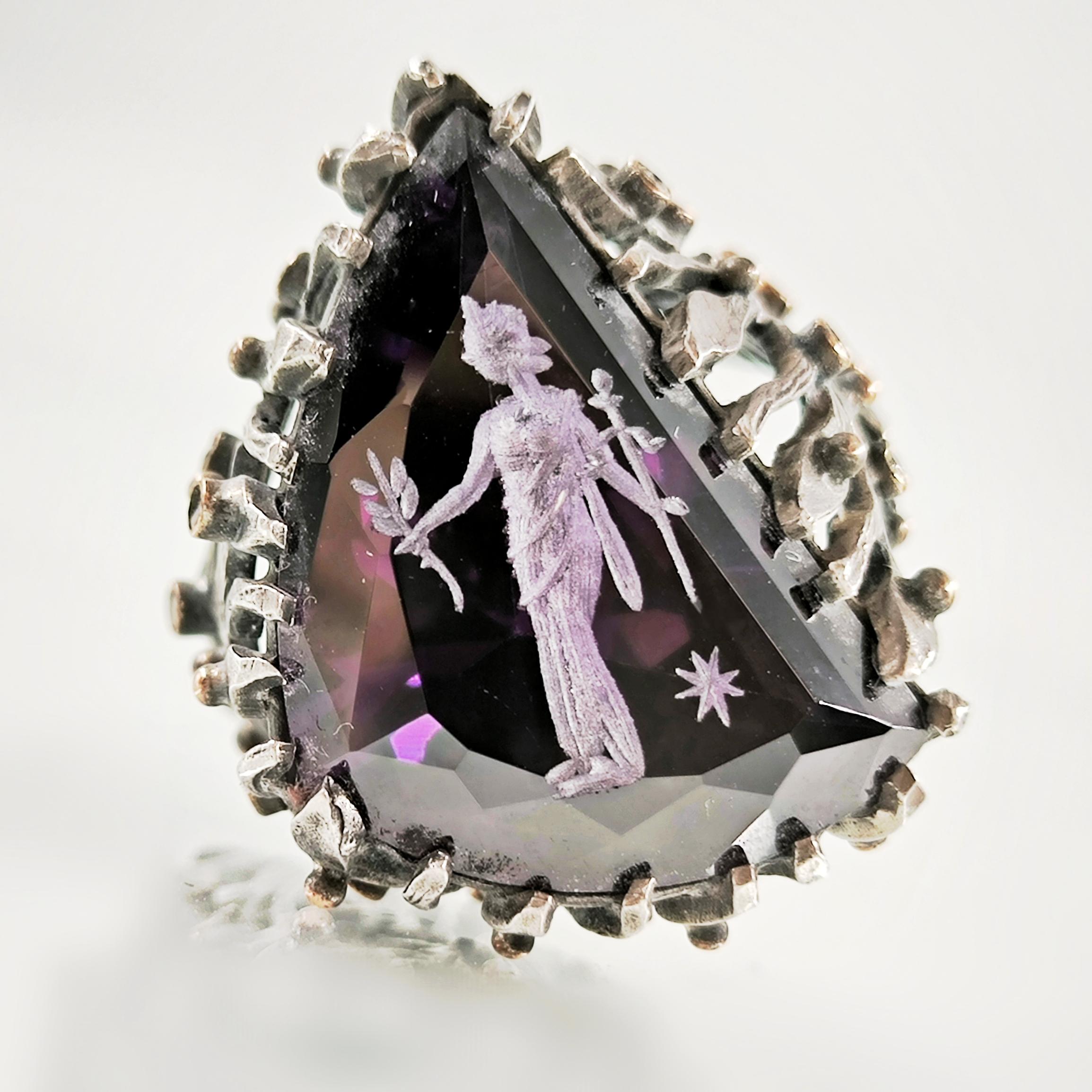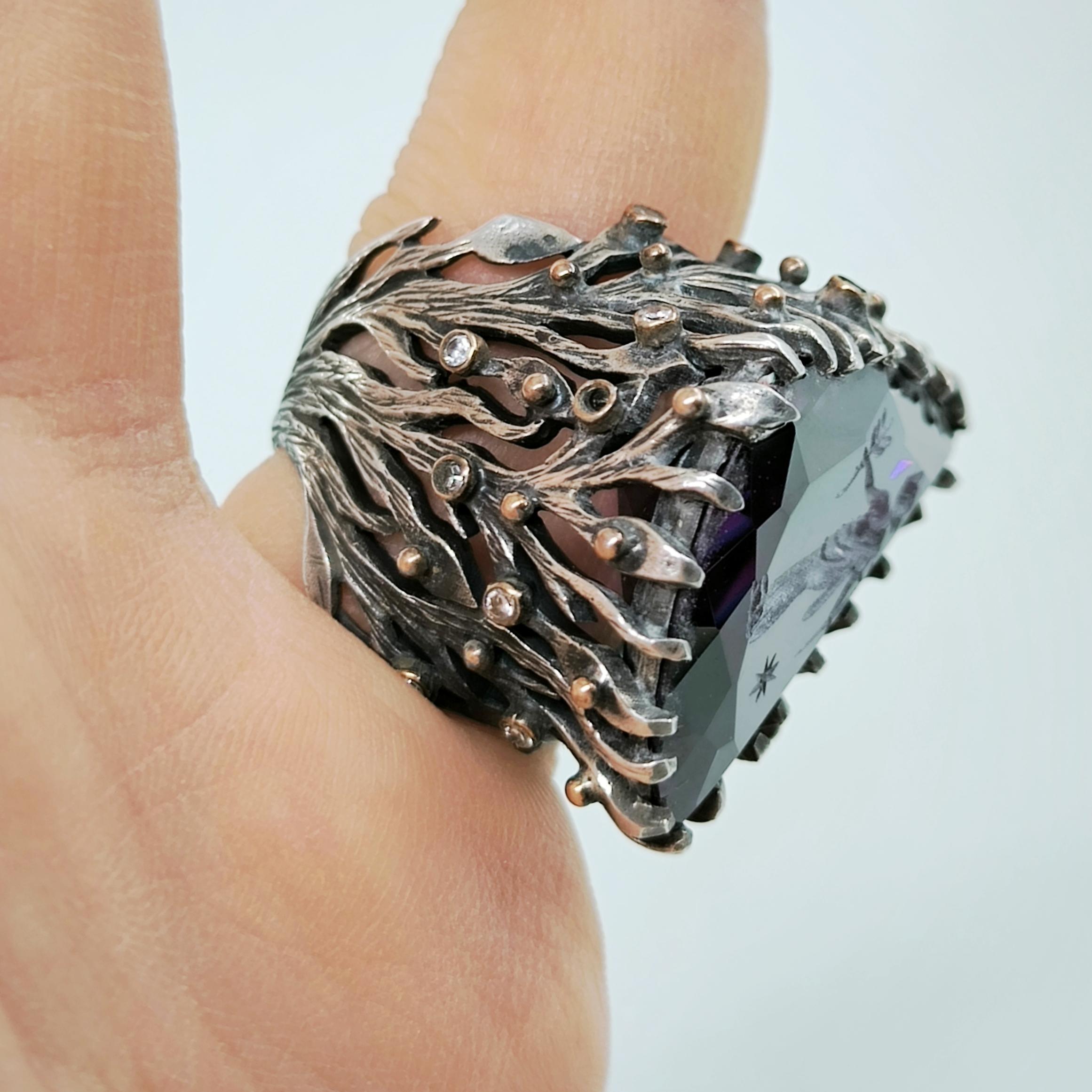 Üzerindeki büyük ve üçgen kesimli yüksek kaliteli mor zirkon taşın içine, antik çağların büyüsünü taşıyan bir Roma tipi intaglio (taş oyma portre) işlenmiştir. Bu figür, elinde zeytin dalı tutan asil bir Roma karakterini betimleyerek barışı, bilgeliği ve adaleti simgeler. Yüzüğün gövdesi, ağaç dalları formunda zarif bir tasarıma sahip olup, doğanın sonsuz yaşam döngüsünü ve köklerinden aldığı gücü yansıtır. Dalların üzerinde yer alan küçük zirkon taşlar ise adeta gece gökyüzünde parlayan yıldızları andırır.