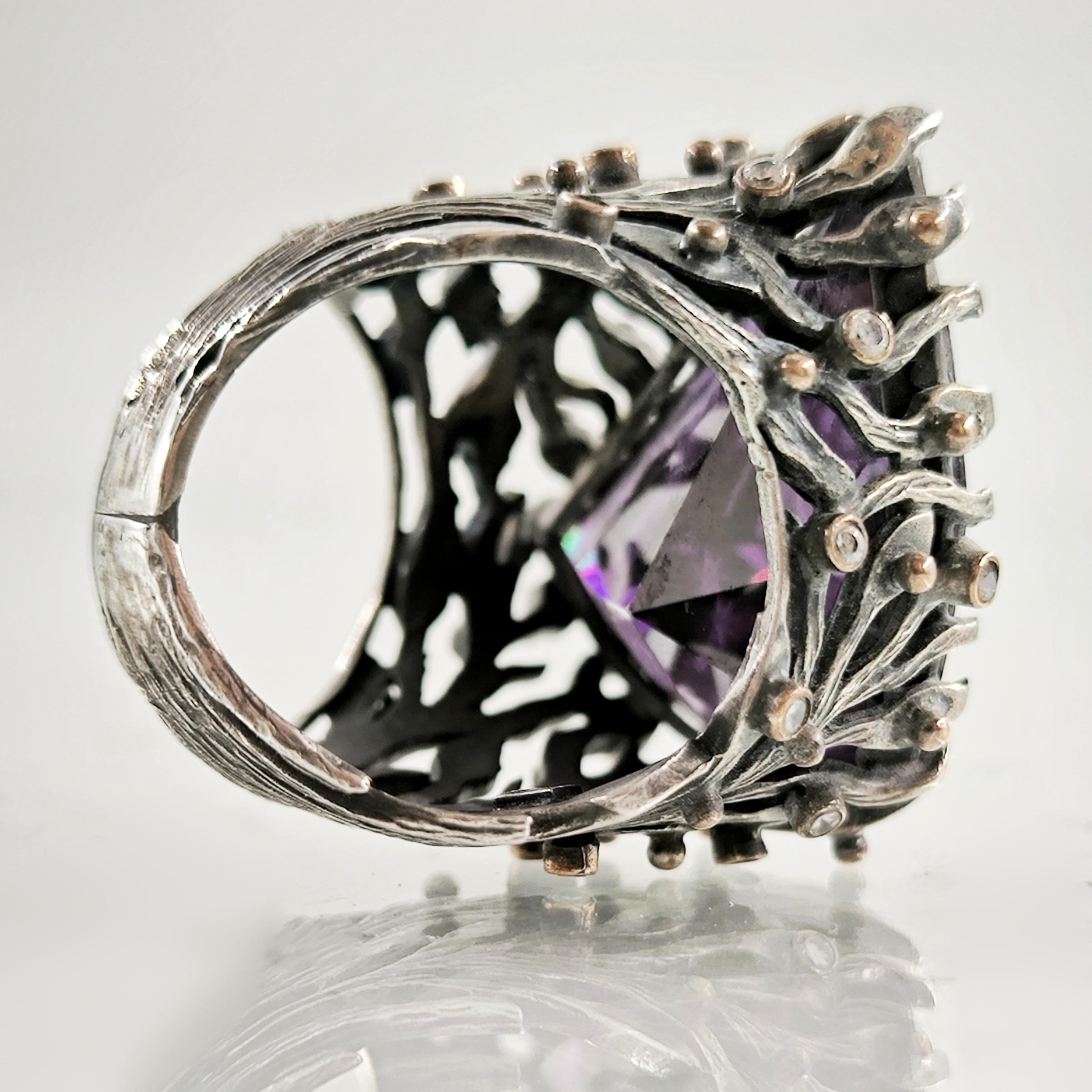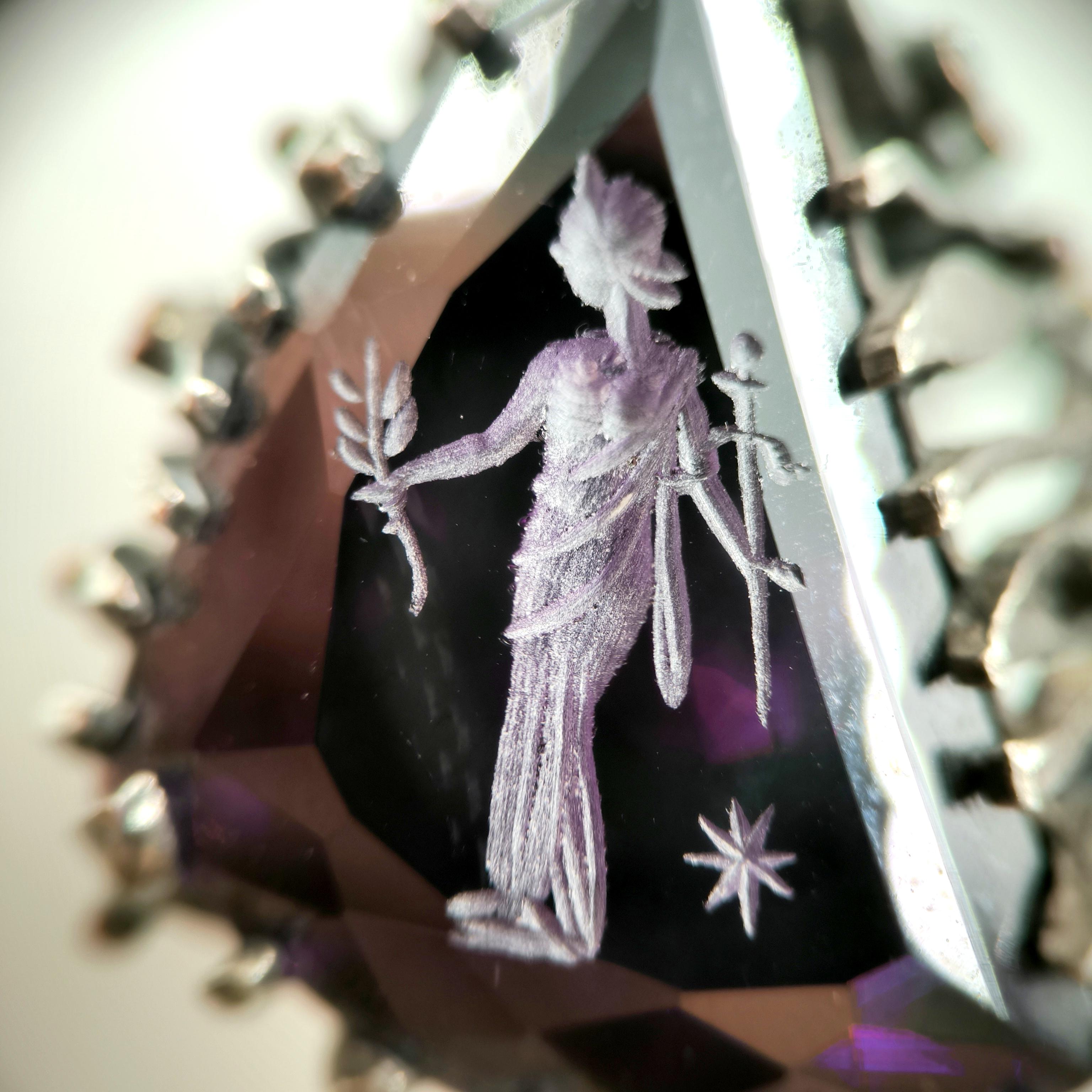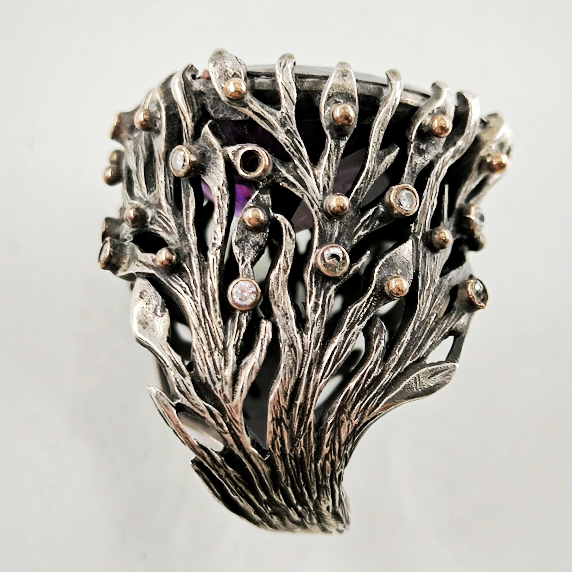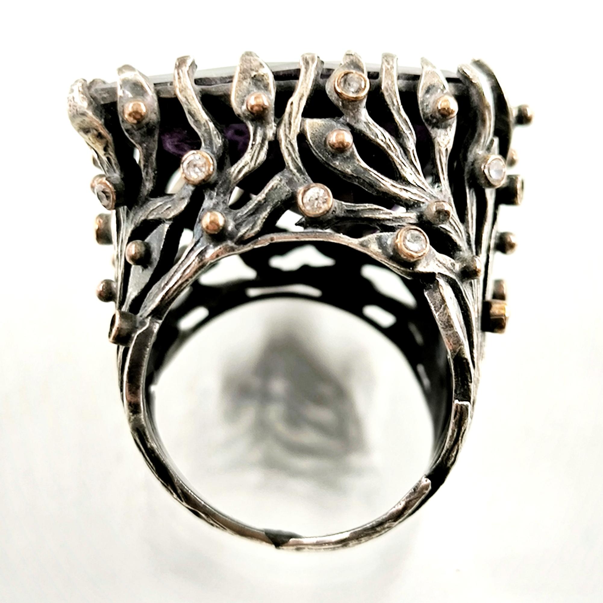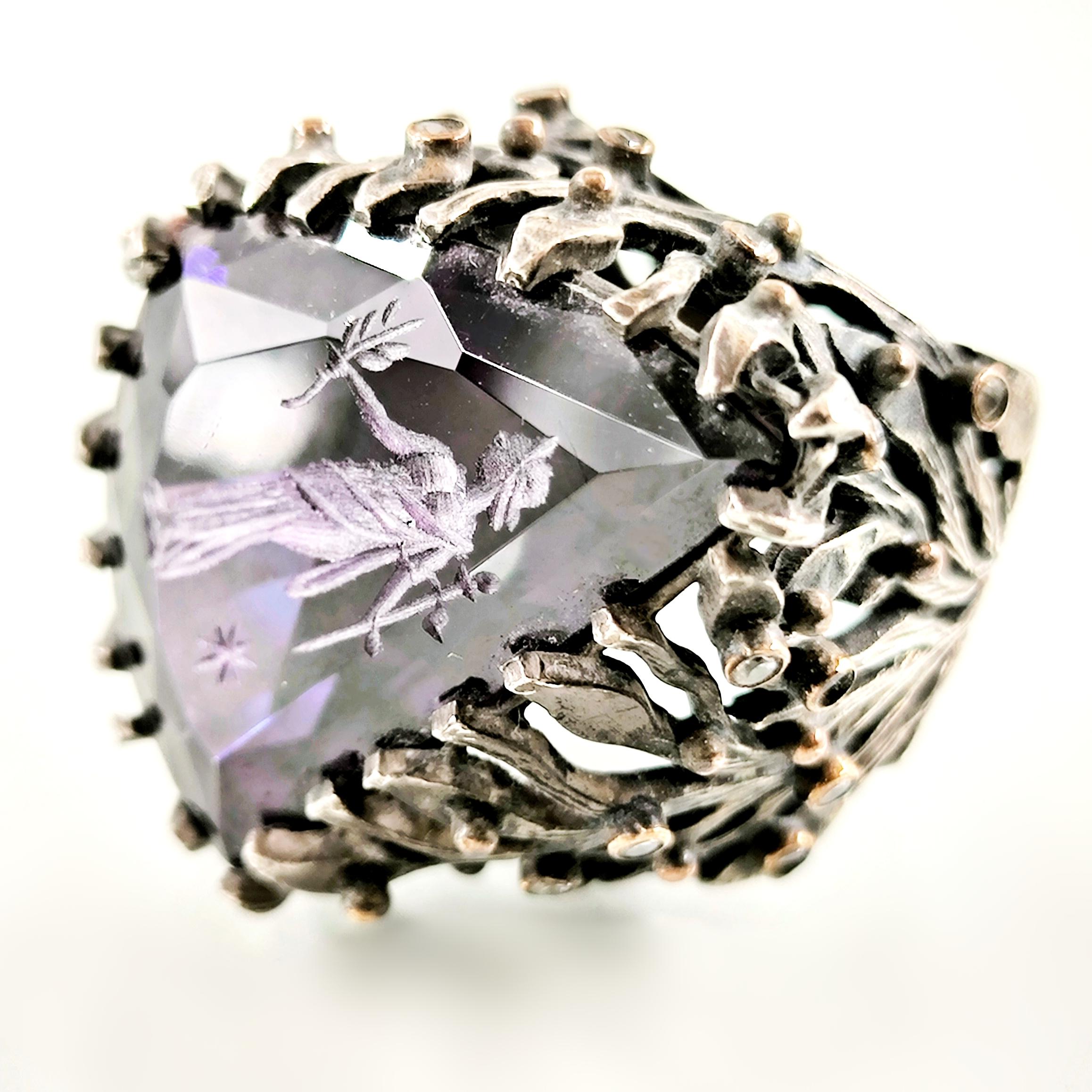 Üzerindeki büyük ve üçgen kesimli yüksek kaliteli mor zirkon taşın içine, antik çağların büyüsünü taşıyan bir Roma tipi intaglio (taş oyma portre) işlenmiştir. Bu figür, elinde zeytin dalı tutan asil bir Roma karakterini betimleyerek barışı, bilgeliği ve adaleti simgeler. Yüzüğün gövdesi, ağaç dalları formunda zarif bir tasarıma sahip olup, doğanın sonsuz yaşam döngüsünü ve köklerinden aldığı gücü yansıtır. Dalların üzerinde yer alan küçük zirkon taşlar ise adeta gece gökyüzünde parlayan yıldızları andırır.