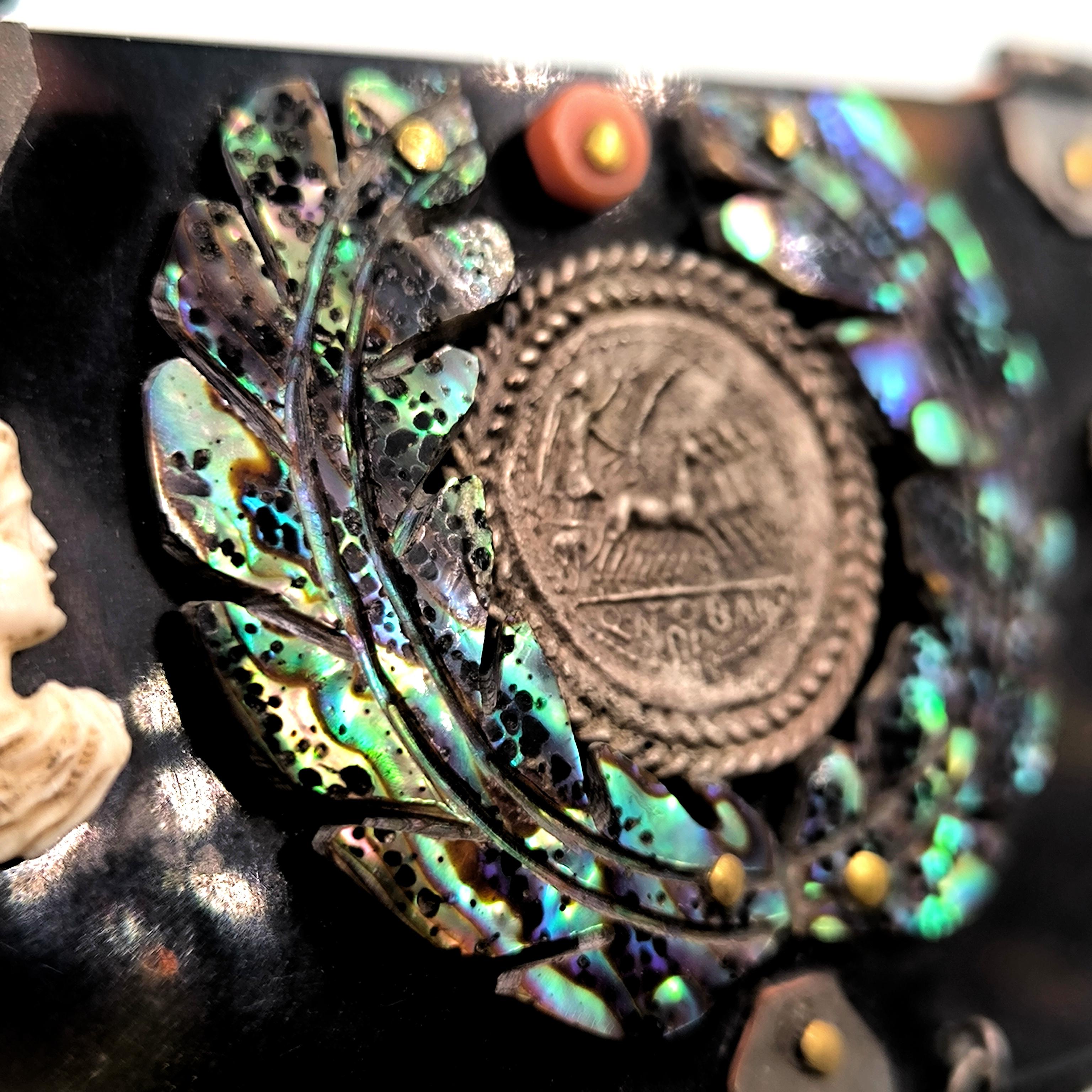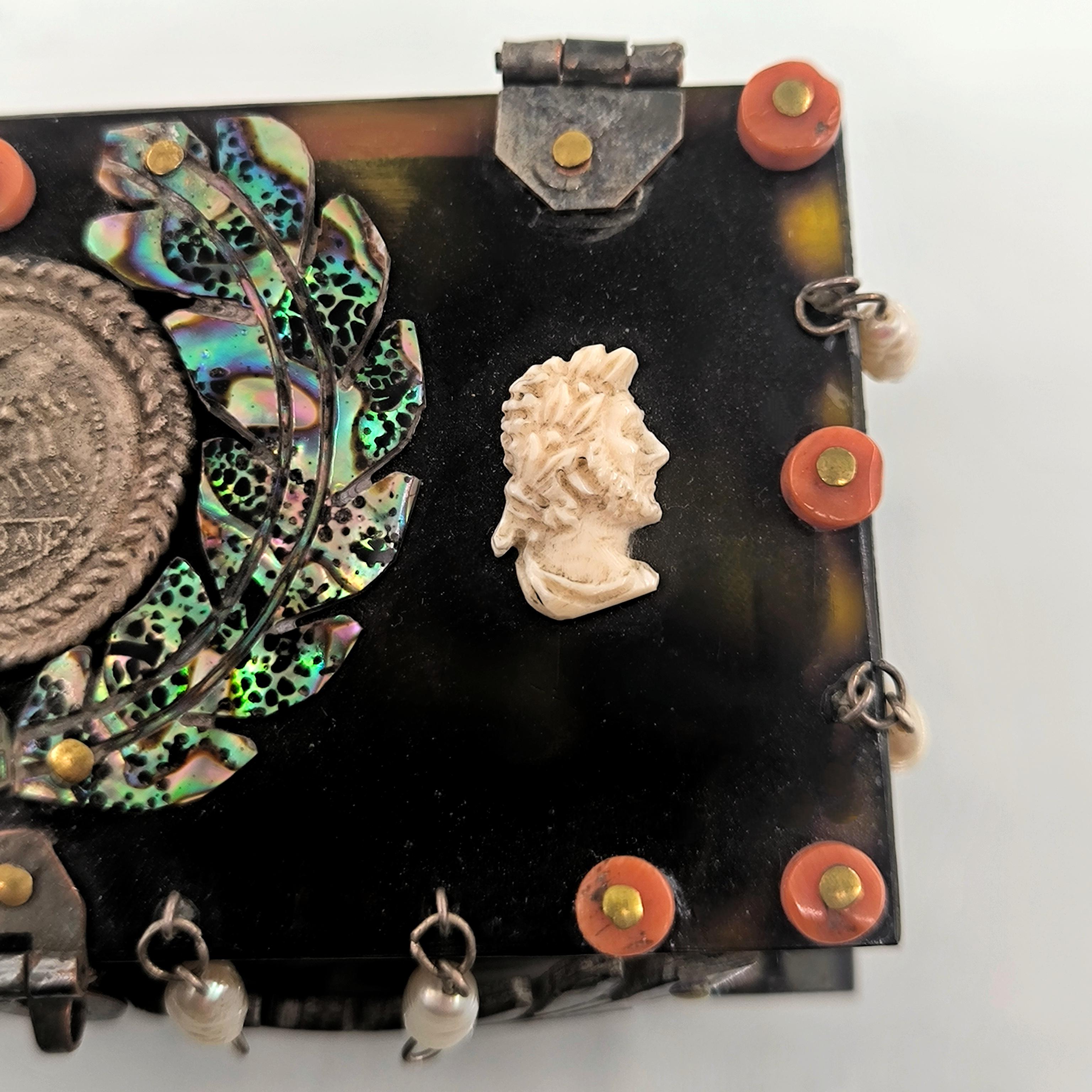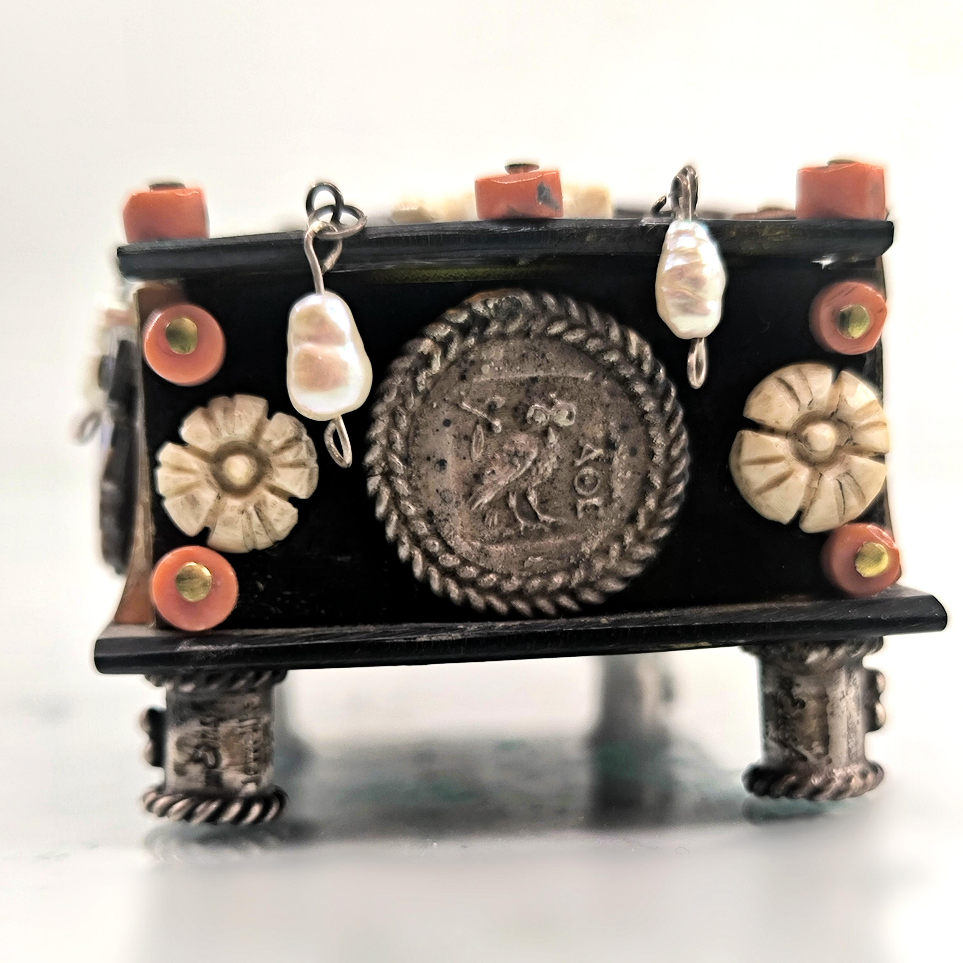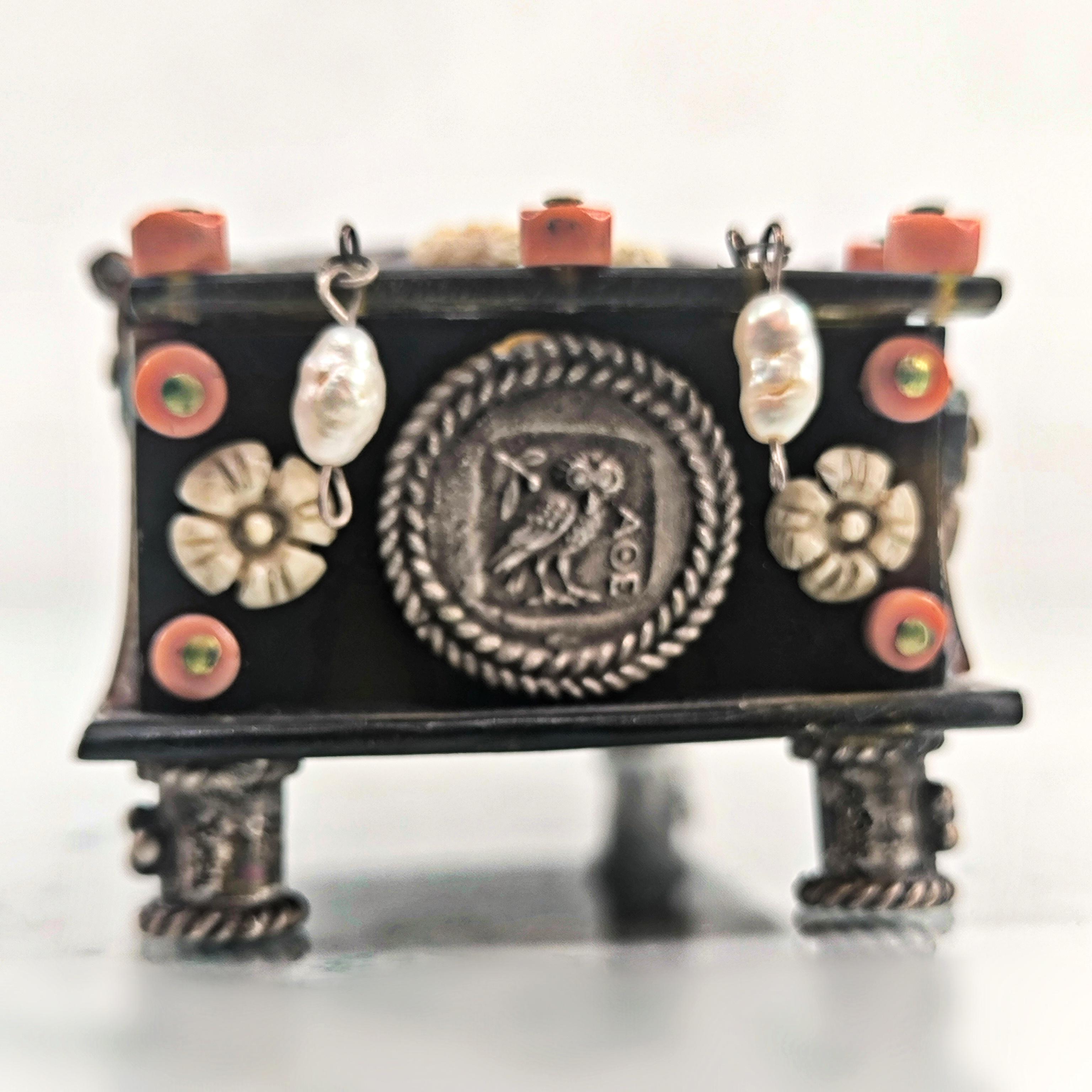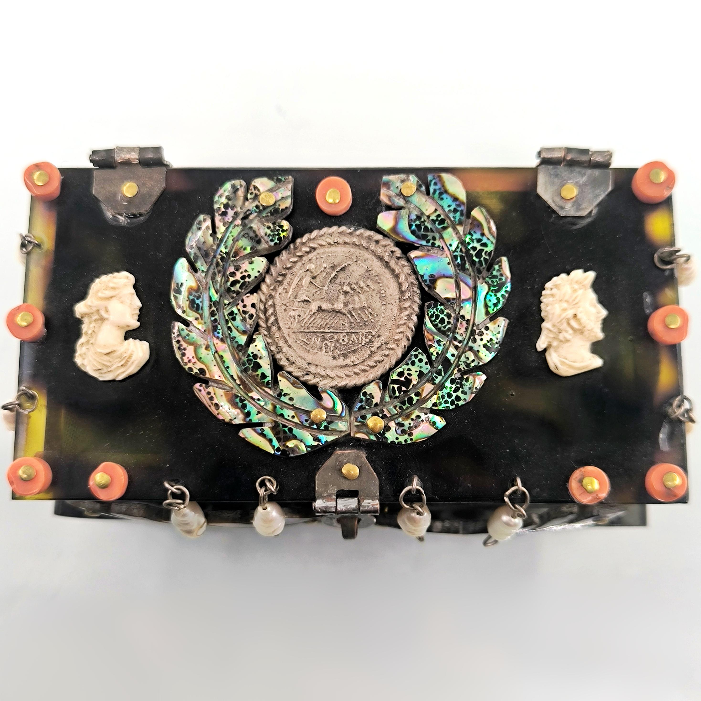 Roma döneminde imparator ve kraliçenin sandığından çıkmışçasına büyüleyici ve hiç olmadığı kadar zengin bir eser. Tamamen özel yapım Dünya da tek olana sahip olmak isteyenler için özel bir mücevher... Bir ''mEdusA'' yapımı eserdir. Haftalarca süren eşi ve benzeri olmayan bir çalışma sonucunda yaptığımız bu eser, üzerindeki sanat figürleriyle antik dönem mücevherlerinin ruhuna ışık tutuyor. Eski katalin ve kaplumbağa kabuğundan çalıştığımız, yeşil kadife kaplı, abalone sedef, mercan, inciler, dişler ve replika gümüş sikkelerle çevrili antik stilde tamamı el işçiliği ve tek mücevher kutumuz!
