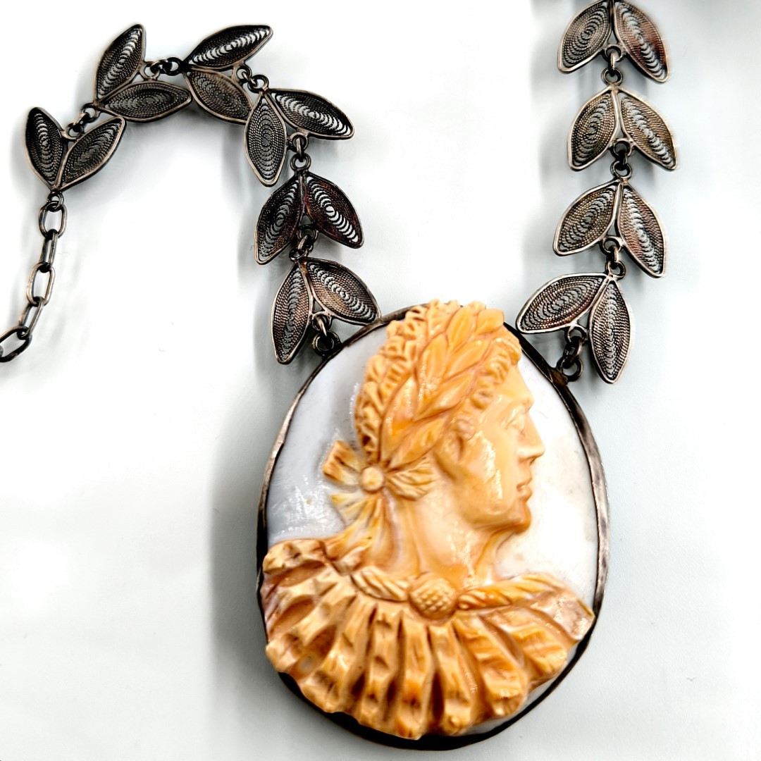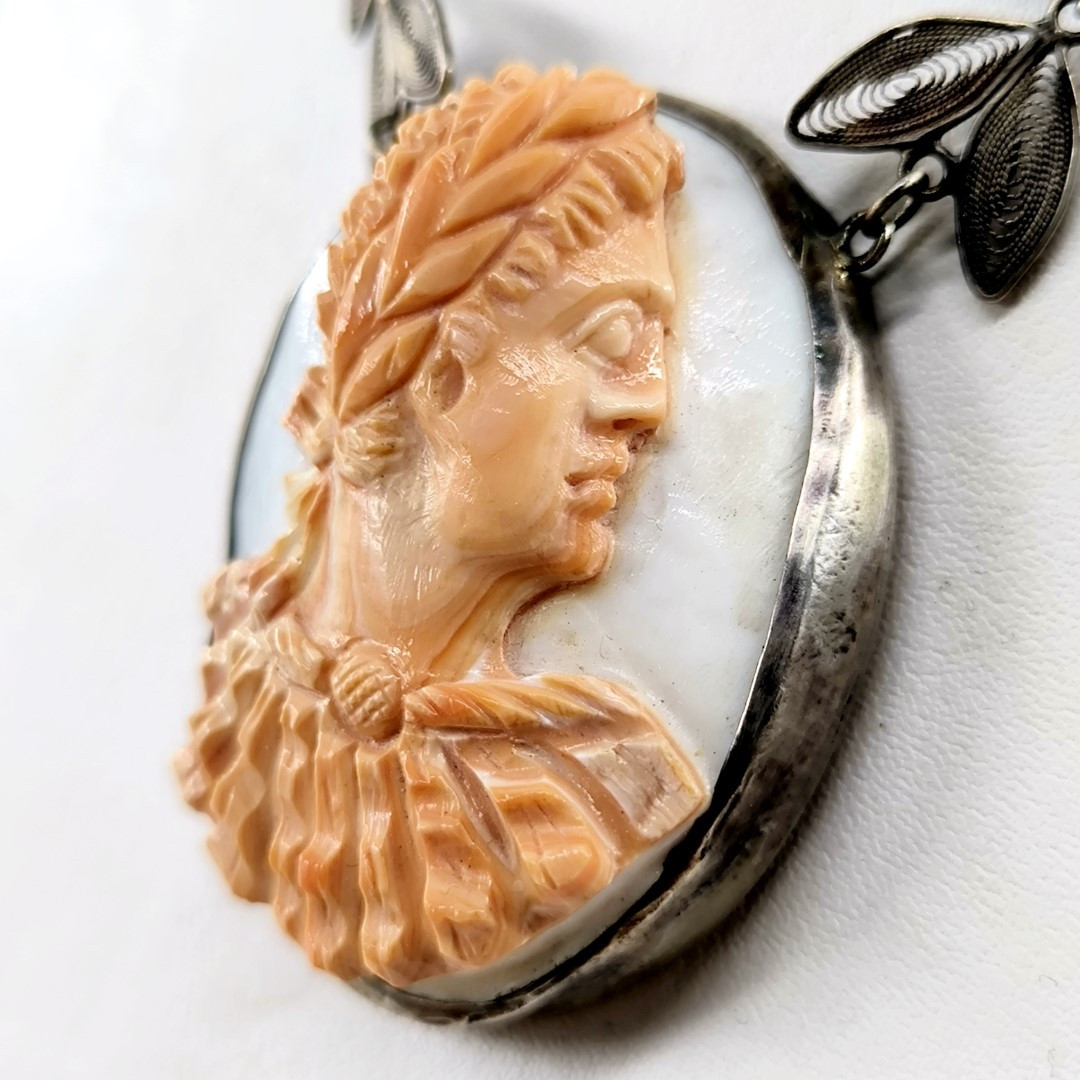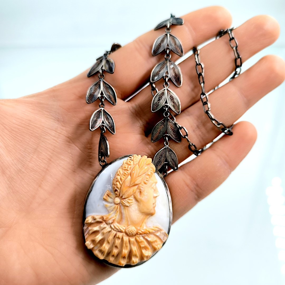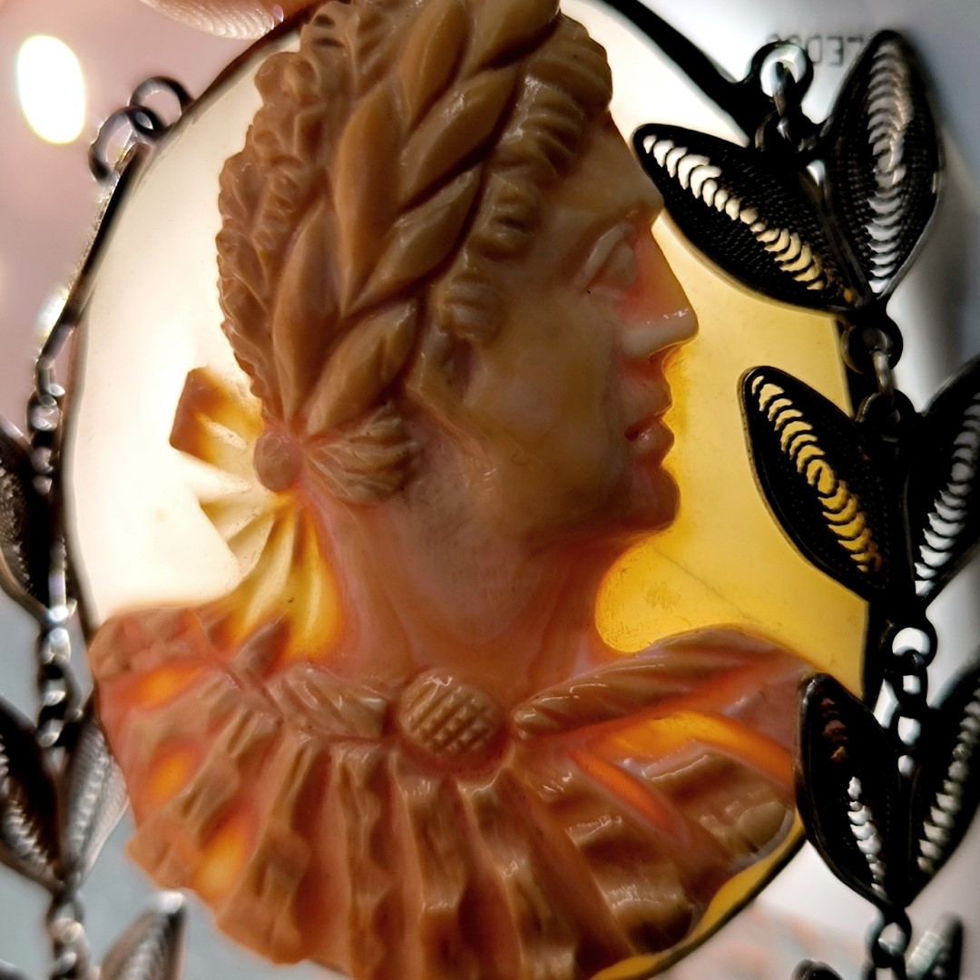 Bu Cameo'muz tamamen Medusa işçiliği ile yapılmıştır, Cassisrufa cinsi deniz kabuğu üzerine bilinen alışılagelmiş cameo renklerinin tam zıttı olarak figürün turuncu arka fonun beyaz olacağı şekilde ayarlanarak yapılmıştır. gümüş aksamları komple el işi telkari sanatının güzel bir örneğidir.