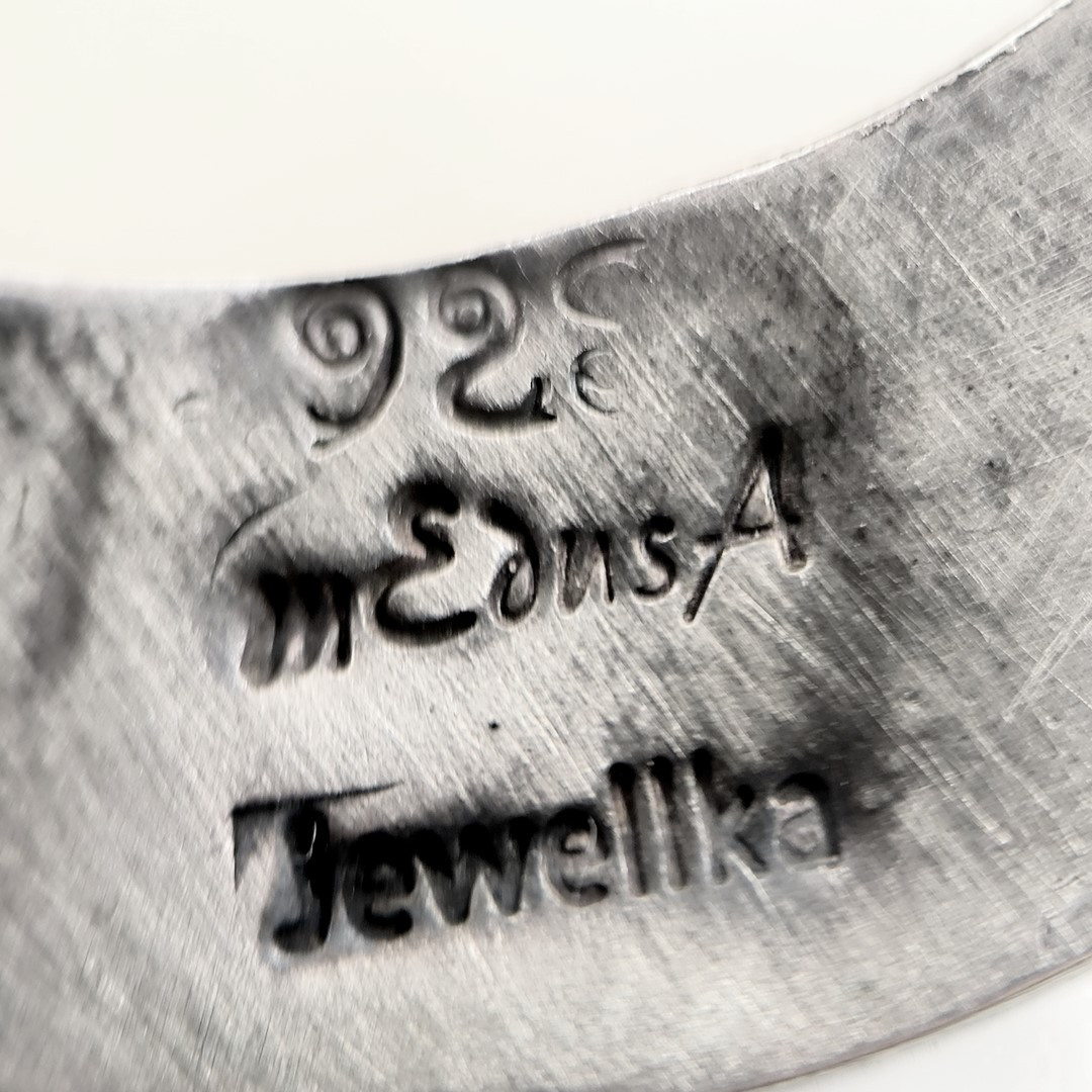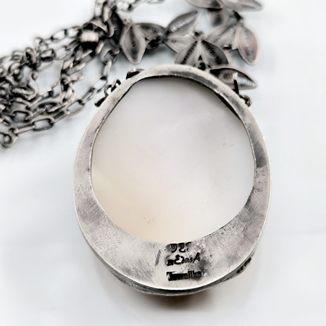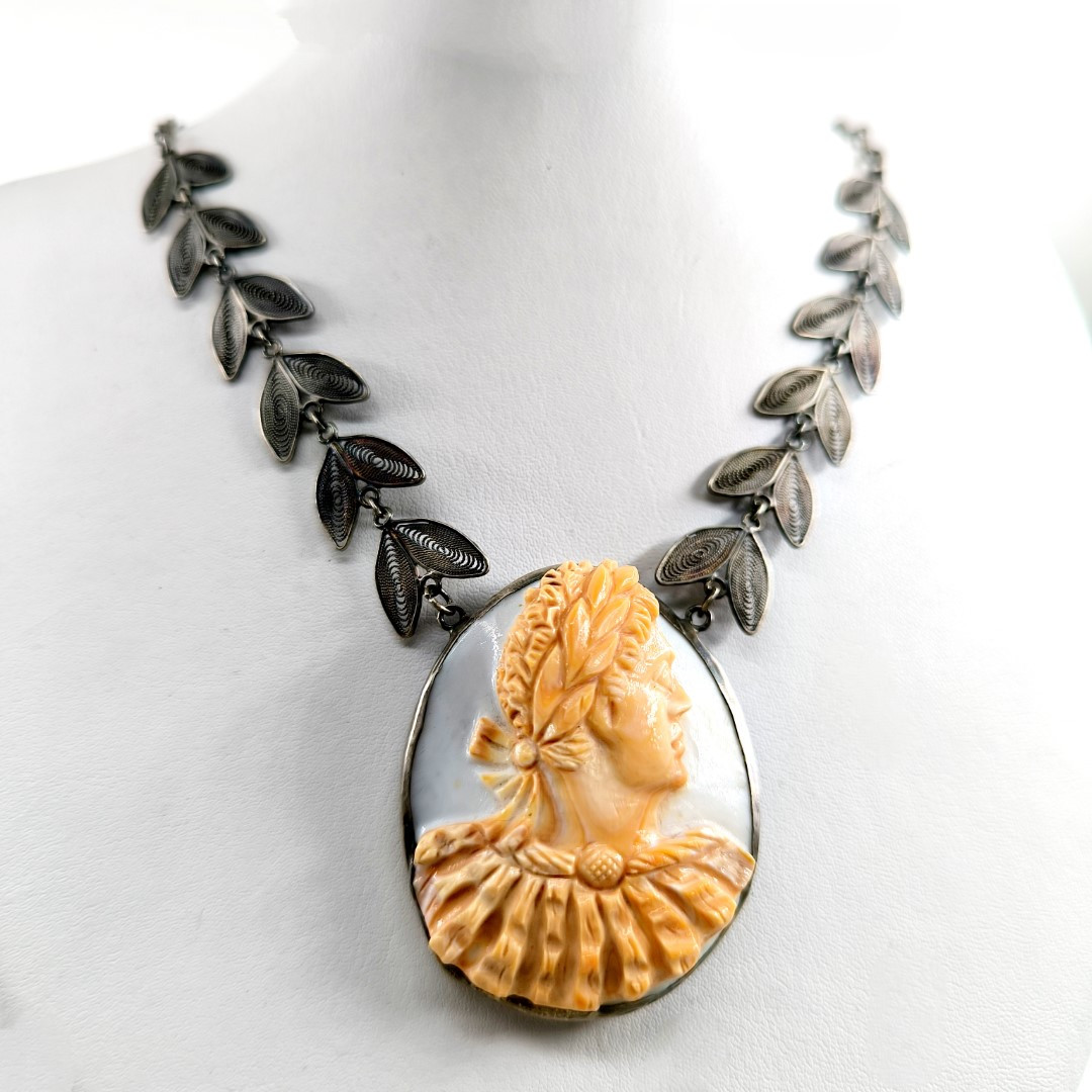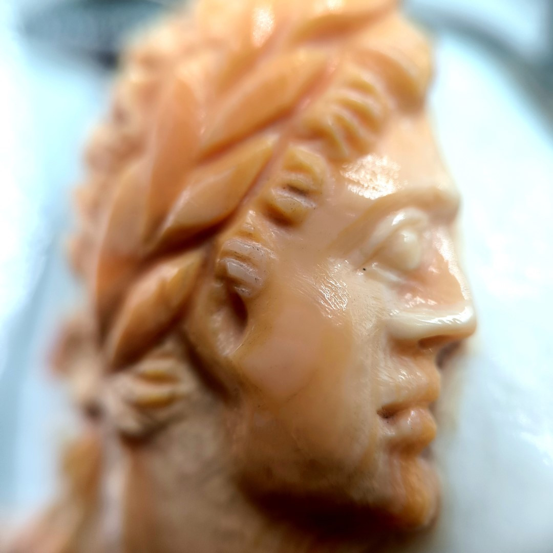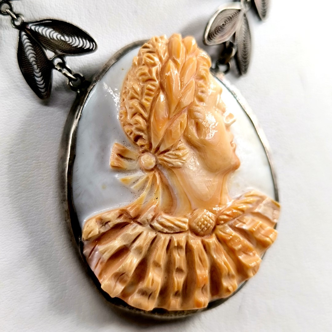 Bu Cameo'muz tamamen Medusa işçiliği ile yapılmıştır, Cassisrufa cinsi deniz kabuğu üzerine bilinen alışılagelmiş cameo renklerinin tam zıttı olarak figürün turuncu arka fonun beyaz olacağı şekilde ayarlanarak yapılmıştır. gümüş aksamları komple el işi telkari sanatının güzel bir örneğidir.