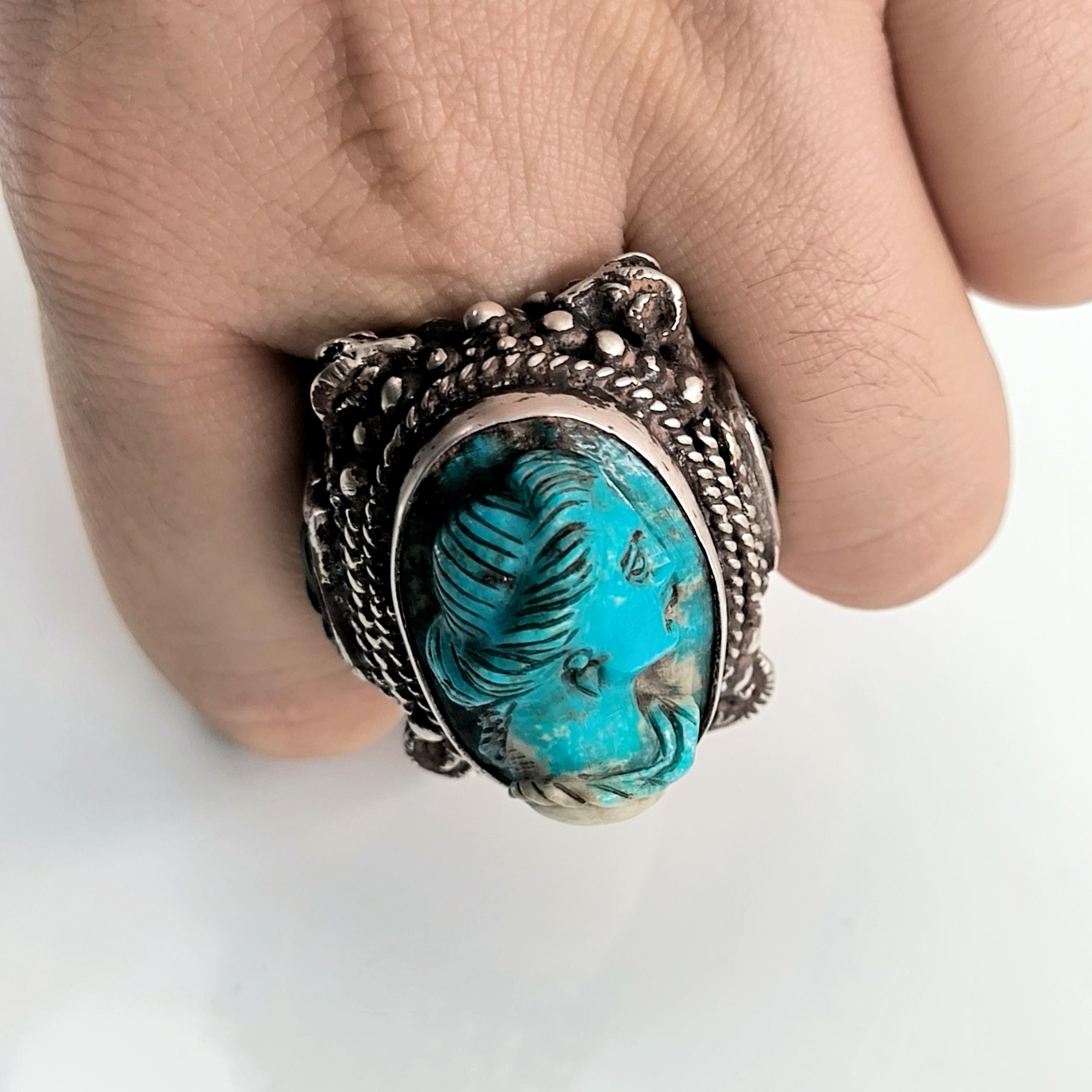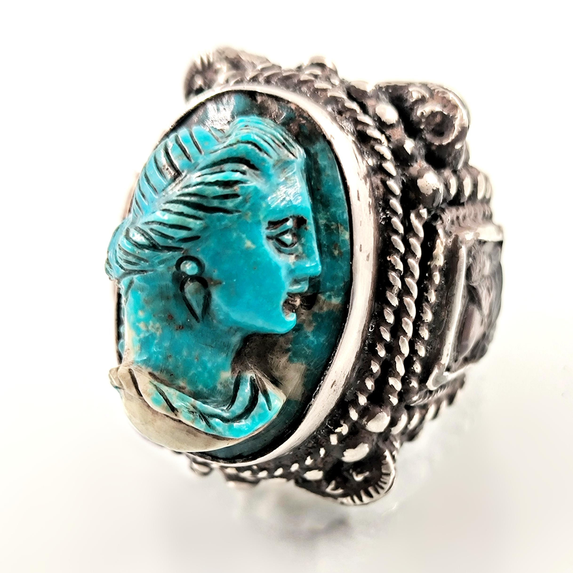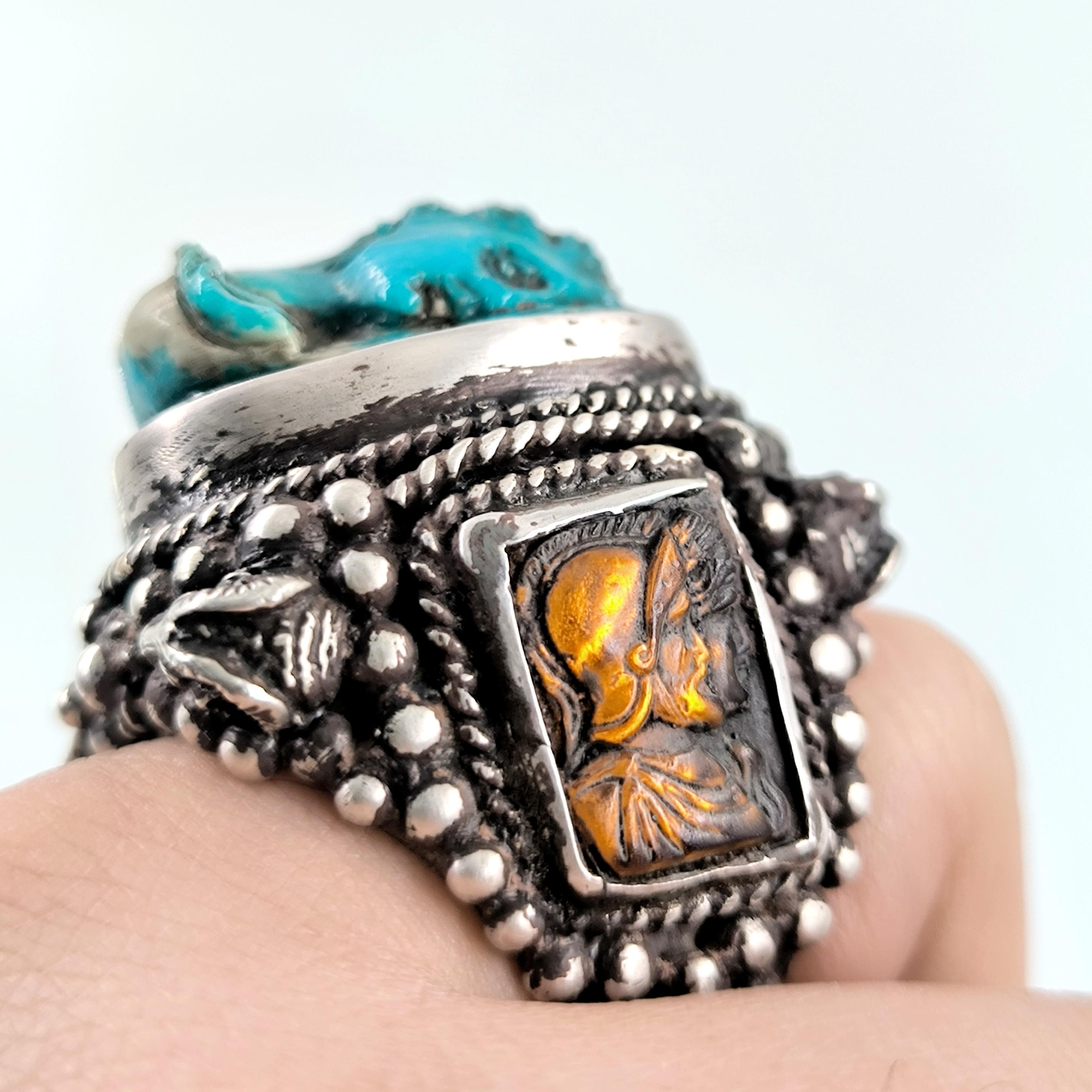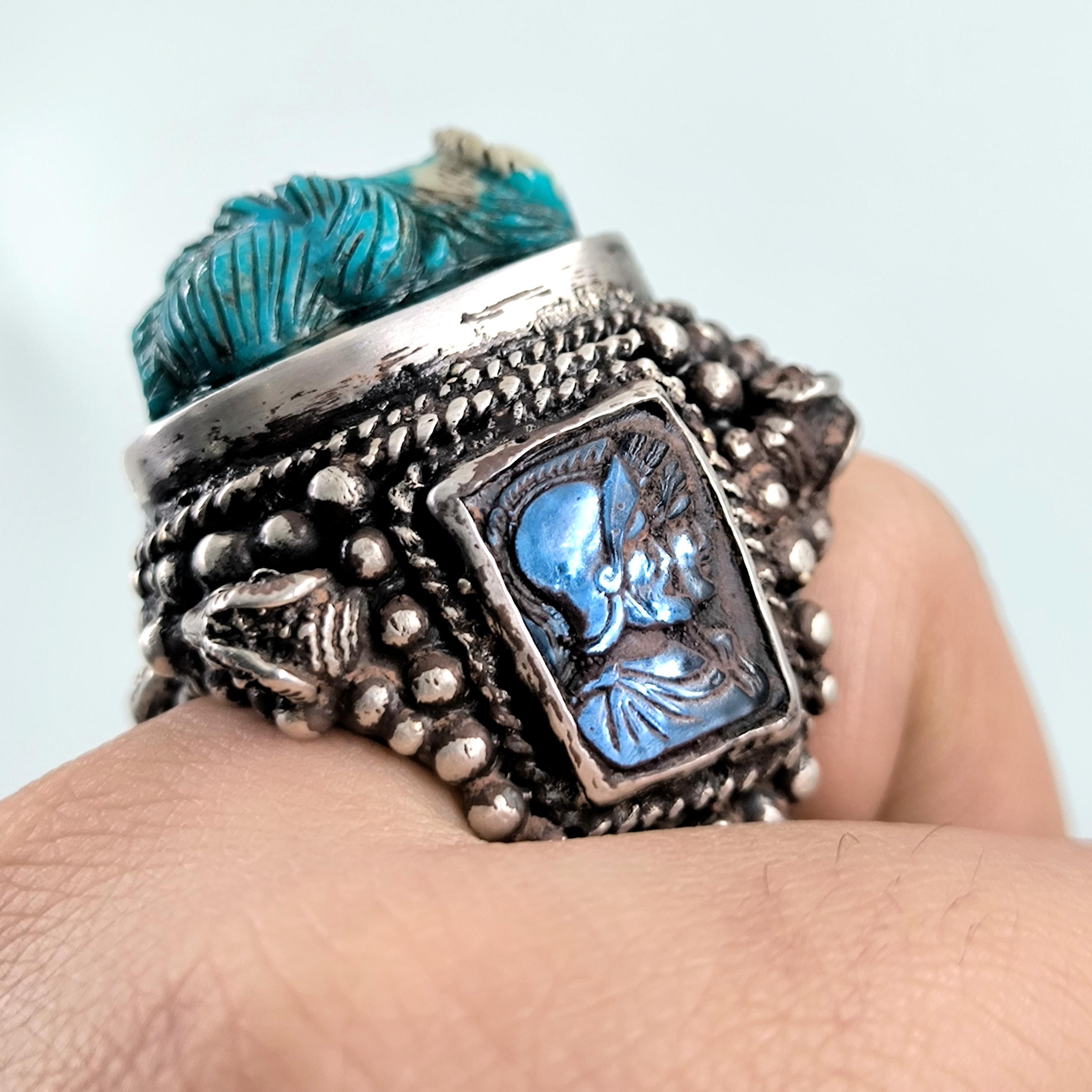 Kadim çağların gücü ve zarafeti bu yüzükte tek bedende buluşuyor; merkezdeki Romalı kadın figürü, örgülü saçları ve vakur duruşuyla bilgeliği, asilliği ve içsel gücü simgelerken yüzüğün tamamına mistik bir aura yayıyor. Yan yüzlerde cam üzerine kabartma olarak işlenen Mars ve Venüs figürleri, savaş ile aşkın kadim dengesini hatırlatıyor; gücün tutkuyla, cesaretin zarafetle bir arada var olabileceğini fısıldıyor. Yüzüğün her noktasına yayılan minik koç ve boğa başları, bereketi, liderliği ve ilksel kuvveti sembolize ederken, yoğun güverse toplarla zenginleştirilen eskitme gümüş yüzey, parçaya anıtsal ve koleksiyonluk bir karakter kazandırıyor. Alt bölümde yer alan küçük kyanit taşı ise bu güçlü kompozisyona sezgisel bir denge ve koruyucu bir enerji ekliyor. Teknik olarak merkez taş doğal firuze olup tamamı 925 ayar gümüşten, tamamen el işçiliğiyle üretilmiş, eskitme çalıştığımız, kallavi boyda ve tekil bir tasarımdır.