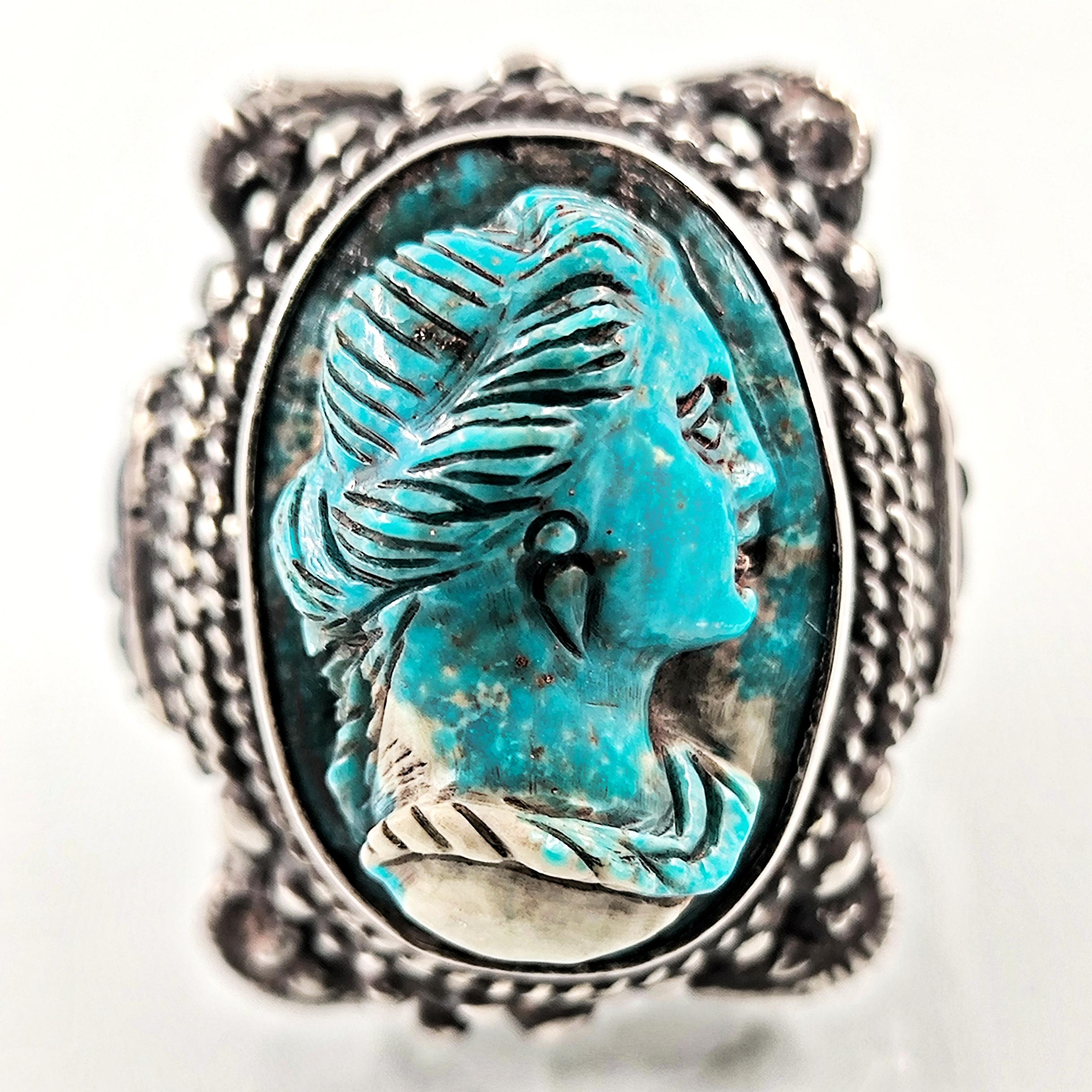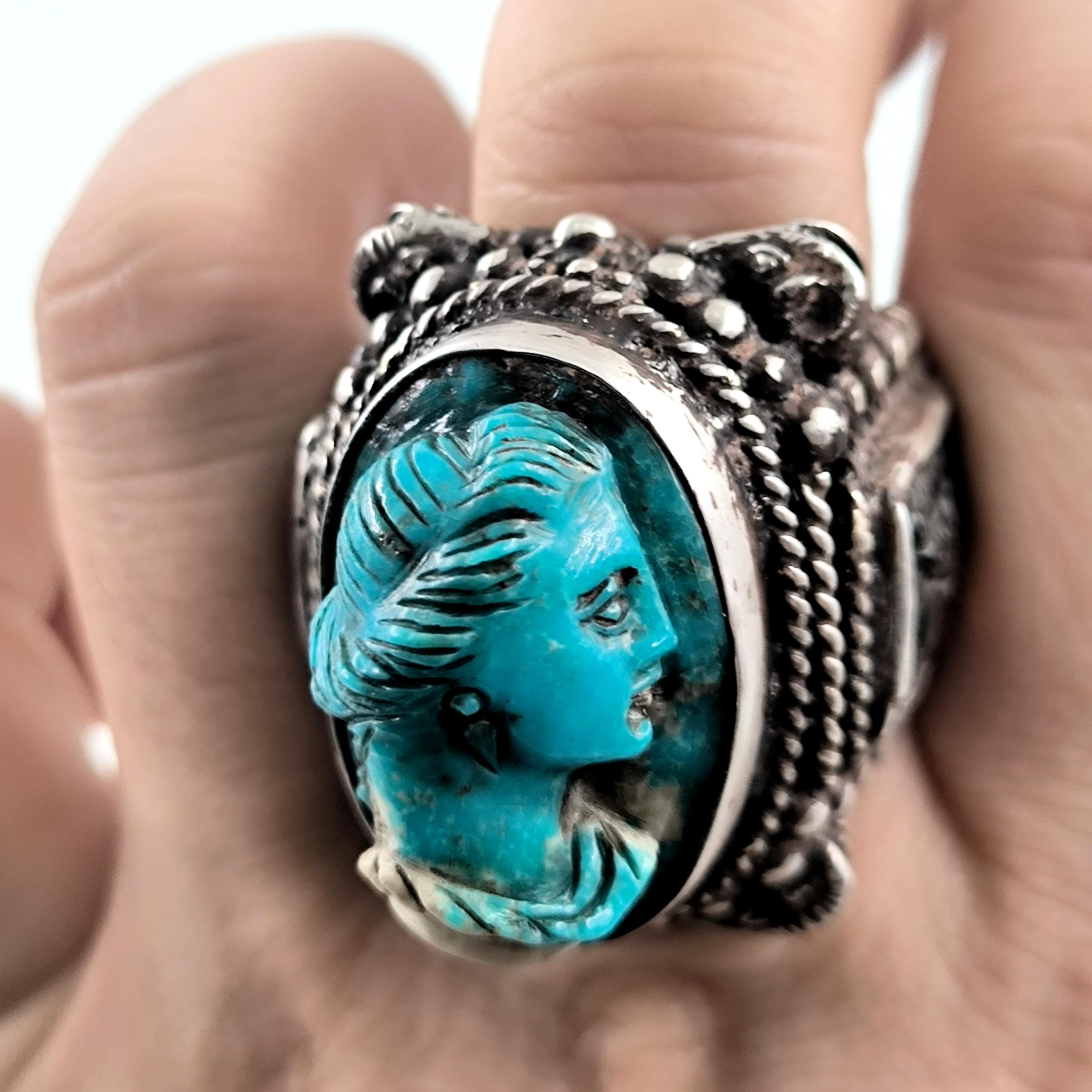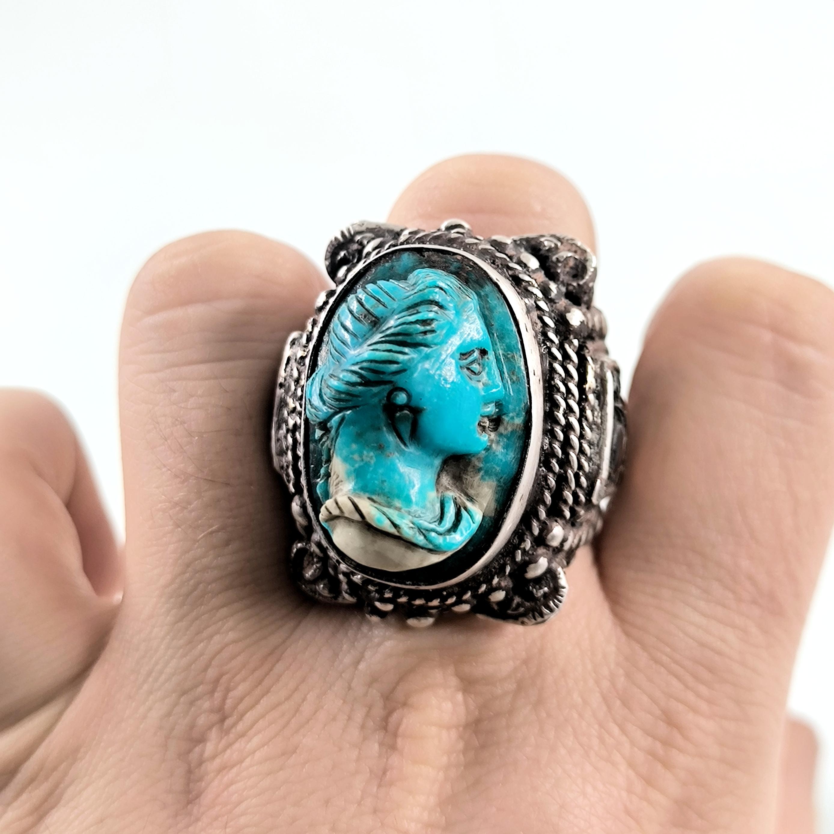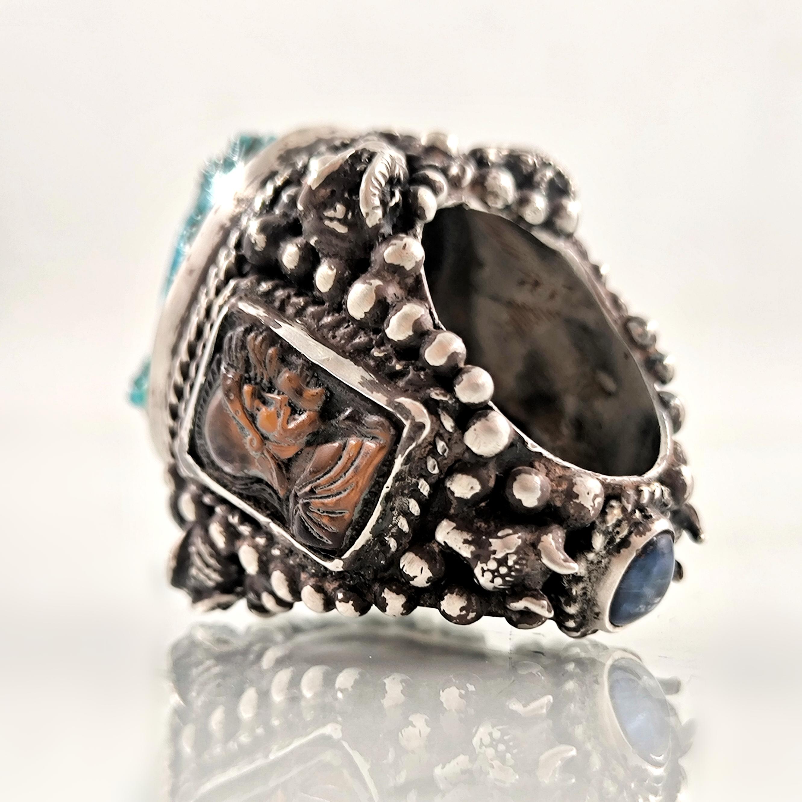 Kadim çağların gücü ve zarafeti bu yüzükte tek bedende buluşuyor; merkezdeki Romalı kadın figürü, örgülü saçları ve vakur duruşuyla bilgeliği, asilliği ve içsel gücü simgelerken yüzüğün tamamına mistik bir aura yayıyor. Yan yüzlerde cam üzerine kabartma olarak işlenen Mars ve Venüs figürleri, savaş ile aşkın kadim dengesini hatırlatıyor; gücün tutkuyla, cesaretin zarafetle bir arada var olabileceğini fısıldıyor. Yüzüğün her noktasına yayılan minik koç ve boğa başları, bereketi, liderliği ve ilksel kuvveti sembolize ederken, yoğun güverse toplarla zenginleştirilen eskitme gümüş yüzey, parçaya anıtsal ve koleksiyonluk bir karakter kazandırıyor. Alt bölümde yer alan küçük kyanit taşı ise bu güçlü kompozisyona sezgisel bir denge ve koruyucu bir enerji ekliyor. Teknik olarak merkez taş doğal firuze olup tamamı 925 ayar gümüşten, tamamen el işçiliğiyle üretilmiş, eskitme çalıştığımız, kallavi boyda ve tekil bir tasarımdır.