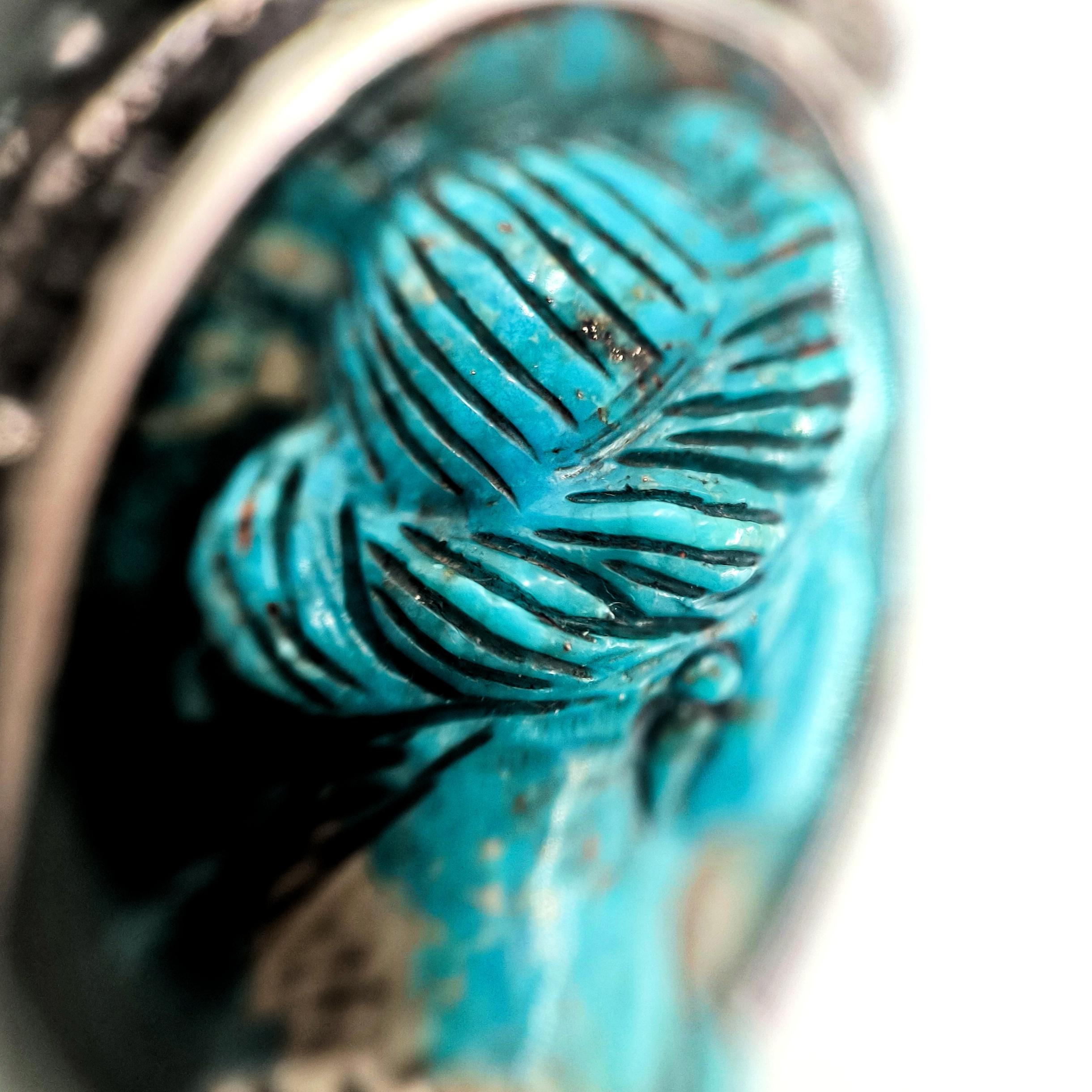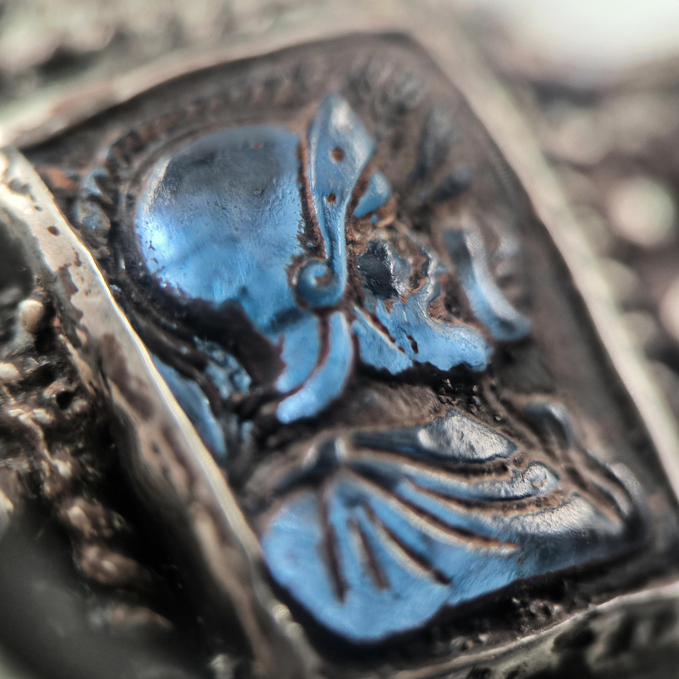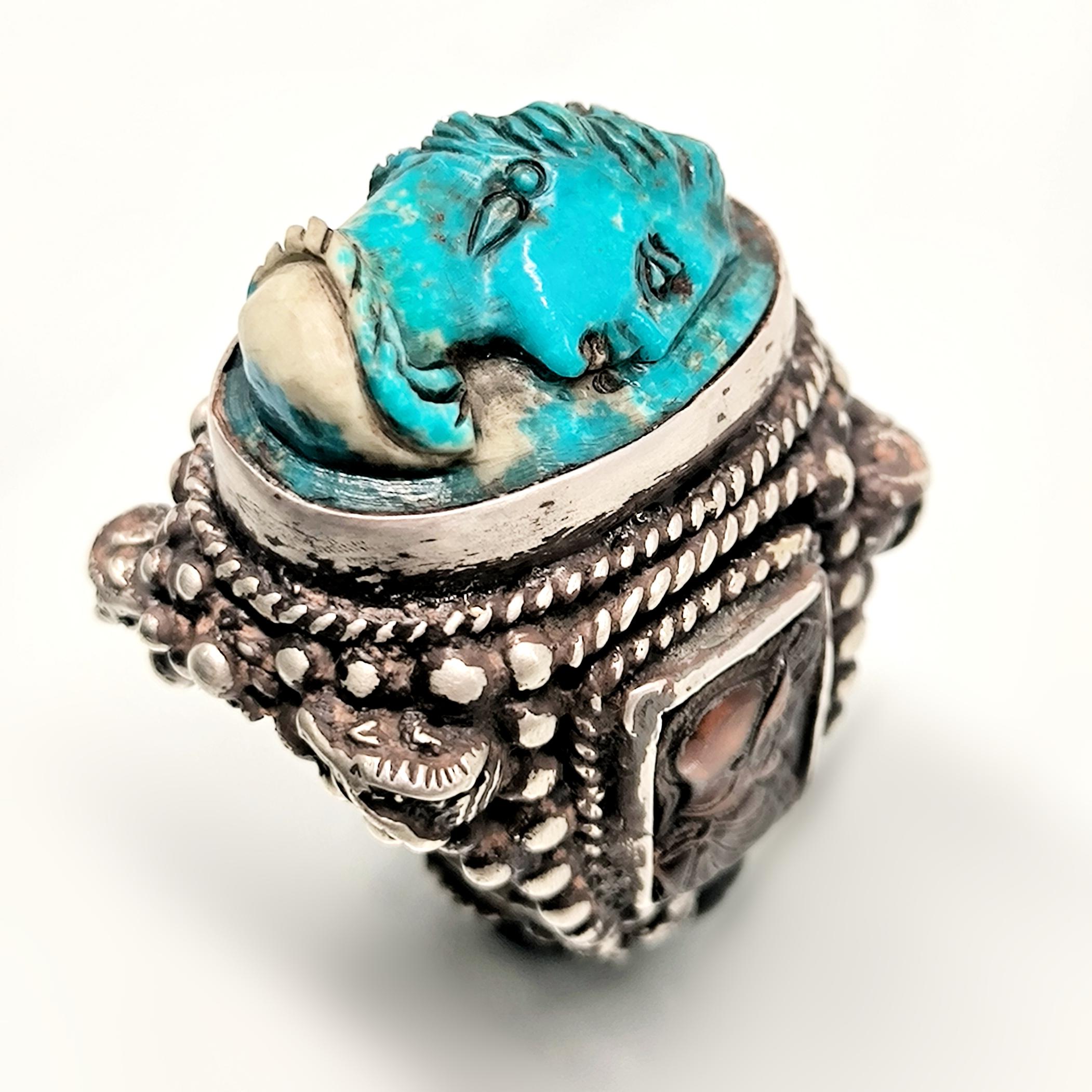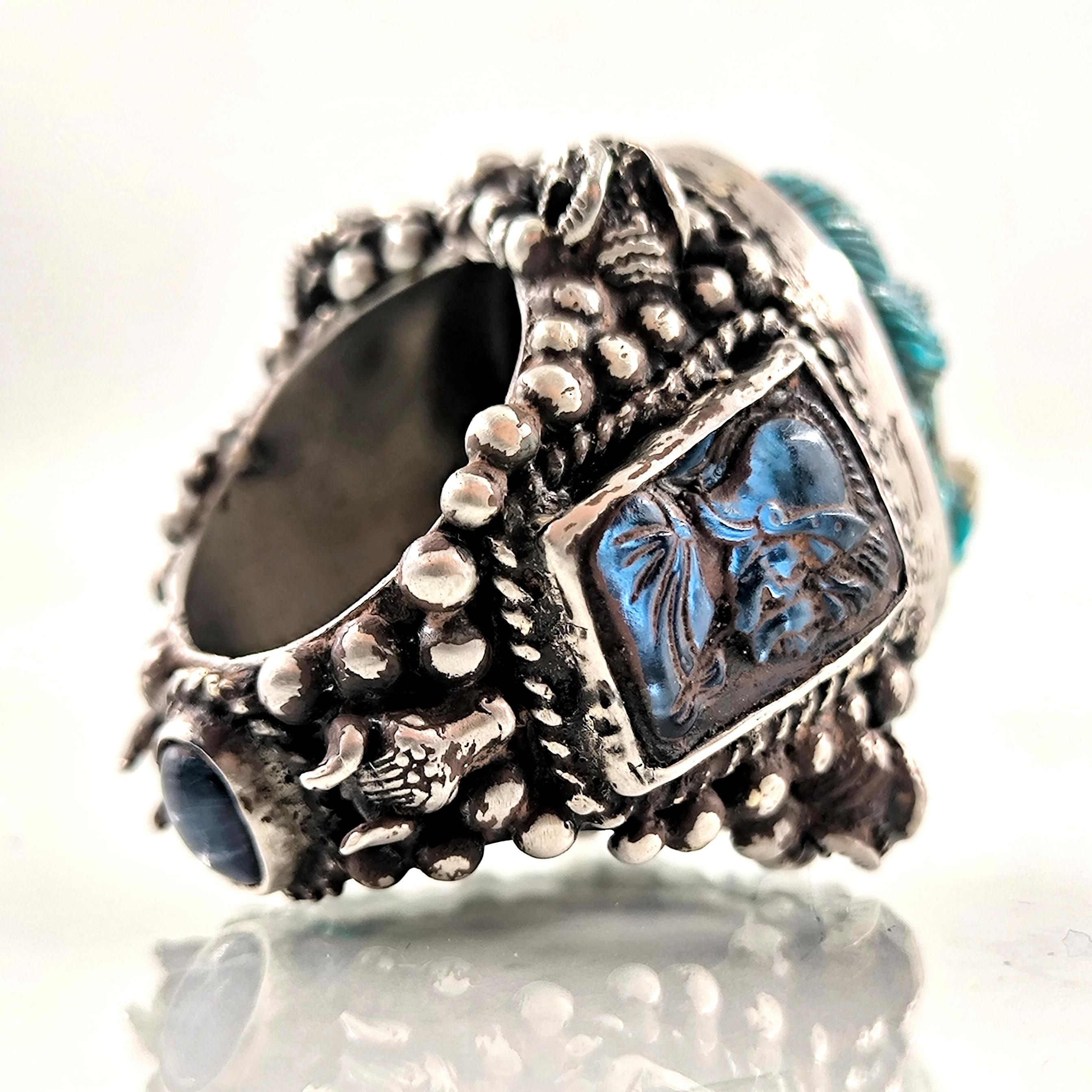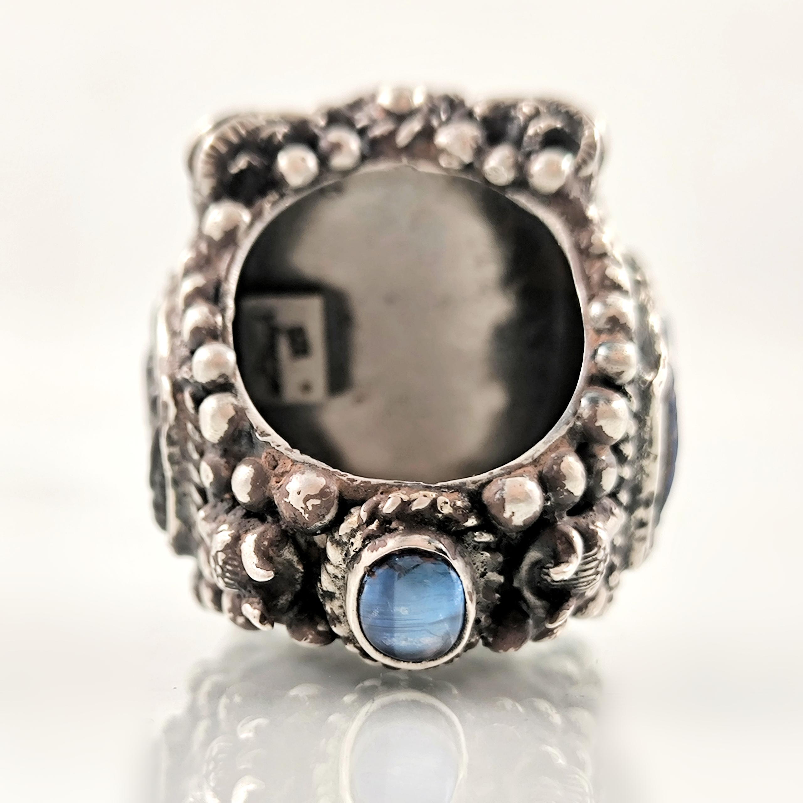 Kadim çağların gücü ve zarafeti bu yüzükte tek bedende buluşuyor; merkezdeki Romalı kadın figürü, örgülü saçları ve vakur duruşuyla bilgeliği, asilliği ve içsel gücü simgelerken yüzüğün tamamına mistik bir aura yayıyor. Yan yüzlerde cam üzerine kabartma olarak işlenen Mars ve Venüs figürleri, savaş ile aşkın kadim dengesini hatırlatıyor; gücün tutkuyla, cesaretin zarafetle bir arada var olabileceğini fısıldıyor. Yüzüğün her noktasına yayılan minik koç ve boğa başları, bereketi, liderliği ve ilksel kuvveti sembolize ederken, yoğun güverse toplarla zenginleştirilen eskitme gümüş yüzey, parçaya anıtsal ve koleksiyonluk bir karakter kazandırıyor. Alt bölümde yer alan küçük kyanit taşı ise bu güçlü kompozisyona sezgisel bir denge ve koruyucu bir enerji ekliyor. Teknik olarak merkez taş doğal firuze olup tamamı 925 ayar gümüşten, tamamen el işçiliğiyle üretilmiş, eskitme çalıştığımız, kallavi boyda ve tekil bir tasarımdır.