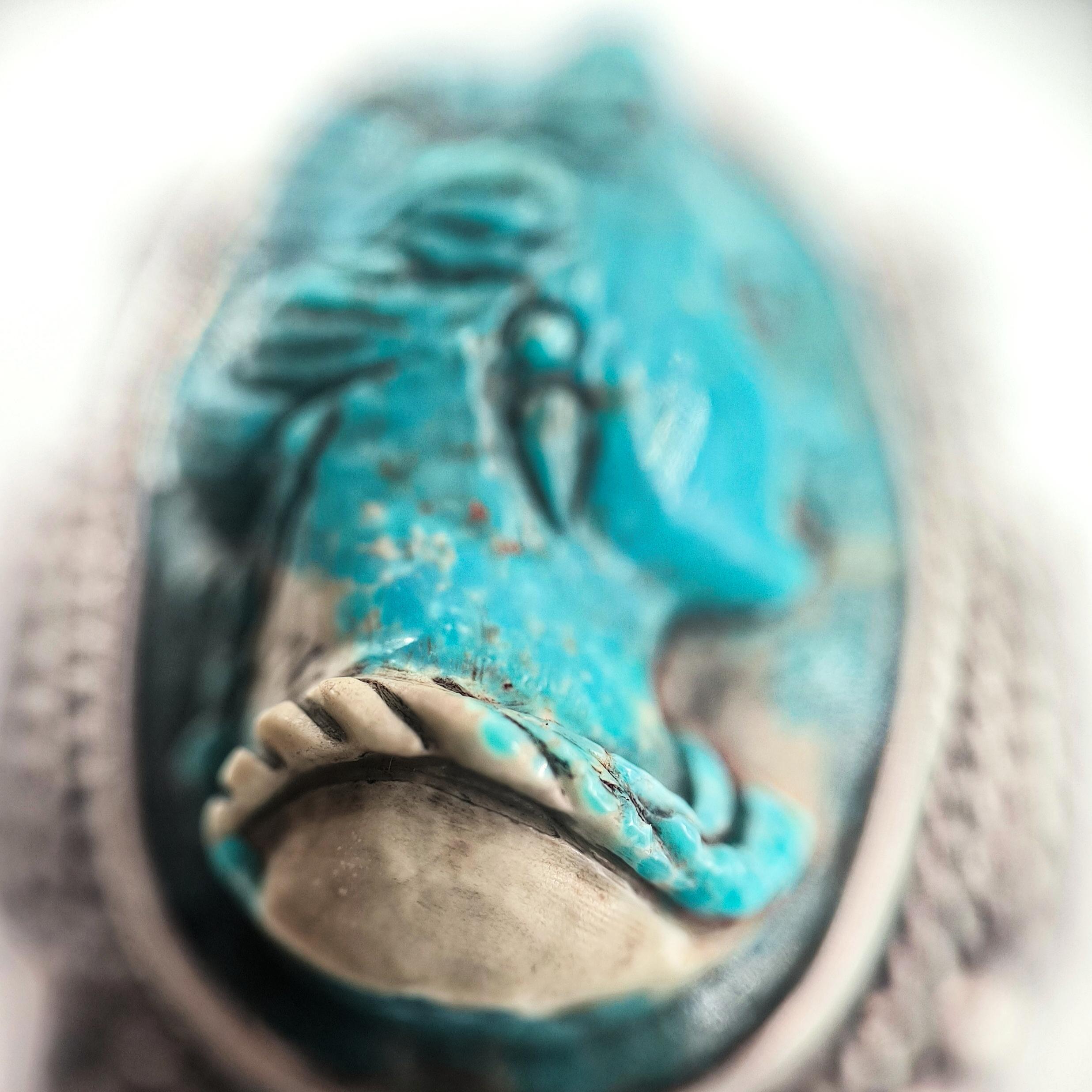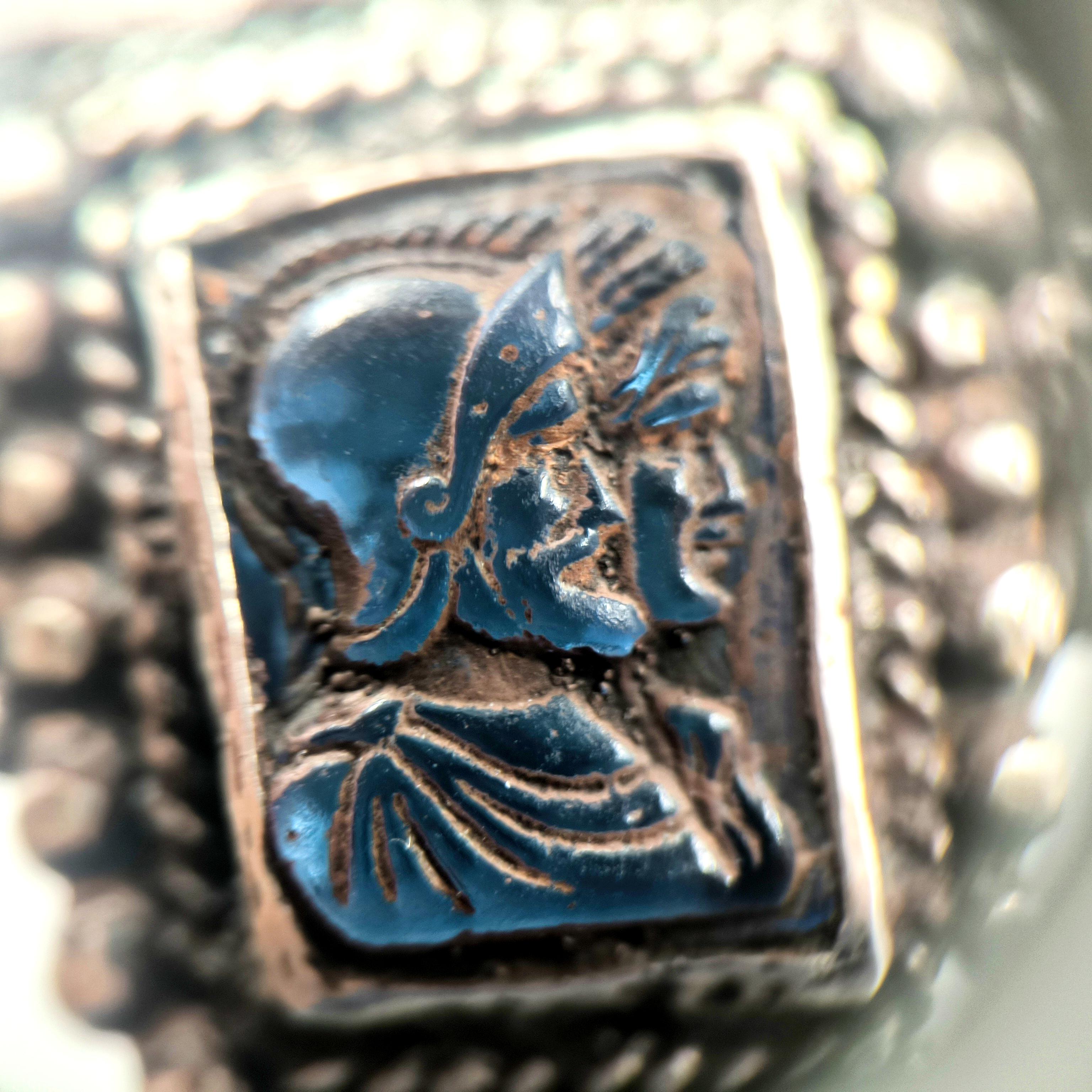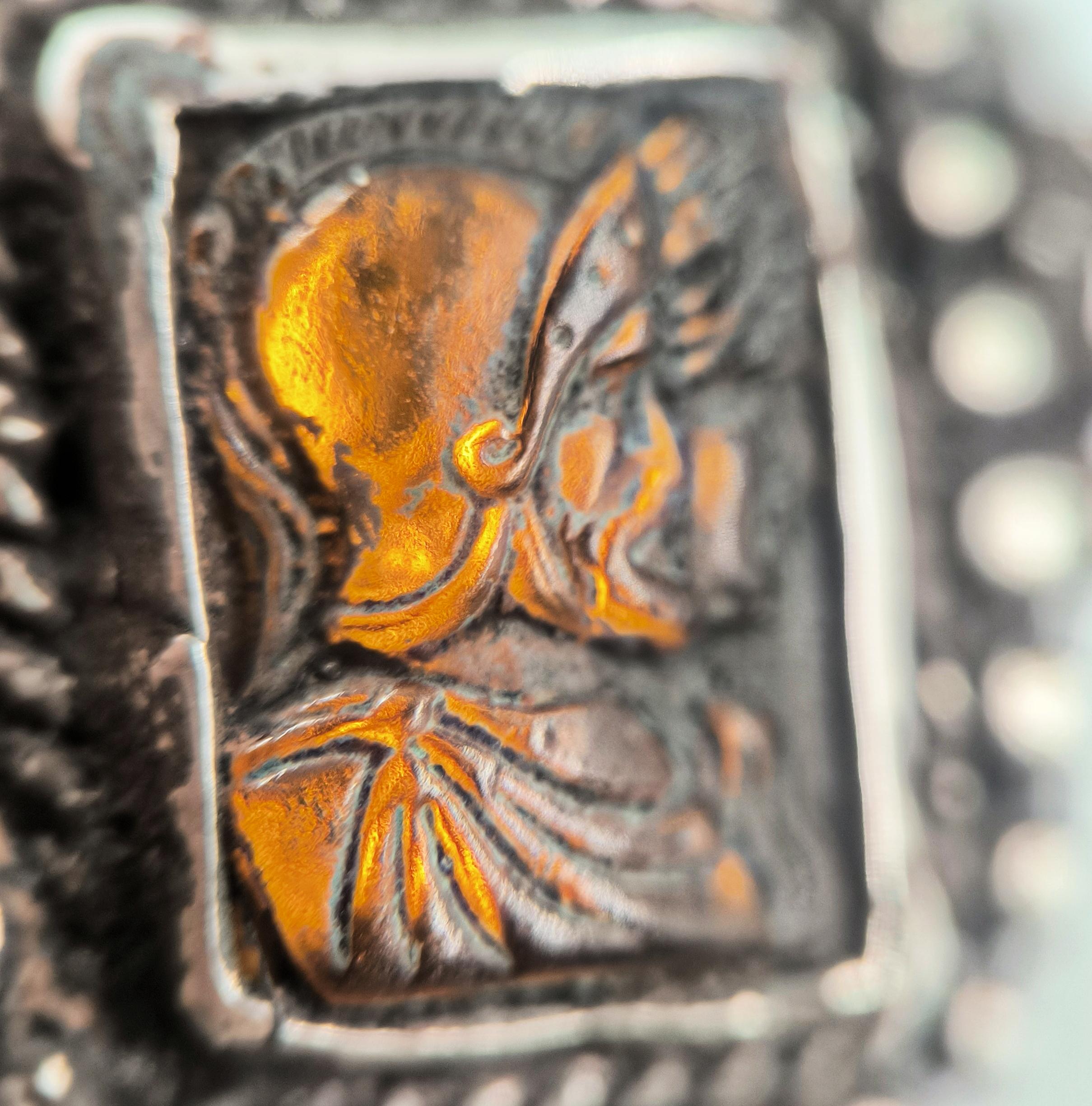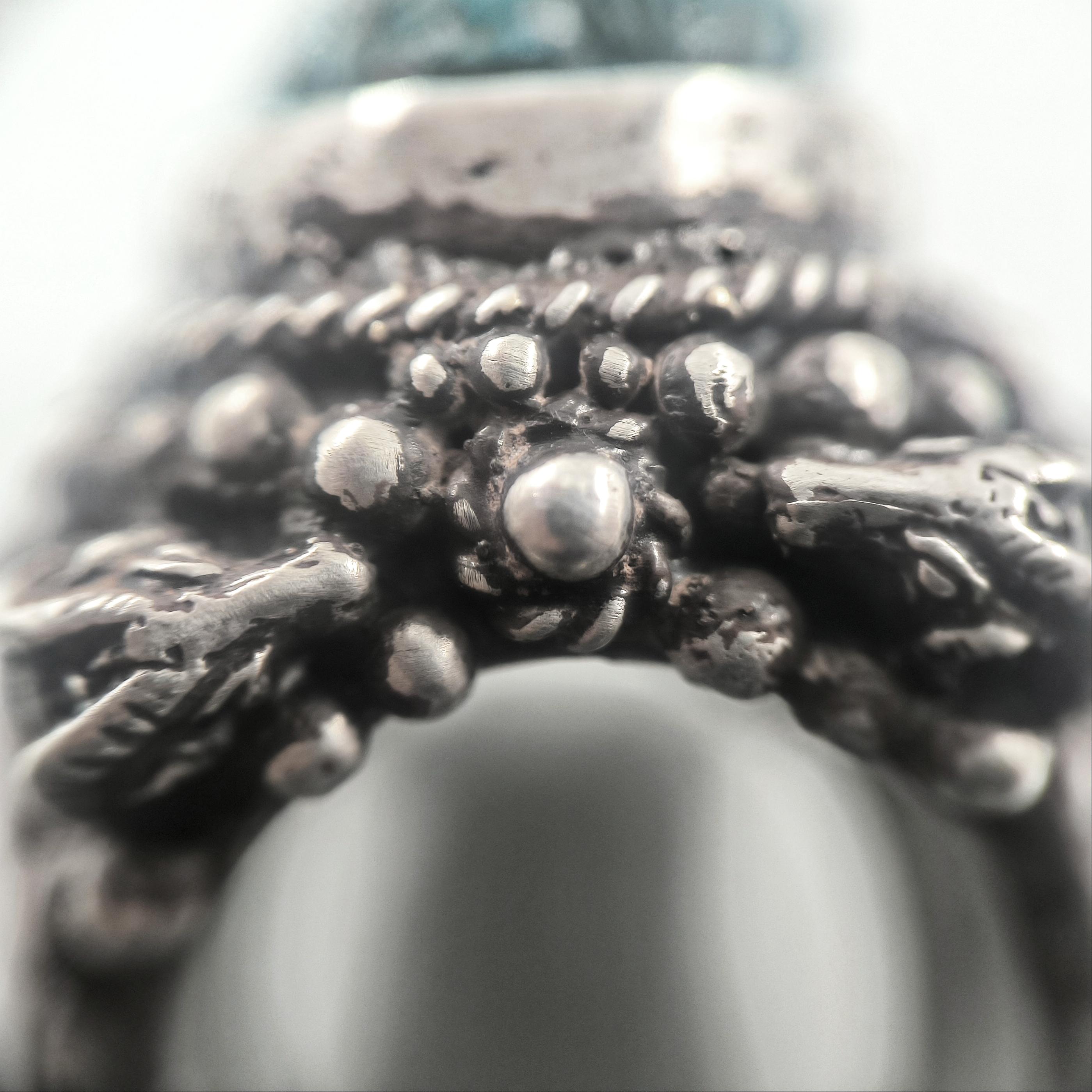 Kadim çağların gücü ve zarafeti bu yüzükte tek bedende buluşuyor; merkezdeki Romalı kadın figürü, örgülü saçları ve vakur duruşuyla bilgeliği, asilliği ve içsel gücü simgelerken yüzüğün tamamına mistik bir aura yayıyor. Yan yüzlerde cam üzerine kabartma olarak işlenen Mars ve Venüs figürleri, savaş ile aşkın kadim dengesini hatırlatıyor; gücün tutkuyla, cesaretin zarafetle bir arada var olabileceğini fısıldıyor. Yüzüğün her noktasına yayılan minik koç ve boğa başları, bereketi, liderliği ve ilksel kuvveti sembolize ederken, yoğun güverse toplarla zenginleştirilen eskitme gümüş yüzey, parçaya anıtsal ve koleksiyonluk bir karakter kazandırıyor. Alt bölümde yer alan küçük kyanit taşı ise bu güçlü kompozisyona sezgisel bir denge ve koruyucu bir enerji ekliyor. Teknik olarak merkez taş doğal firuze olup tamamı 925 ayar gümüşten, tamamen el işçiliğiyle üretilmiş, eskitme çalıştığımız, kallavi boyda ve tekil bir tasarımdır.